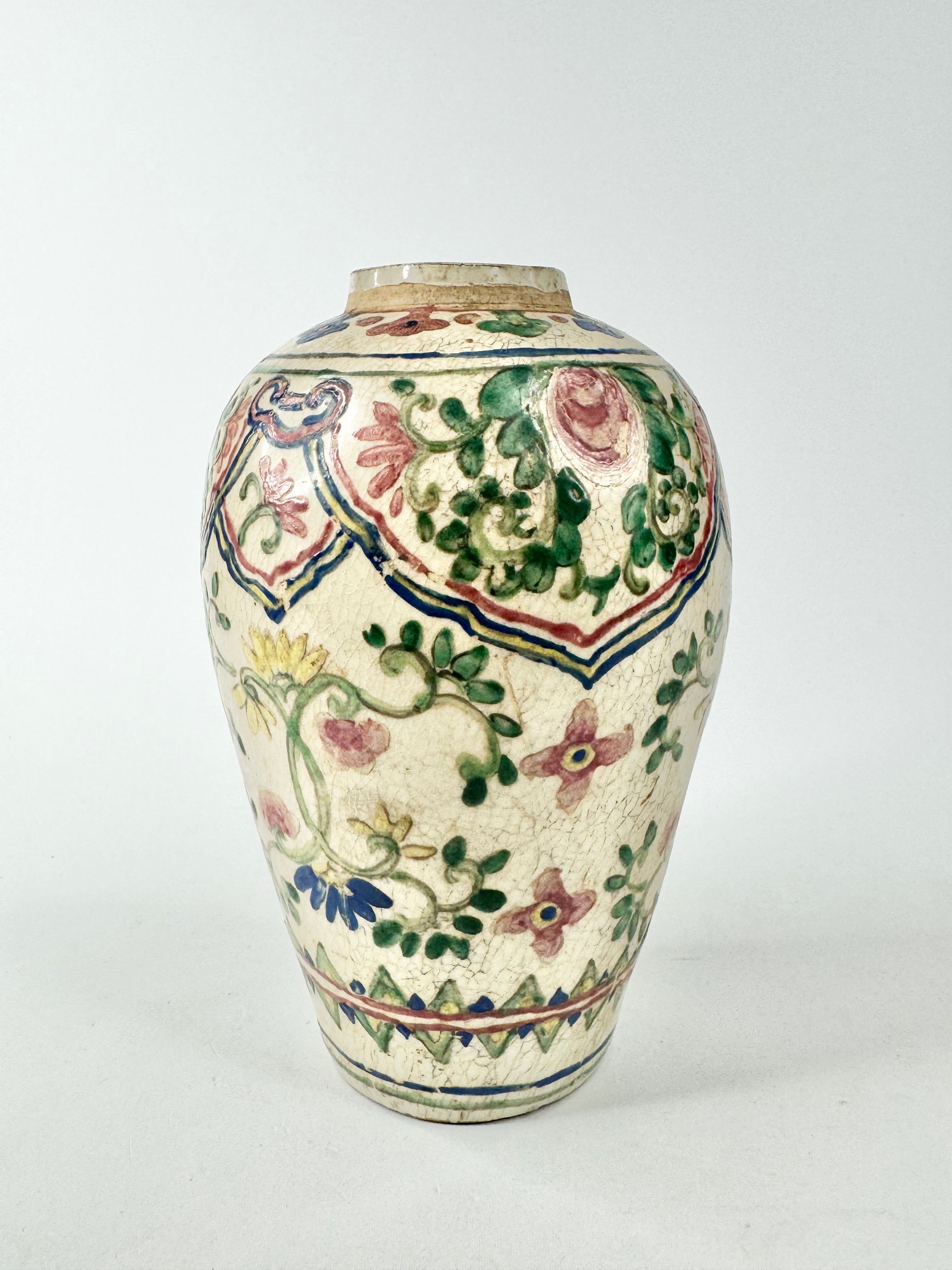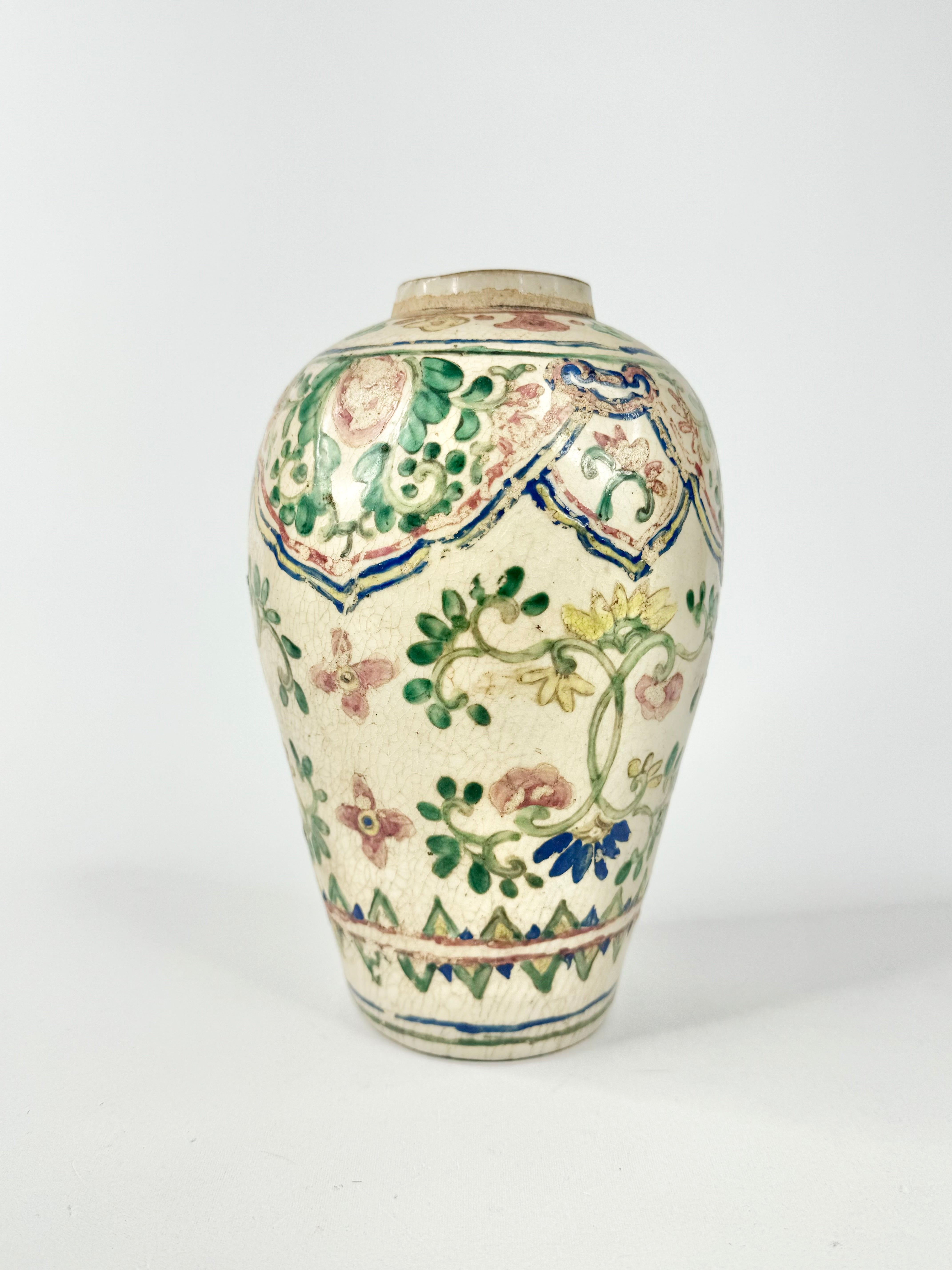 A beautiful 20th century vase with a soft cream background and decorated with green, soft blush pink & deep electric blue flowers along with deep green botanical leaves. This item is in pre-loved condition; it does have some cracking in the glazing and wear around the lid. Please inspect the photos carefully prior to purchase.