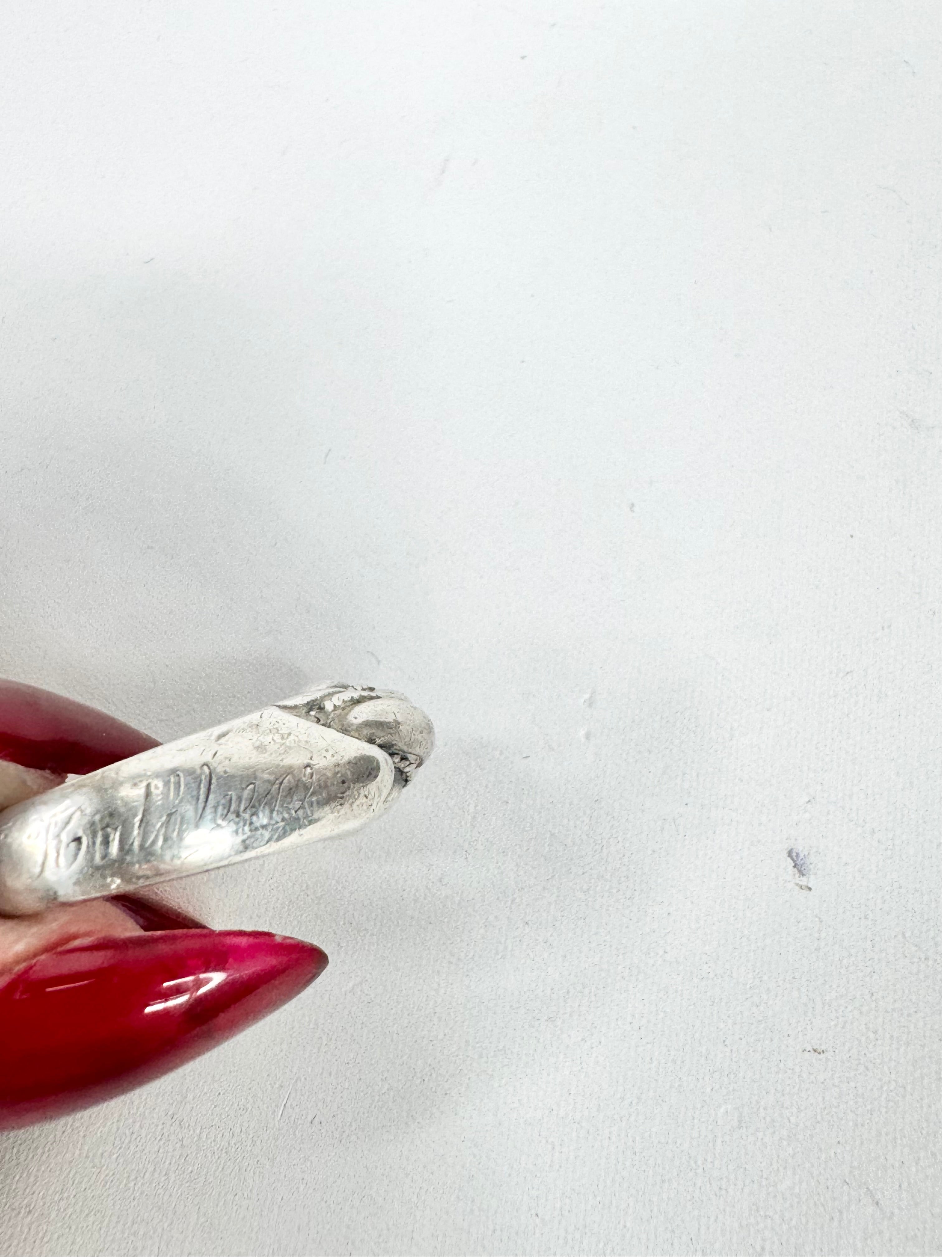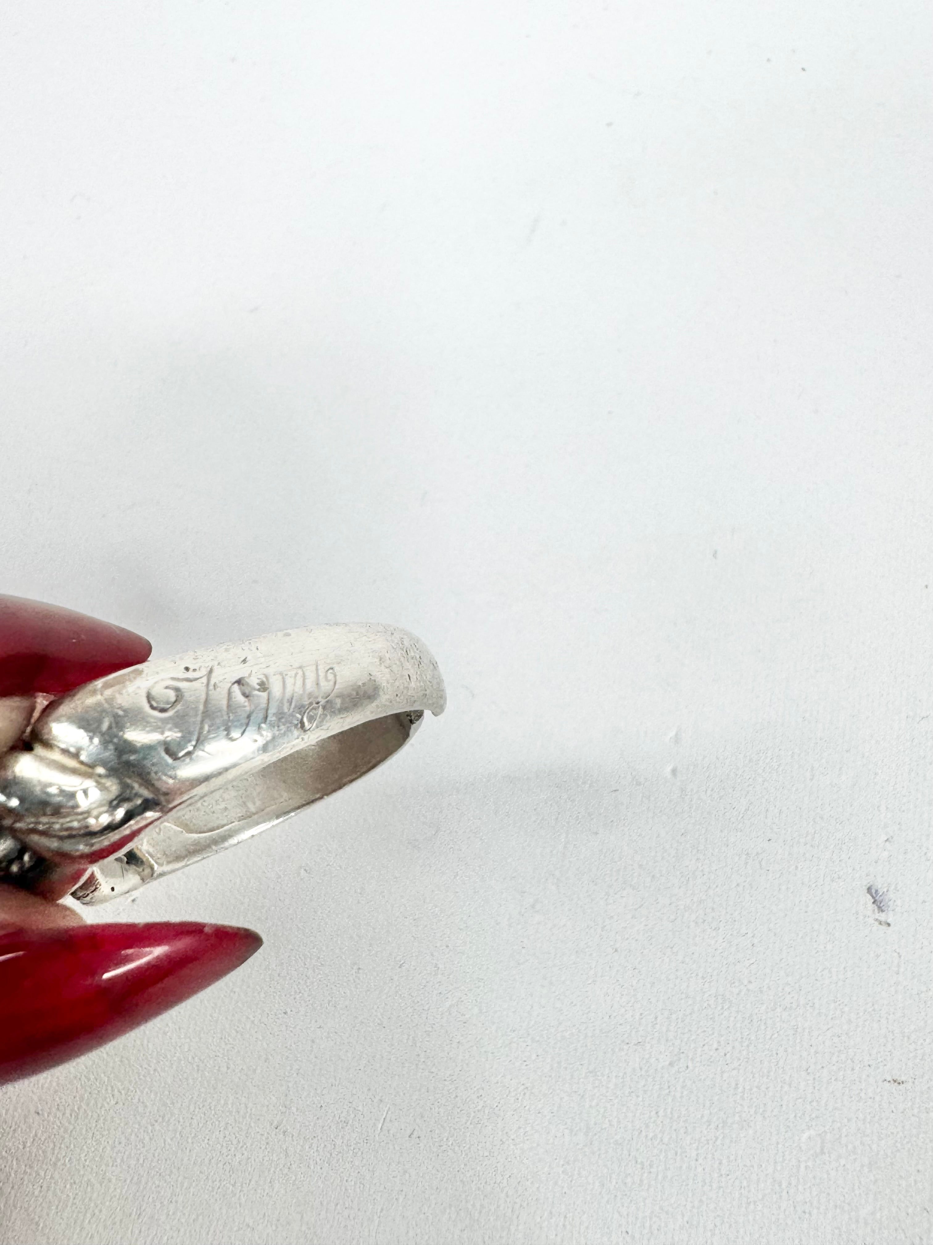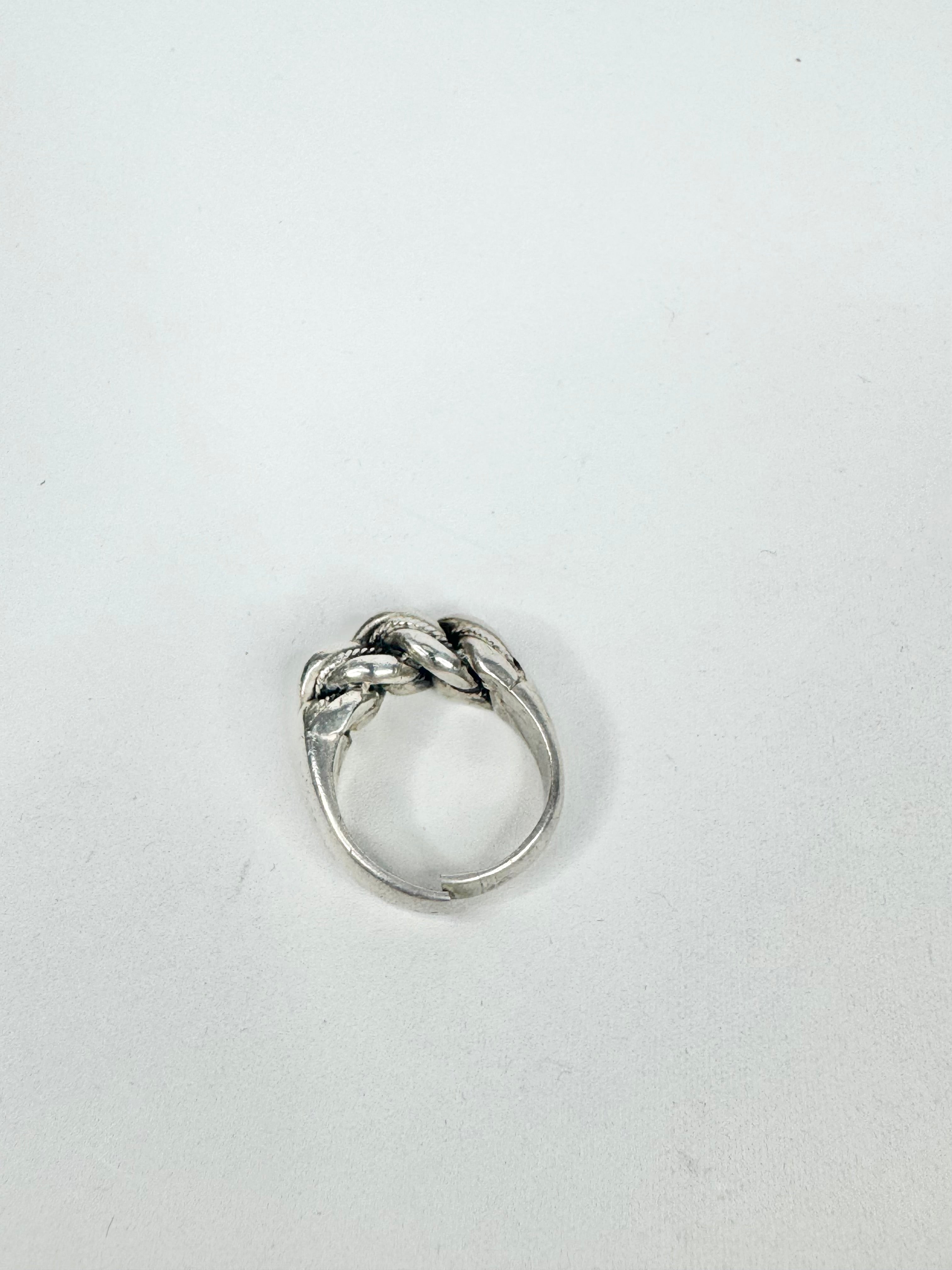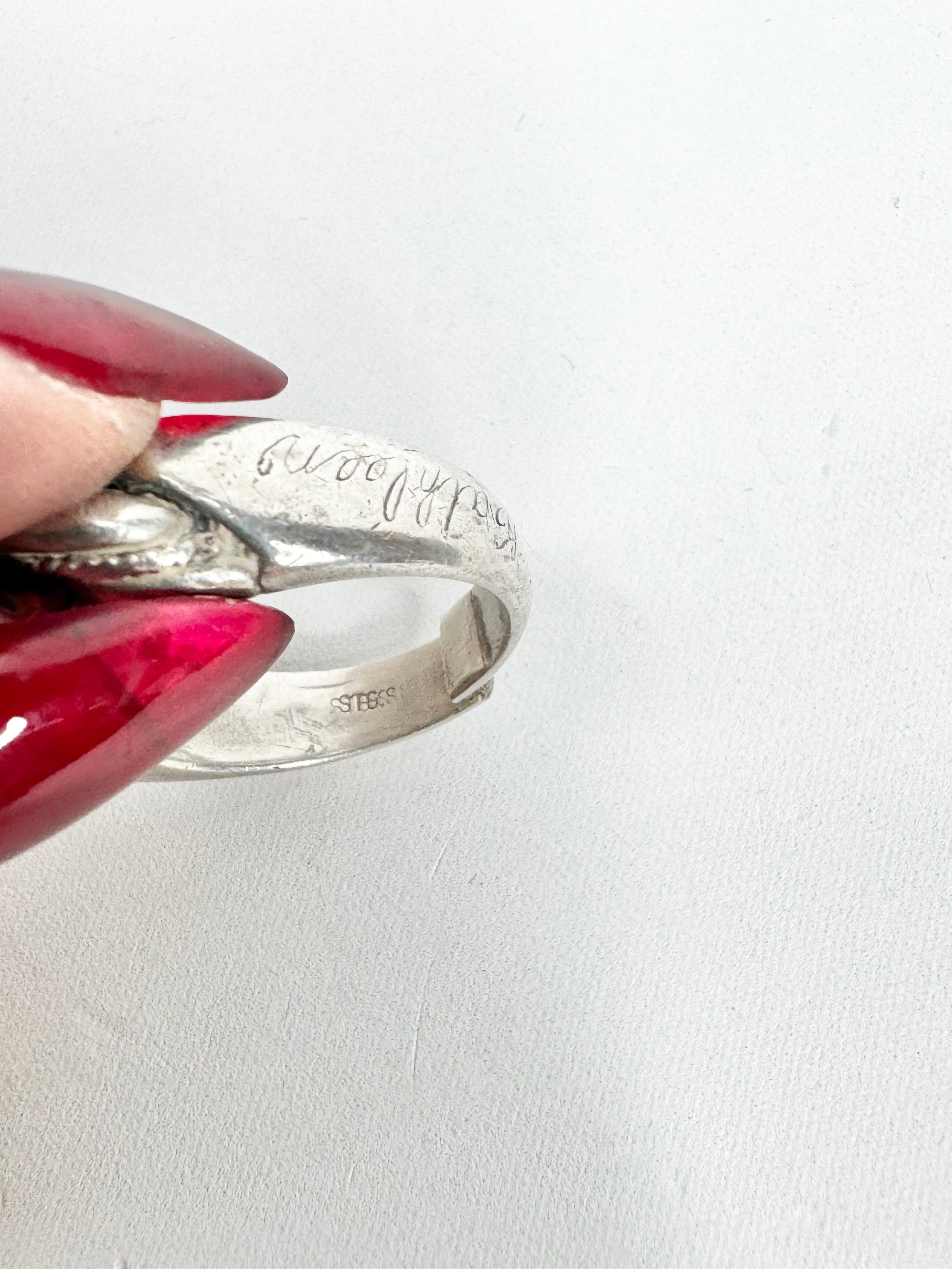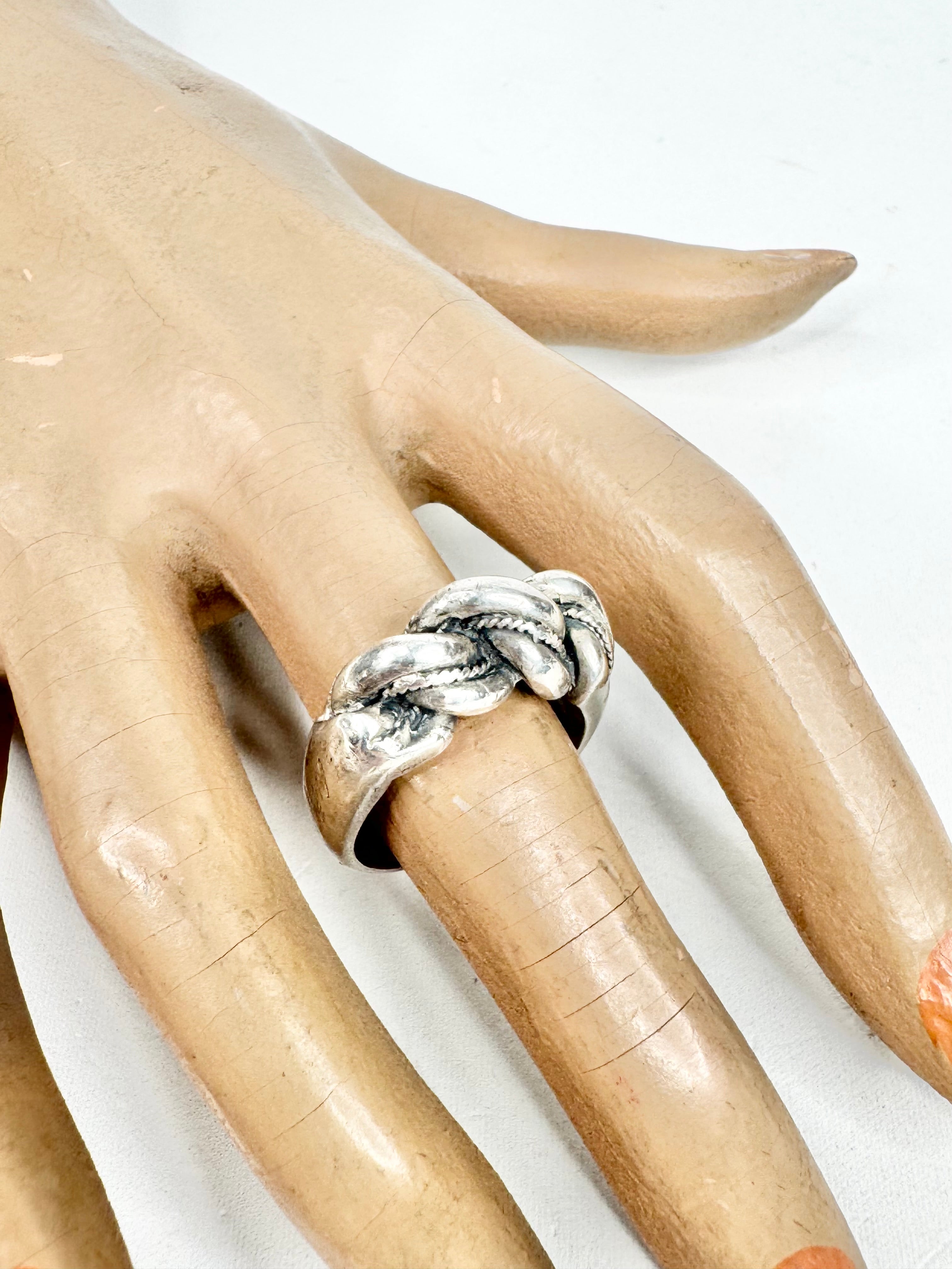 A beautiful antique silver ring, which given the stamps within, we believe is Australian. This item is broken - the lower half of the band has been snapped. It is a weighty, silver ring with large, twisted front and thick band.