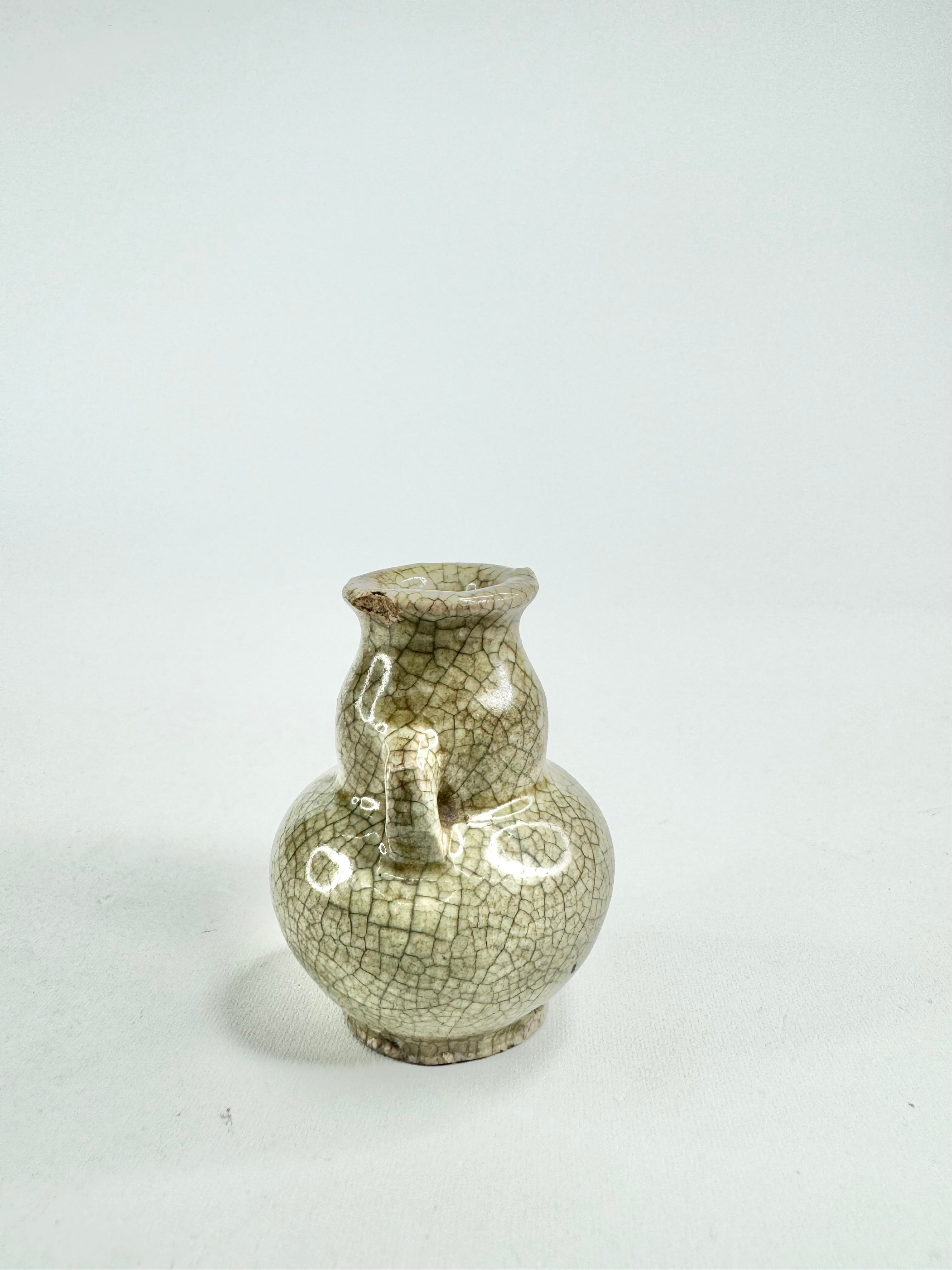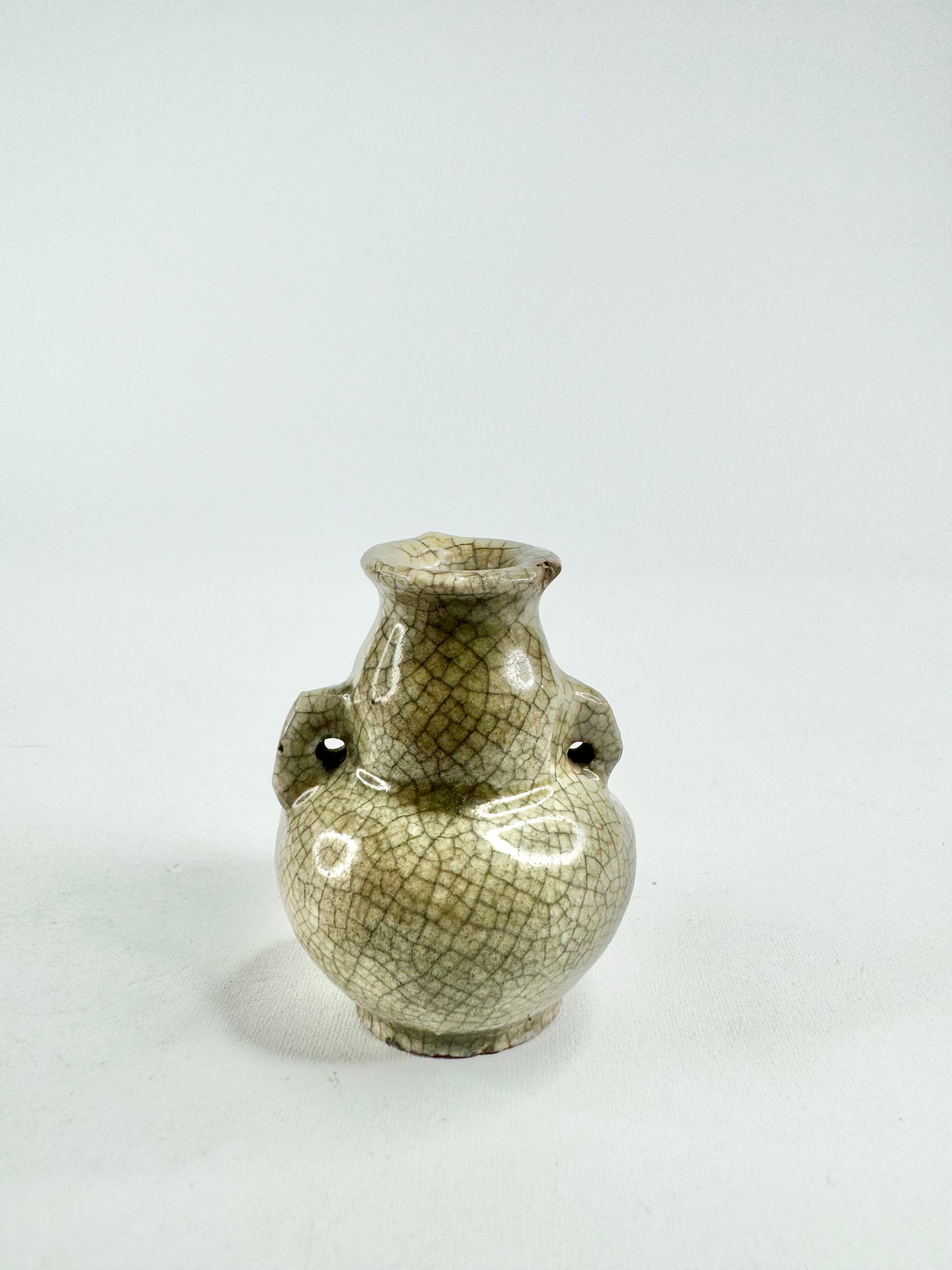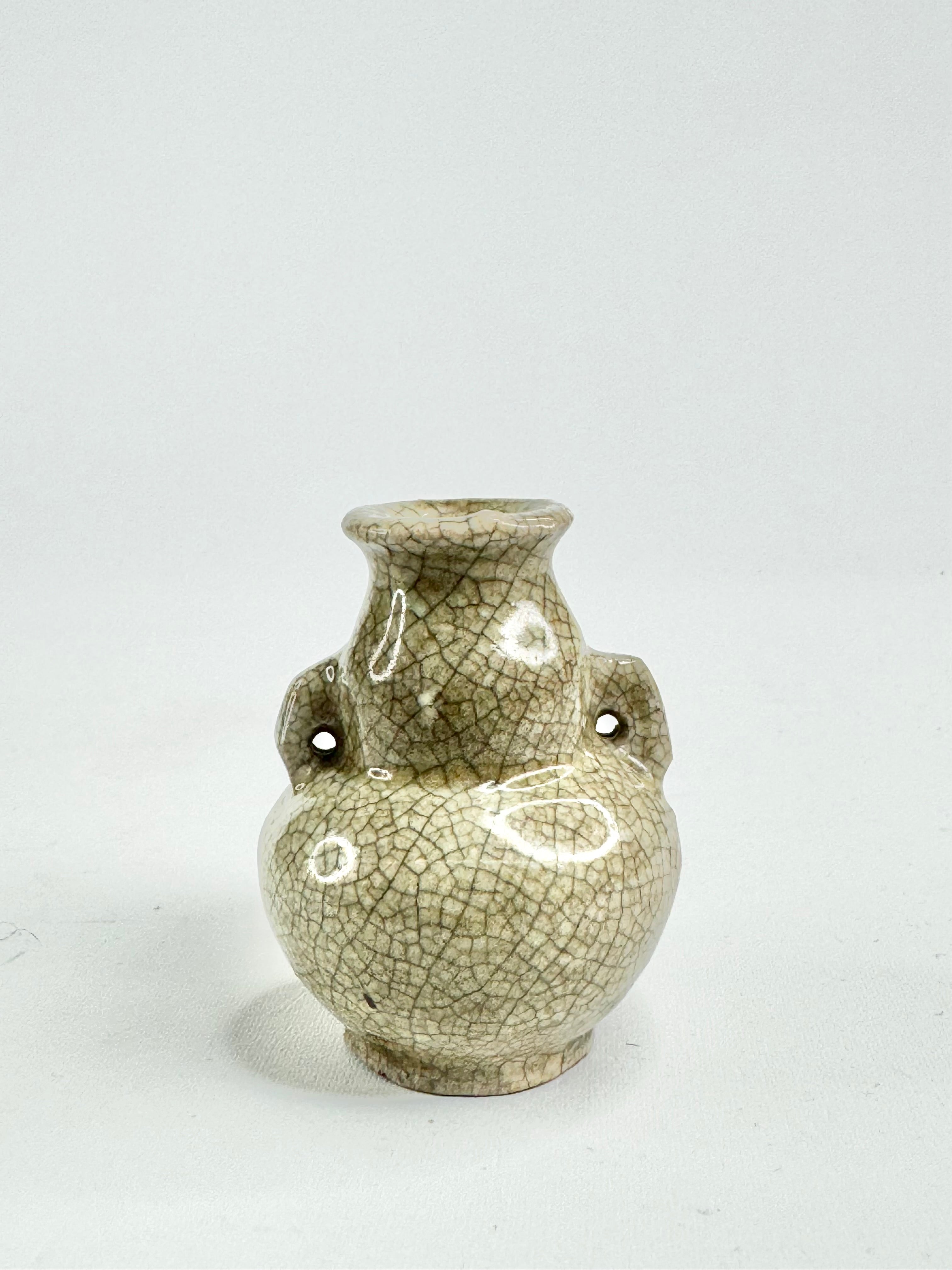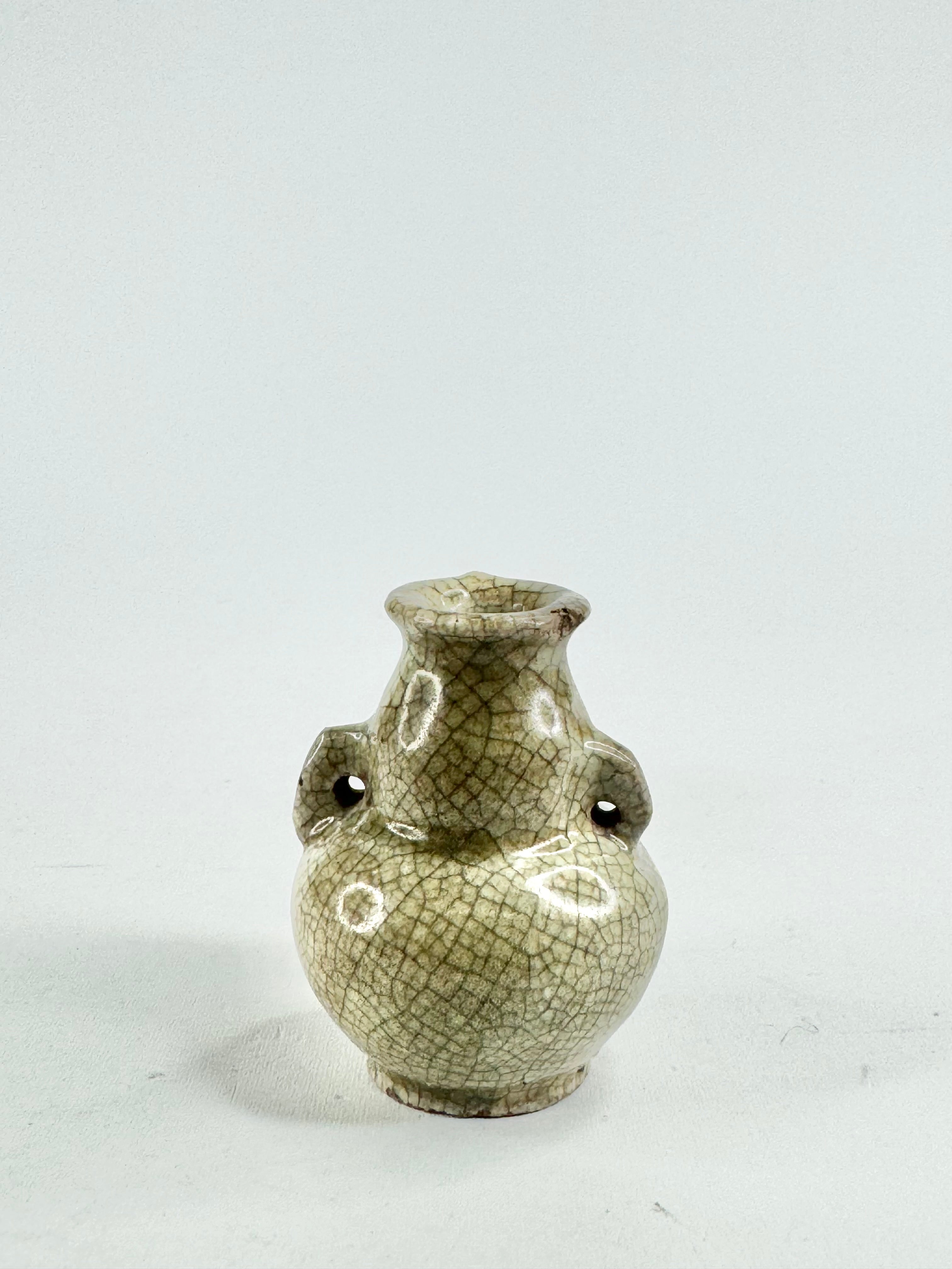 A stunning miniature celadon vase in a soft green shade with crackling in the glaze. Whilst this shows this items age, it is also beautiful, much like a skeleton leaf. Along with the cracking this item does have a chip in the lip of the vase. This is part of a collection donated to the online store by a private donor. This came from their late mothers collection of pottery from the Ming & Qing Dynasties.
