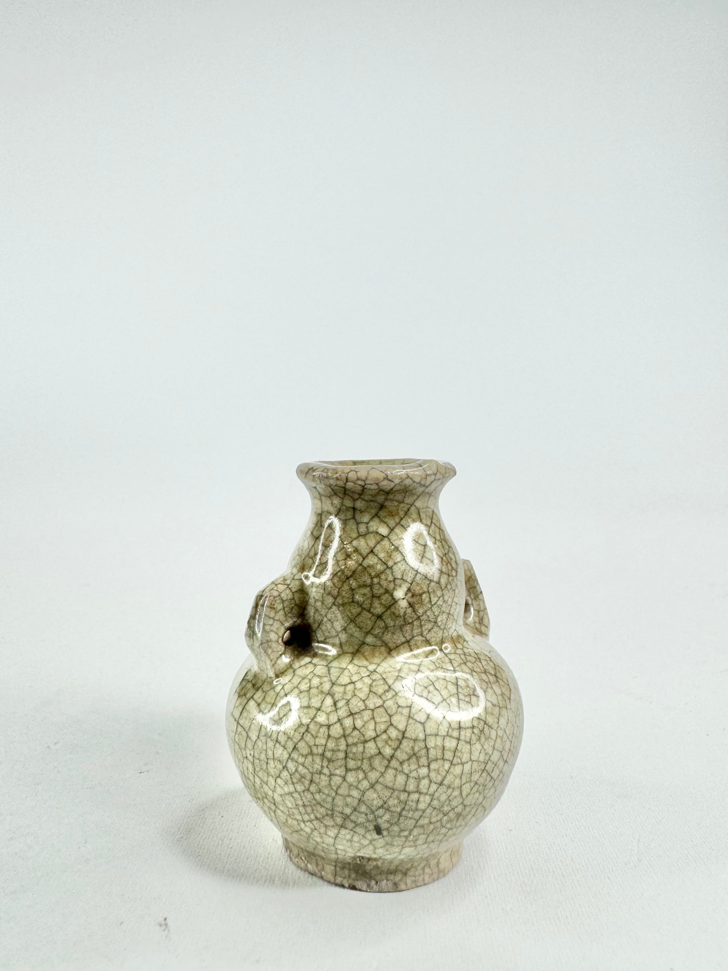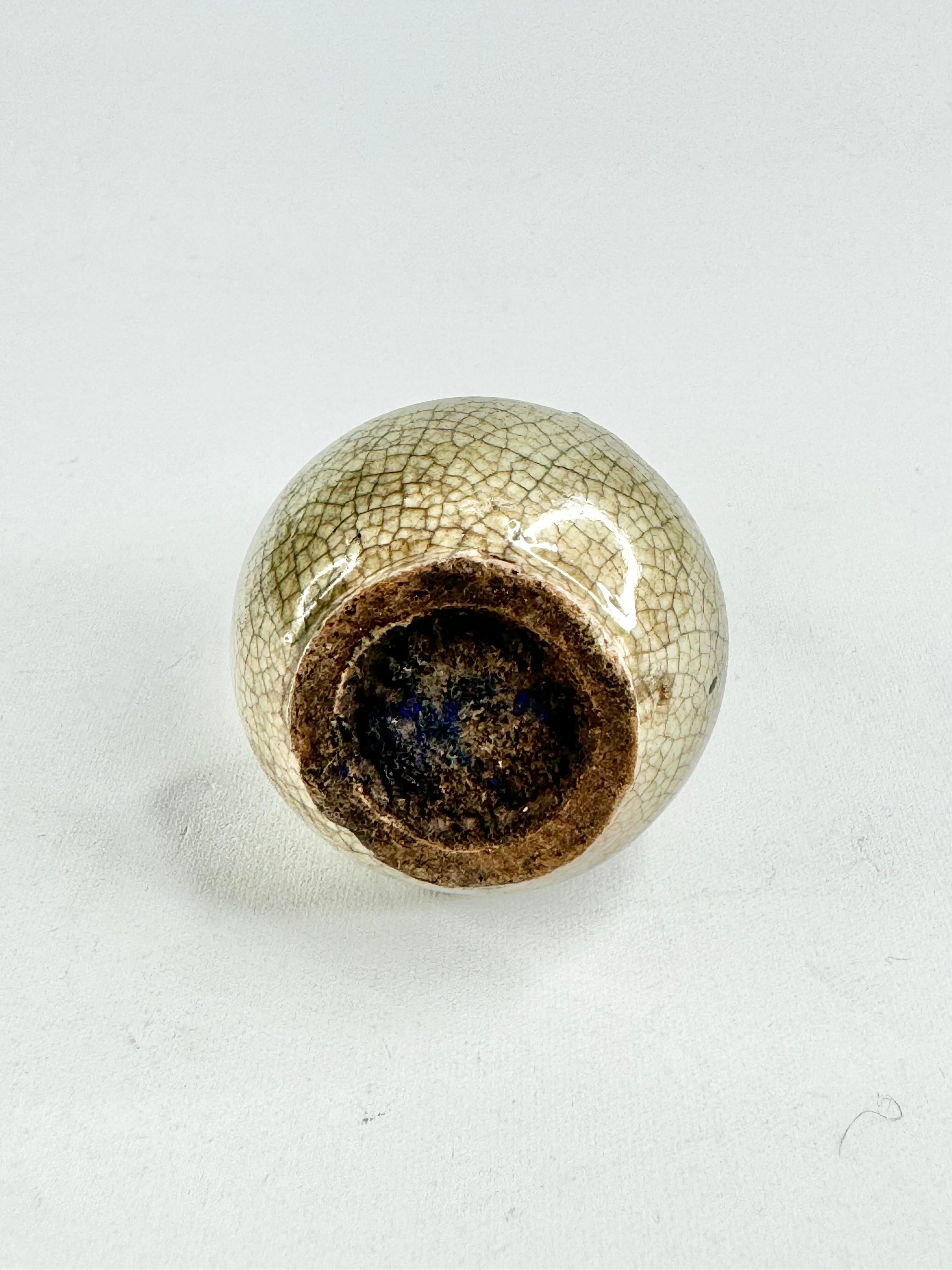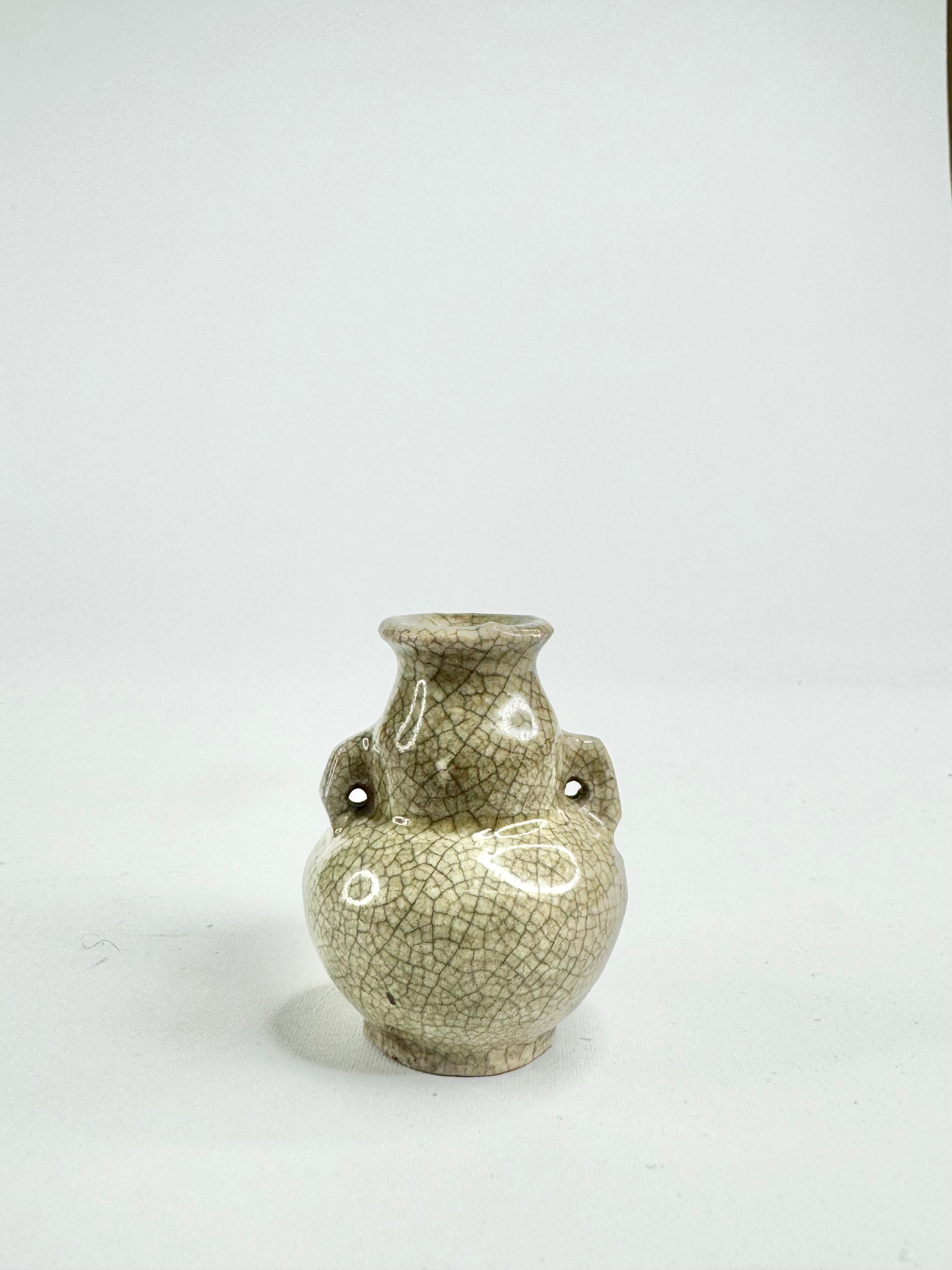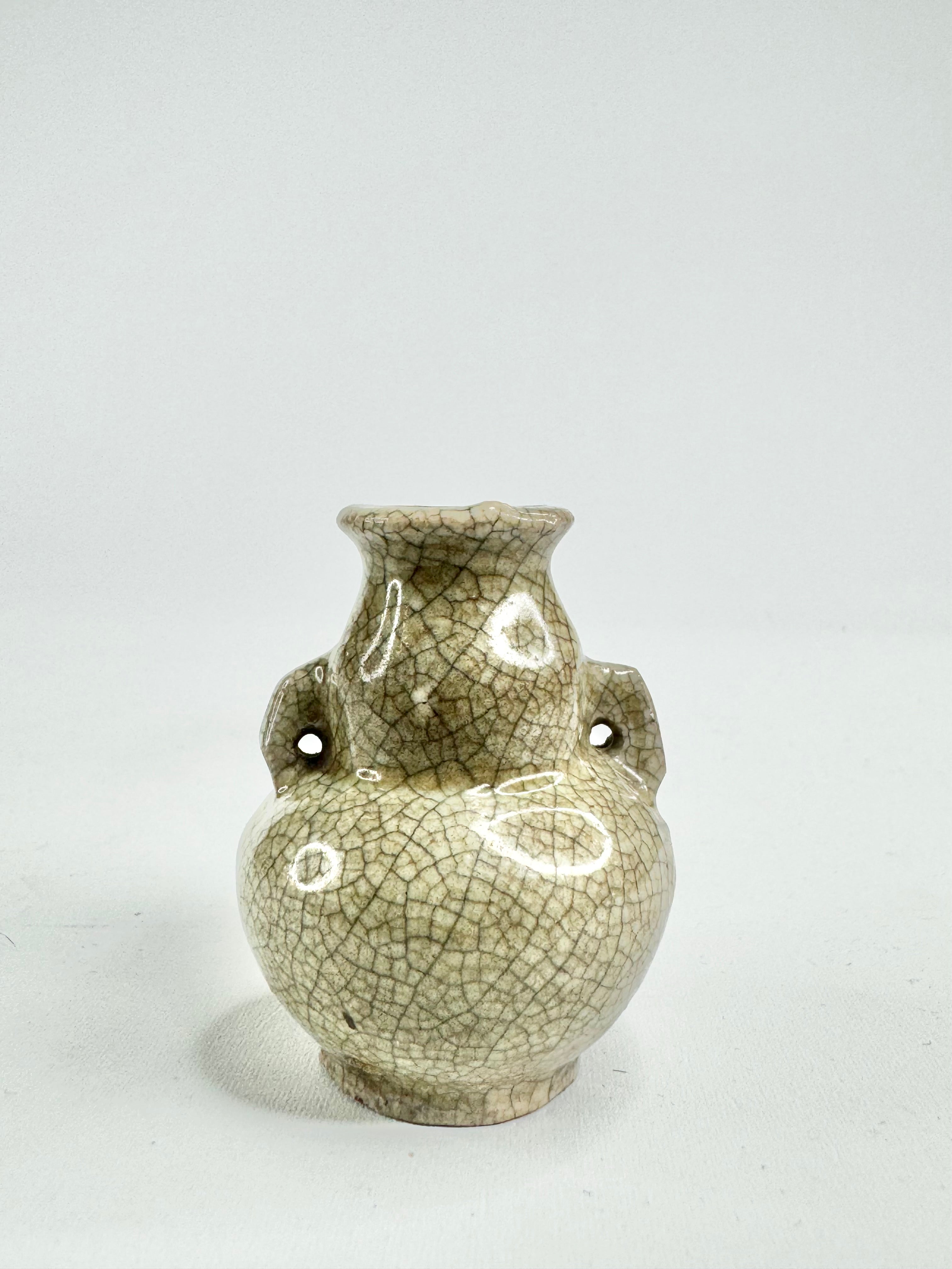A stunning miniature celadon vase in a soft green shade with crackling in the glaze. Whilst this shows this items age, it is also beautiful, much like a skeleton leaf. Along with the cracking this item does have a chip in the lip of the vase. This is part of a collection donated to the online store by a private donor. This came from their late mothers collection of pottery from the Ming & Qing Dynasties.