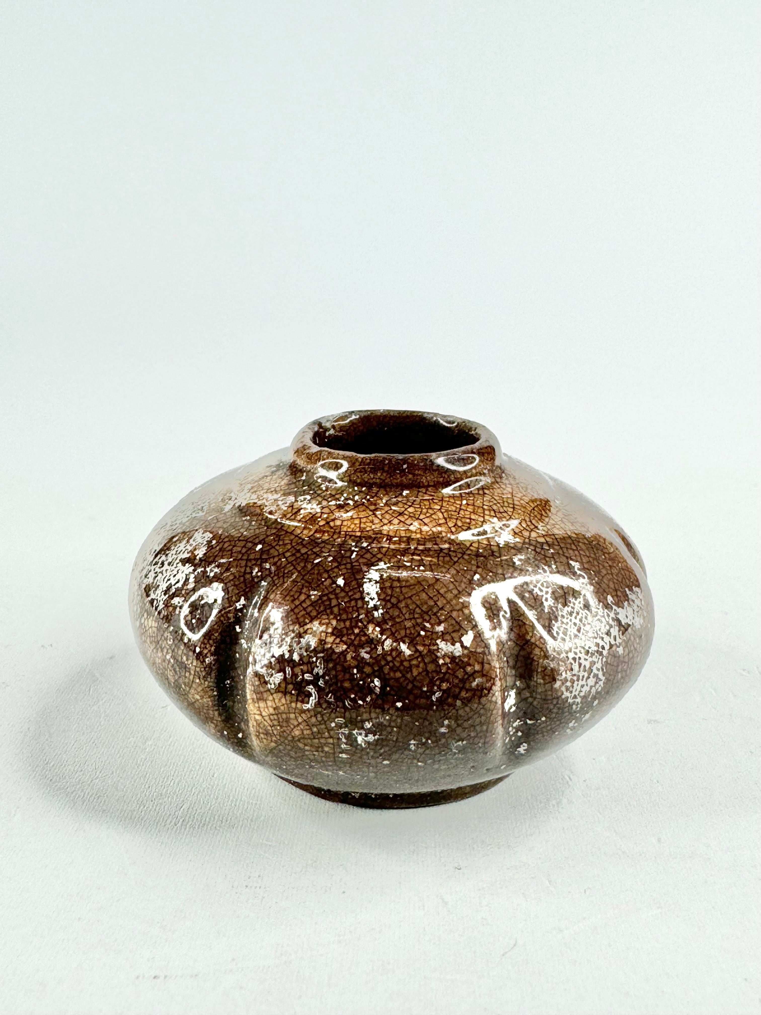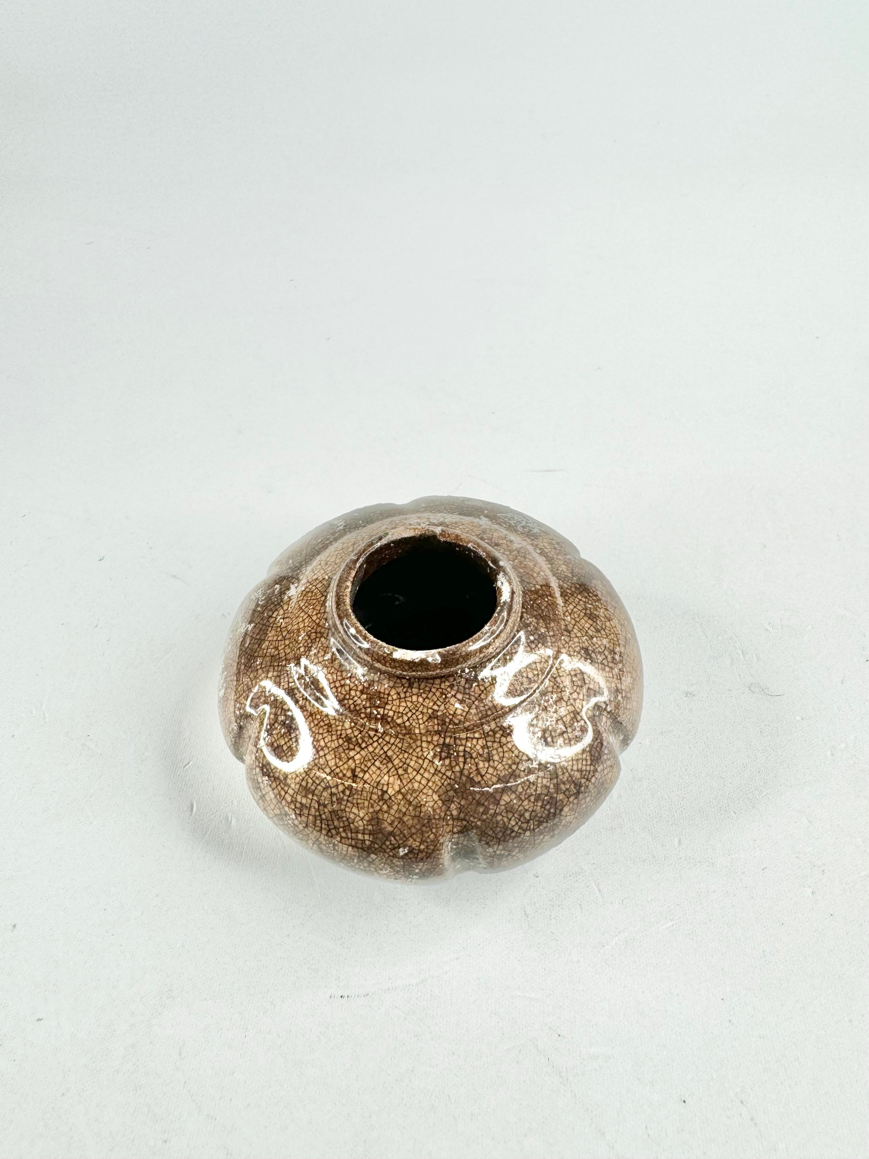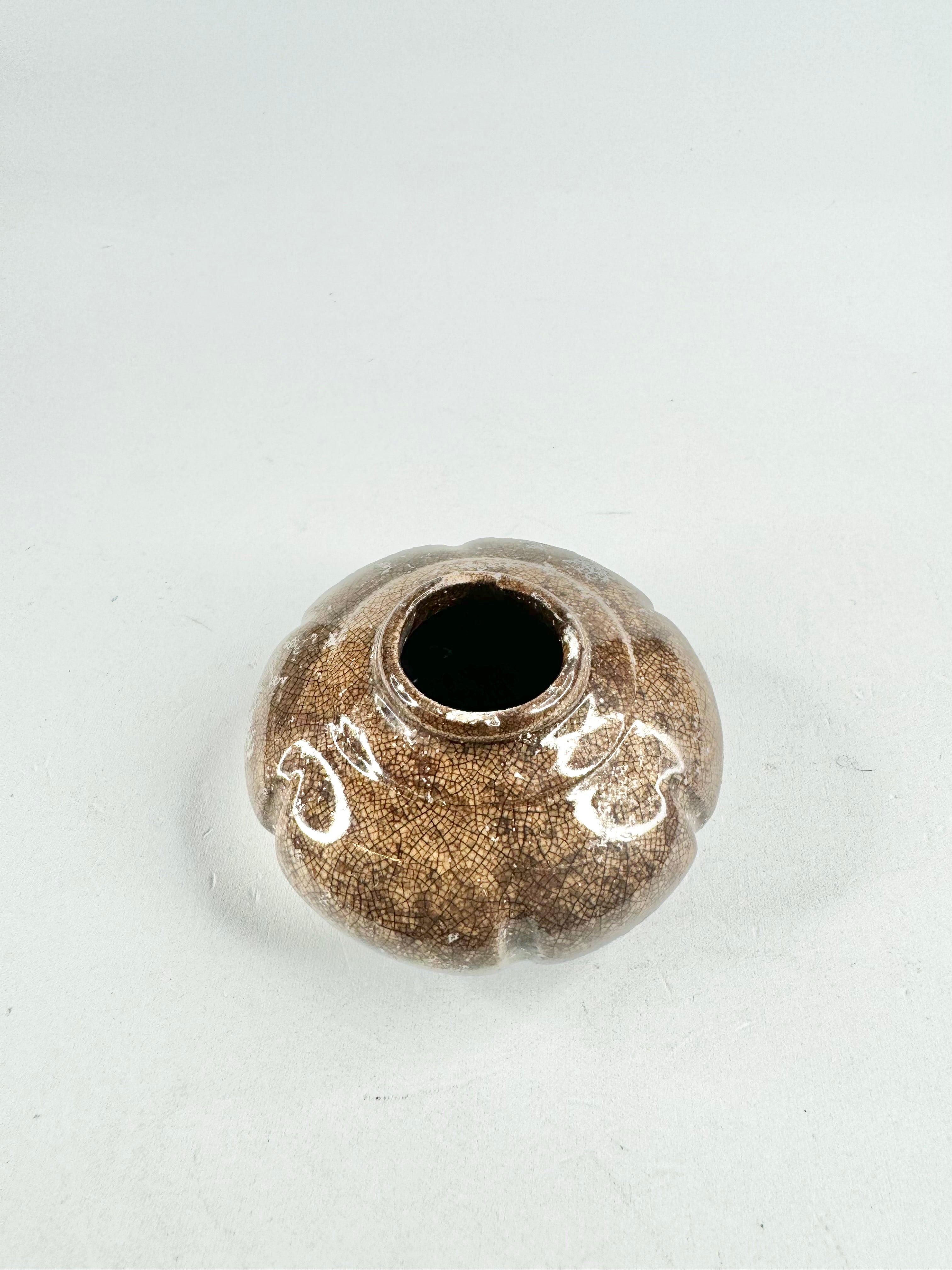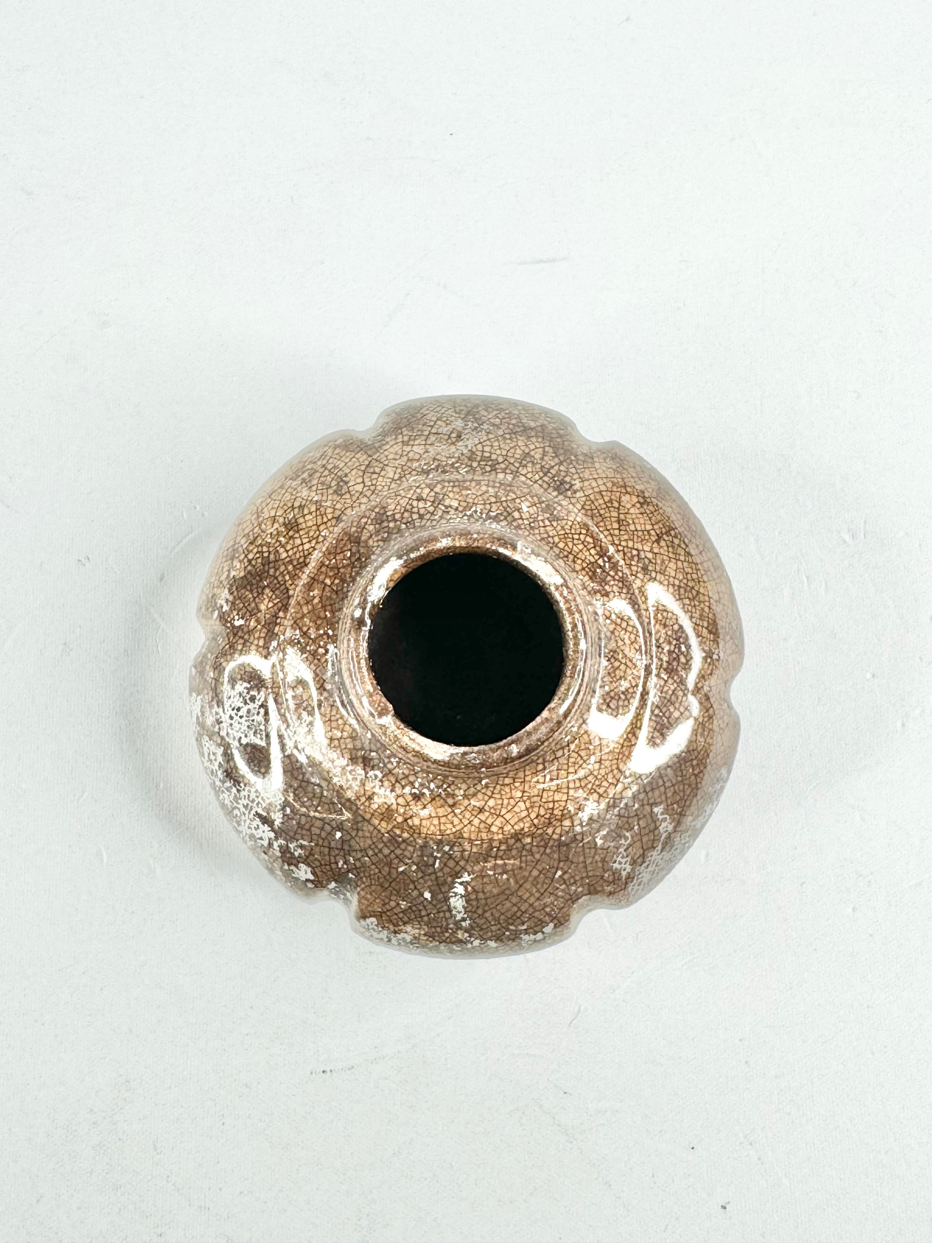 A quite little jarlet, though some research has suggested this may have even been used as a lamp base! This antique item has a high shine glaze; it does have overall crackling in the glaze and some discolouration. It has lovely, decorative indents and overall, cracking in the glass aside, is in excellent antique condition.