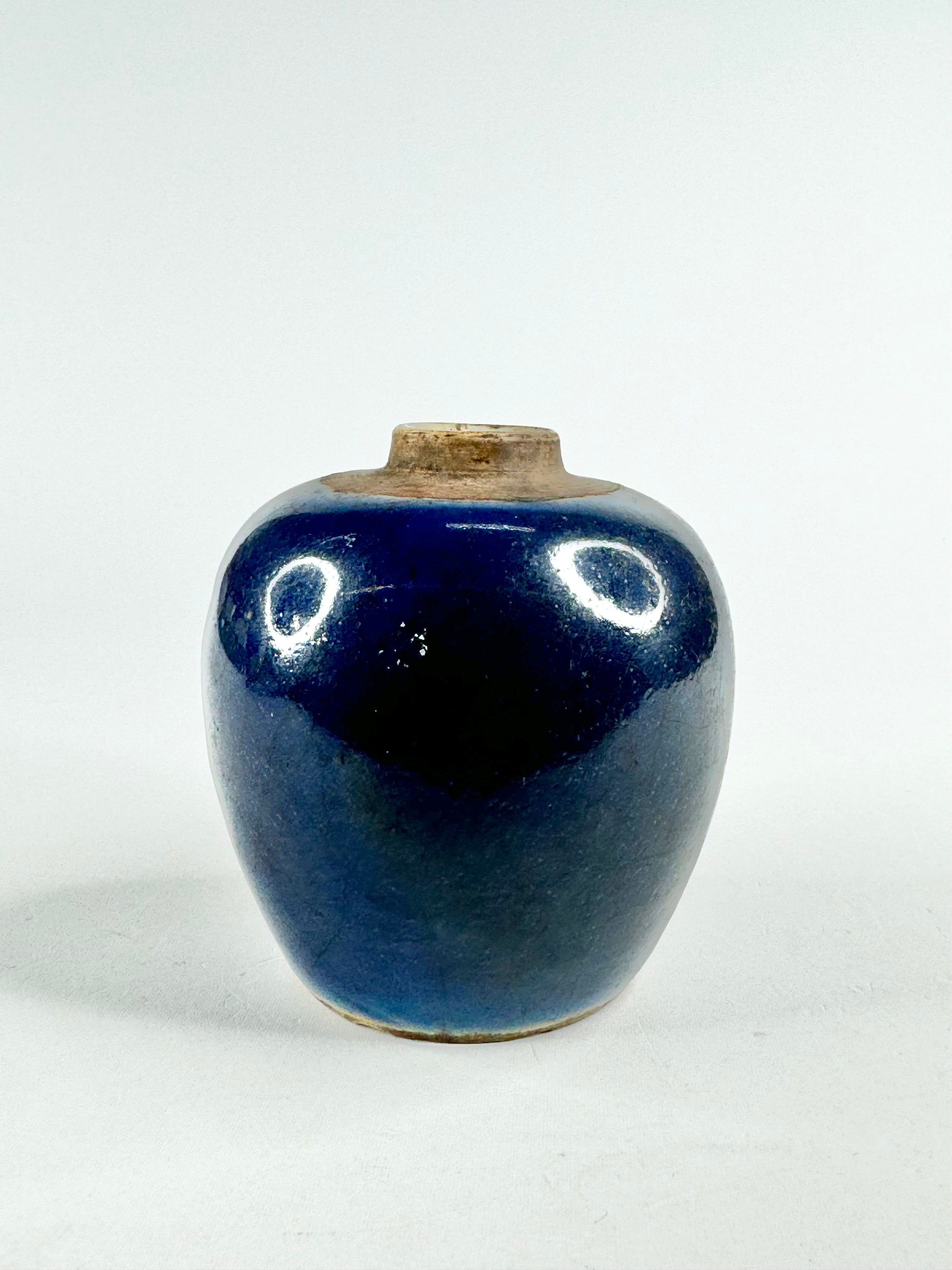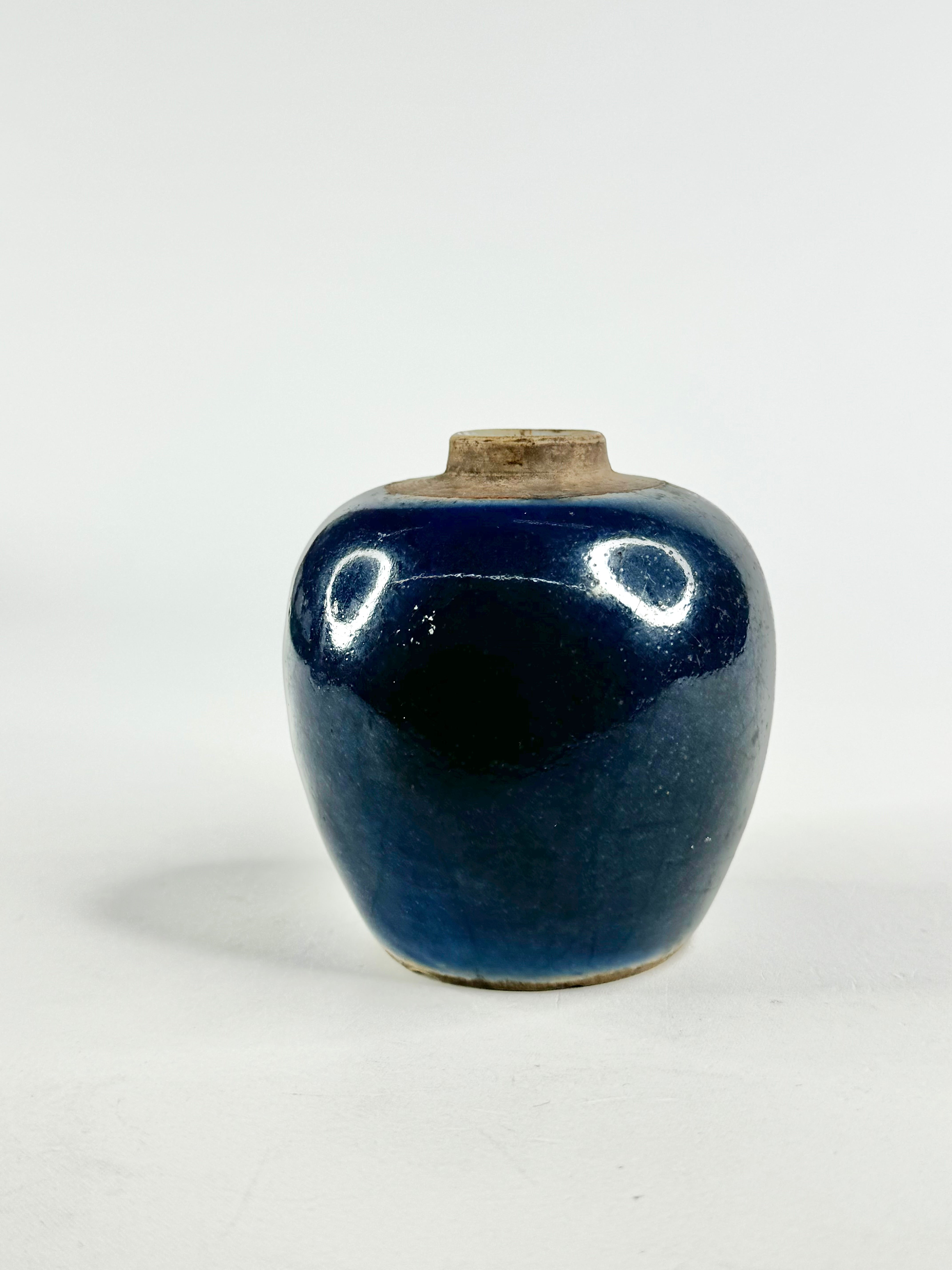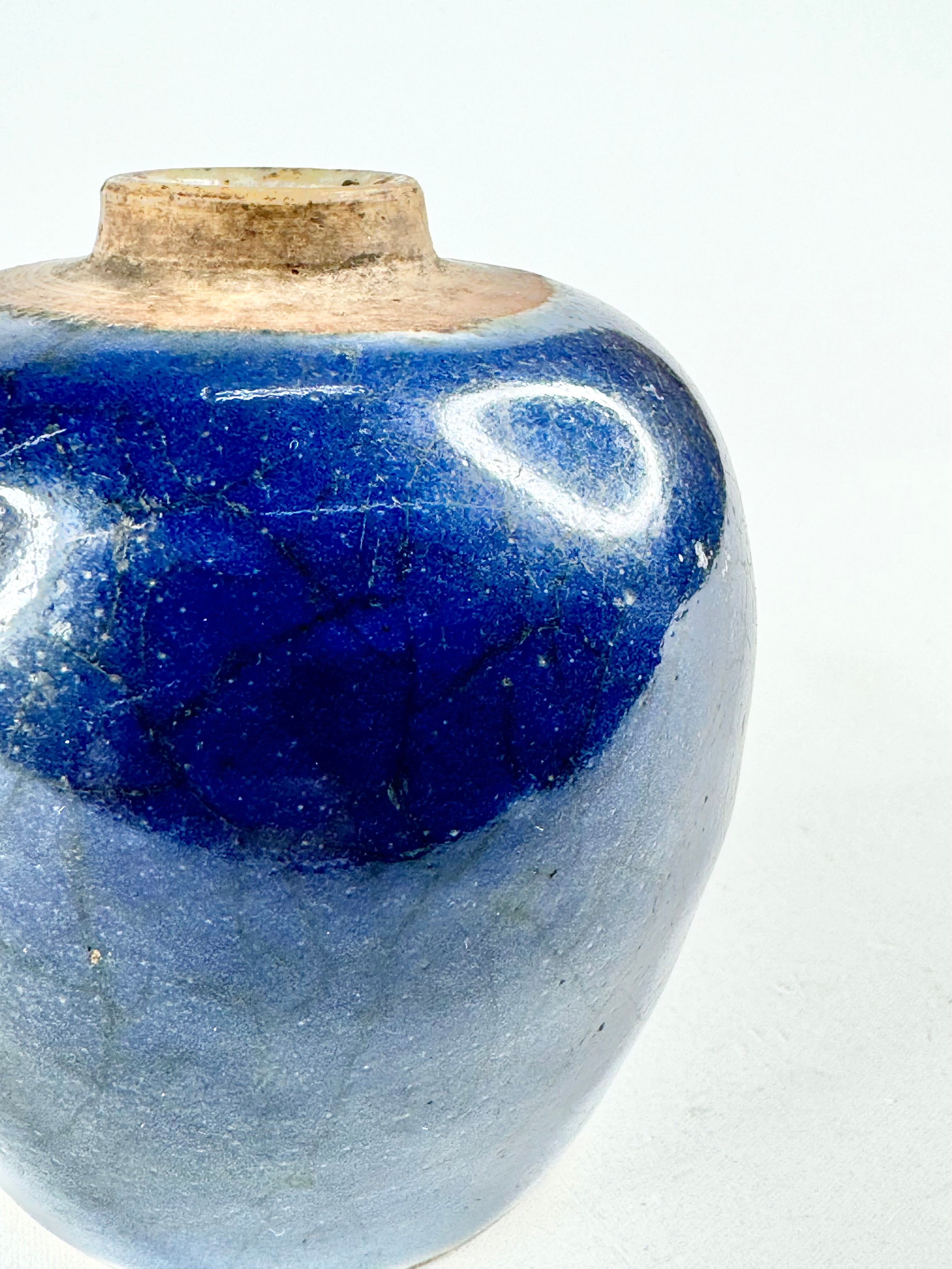 A rich blue glazed vase, antique and beautiful. The deep cobalt blue fades in part and upon close inspection you can see large cracks in the glaze. There is a small chip in the rim of the jar and some on the base. This item was part of a collection generously donated by a private donor. These items came from their late mother's collection of Qing & Ming Dynasty pottery.