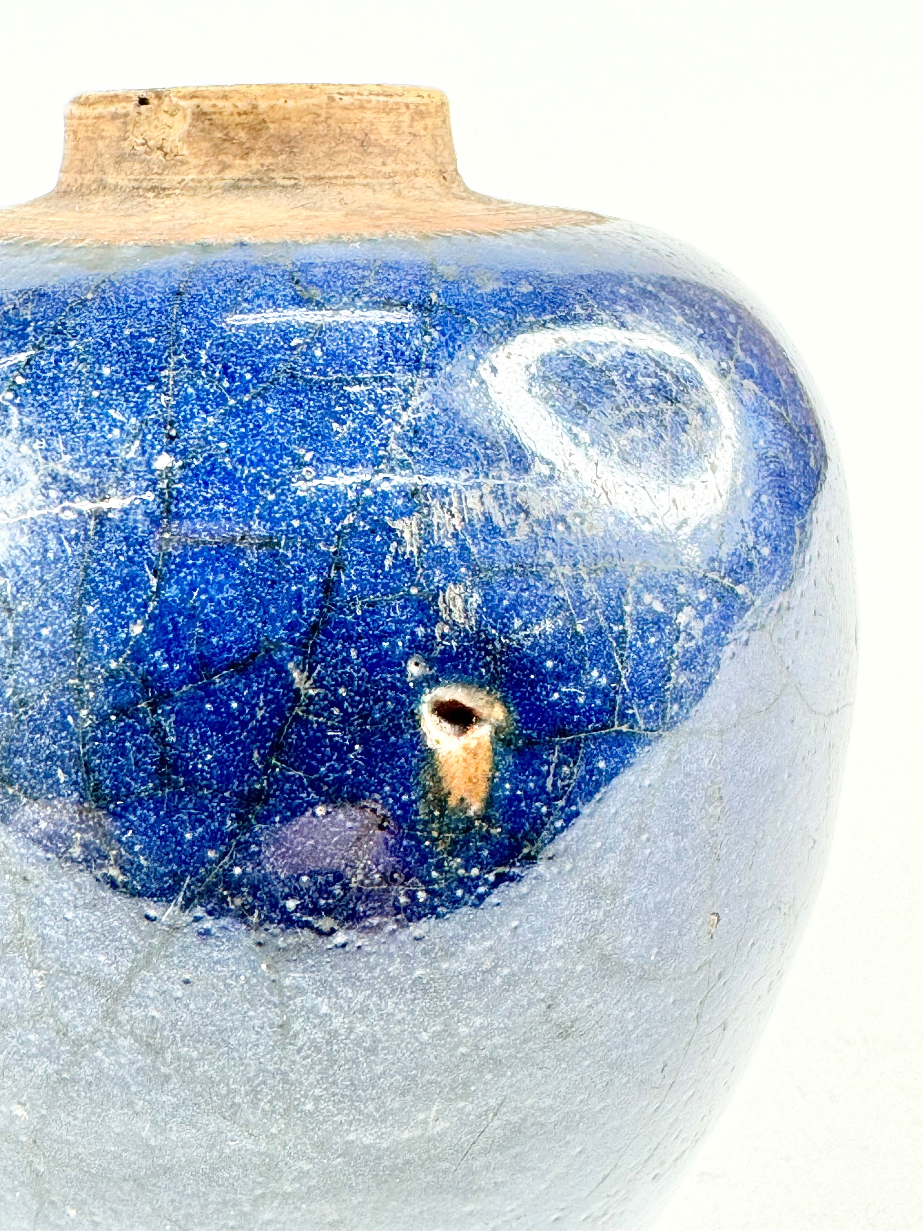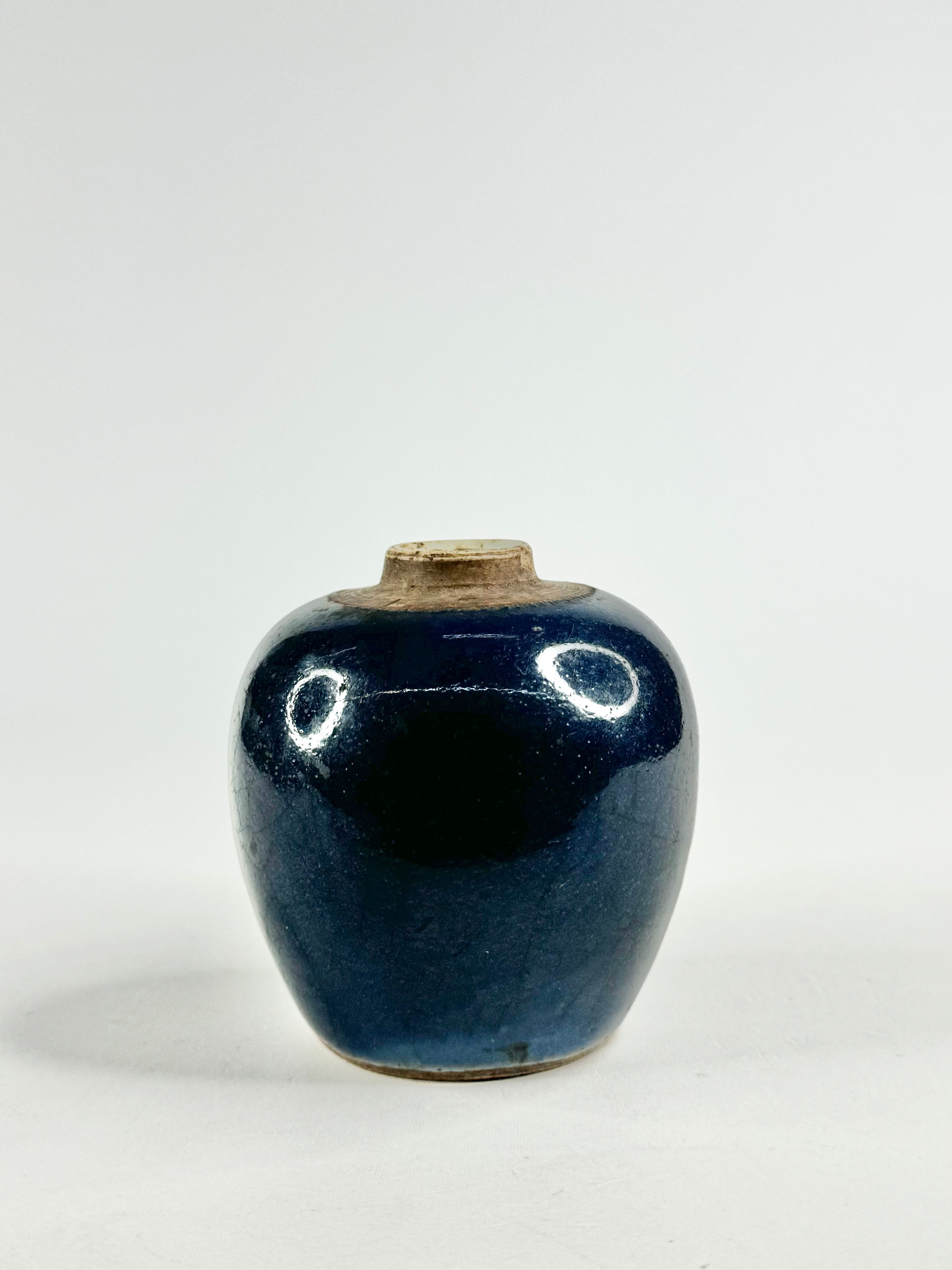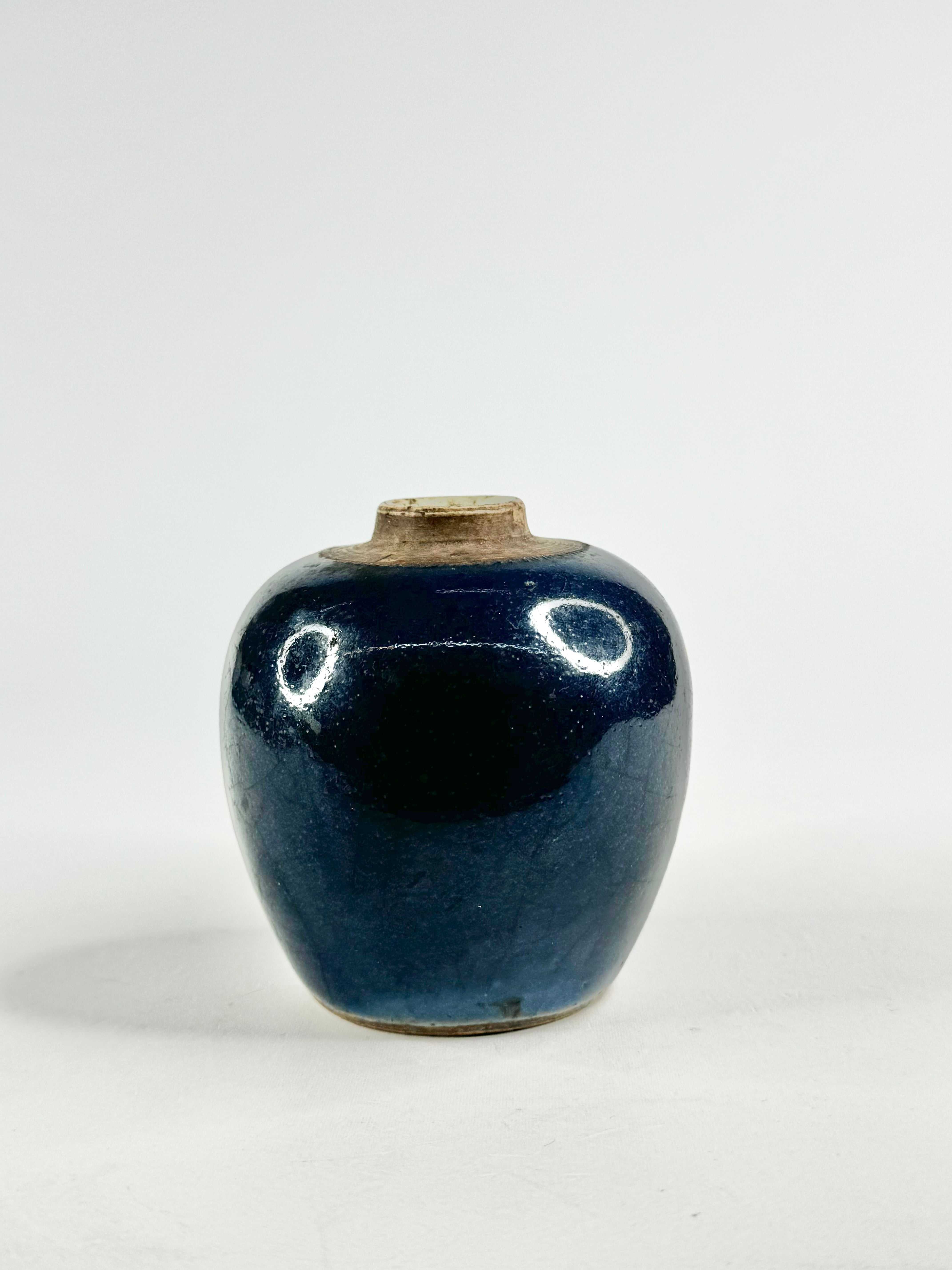 A rich blue glazed vase, antique and beautiful. The deep cobalt blue fades in part and upon close inspection you can see large cracks in the glaze. There is a small chip in the rim of the jar and some on the base. This item was part of a collection generously donated by a private donor. These items came from their late mother's collection of Qing & Ming Dynasty pottery.