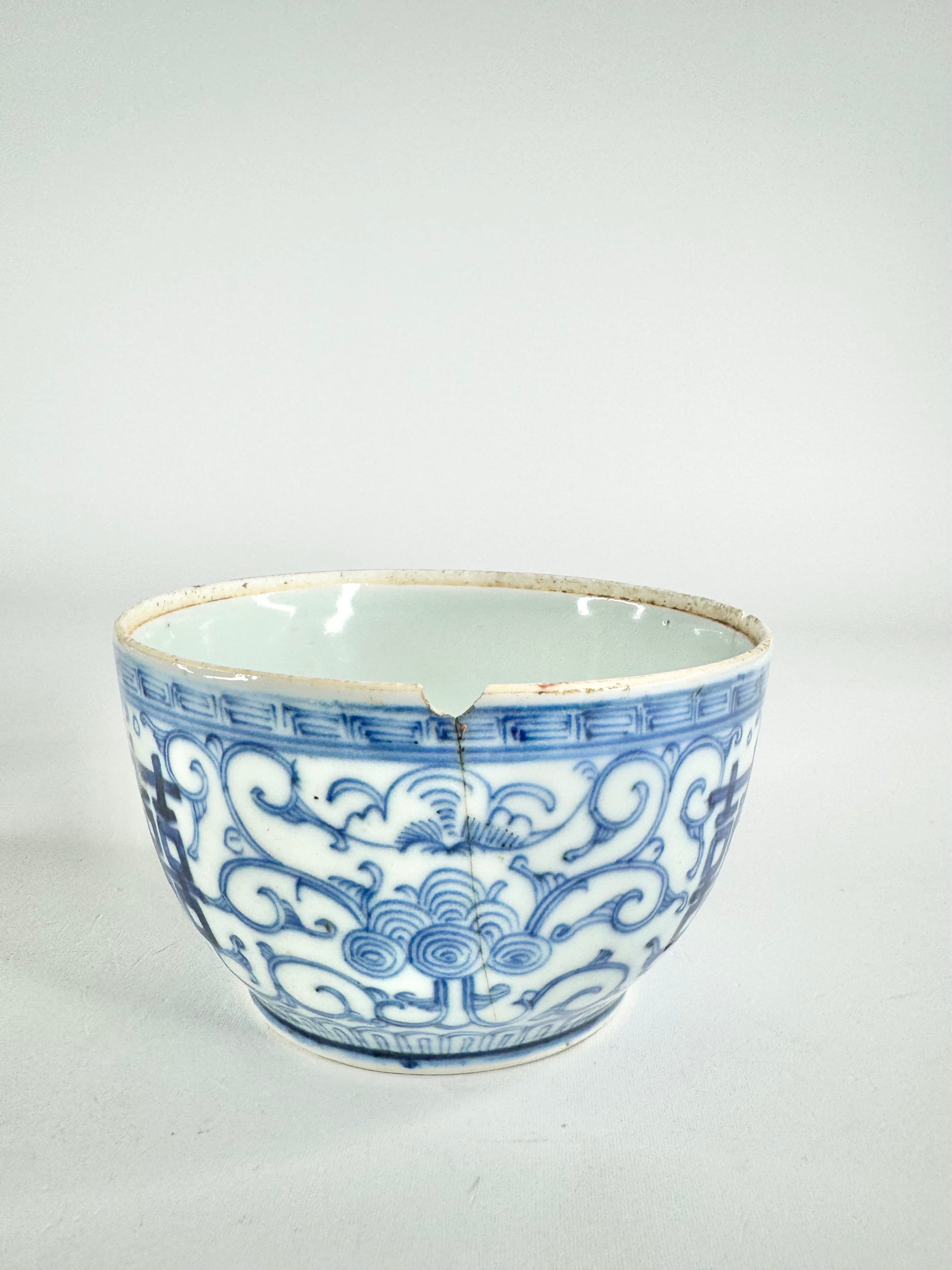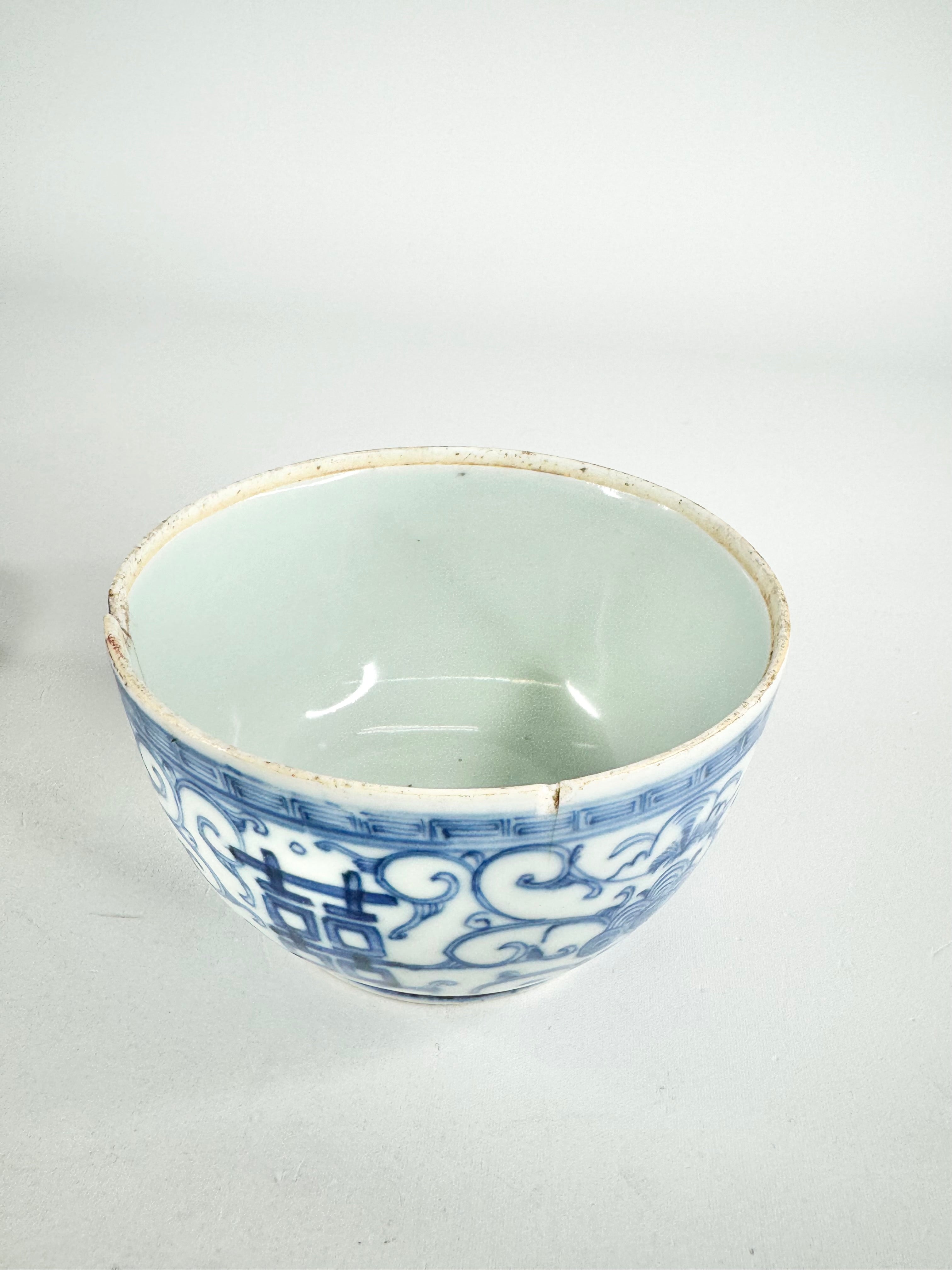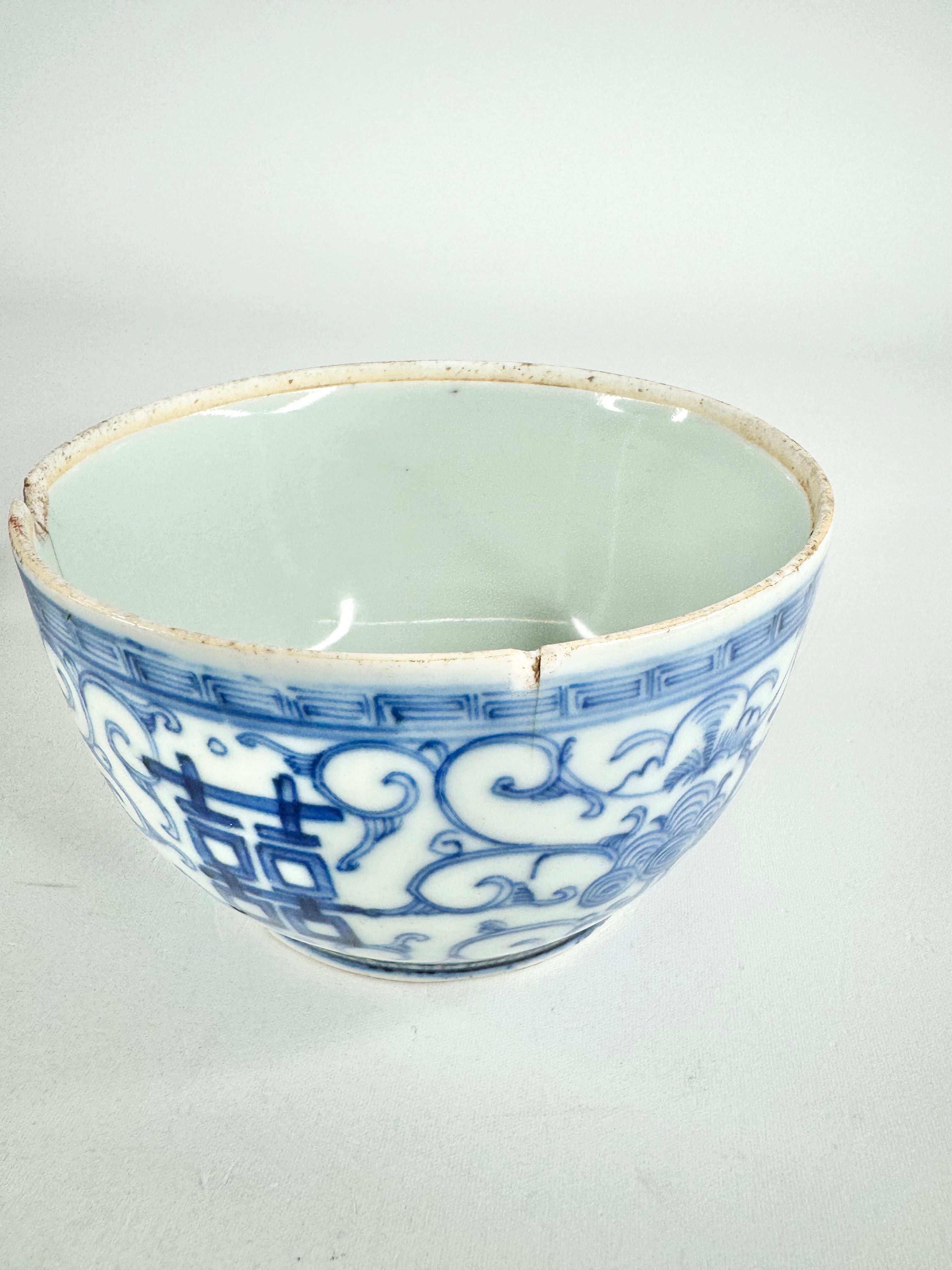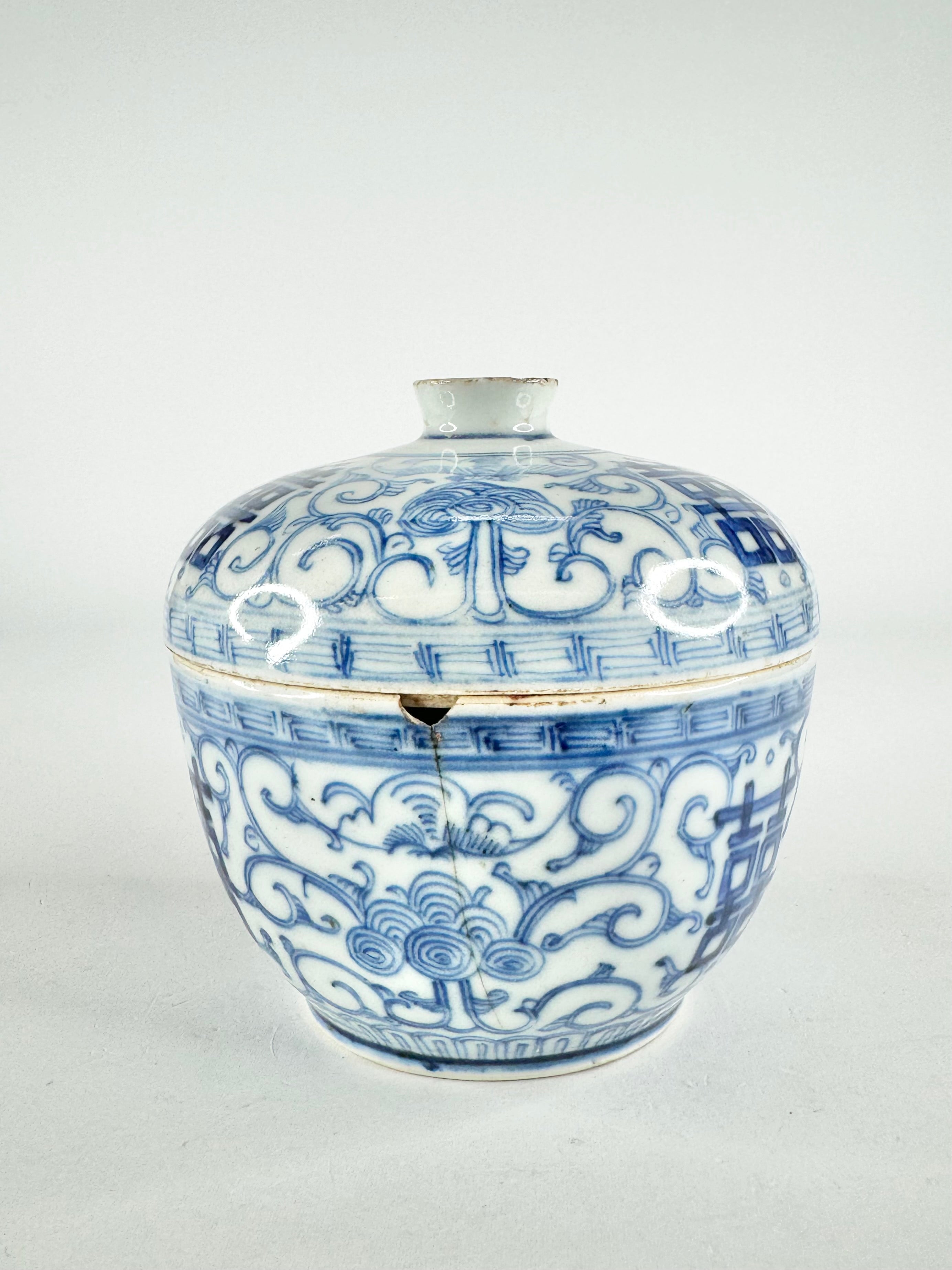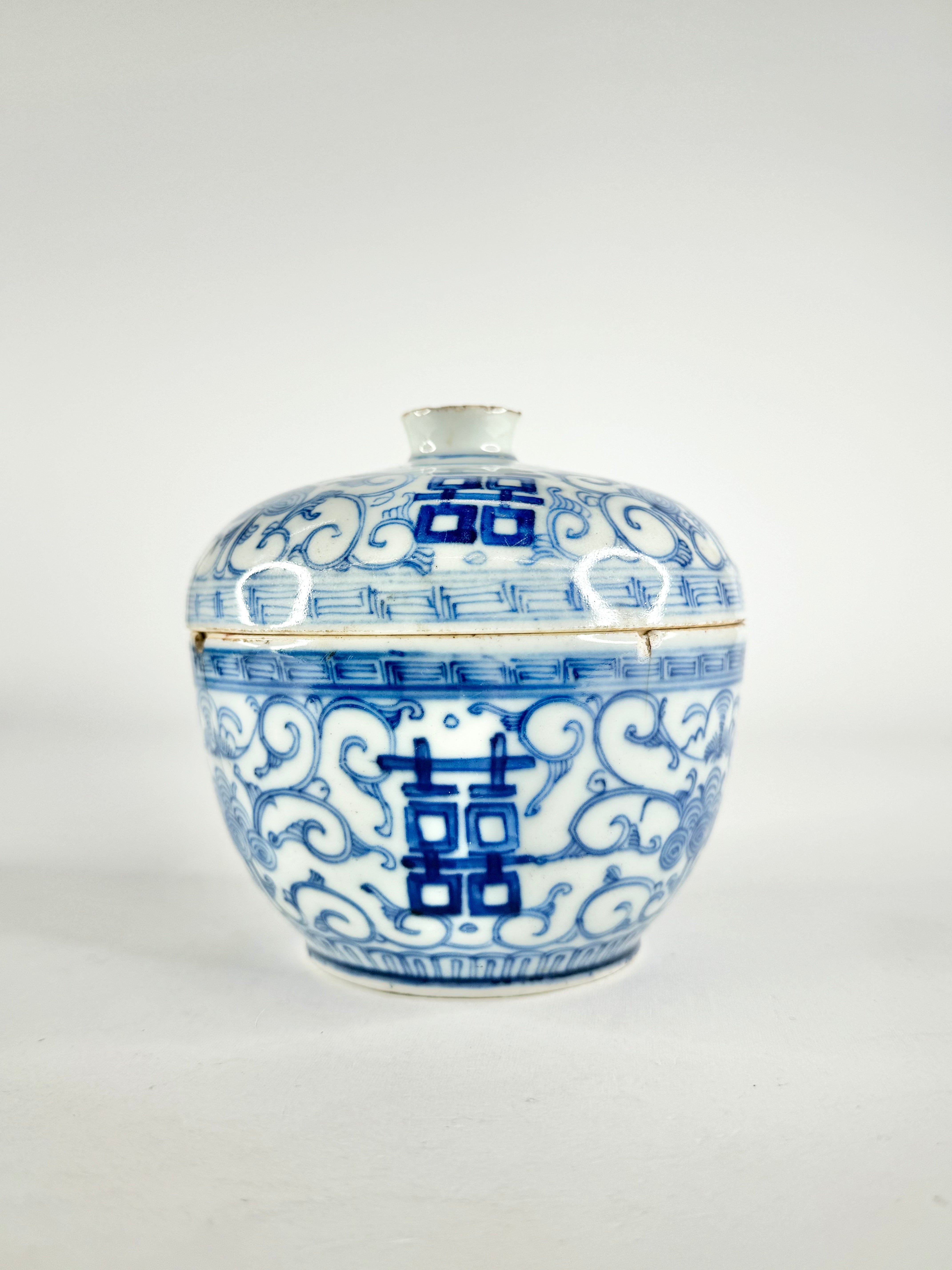 This is a beautiful porcelain piece, with the double happiness motif on the base and lid. Intricate swirls in that beautiful, porcelain blue decorate throughout. This is an antique item and does have wear including chips in the lid and bowl and some cracks.