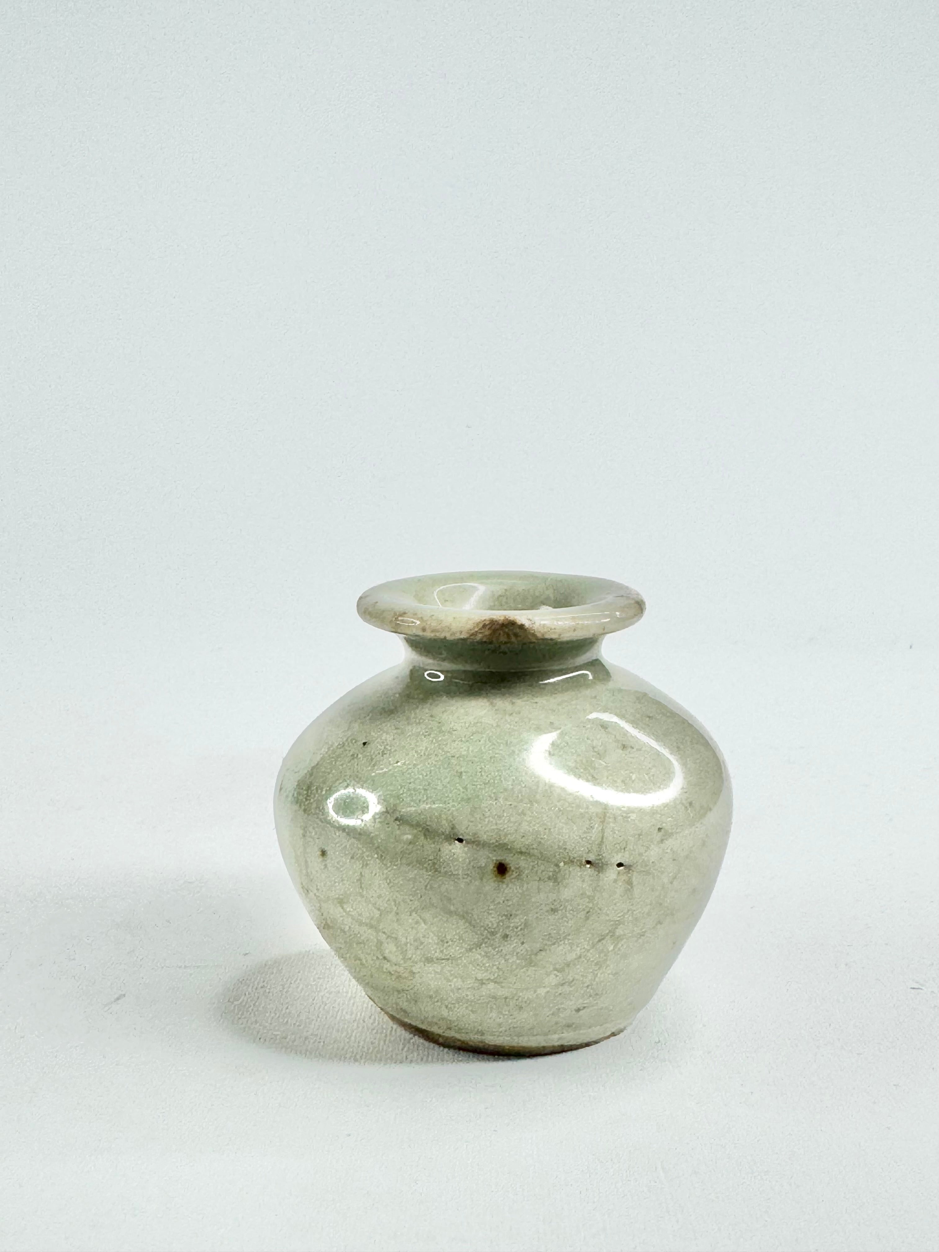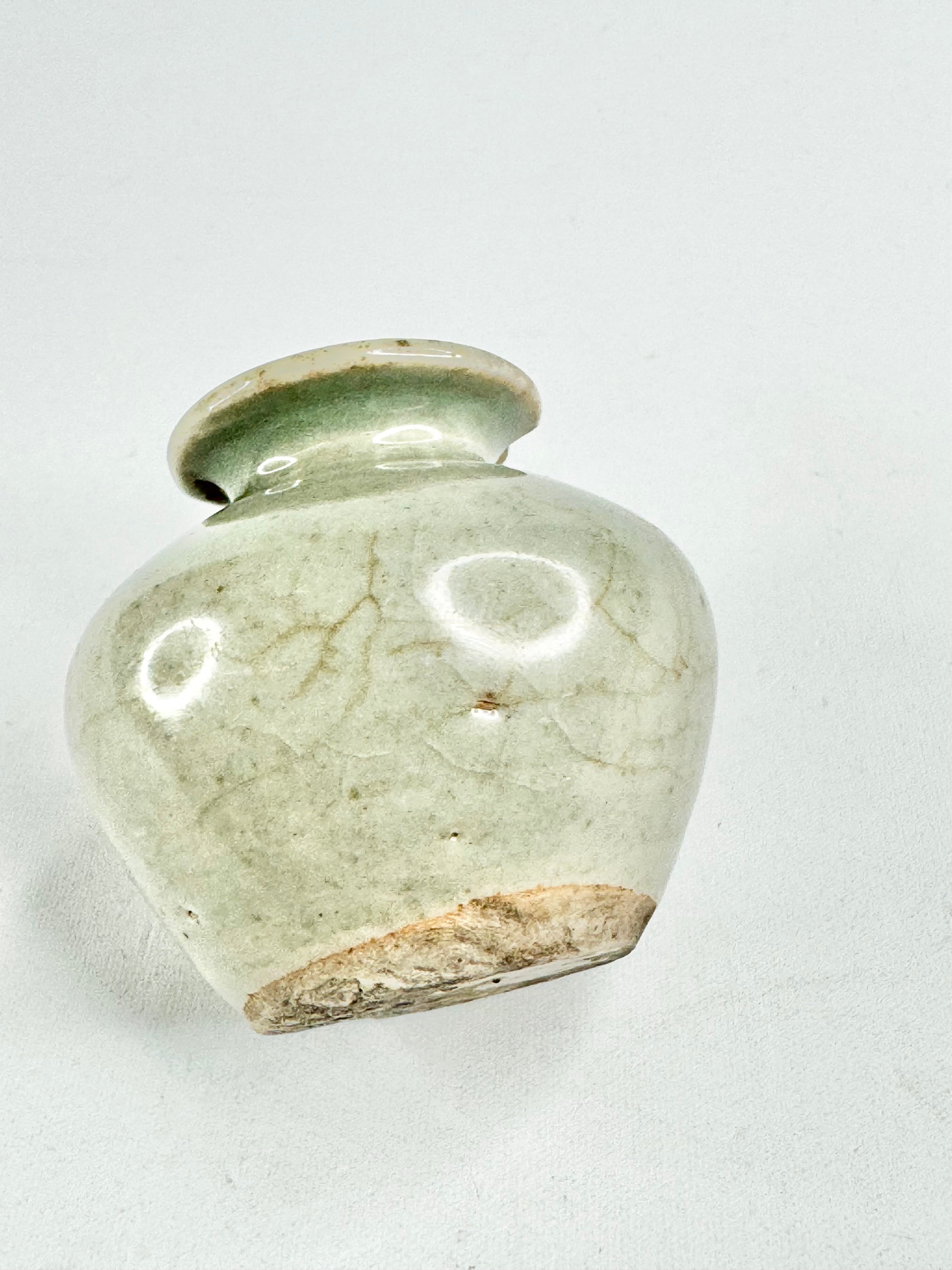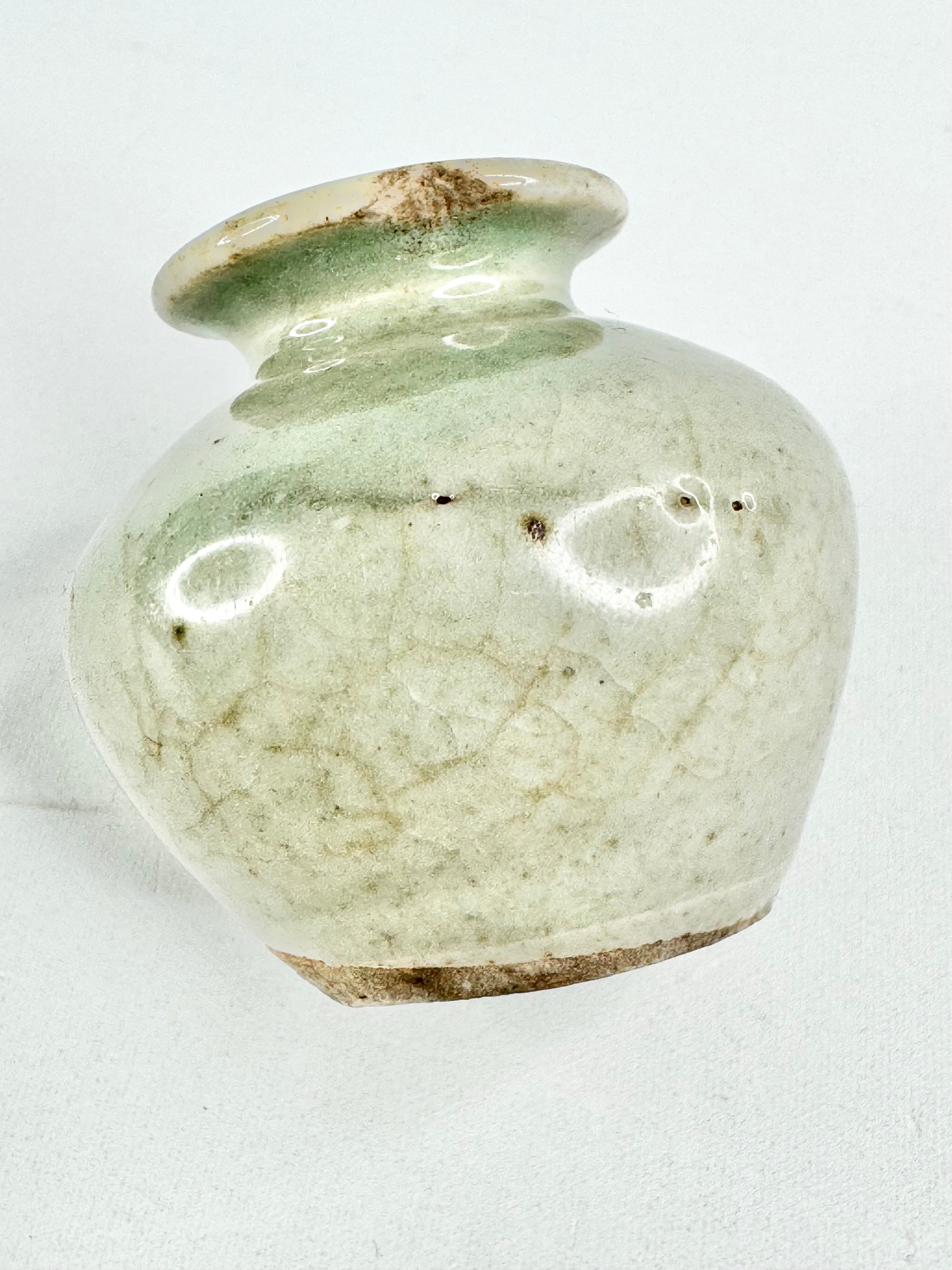An antique Chinese jarlet in a shiny, green grey glaze, with some subtle cracking visible when up close. This has a small chip in the rim of the case and appears to be made from stoneware. The base of this item is rough with blue marks but due to wear these are splodgy. This item was part of a collection generously donated by a private donor. These items came from their late mothers collection of Qing & Ming Dynasty pottery.