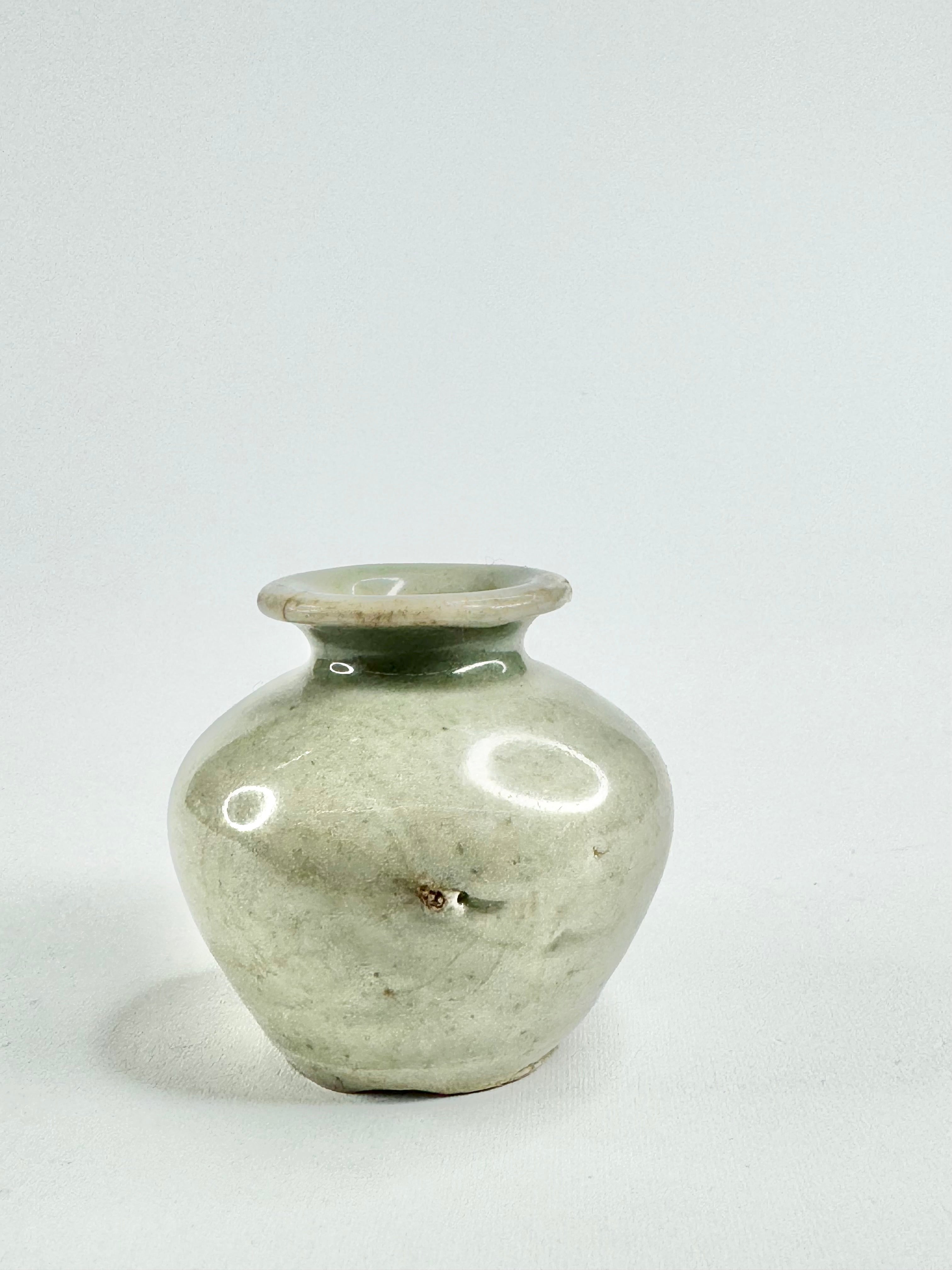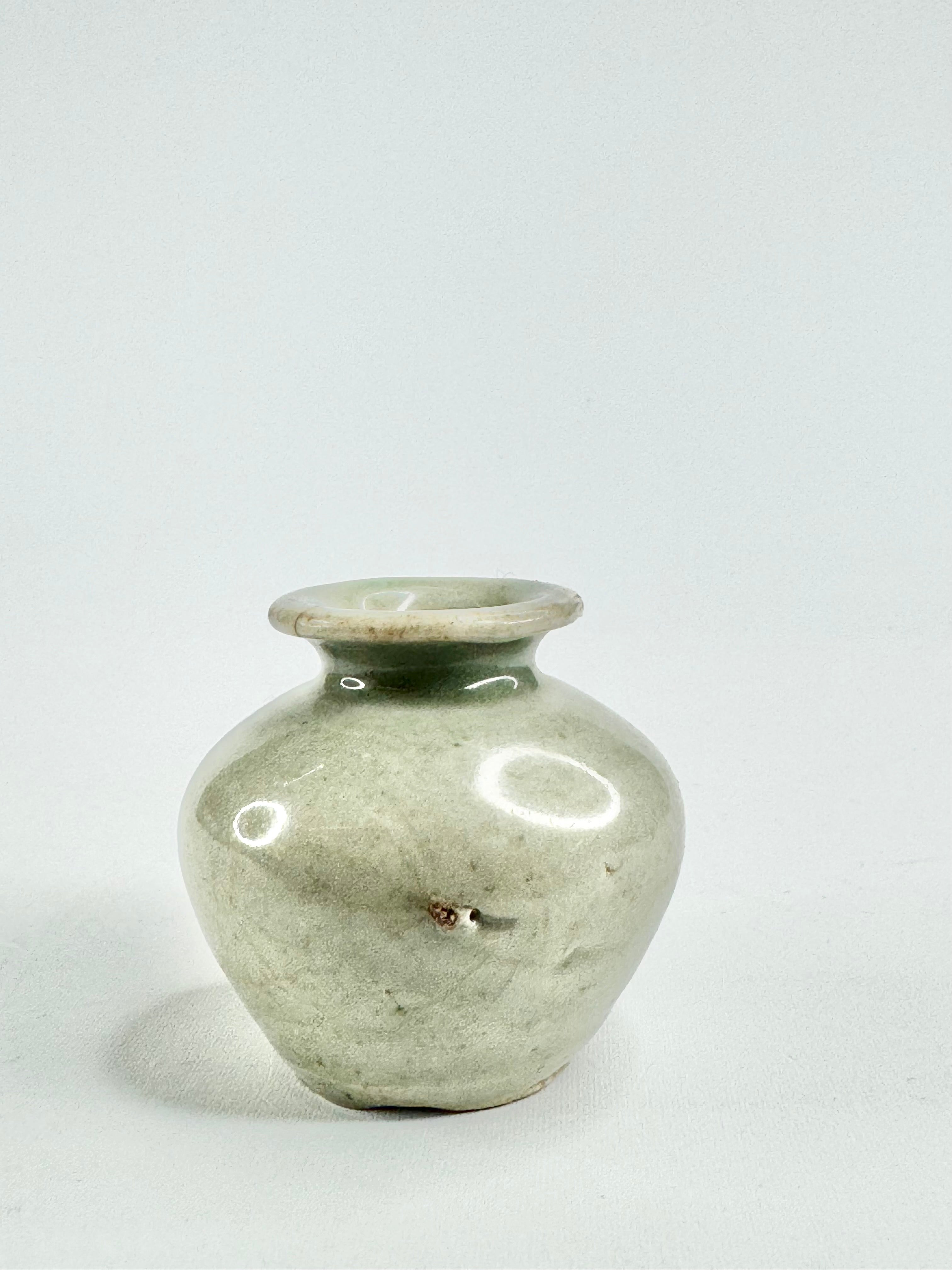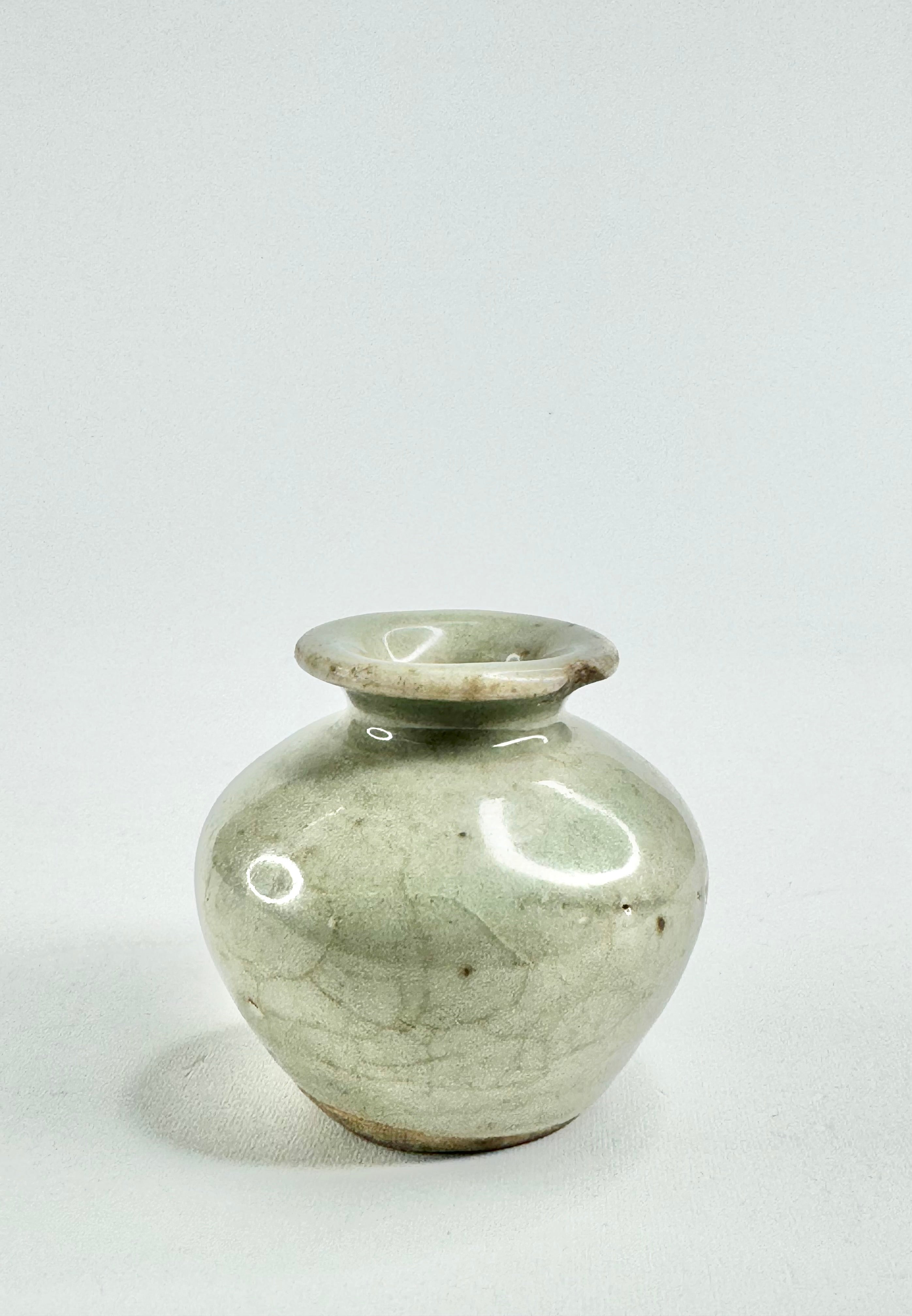 An antique Chinese jarlet in a shiny, green grey glaze, with some subtle cracking visible when up close. This has a small chip in the rim of the case and appears to be made from stoneware. The base of this item is rough with blue marks but due to wear these are splodgy. This item was part of a collection generously donated by a private donor. These items came from their late mothers collection of Qing & Ming Dynasty pottery.