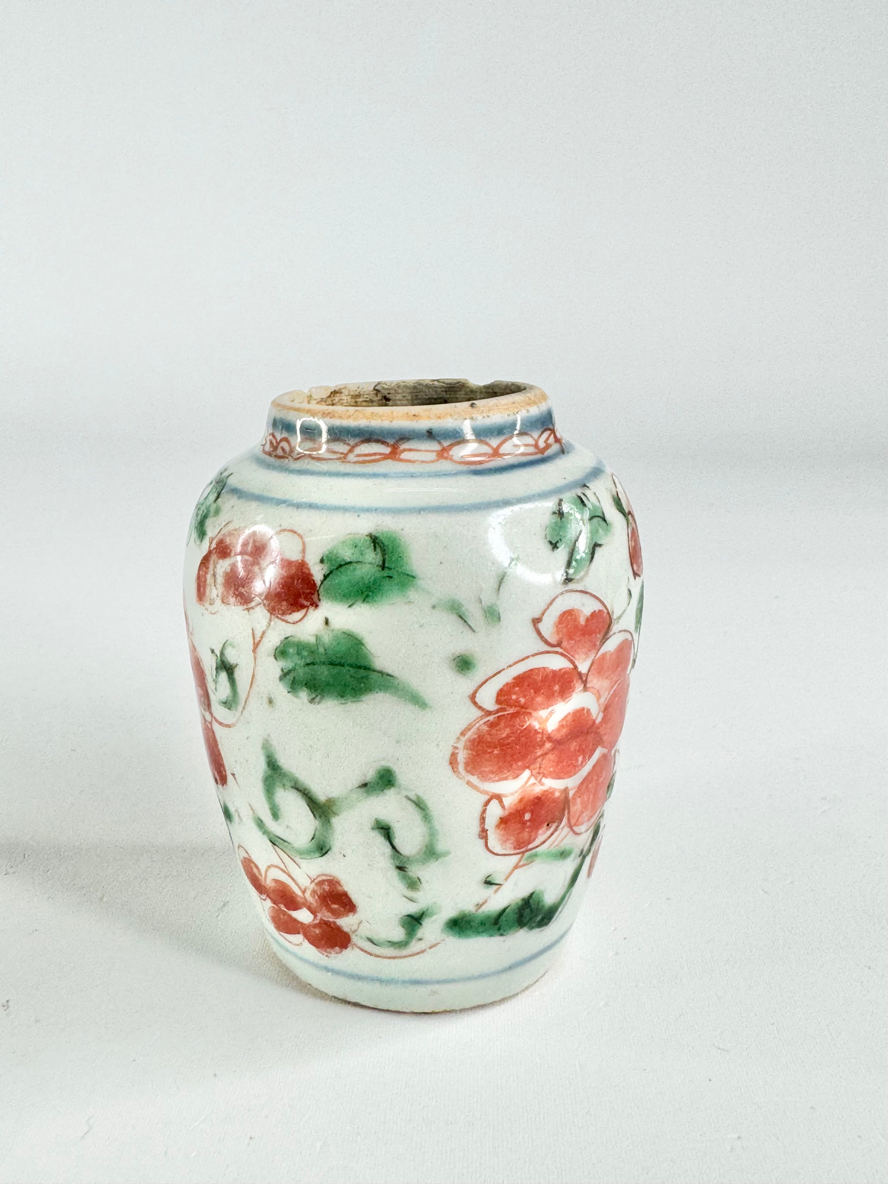 A sweet antique vase with bold red flowers and green leaves. This has cobalt blue borders and does have overall wear - including chips in the rim, cracks in the vase and hairline fractures in the pottery itself in several areas.