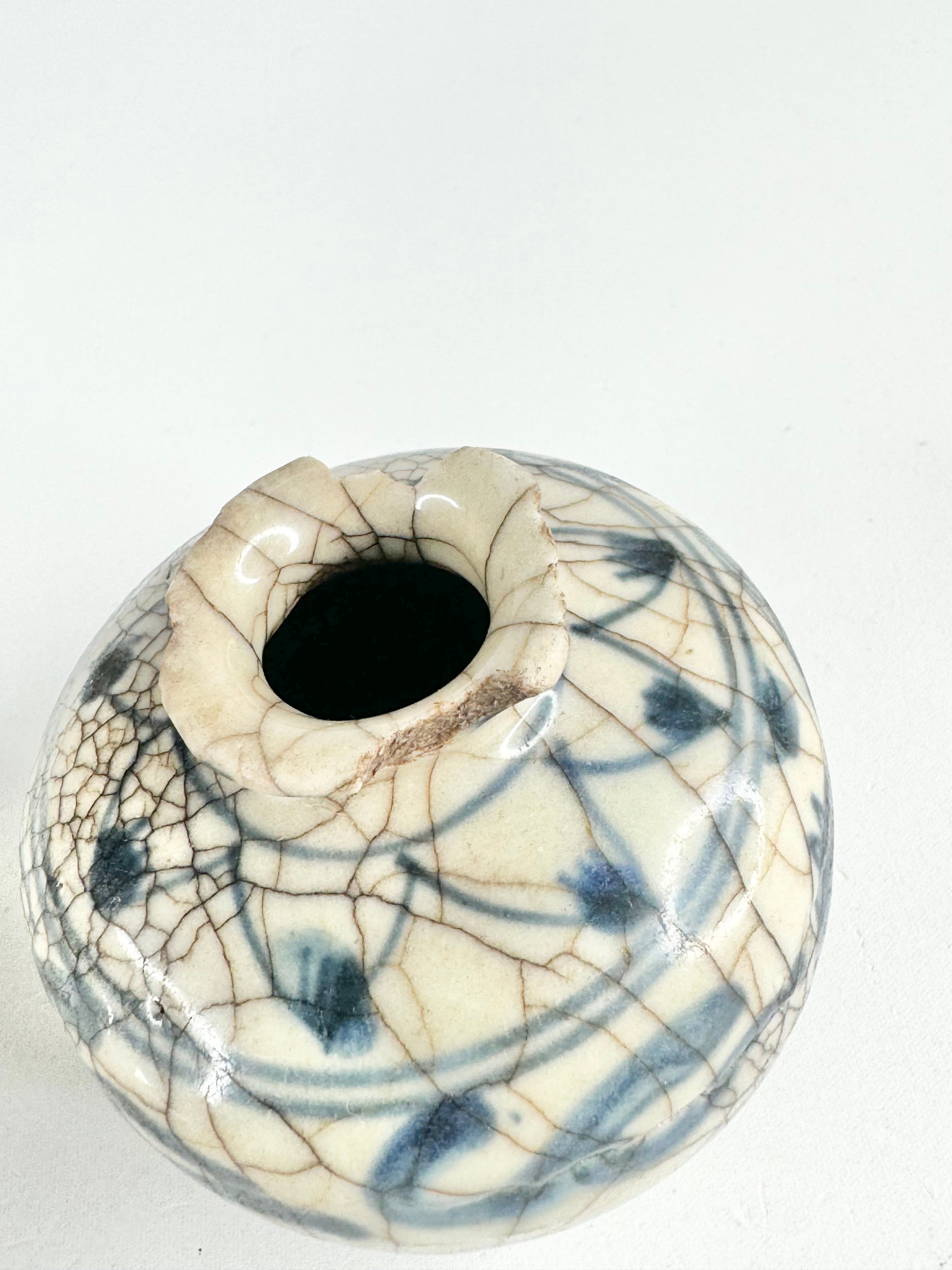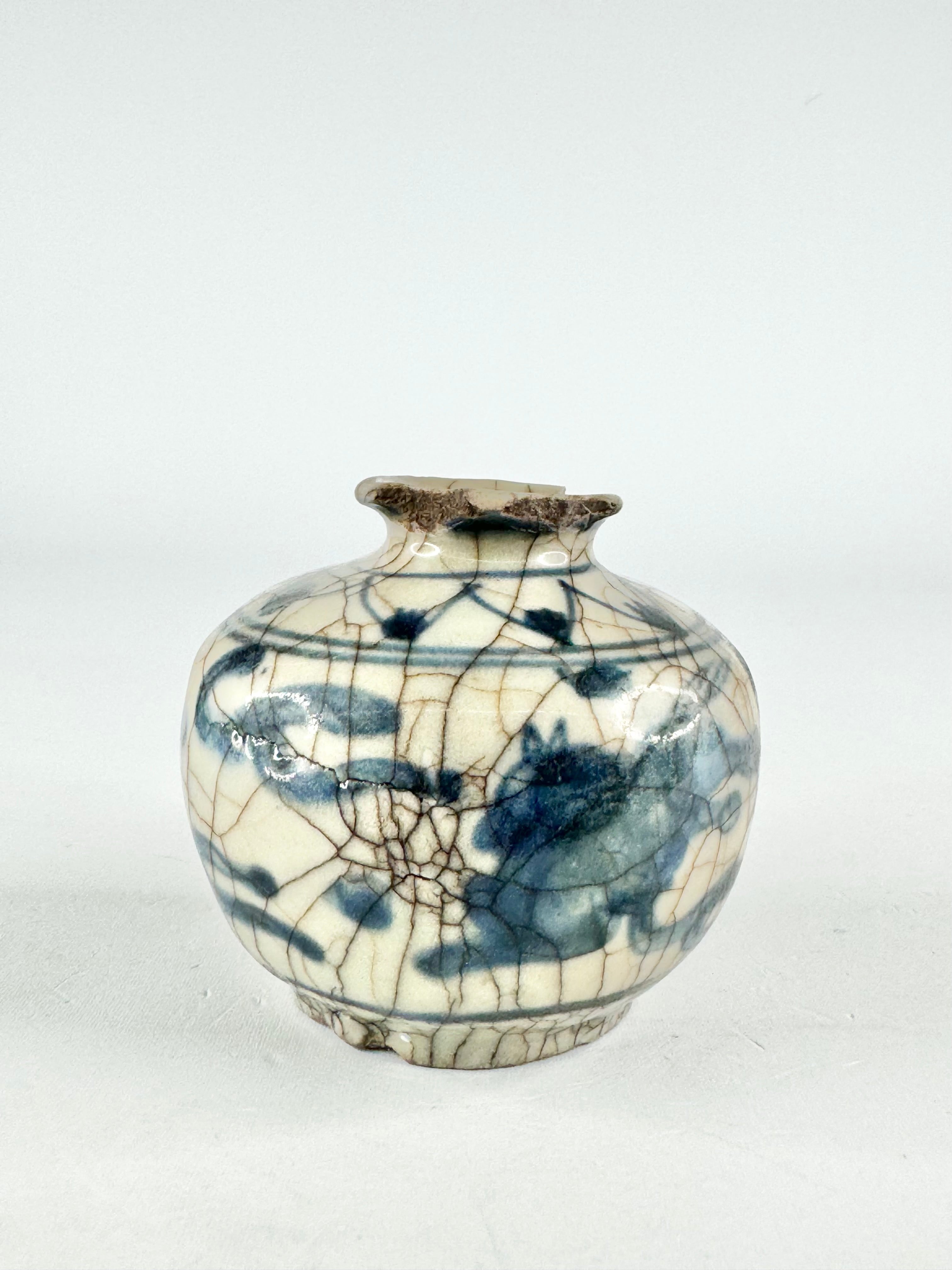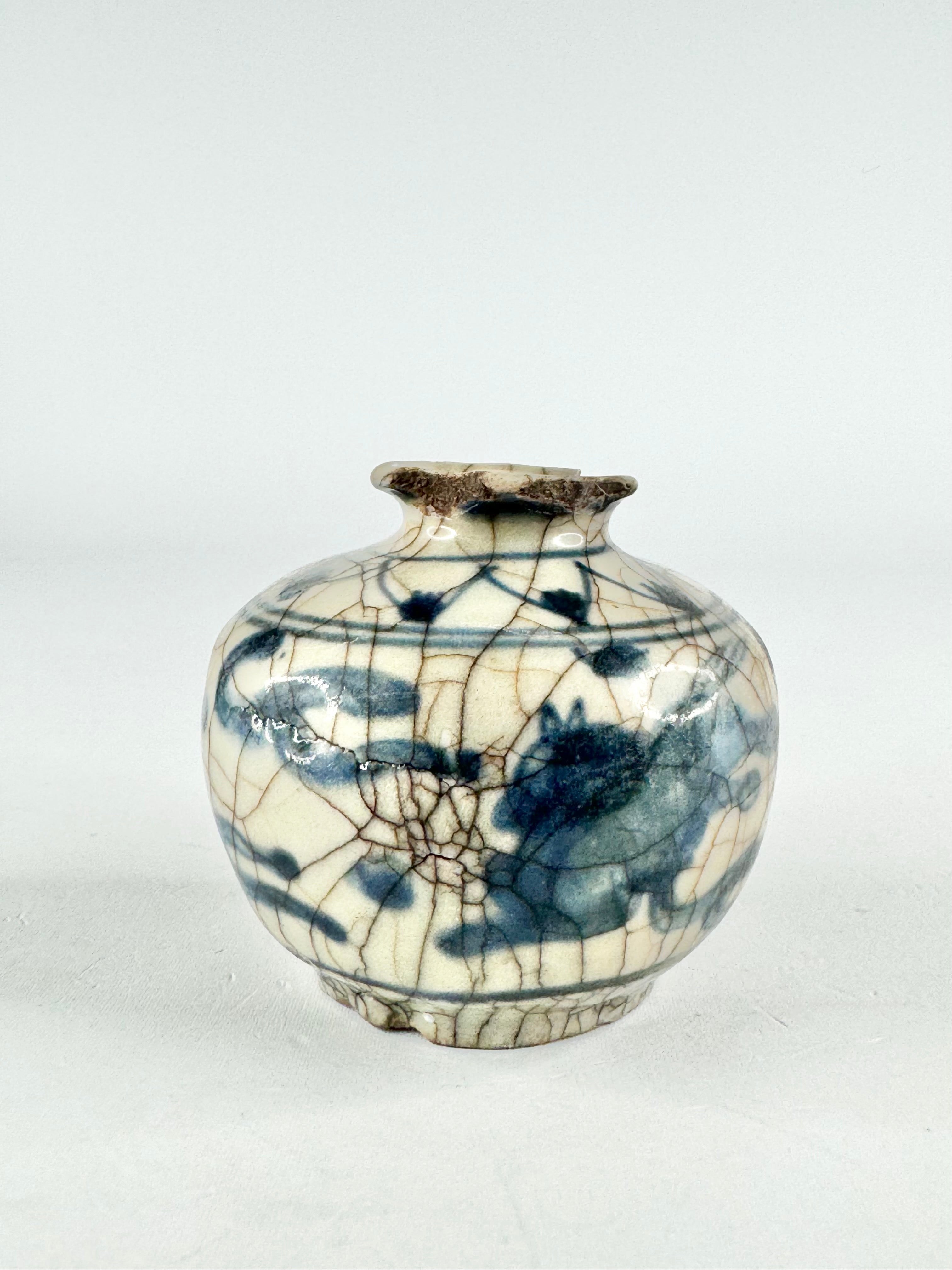 An antique jar composed of what we believe to be stoneware. This item is neutral shade and faded throughout are blue swirled patterns. Unfortunately, this antique item does have significant wear including a large, chipped panel on the base, cracking in the glaze and fine hairline fractures in the pottery itself. This item was part of a collection generously donated by a private donor. These items came from their late mother's collection of Qing & Ming Dynasty pottery.