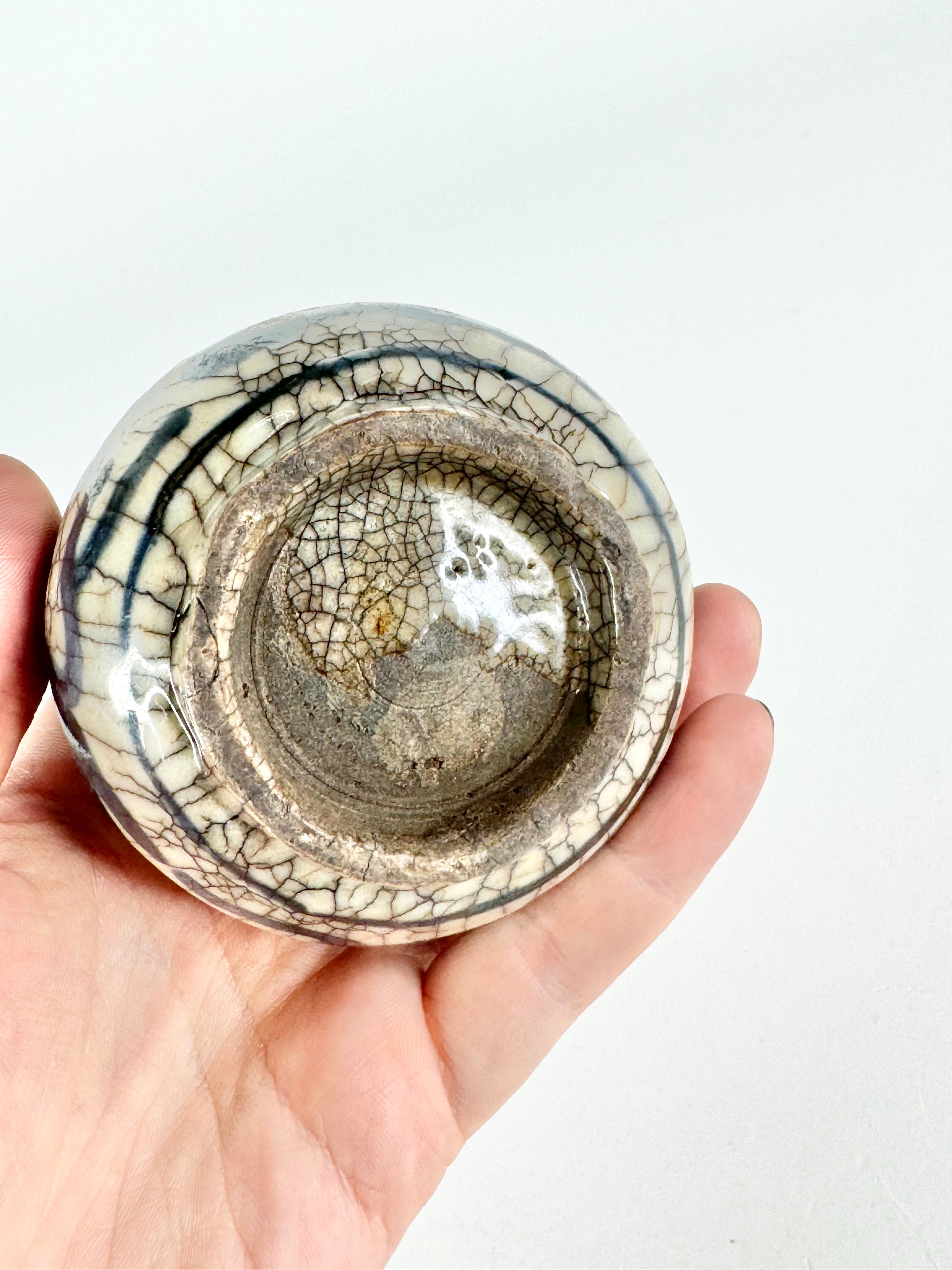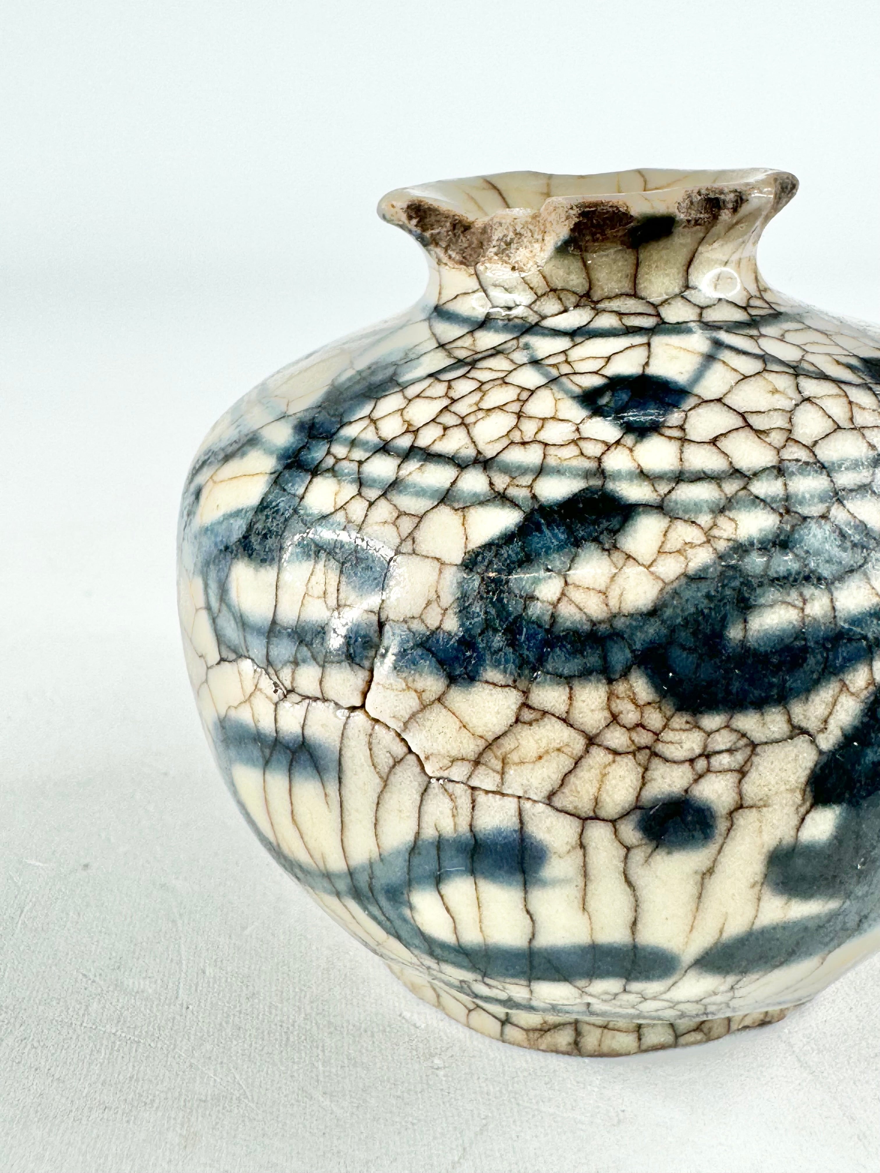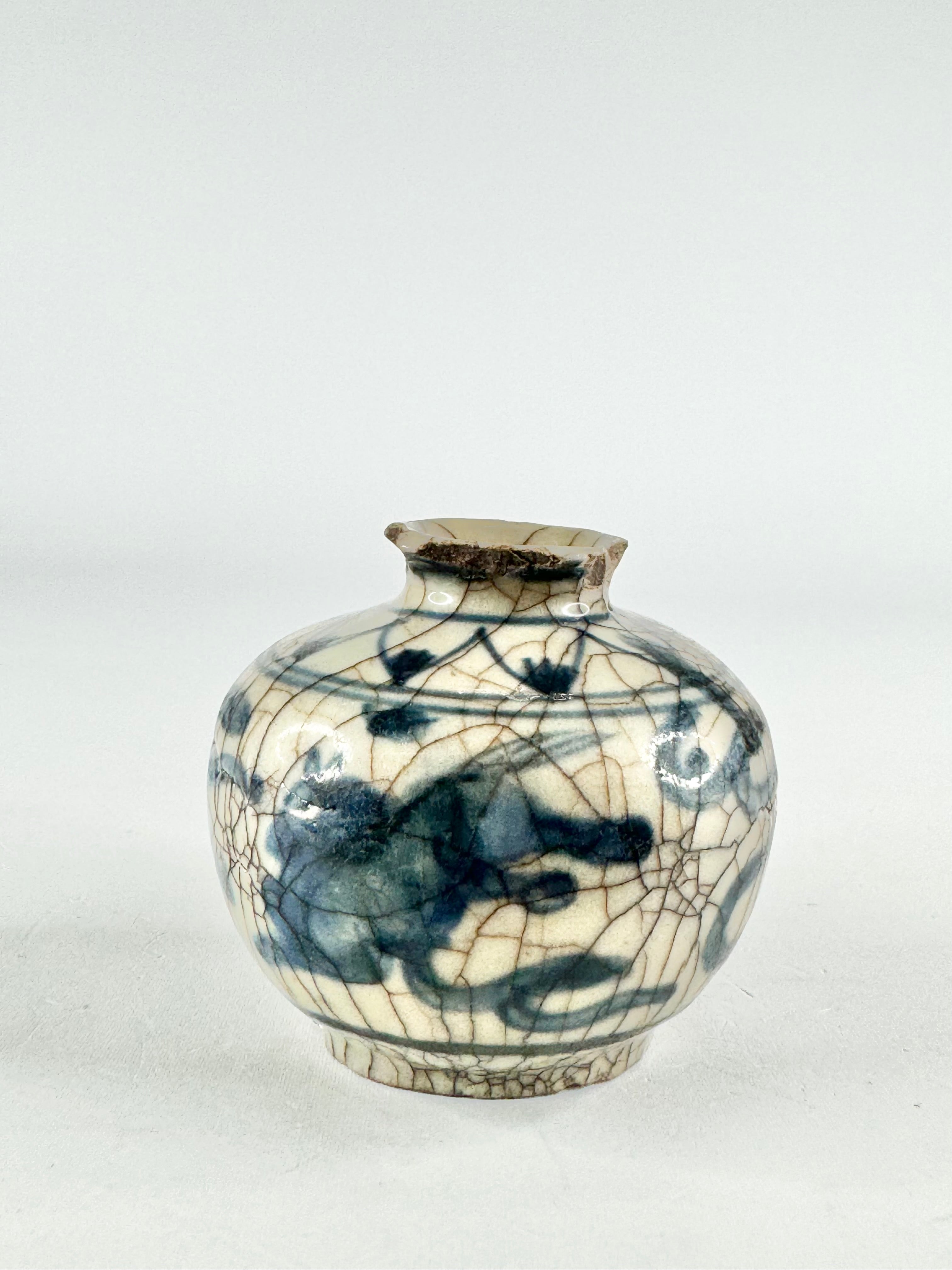 An antique jar composed of what we believe to be stoneware. This item is neutral shade and faded throughout are blue swirled patterns. Unfortunately, this antique item does have significant wear including a large, chipped panel on the base, cracking in the glaze and fine hairline fractures in the pottery itself. This item was part of a collection generously donated by a private donor. These items came from their late mother's collection of Qing & Ming Dynasty pottery.