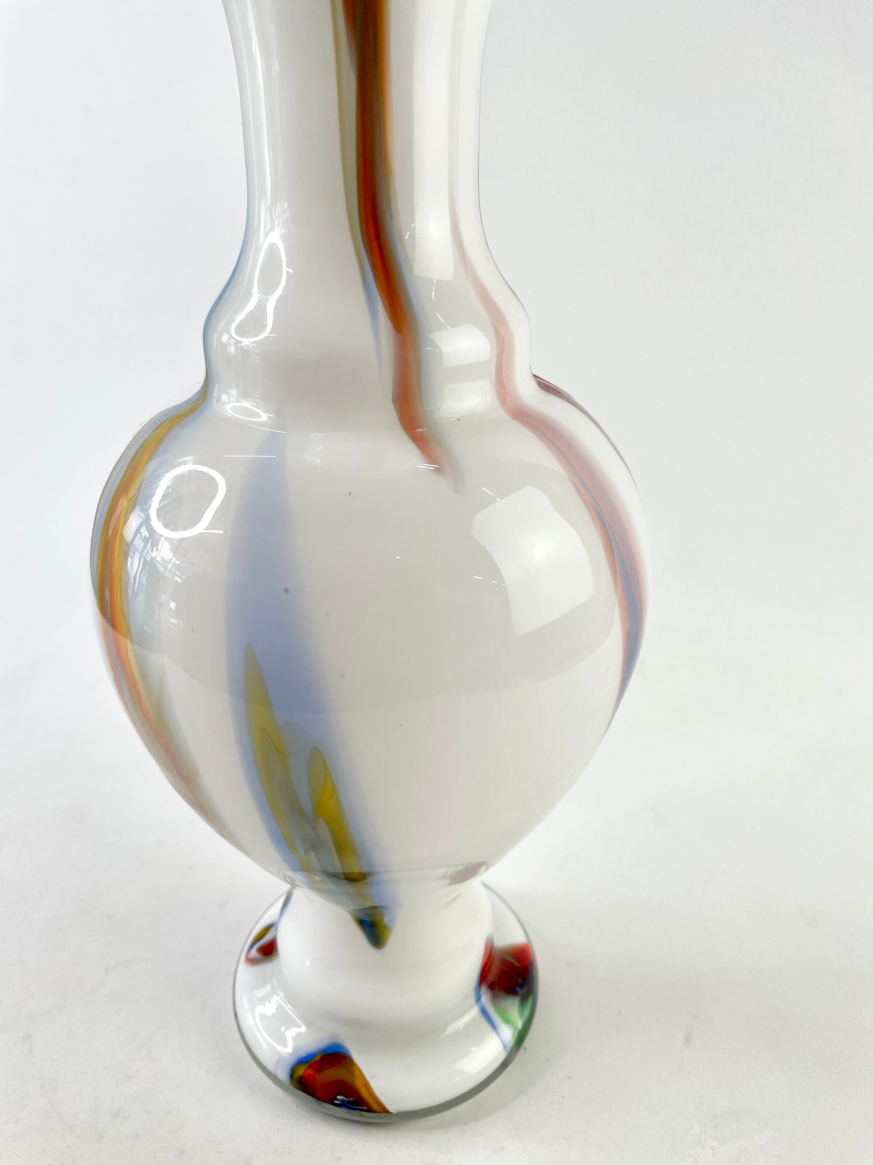 This stunning mid-century Italian made, hand blown vase made from Murano glass is an absolute pearl (because it has such a pearly finish too). It is in excellent condition, with no chips or cracks - though someone has wedged a piece of faux flora inside at its base. Very, very beautiful.