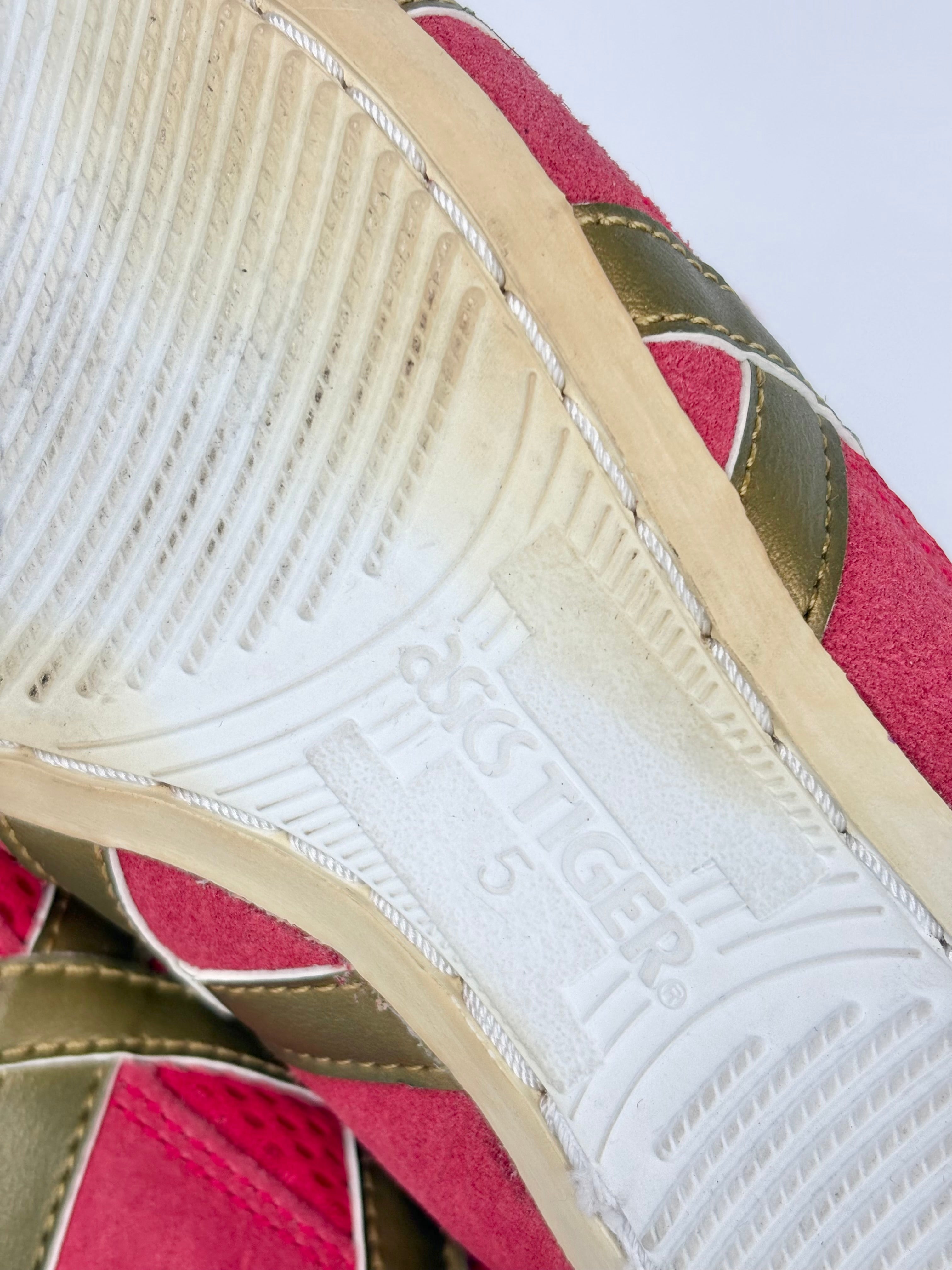 A rare and sought after piece of footwear from the Onitsuka Tiger line originally borne out of ASICS. These 'wrestling' shoes are a rarity and pictured here with the gold contrasts to the red suede and mesh upper. Some minor marks, though overall the condition is still excellent.