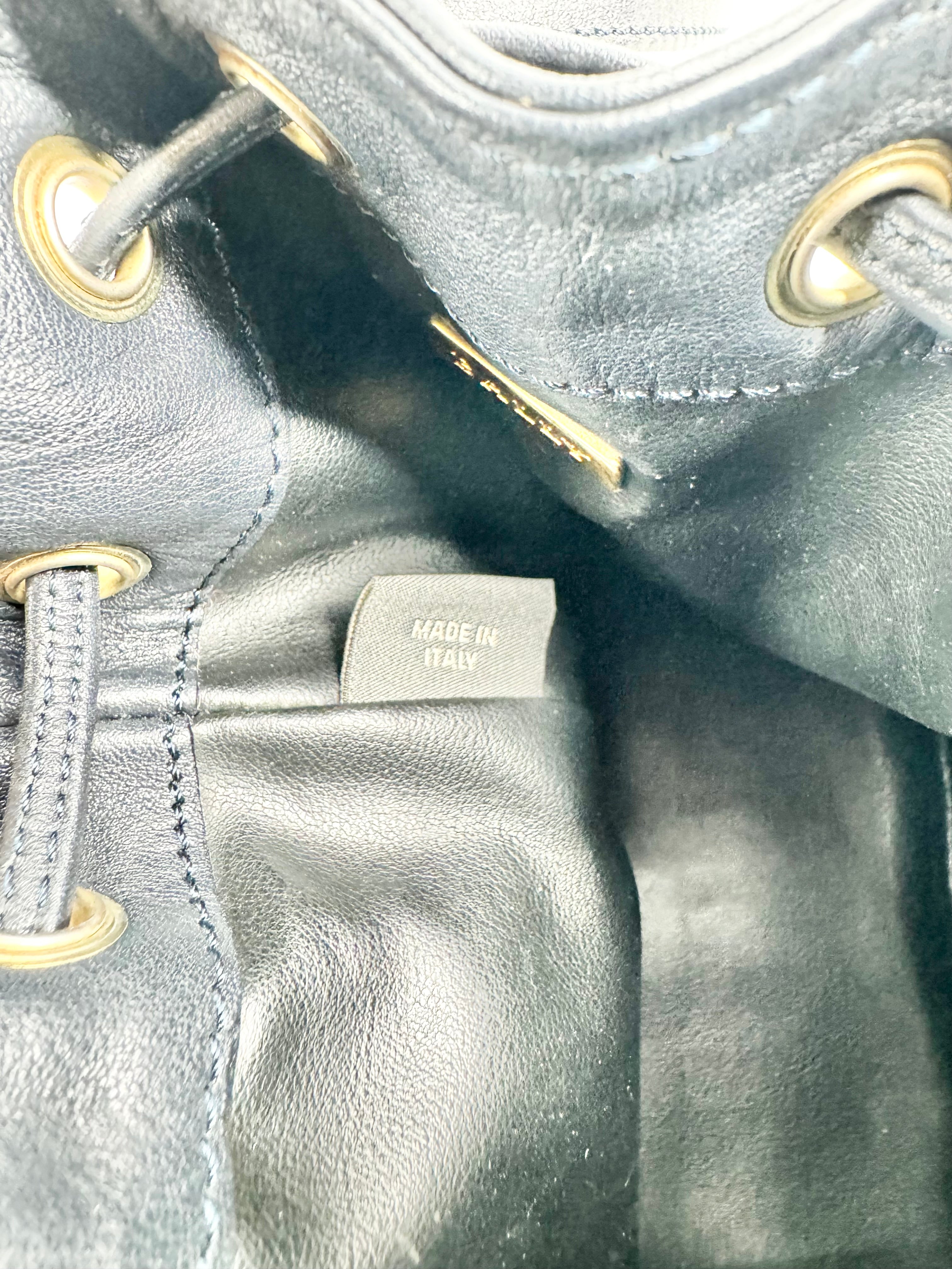 A smooth, midnight blue leather cross body bag, with lux, gold toned hardware and a drawstring enclosure. The strap is adjustable and the lining matches. Overall this item is in excellent condition but does have some slight wear.