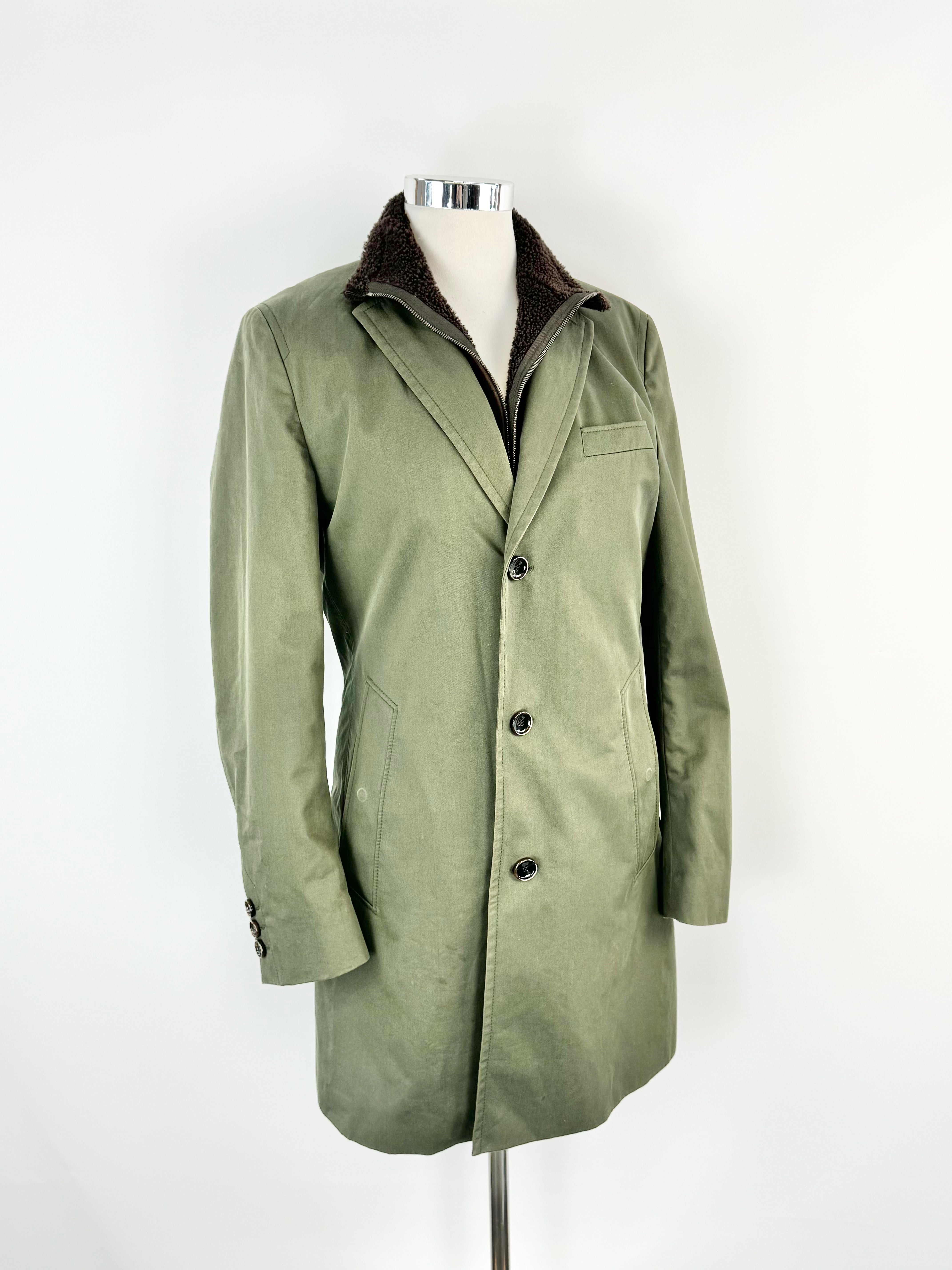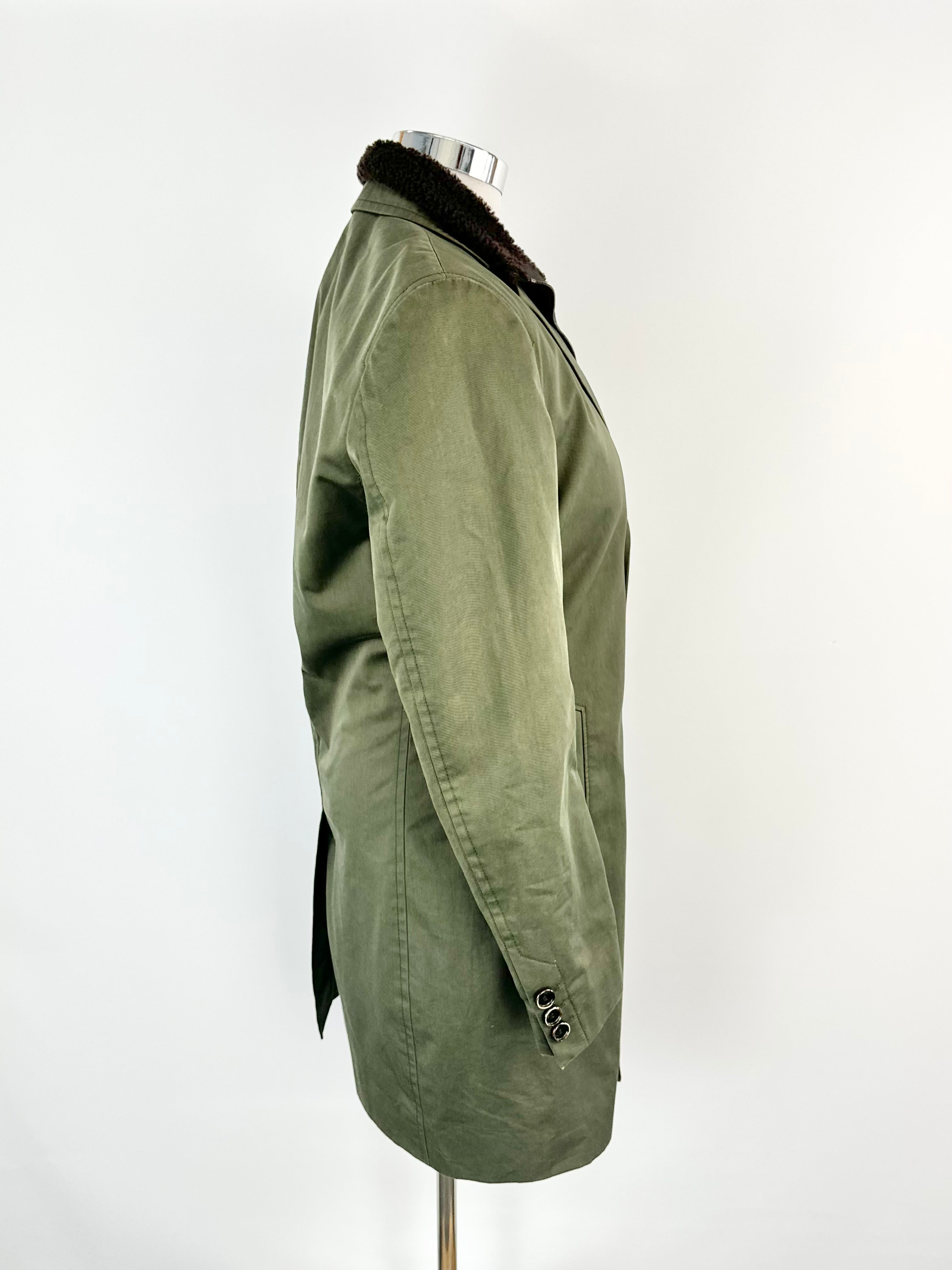 A deep green coat made from an outer cotton fabric, with a dark bitter chocolate brown shearling trim around the collar and silky lining. This item is nice and long with pockets at the waist. There is some overall wear.