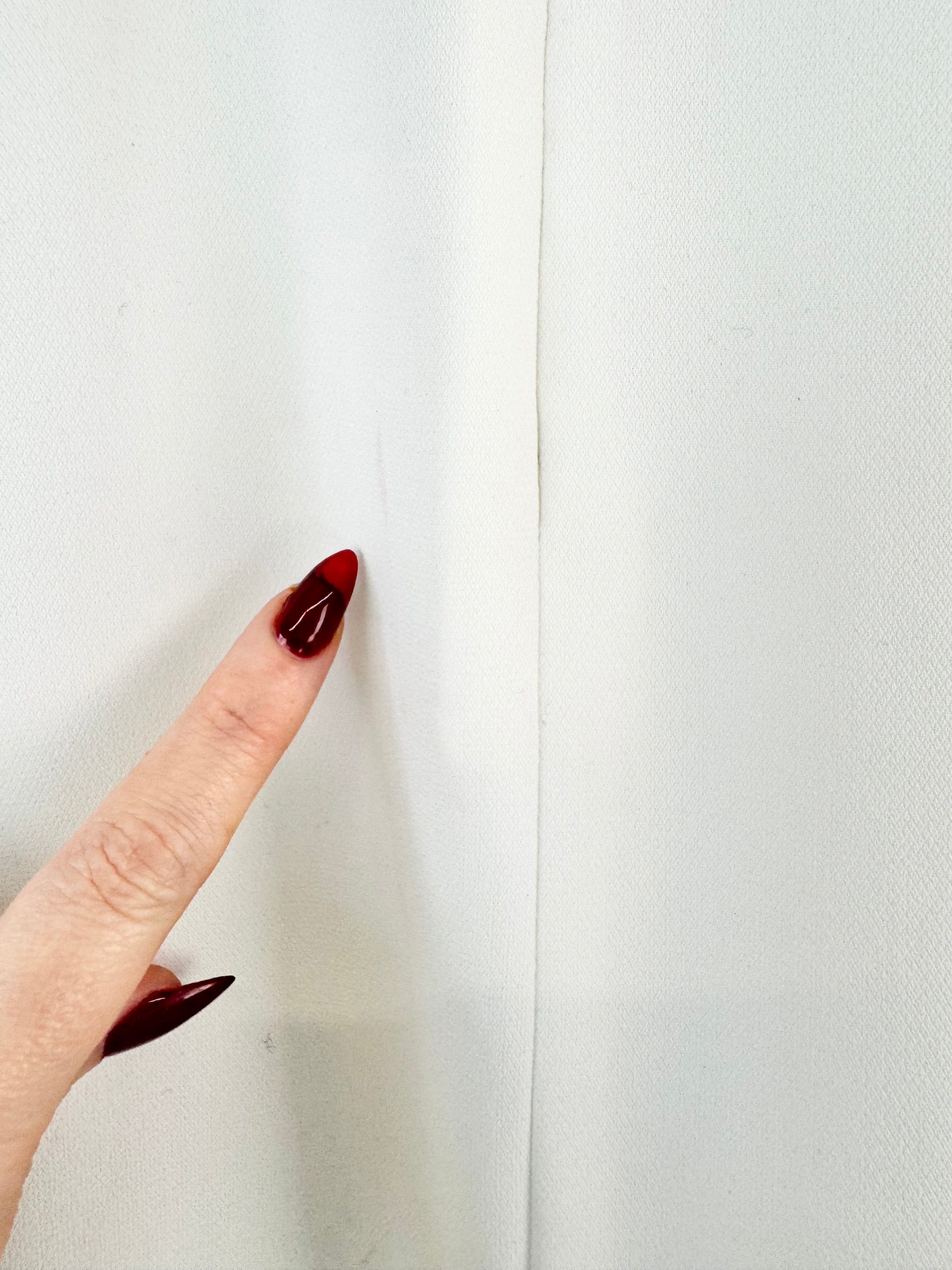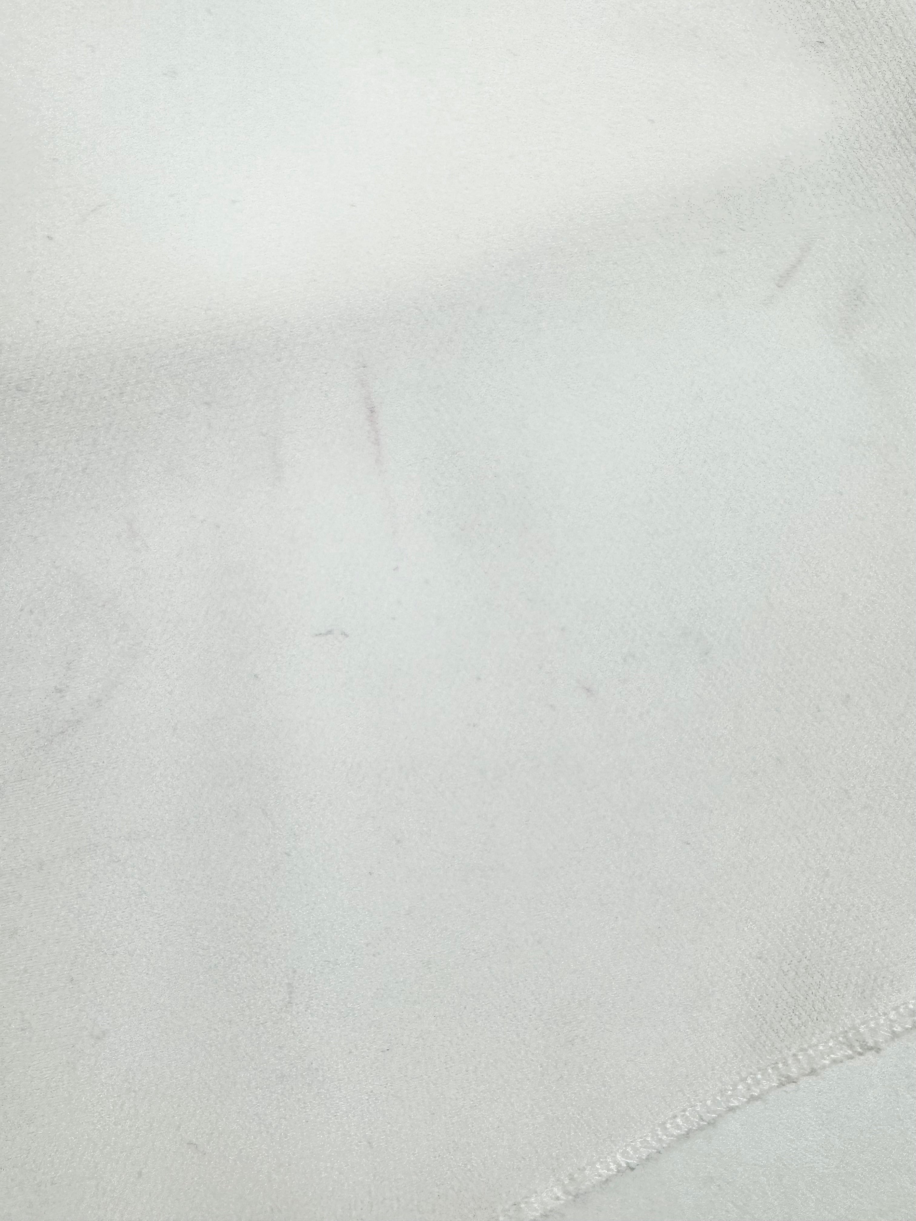 A polyester feeling white, relaxed fit polyester feeling t-shirt with a zipper at the back, raglan style shoulders and an oversized, flowy fit.
