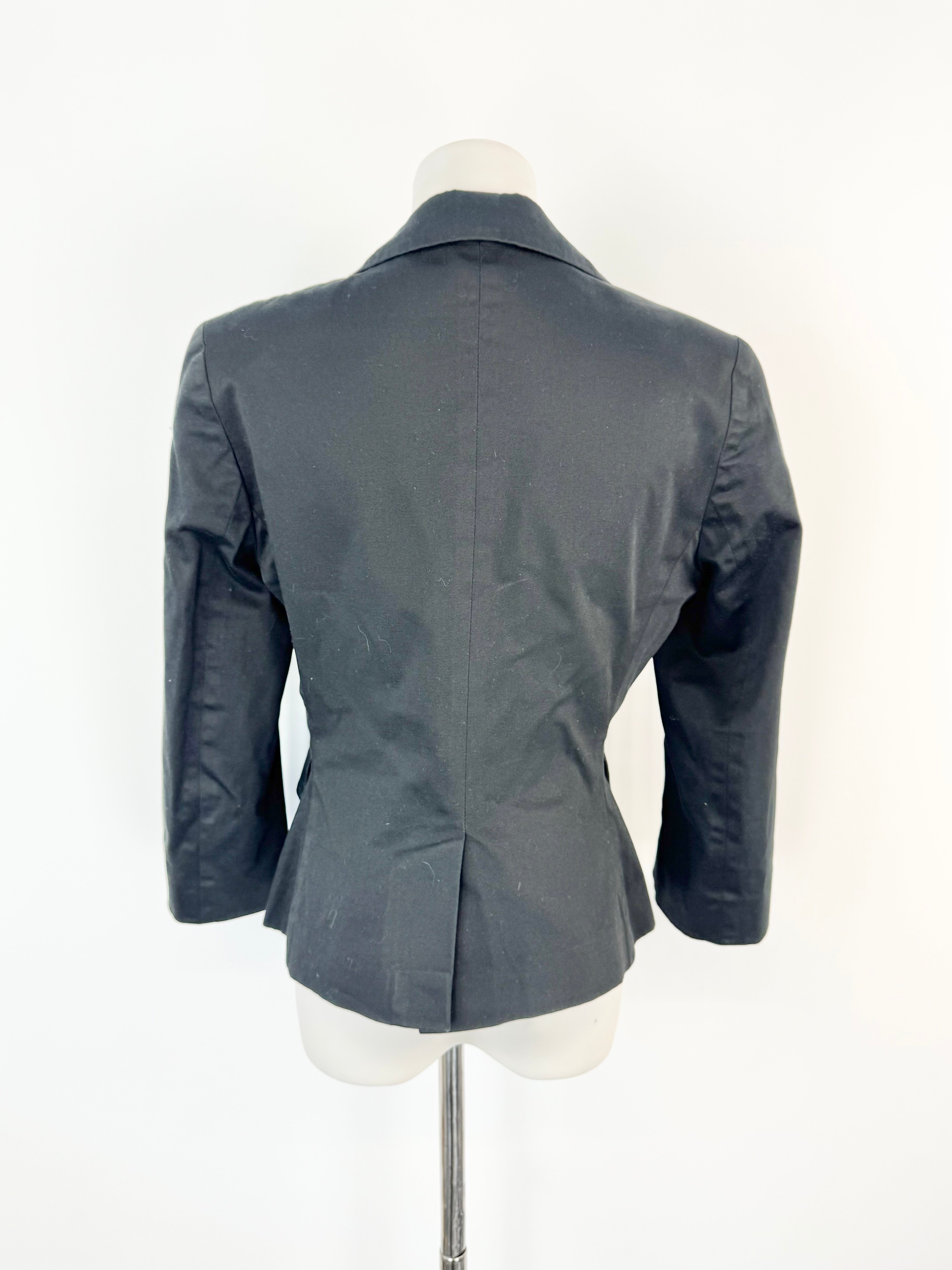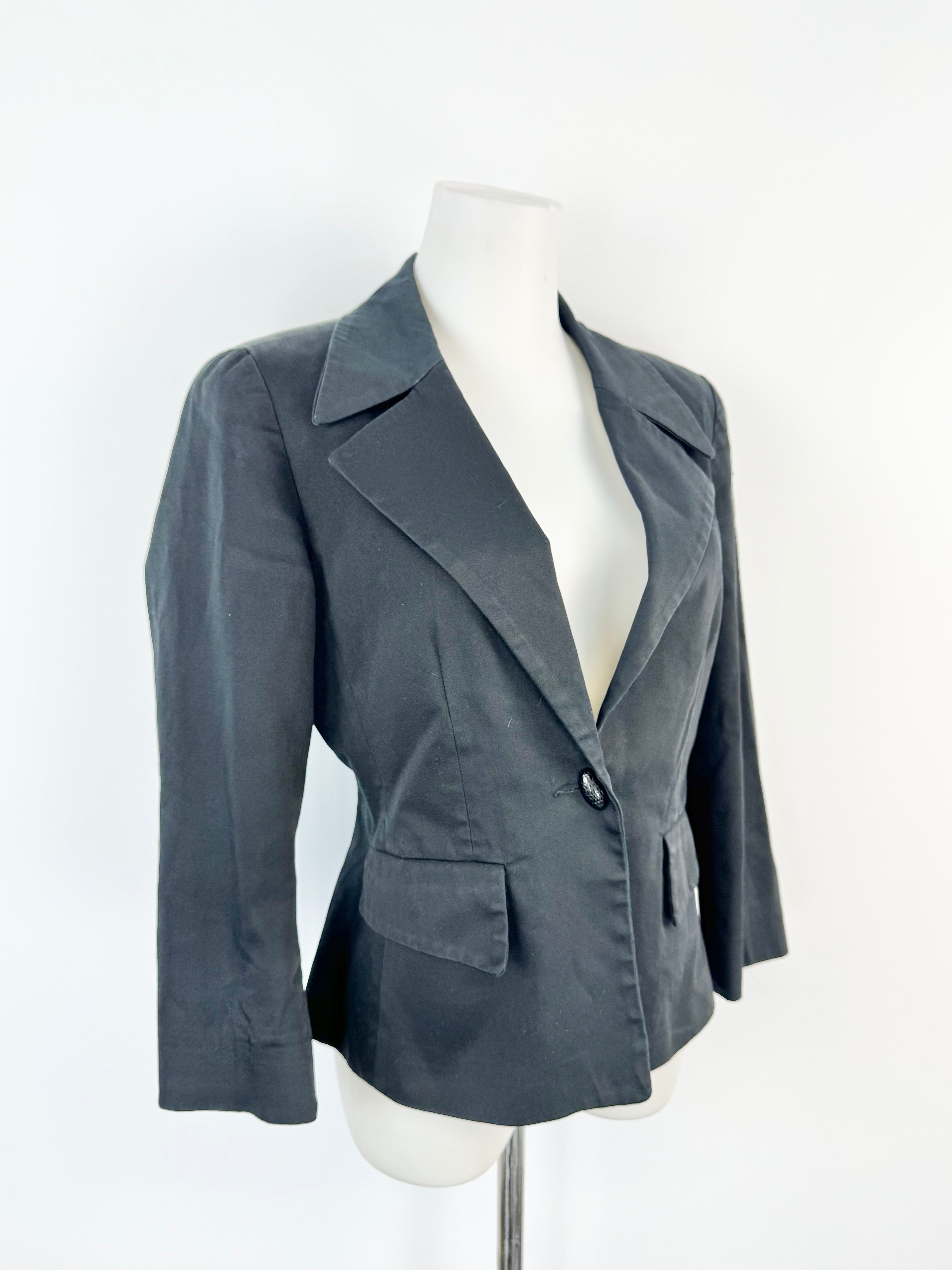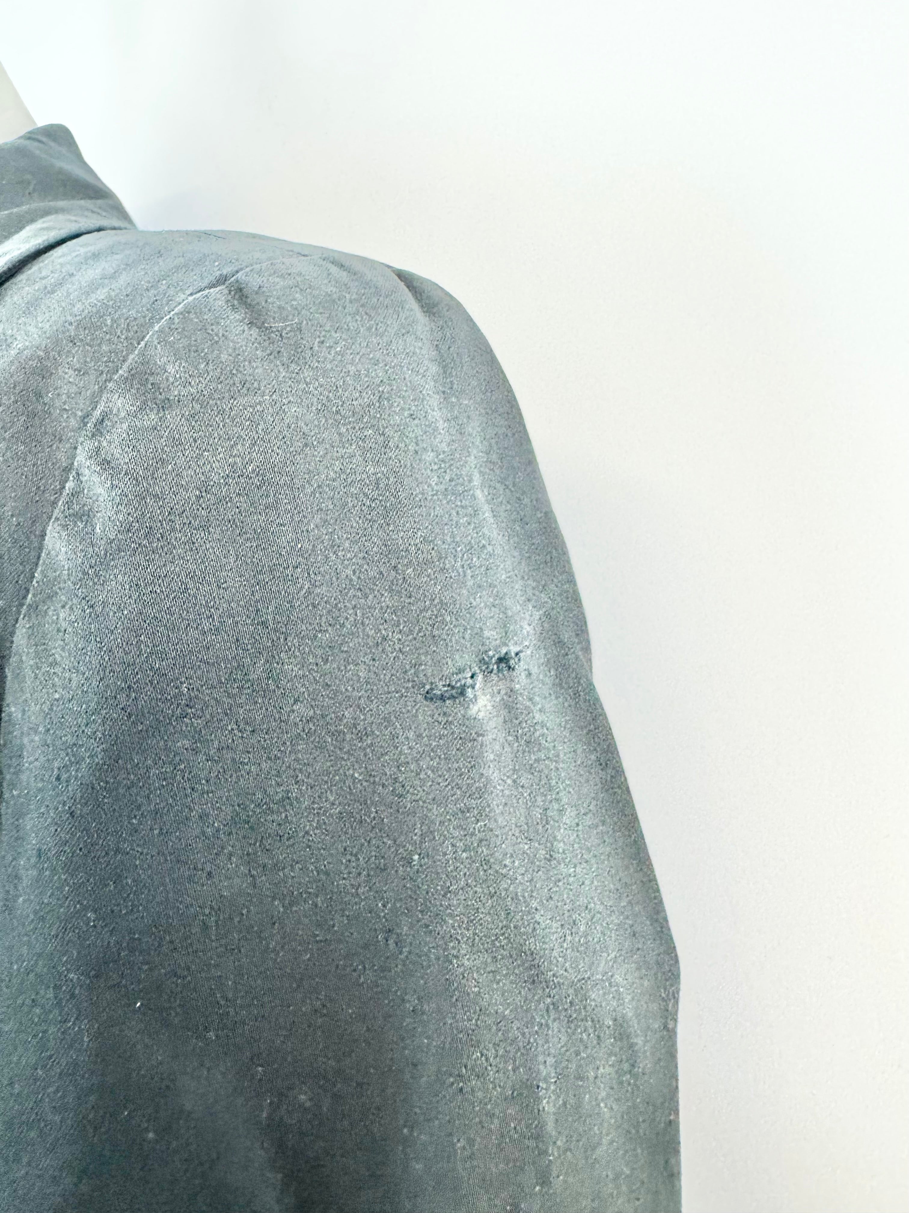 A single button encloses this handsome black blazer. There is some fading along with a tear in the shoulder.