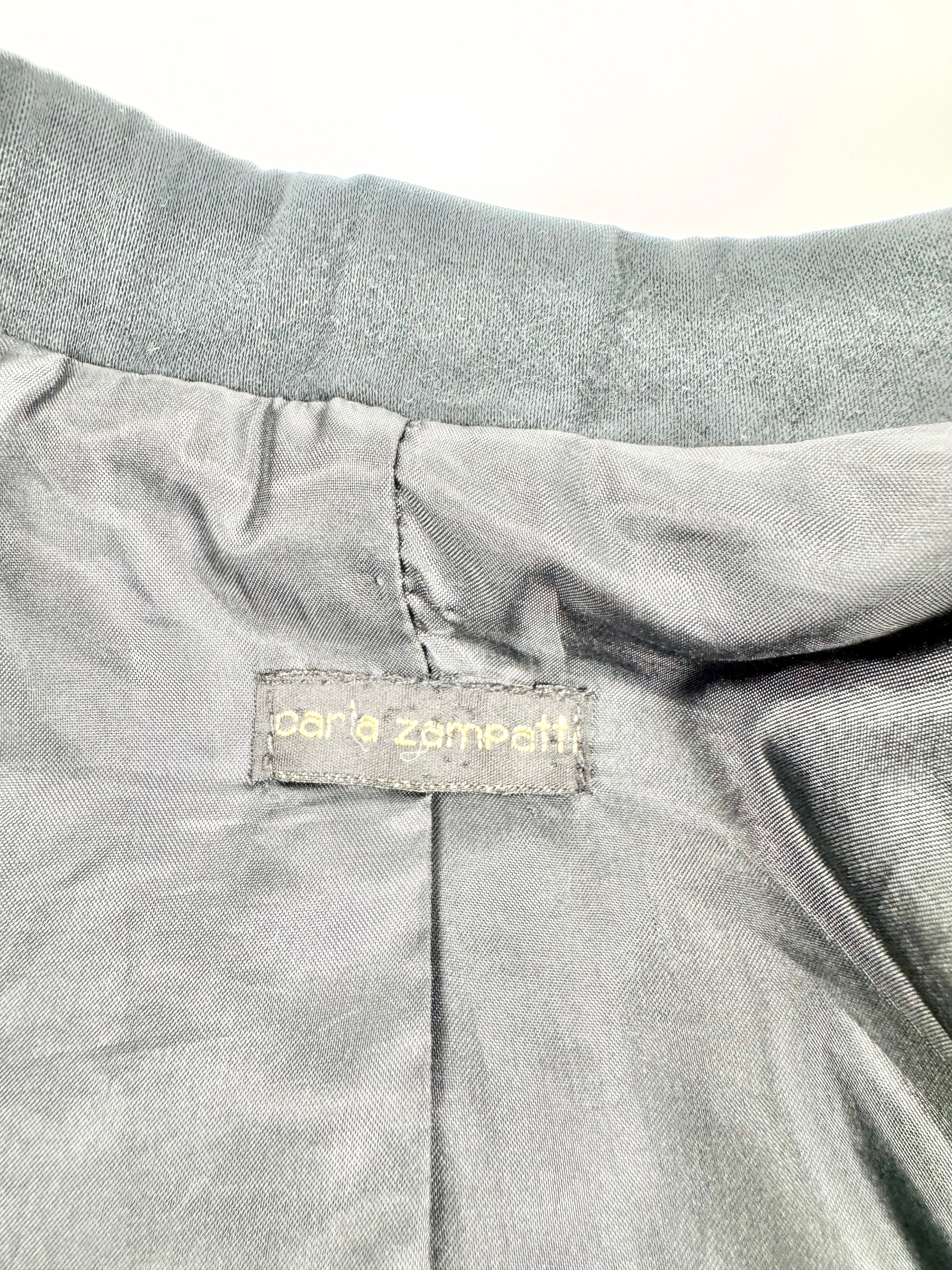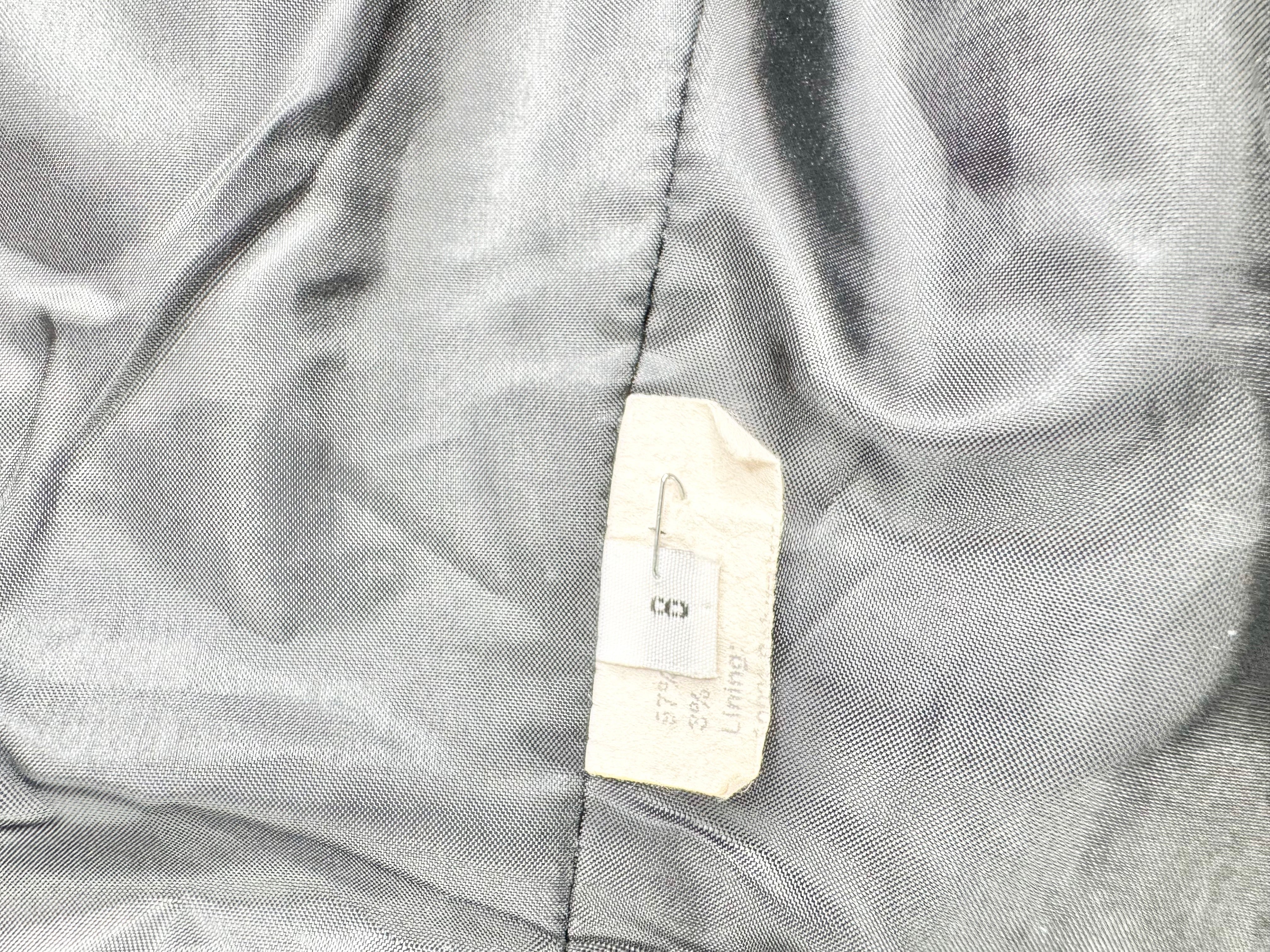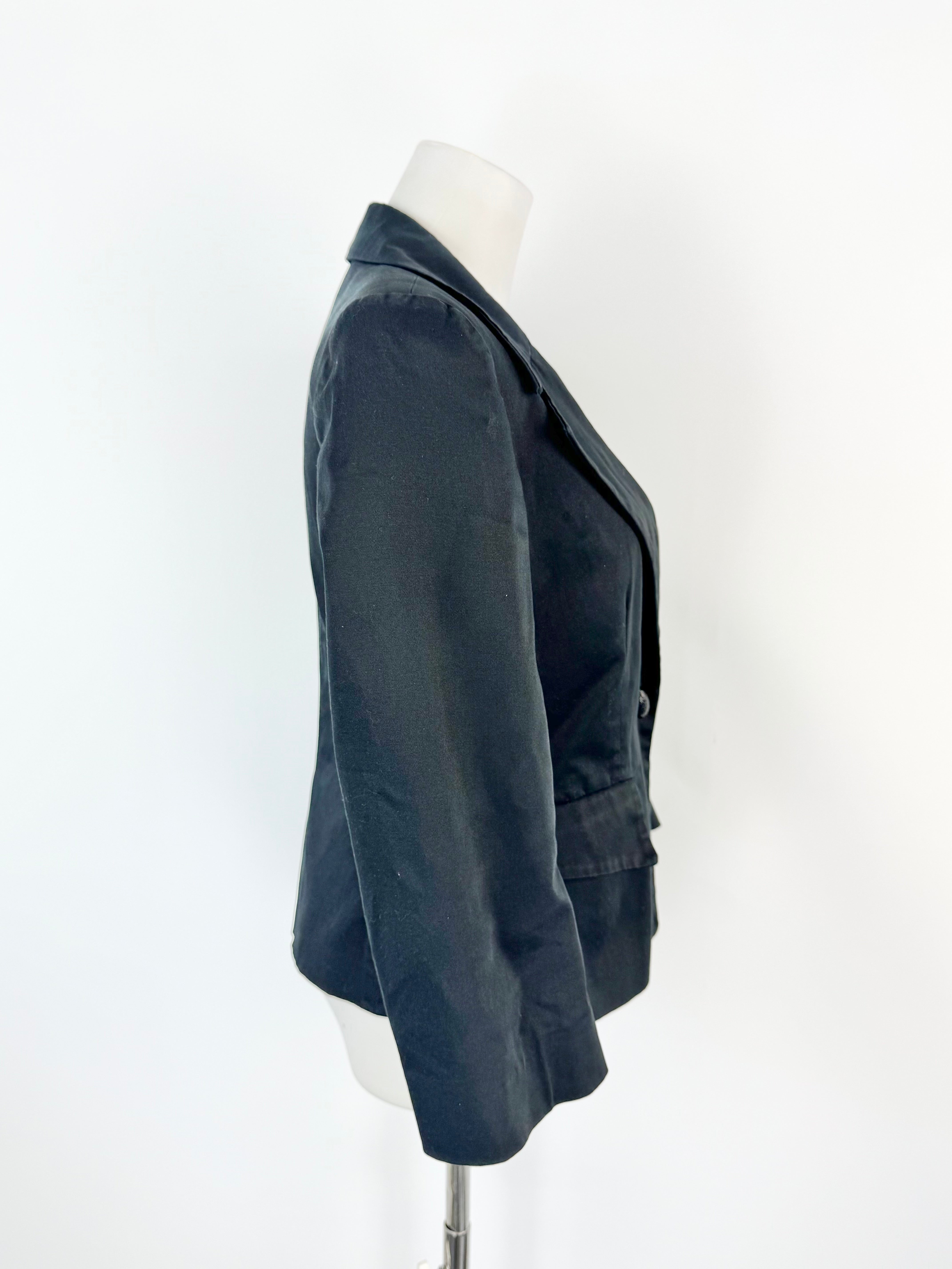 A single button encloses this handsome black blazer. There is some fading along with a tear in the shoulder.