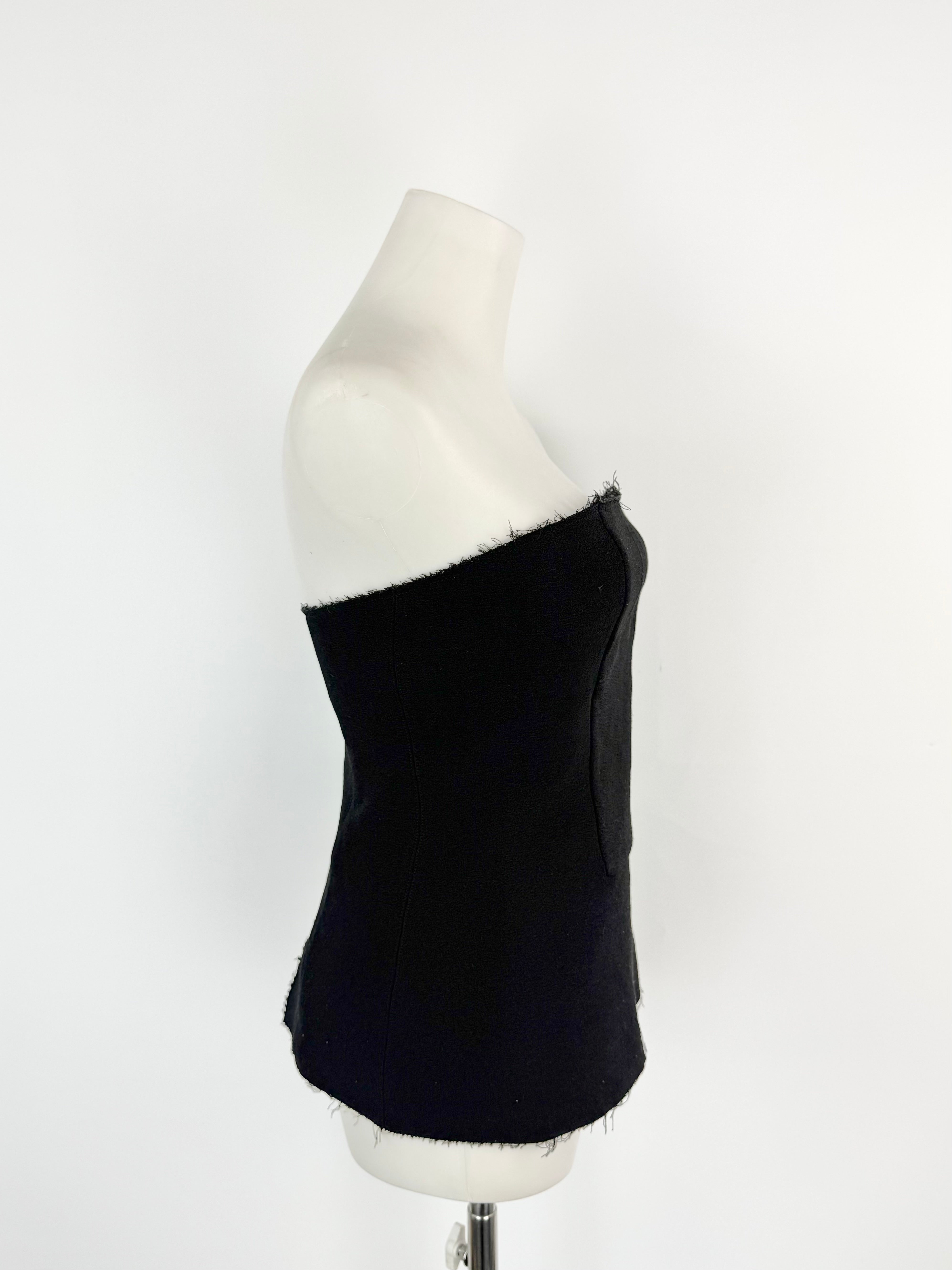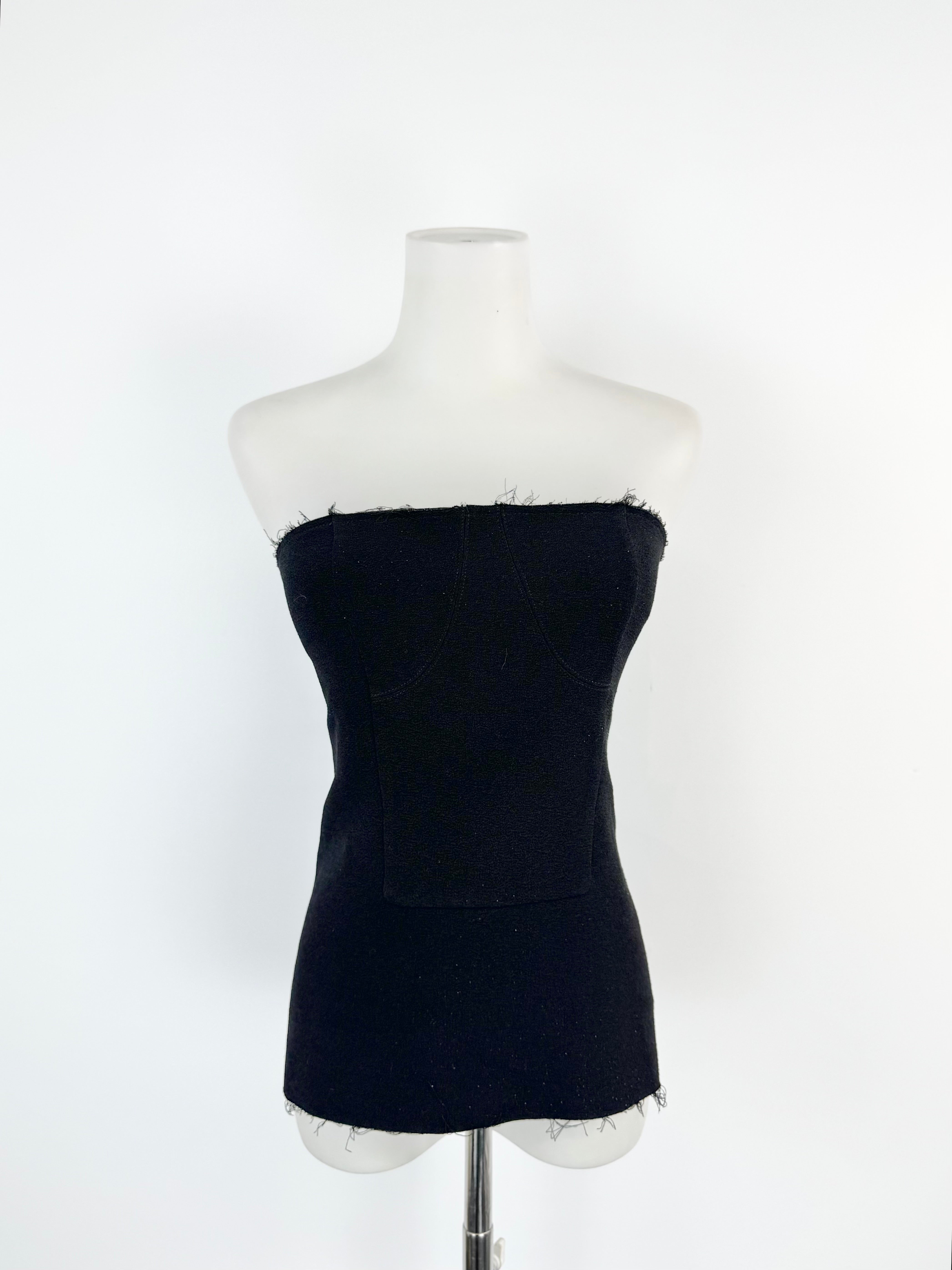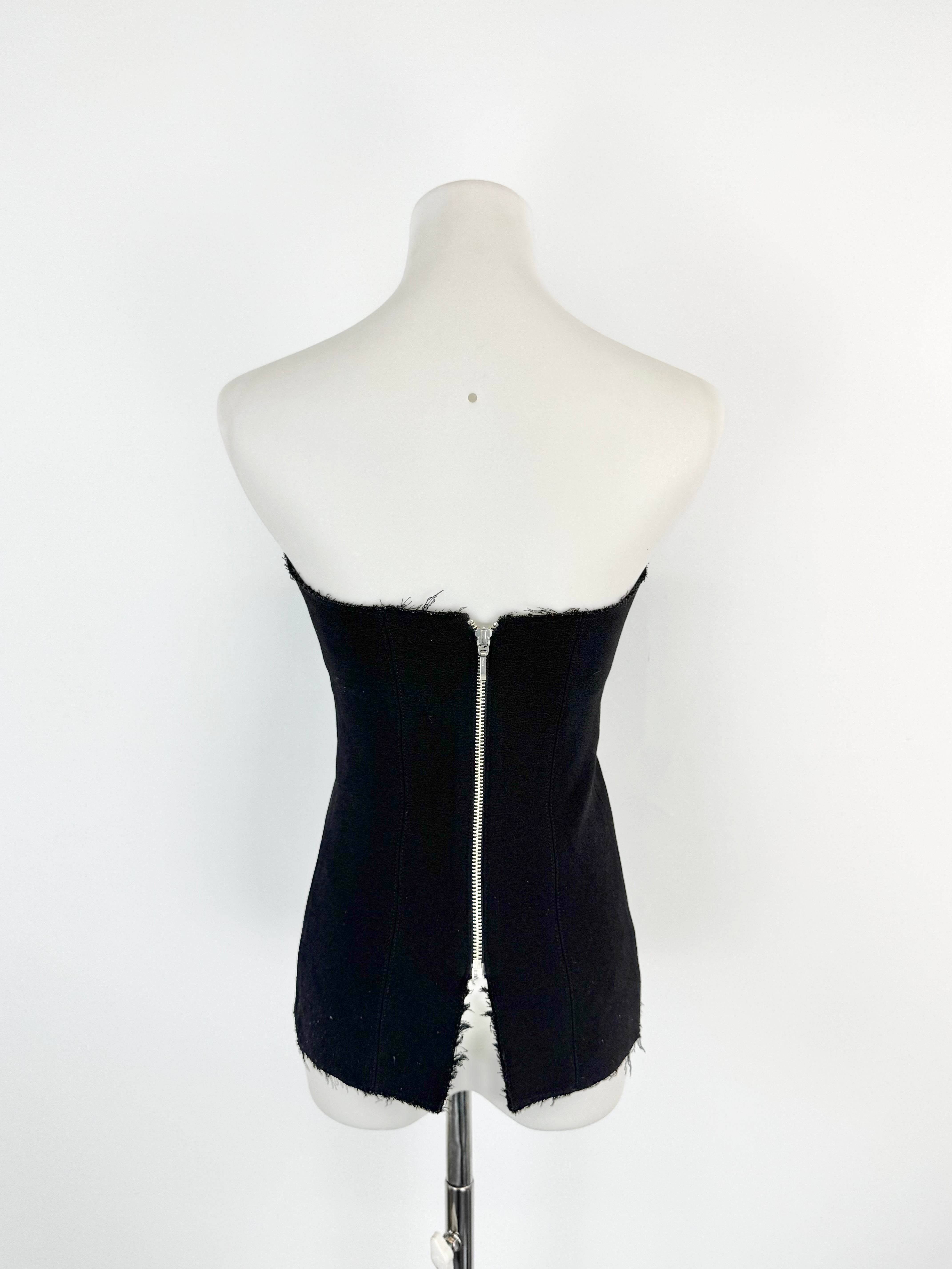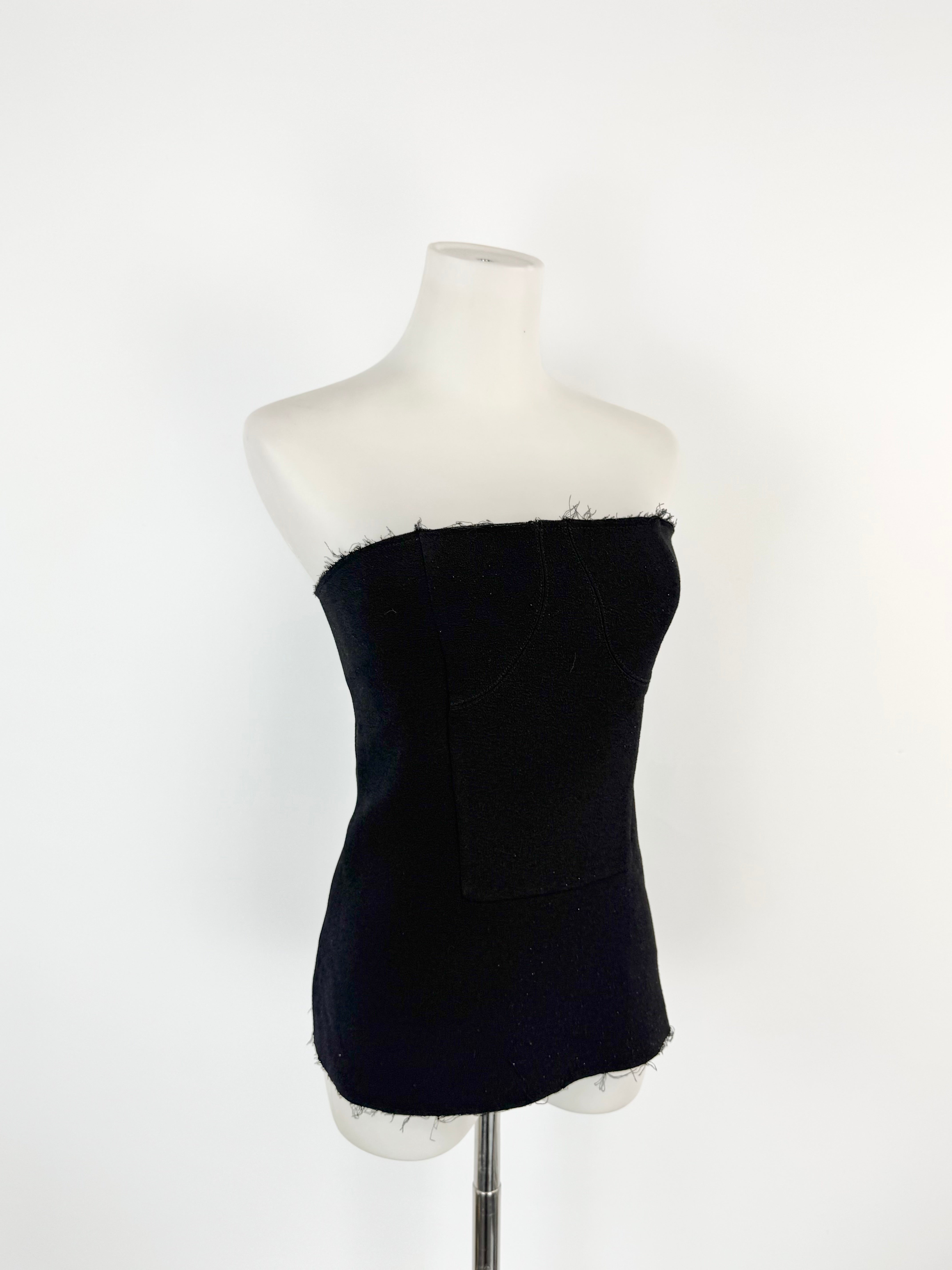 A raw hemmed garment from Christopher Esber, made from a textured fabric and enclosing at the back with a zipper. This has a slight stretch to but is quite fitted.