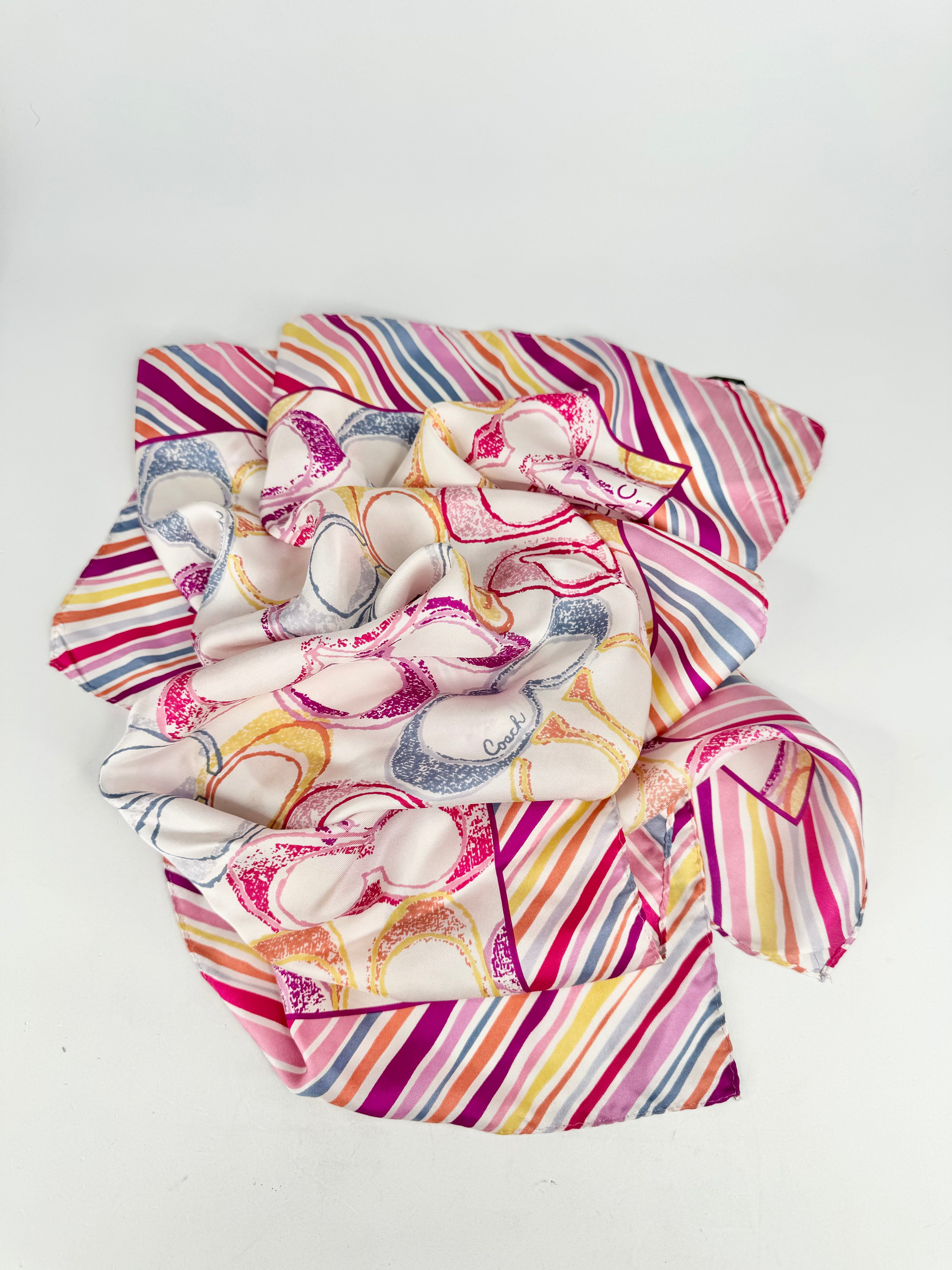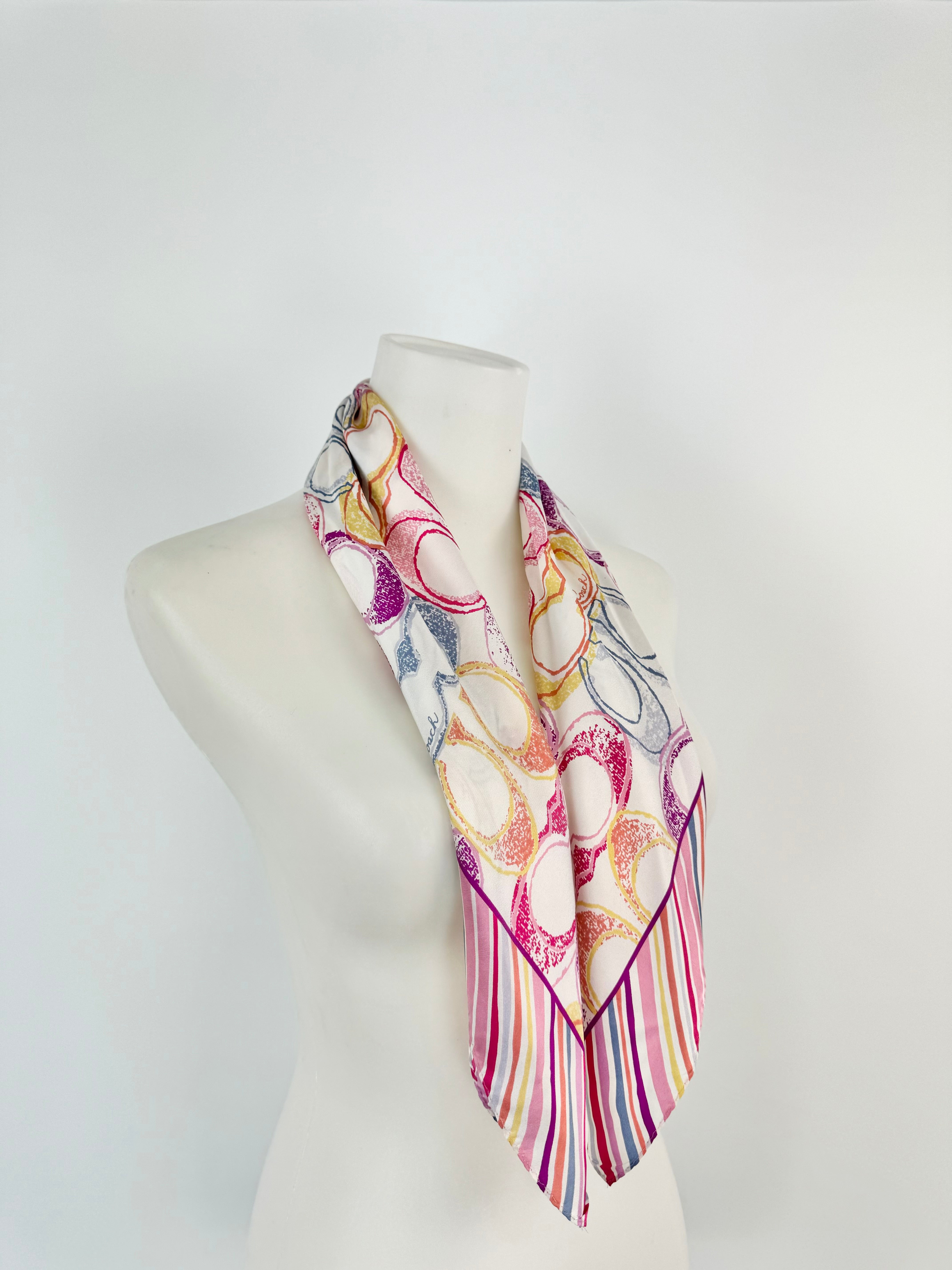A square sized silk scarf with the classic 'CC' logo in bold shades with purple, yellow and plus a rather dashing pale peach shade. There is some wear such as some holes.