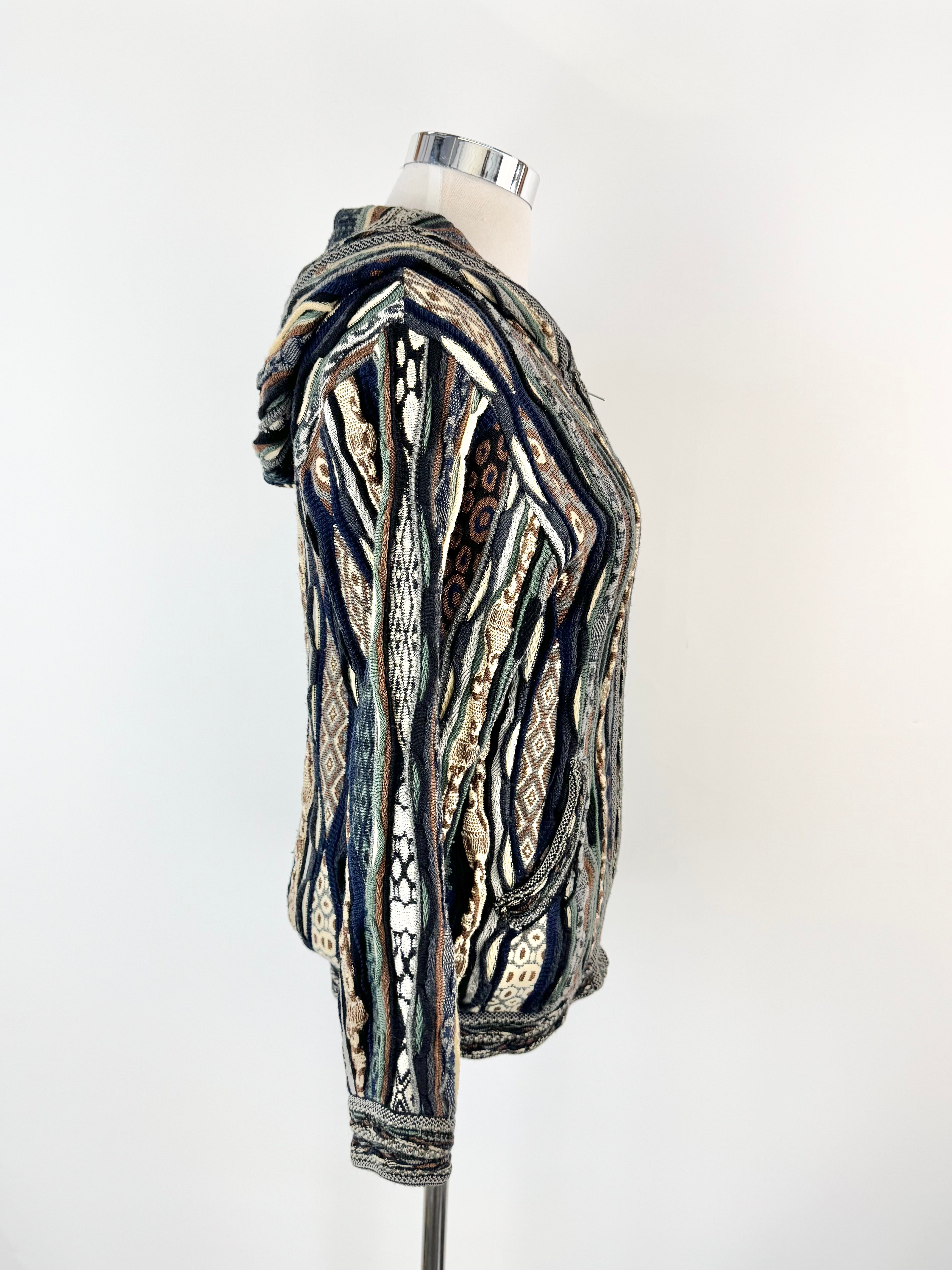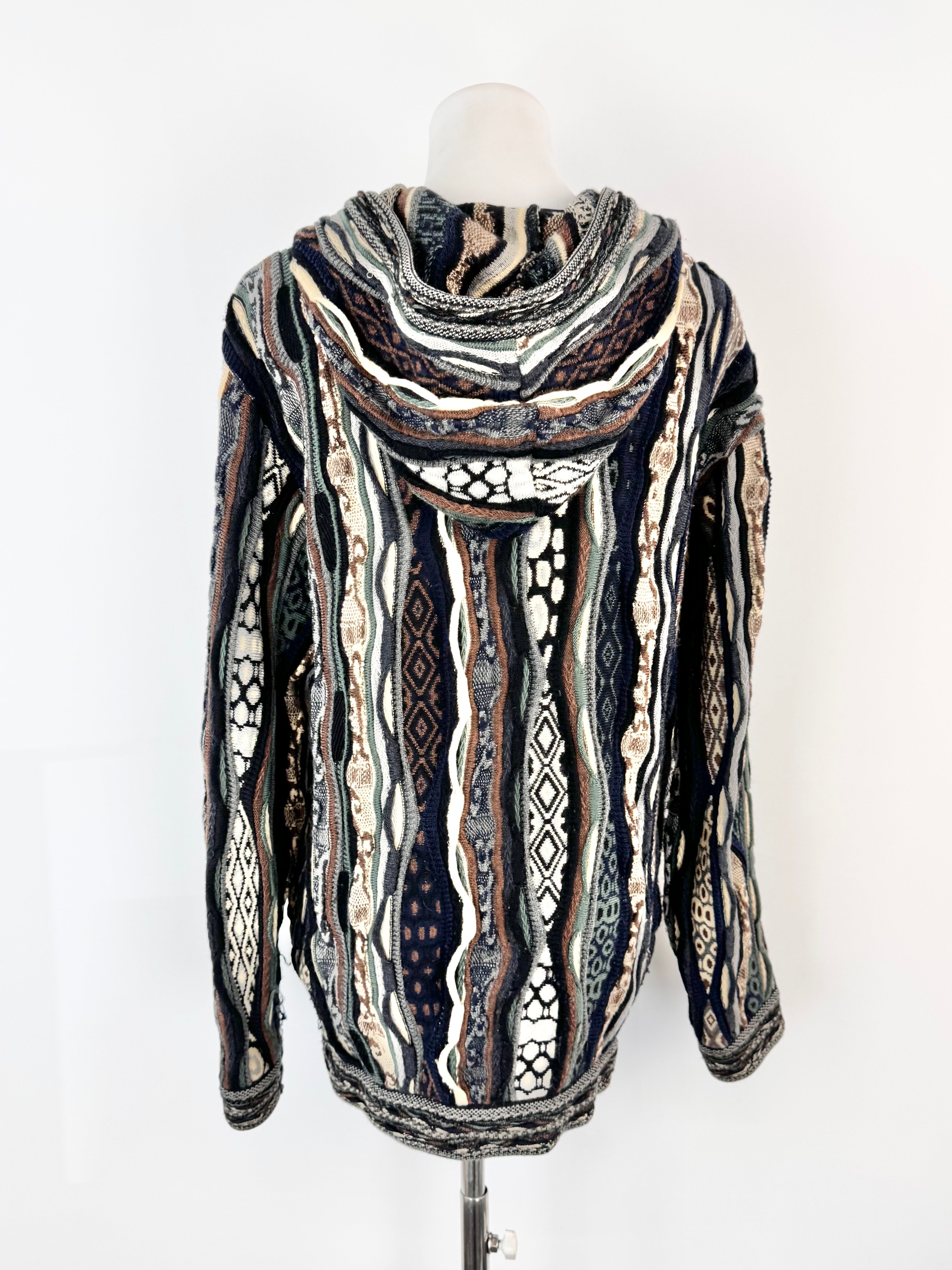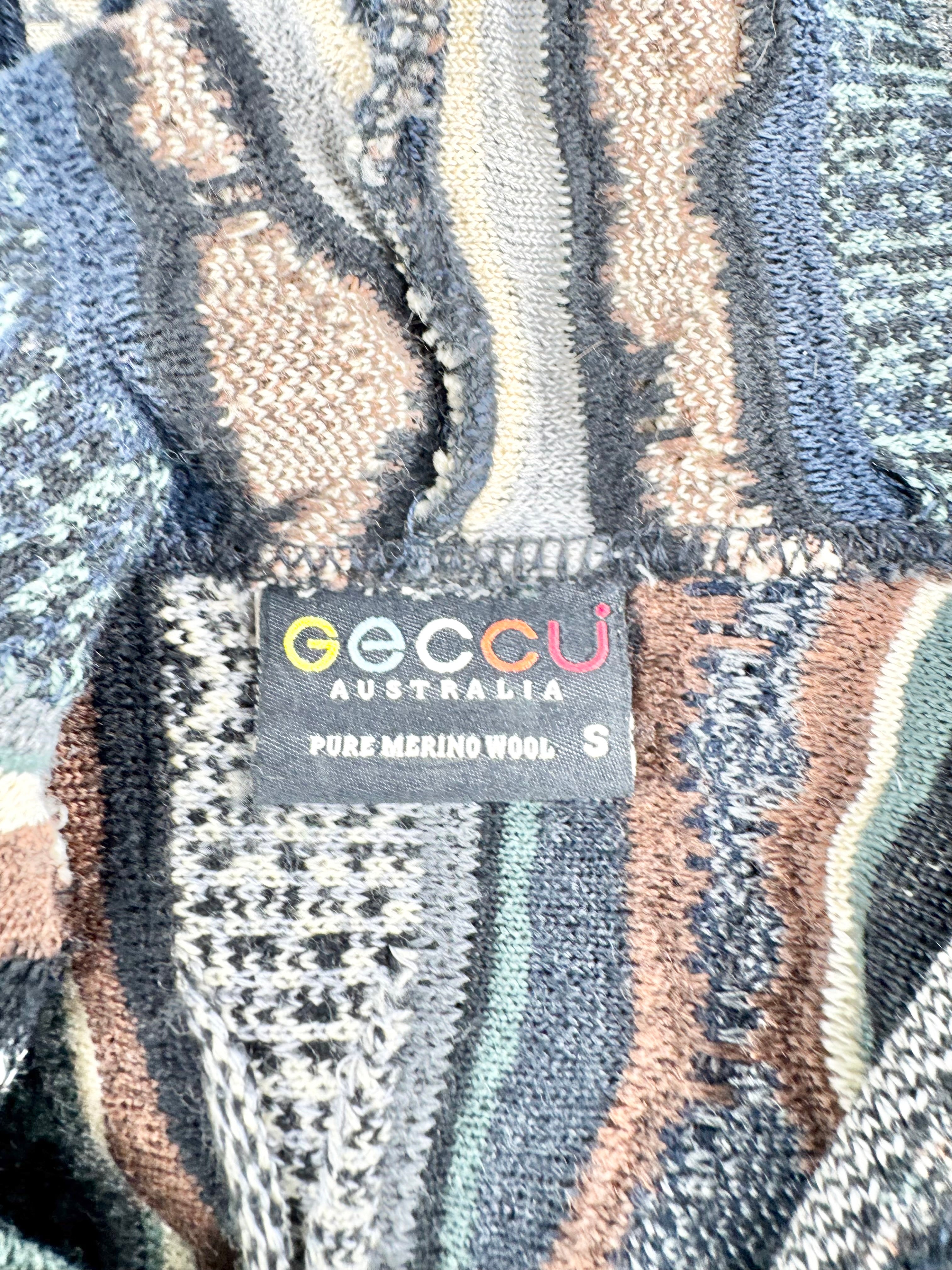 A magnificent find, we have this intricately textured and patterned 3D hoodie from Geccu Australia. This item features a hoodie! And zippers closed. It is made form a high quality merino wool blend and is in wonderful pre-loved condition.