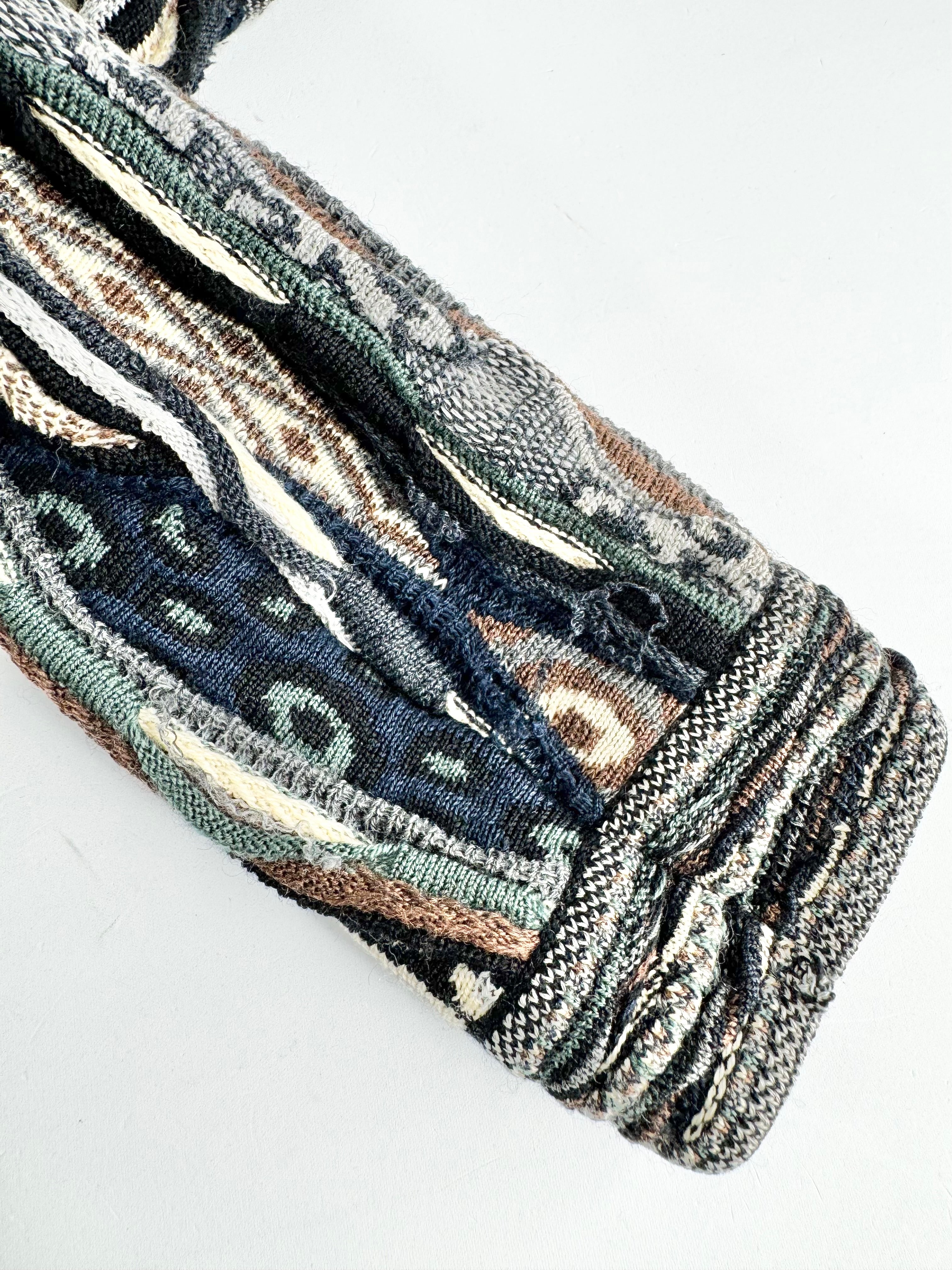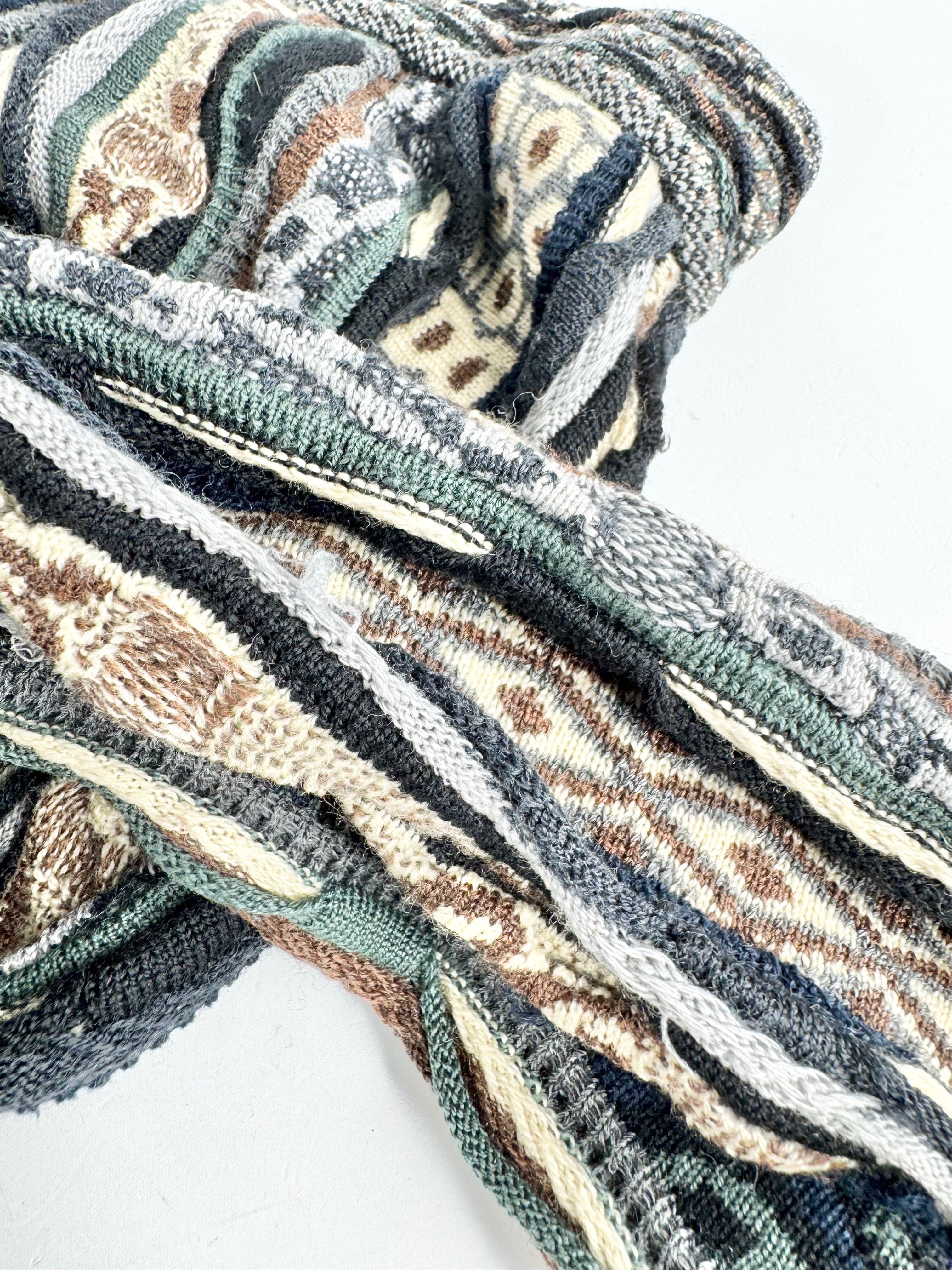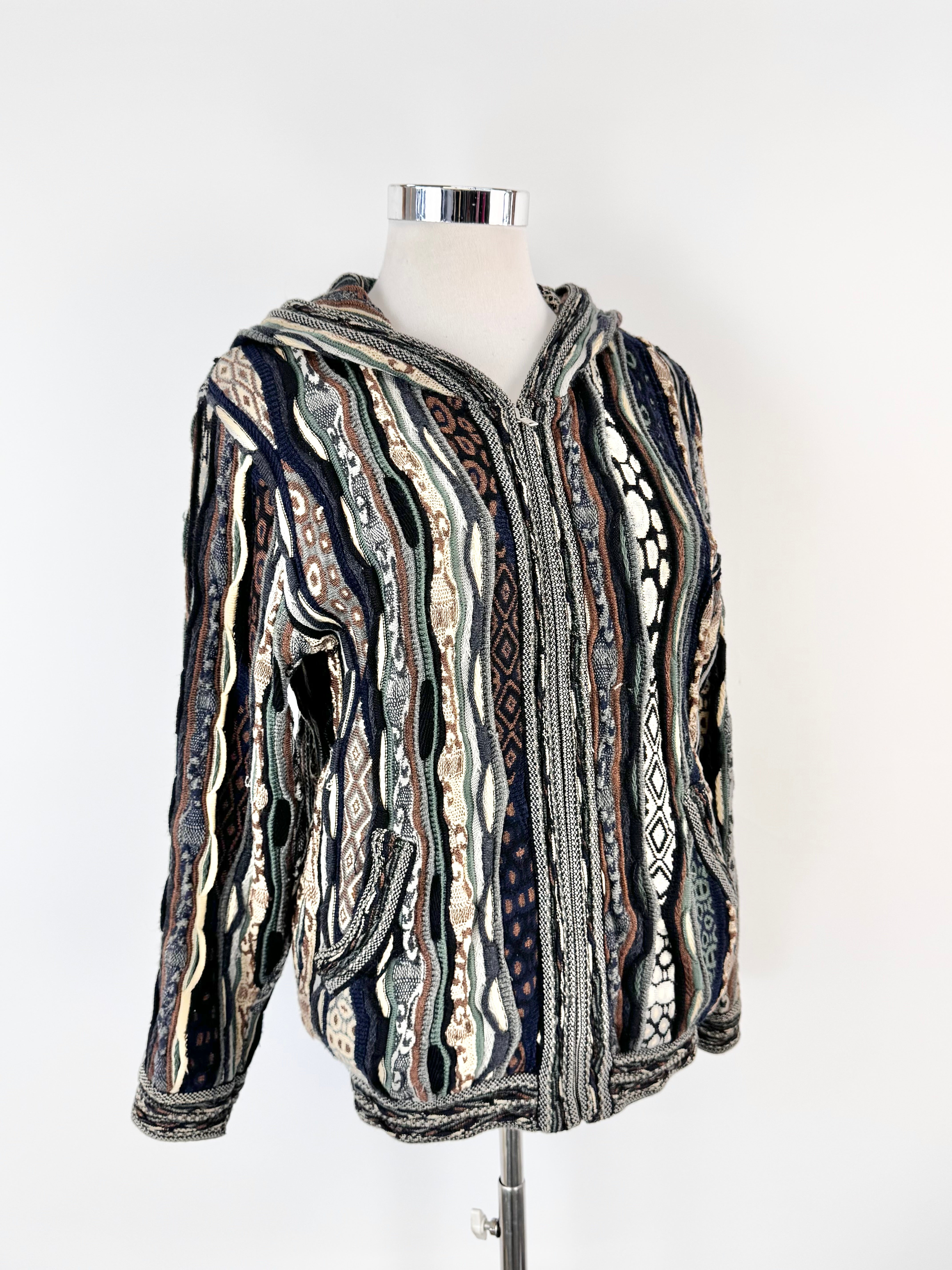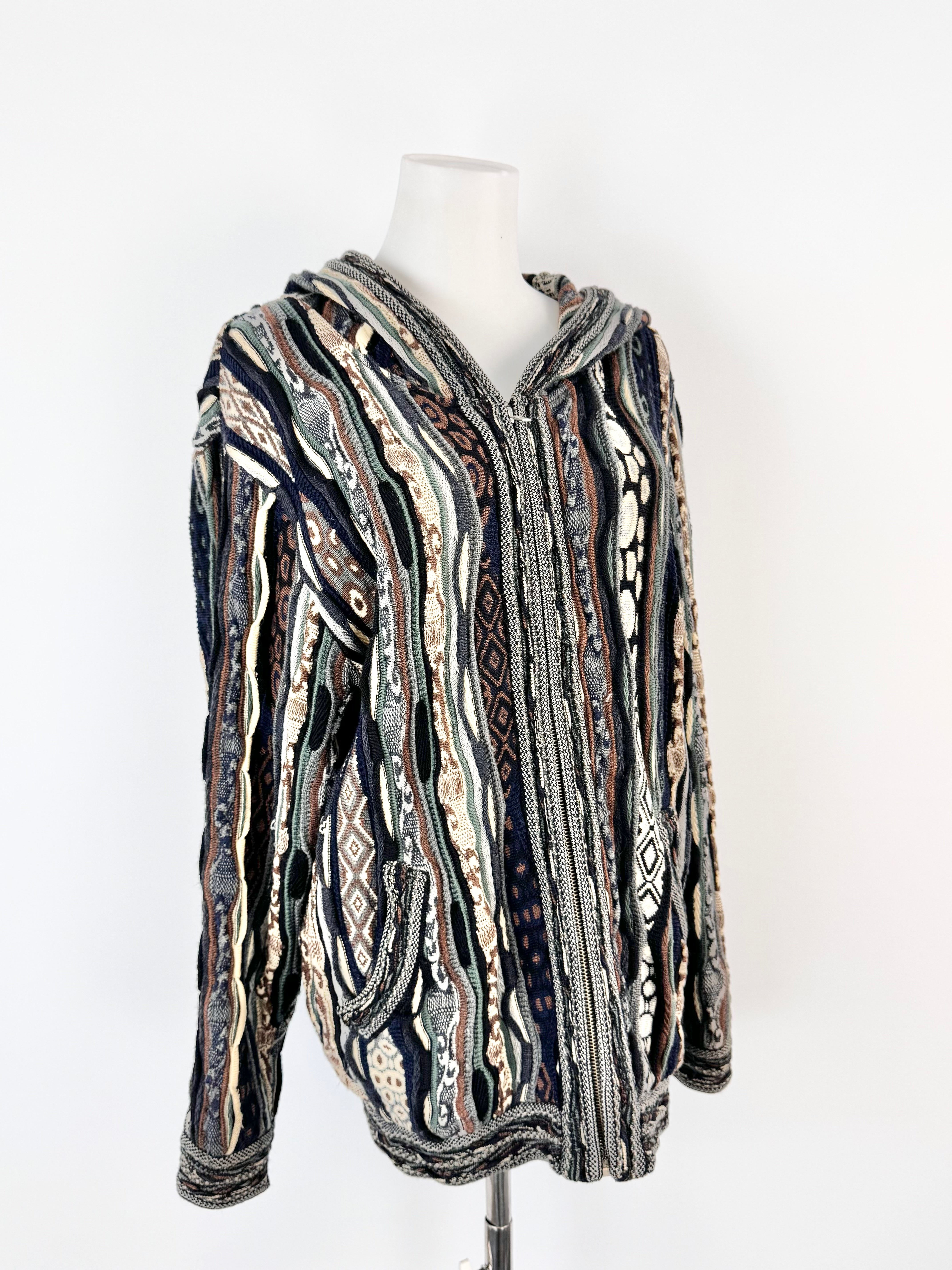 A magnificent find, we have this intricately textured and patterned 3D hoodie from Geccu Australia. This item features a hoodie! And zippers closed. It is made form a high quality merino wool blend and is in wonderful pre-loved condition.