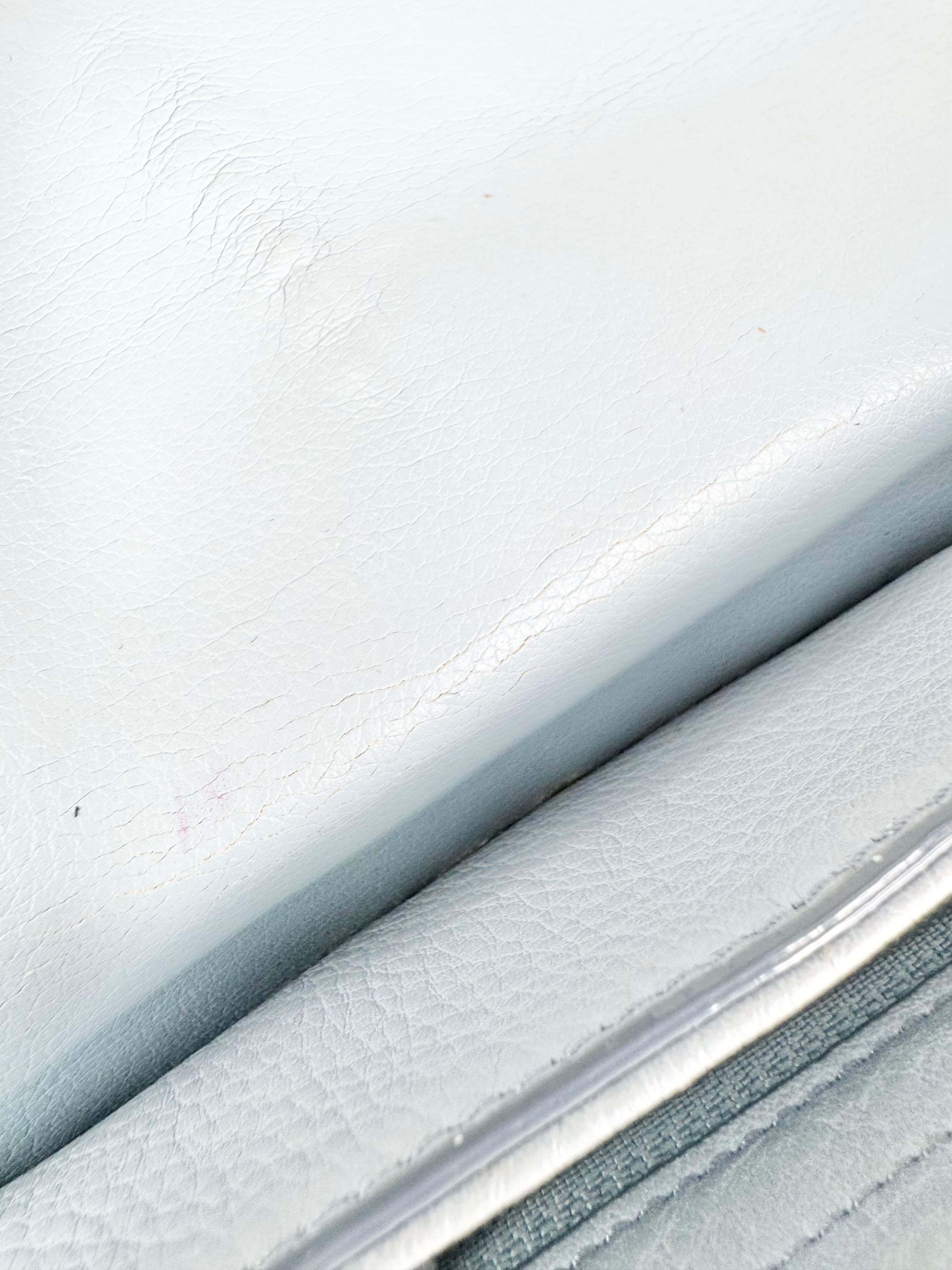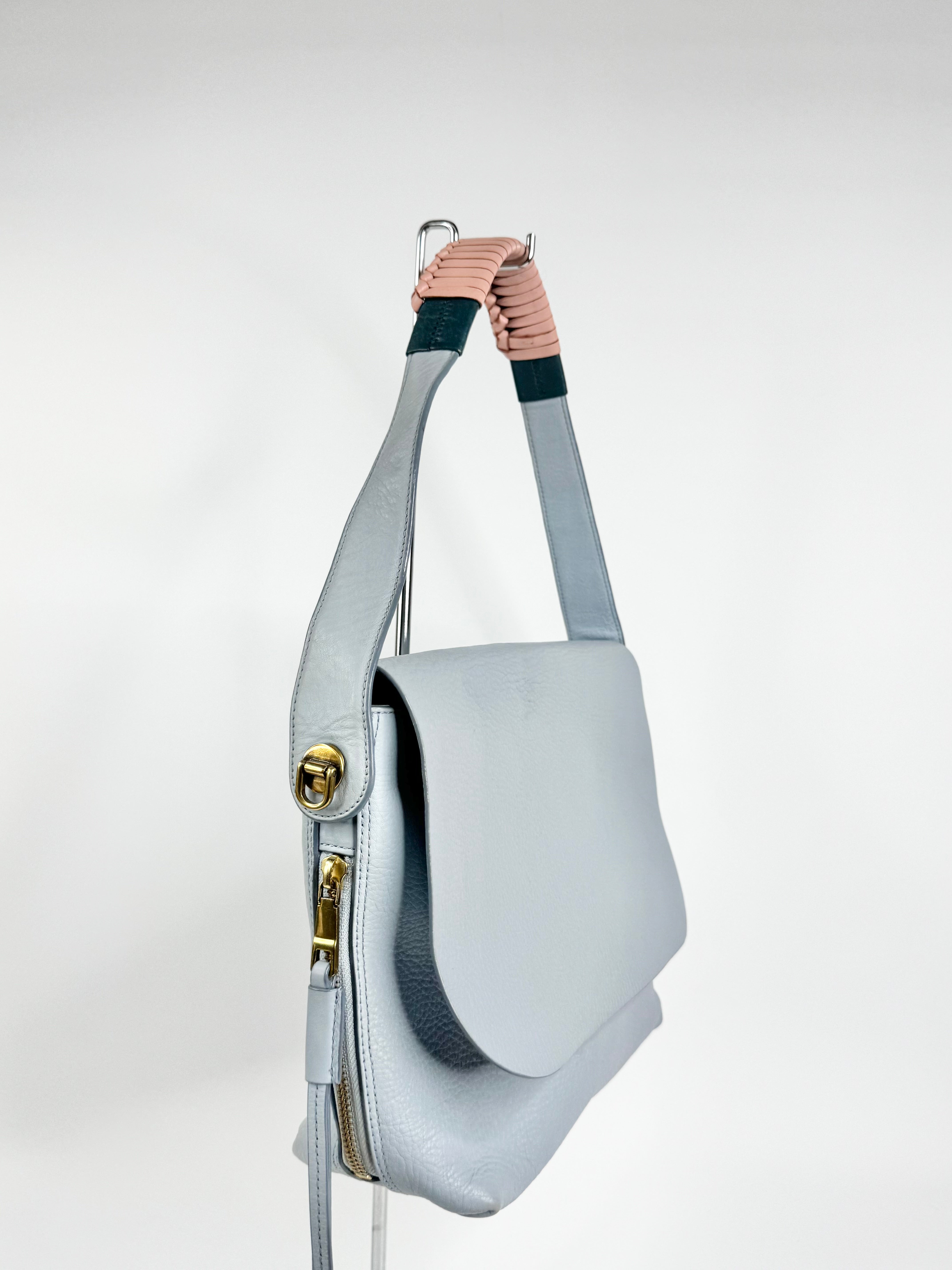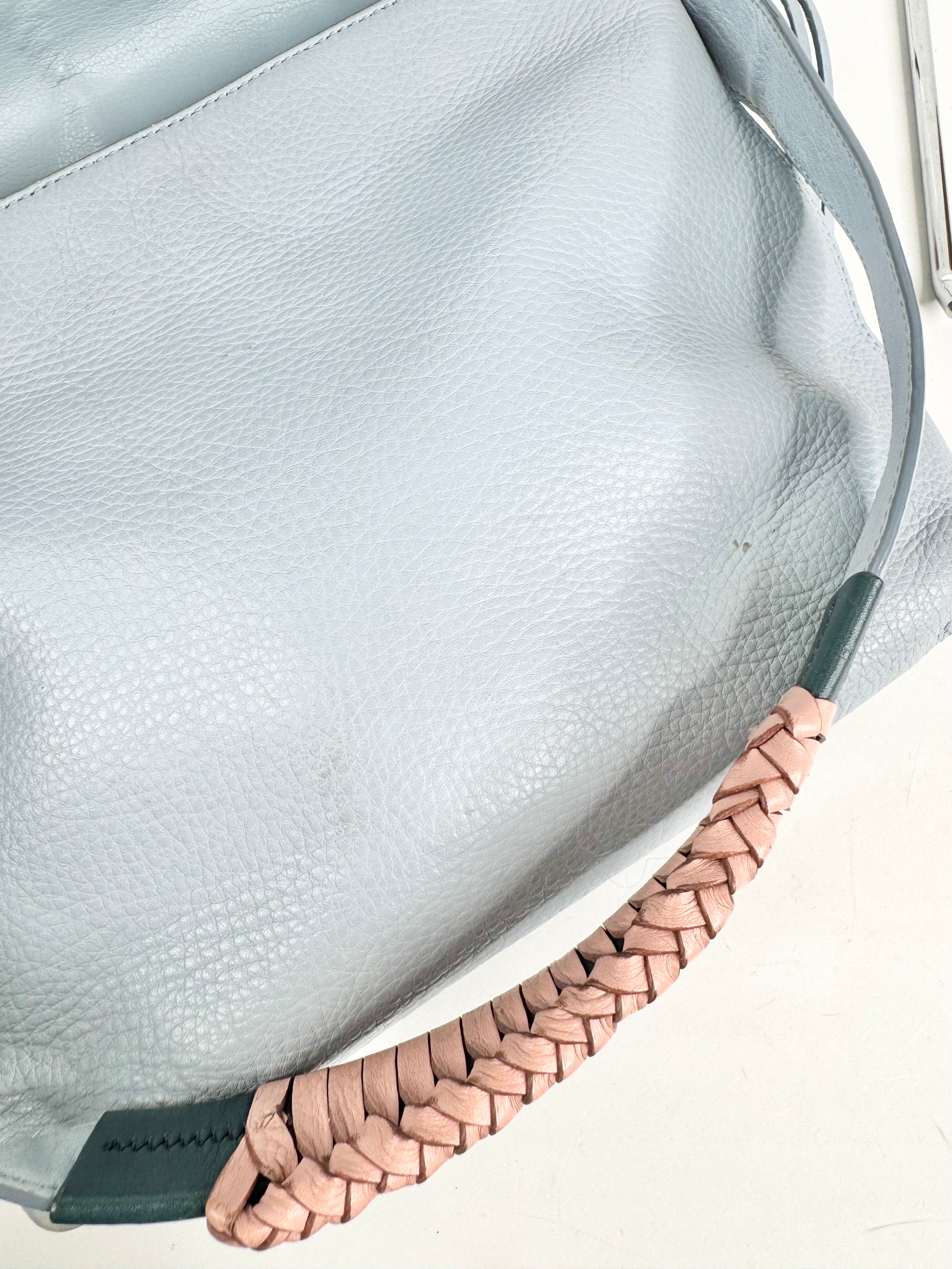 A pale blue grained leather shoulder bag with the signature tea motif, a pale pink twisted leather panel on the strap and beige lining within. There is some overall wear especially to the edges of the leather where the colour has faded.