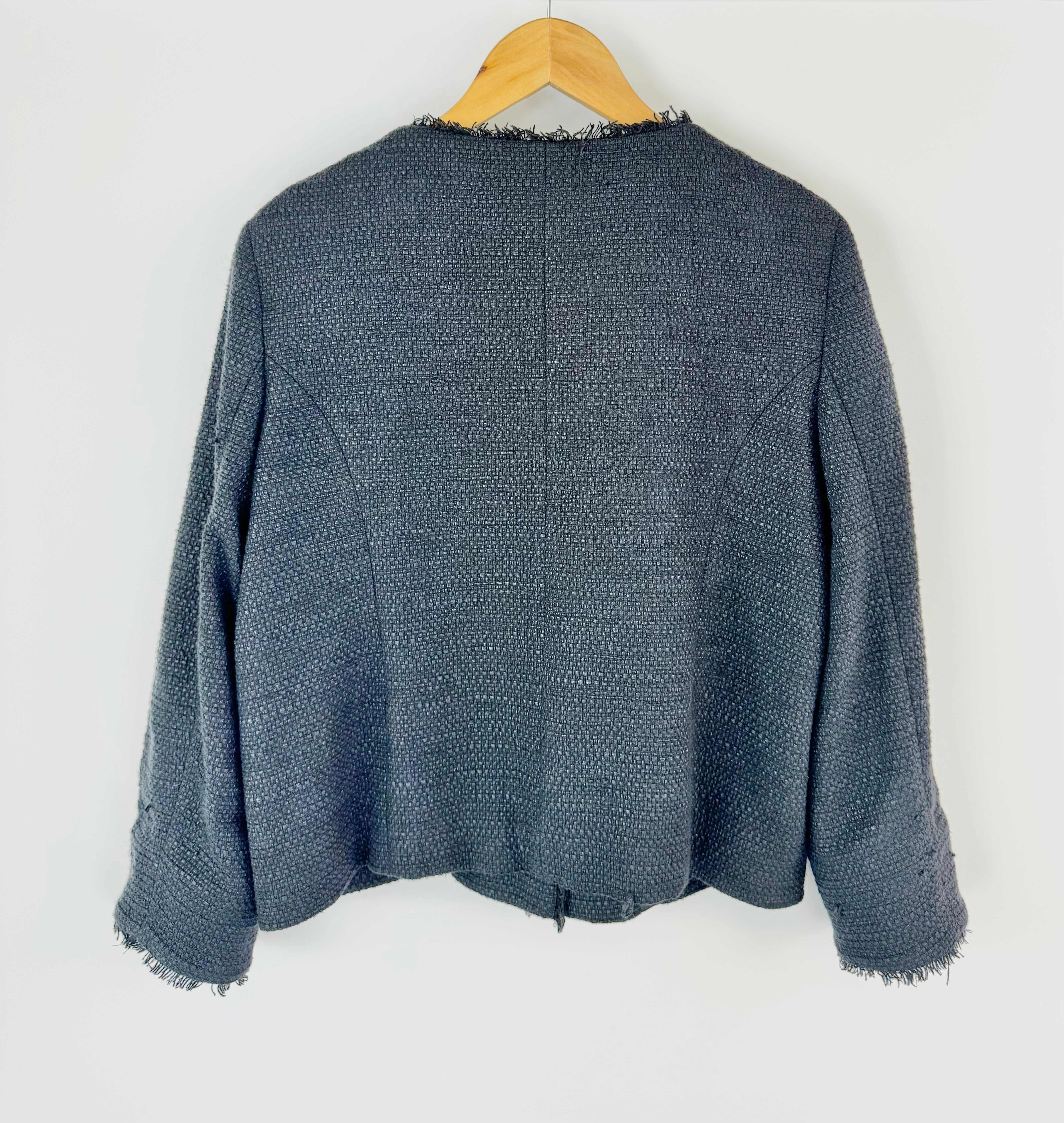A lovely black woven blazer with raw fringe trim around the hems. Features invisible click buttons to enclose and open pockets beneath the waist. There are a number of visible pulls on the fabric, and this has been reflected in the price.