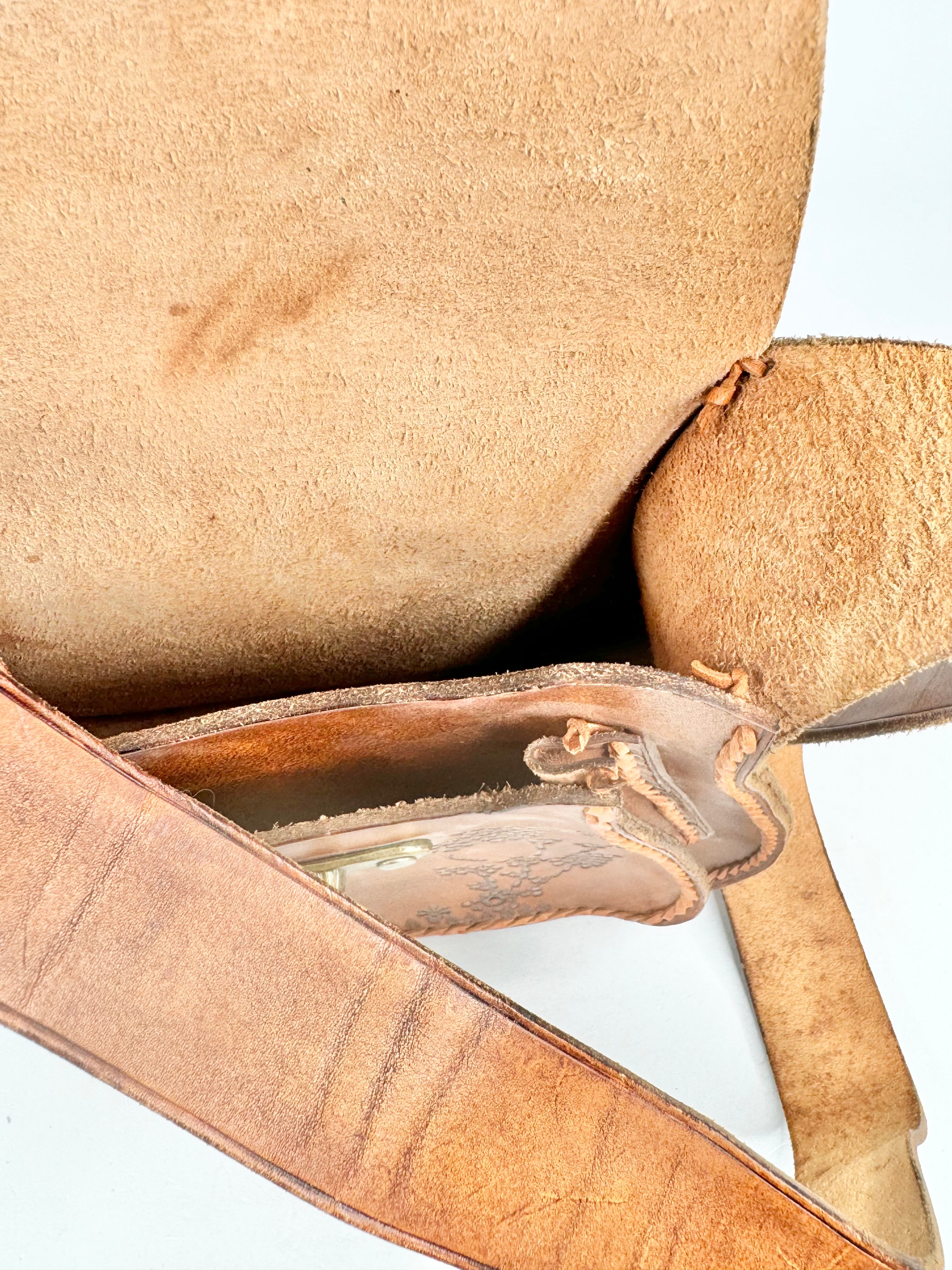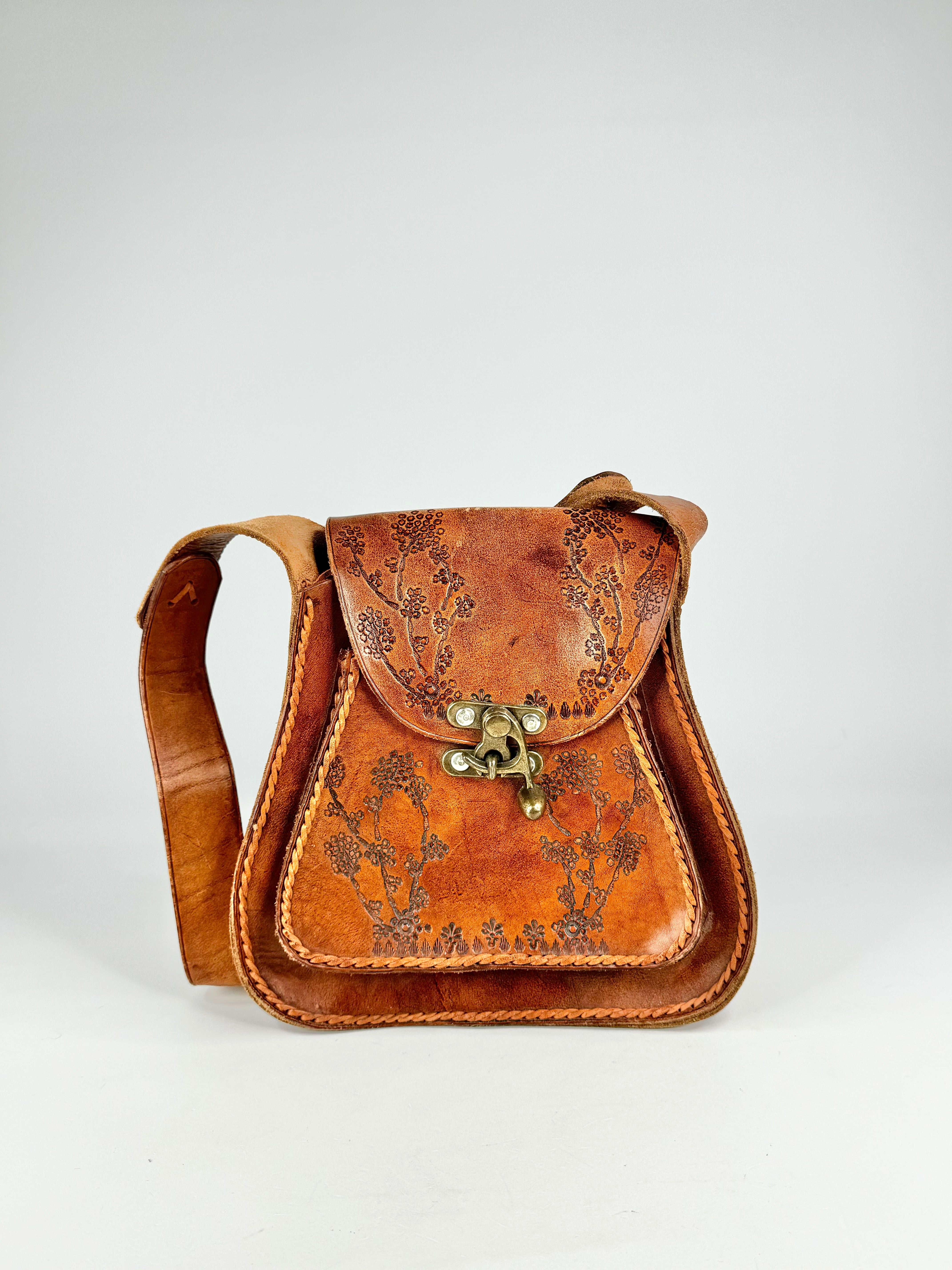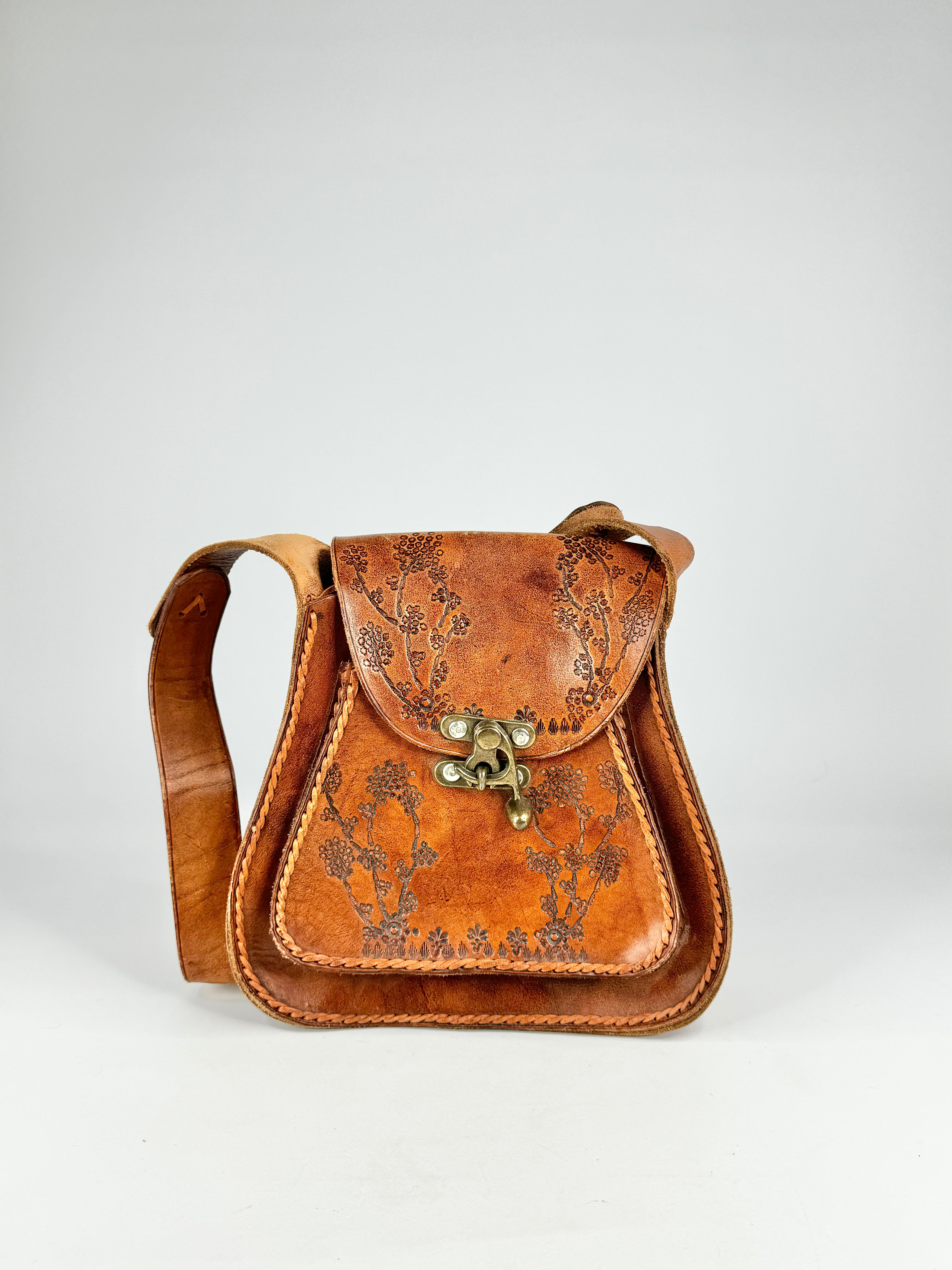 A gorgeous, rich leather bag composed of a deep tan shade with stunning blossoms stamped into the front, a large hooked enclosure in bras and a small to medium sized strap.
