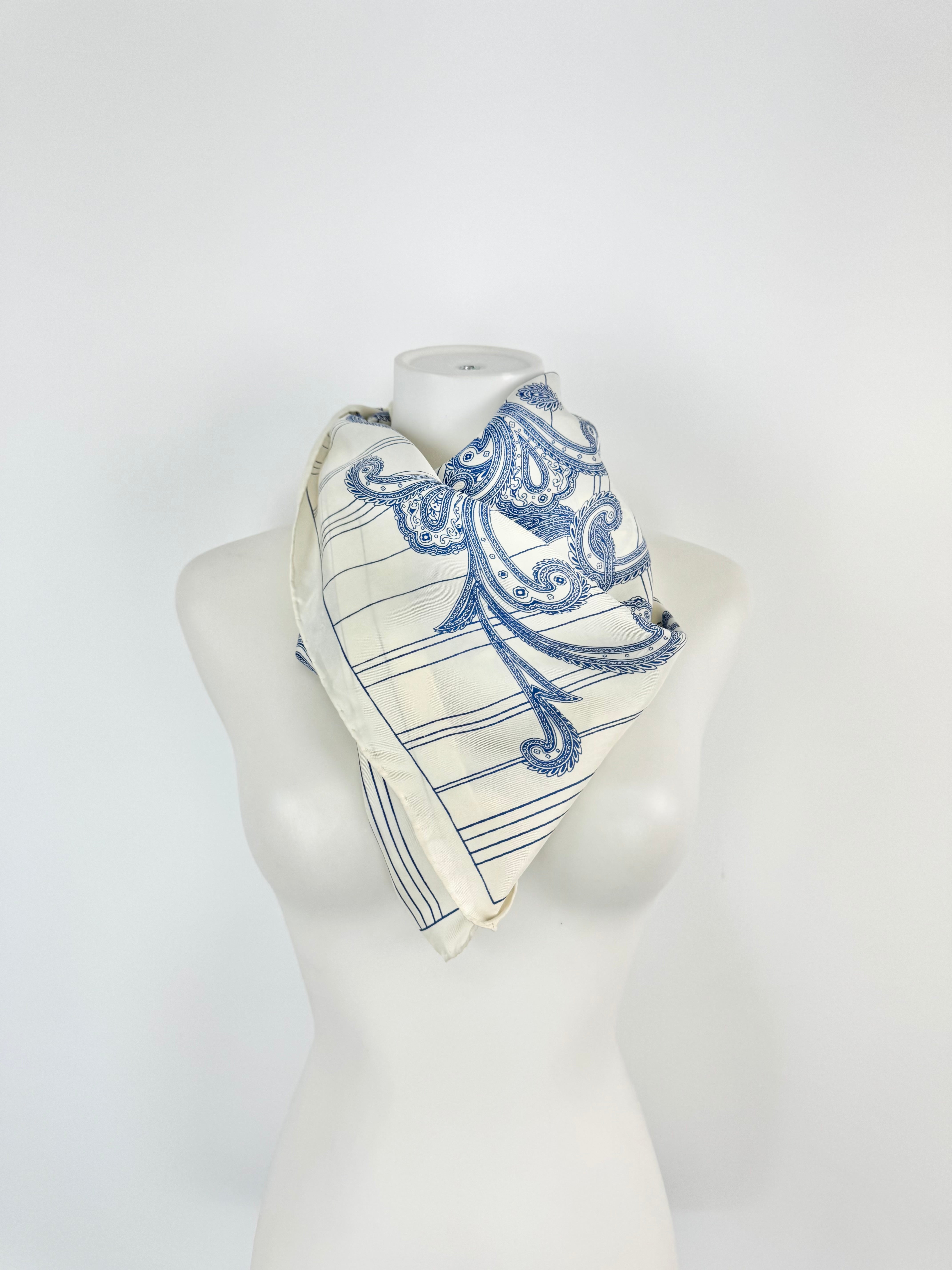 A beautiful hand-rolled silk scarf in a pale cream shade with intricate paisley pattern in blue. In overall excellent condition.