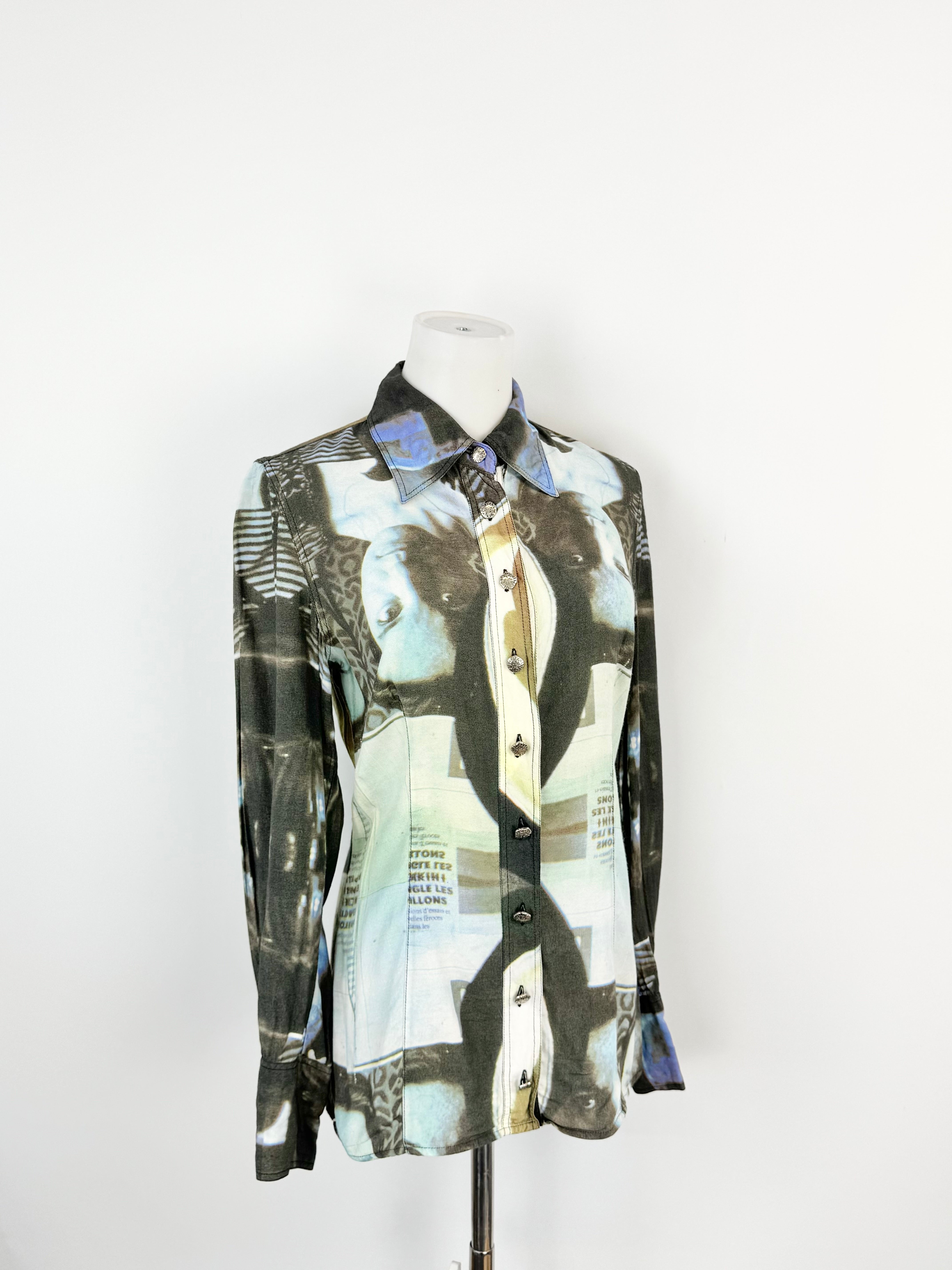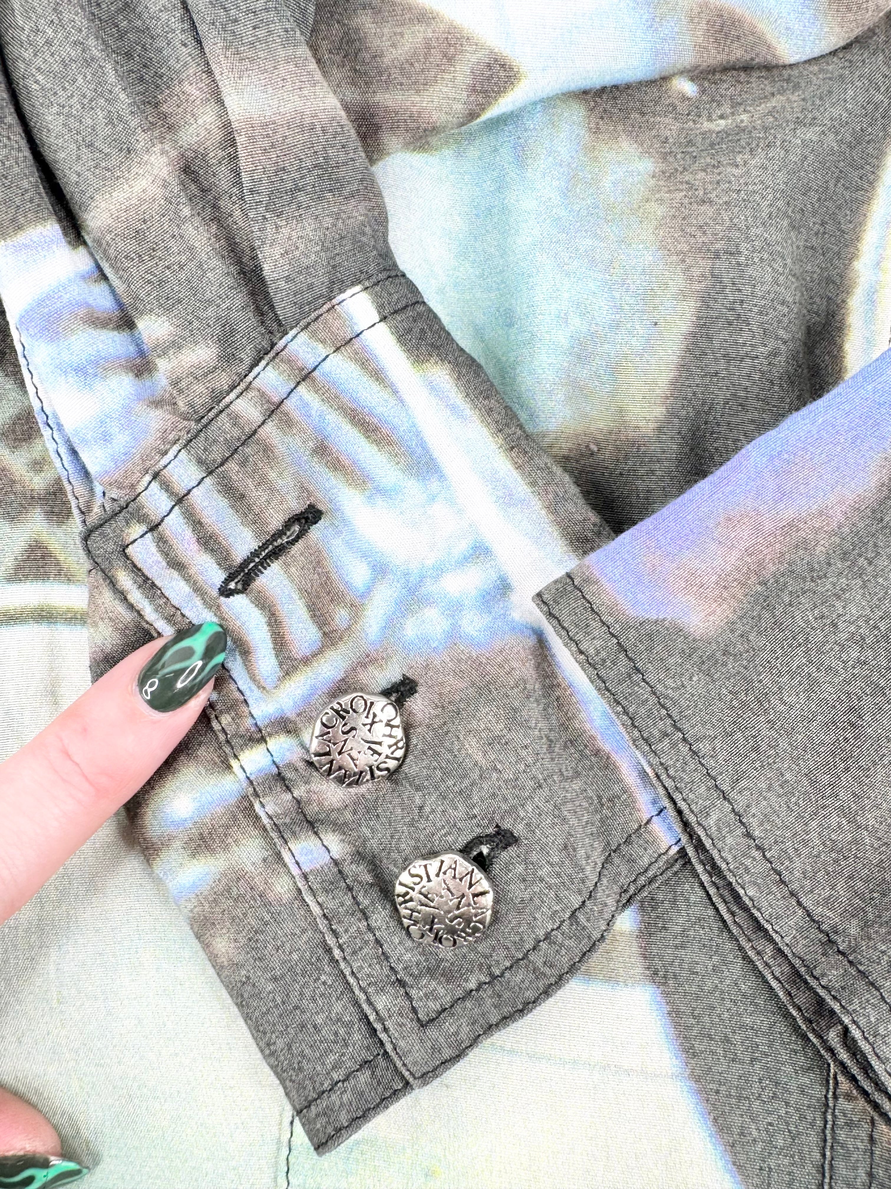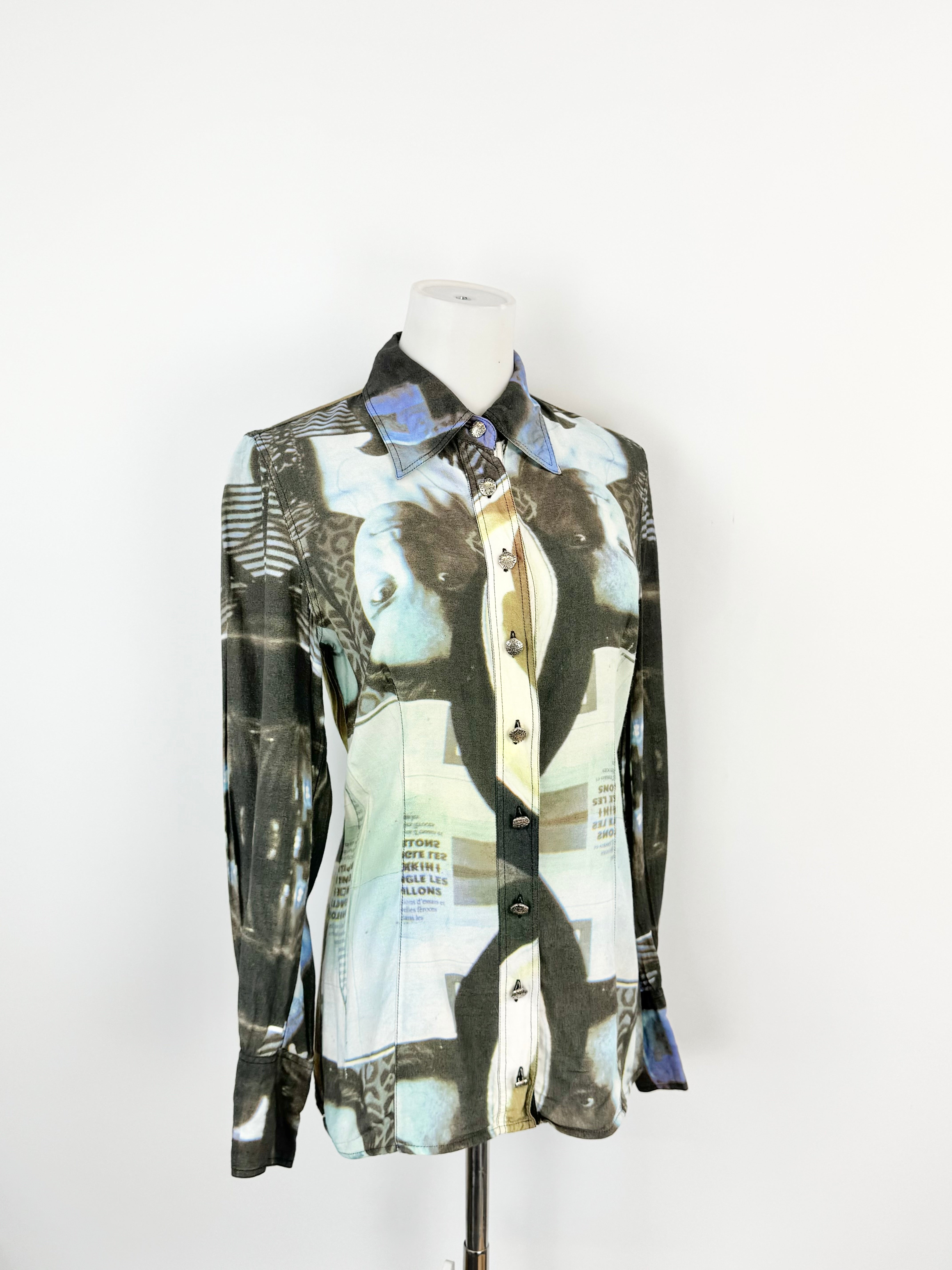 A haunting pattern of photographs with a blue cast cover this fitted long sleeve button up shirt from Christian Lacroix's 'Jeans' line. Made in Italy, it features a crisp collar, silver toned buttons etched with the label down the front along with on the cuffs - sadly one is missing.