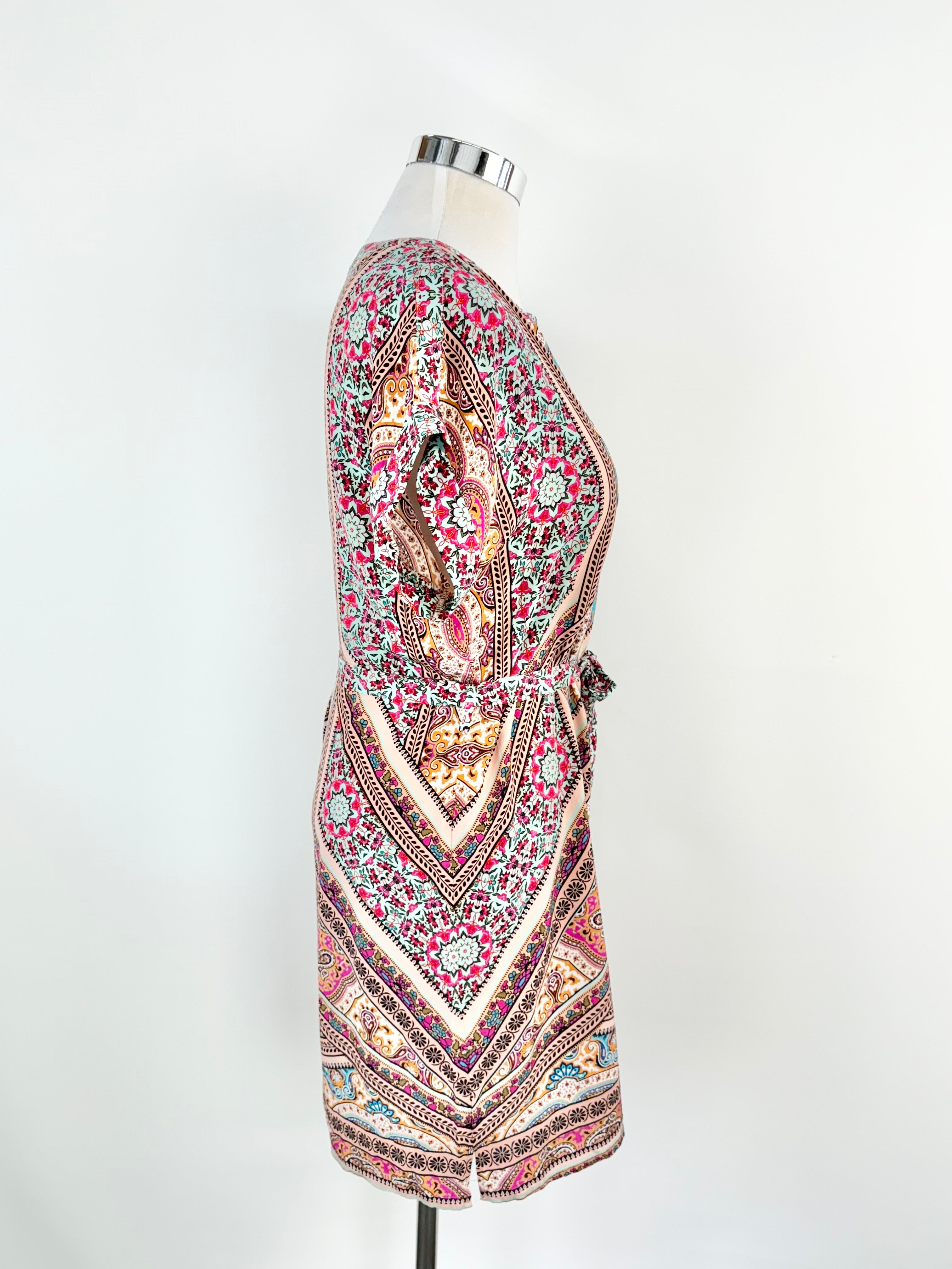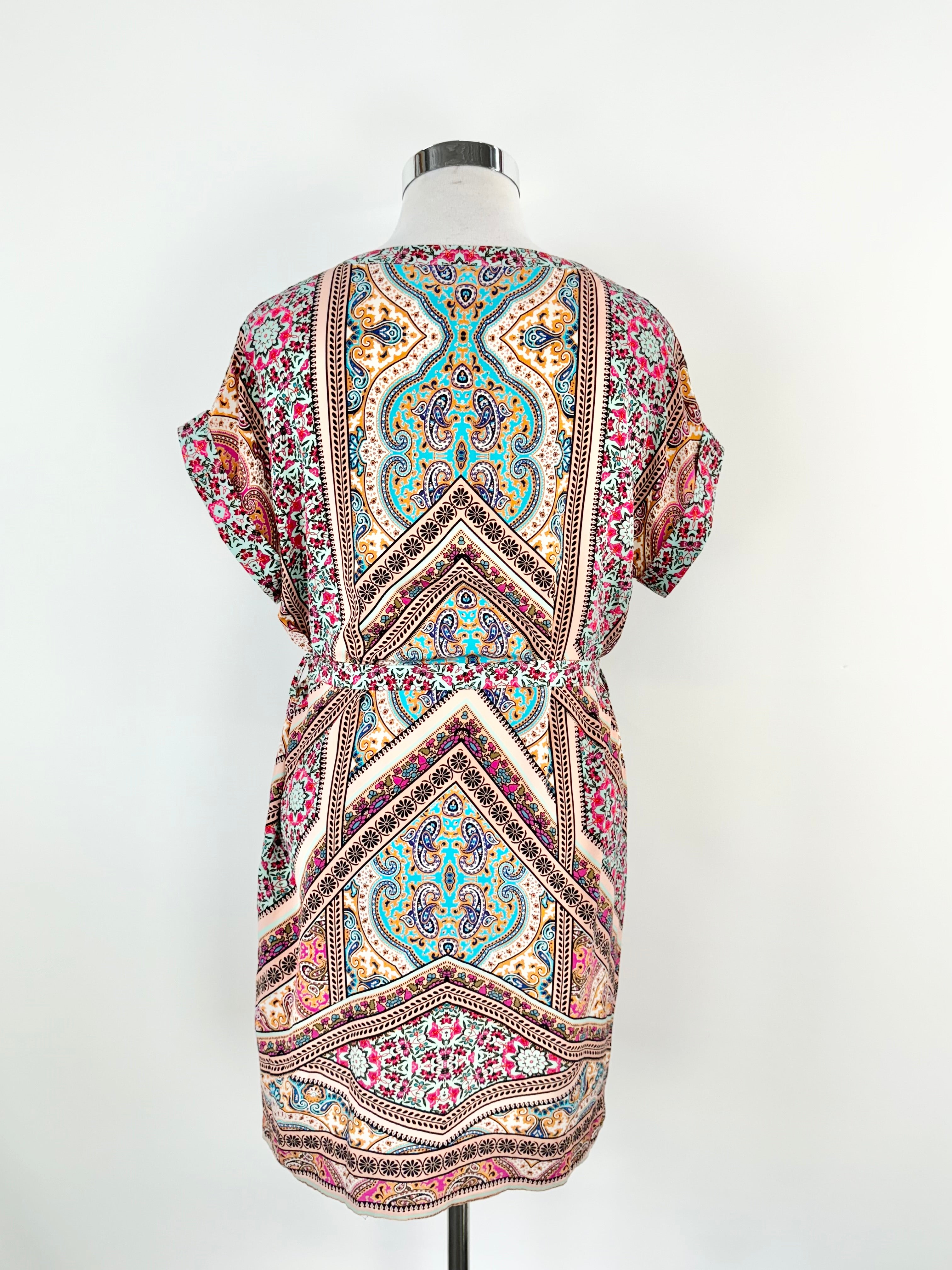 A elborately patterned silk tunic style dress from Kachel. This brightly shaded garment has an overall, loose, relaxed fit with a tie at the waist.