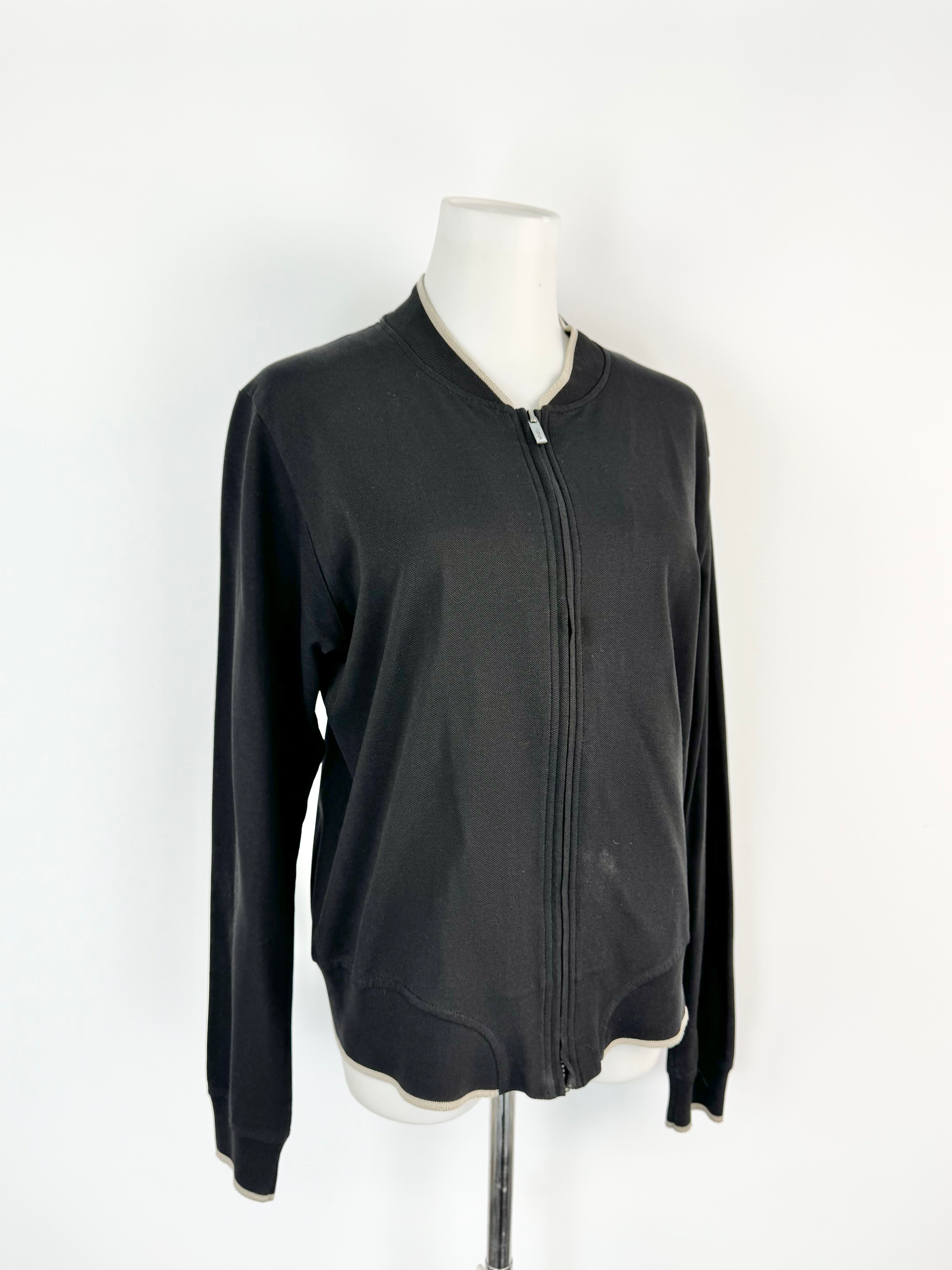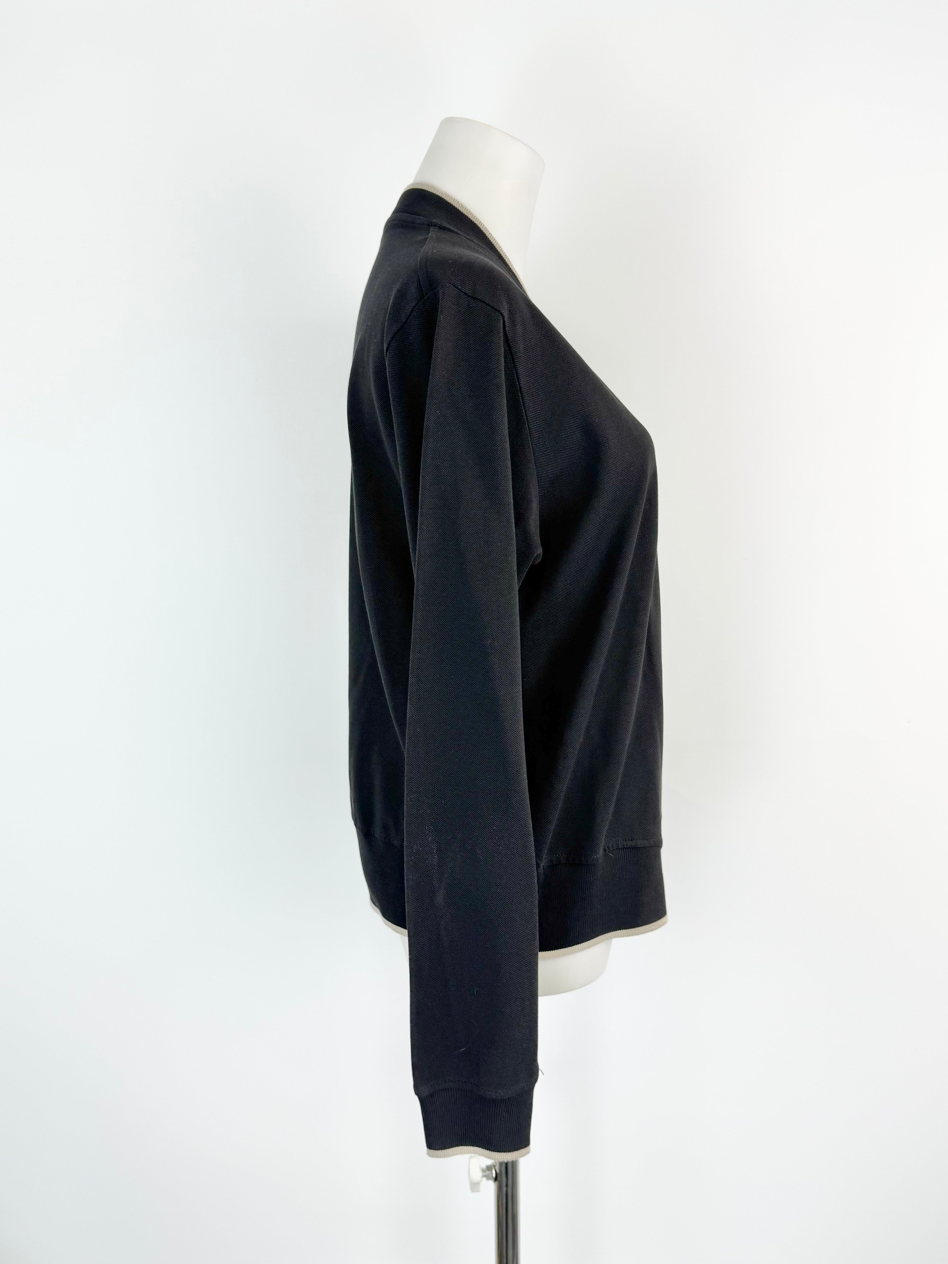 A small sized cotton cardigan in black with cream contrast running down the neckline along with the base of the garment. There is overall wear to this item.