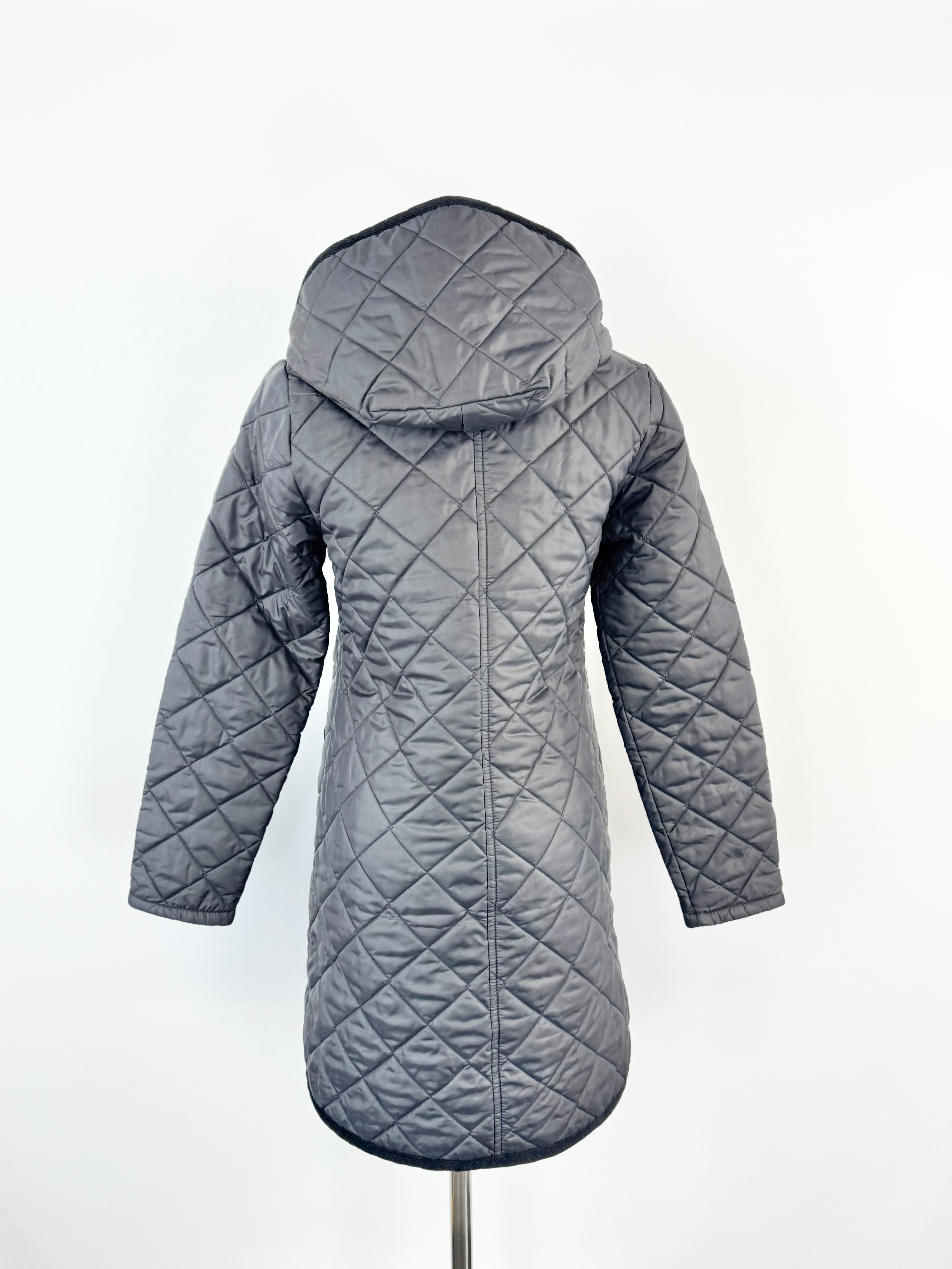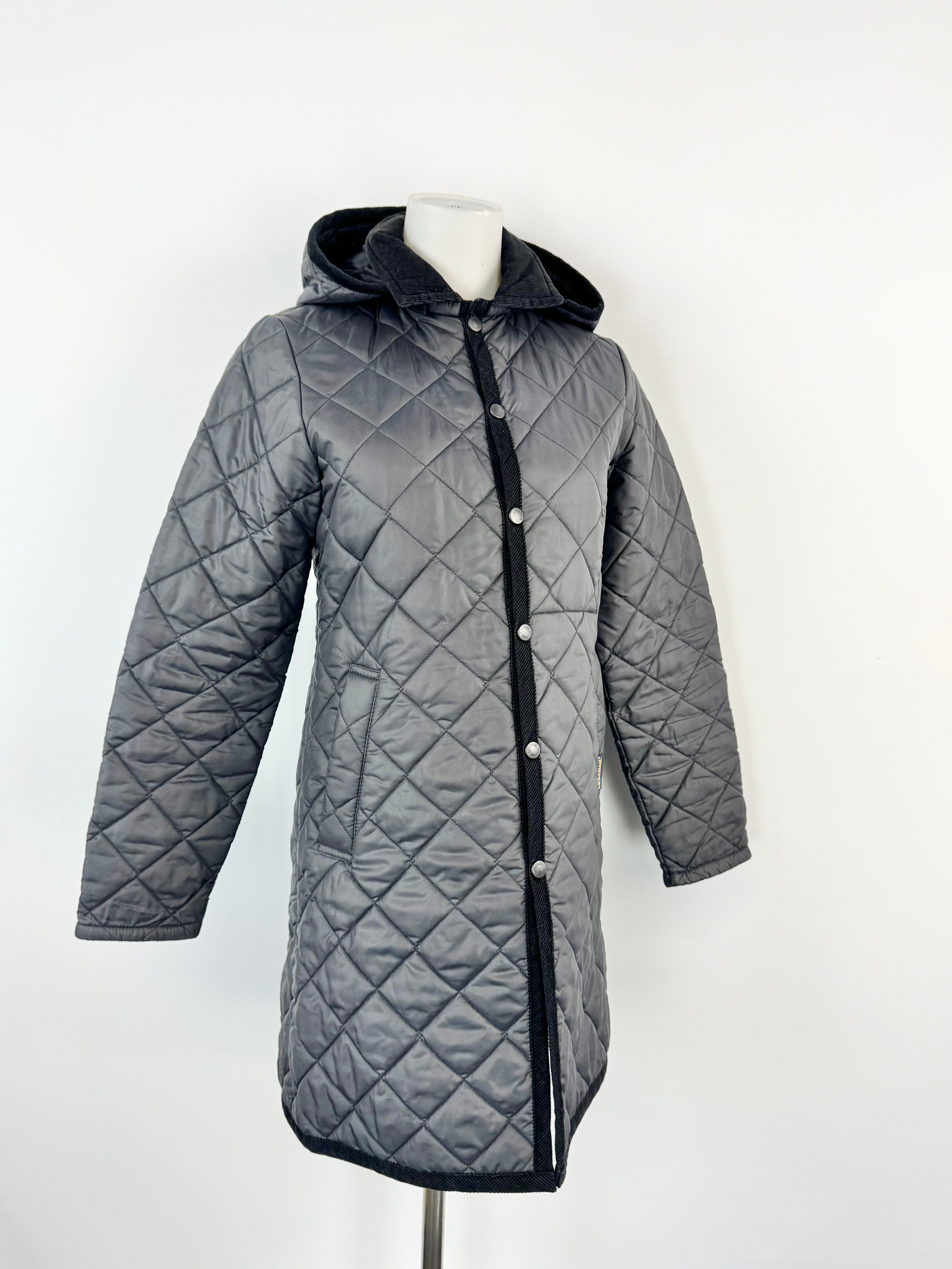 An equestrian dream, perfectly for riding on cold days without letting you get cold, nor being too stuffy to move about your horse. This item is in good overall good condition but does have some wear. It has a small hood which is removable via the buttons and corduroy contrast.