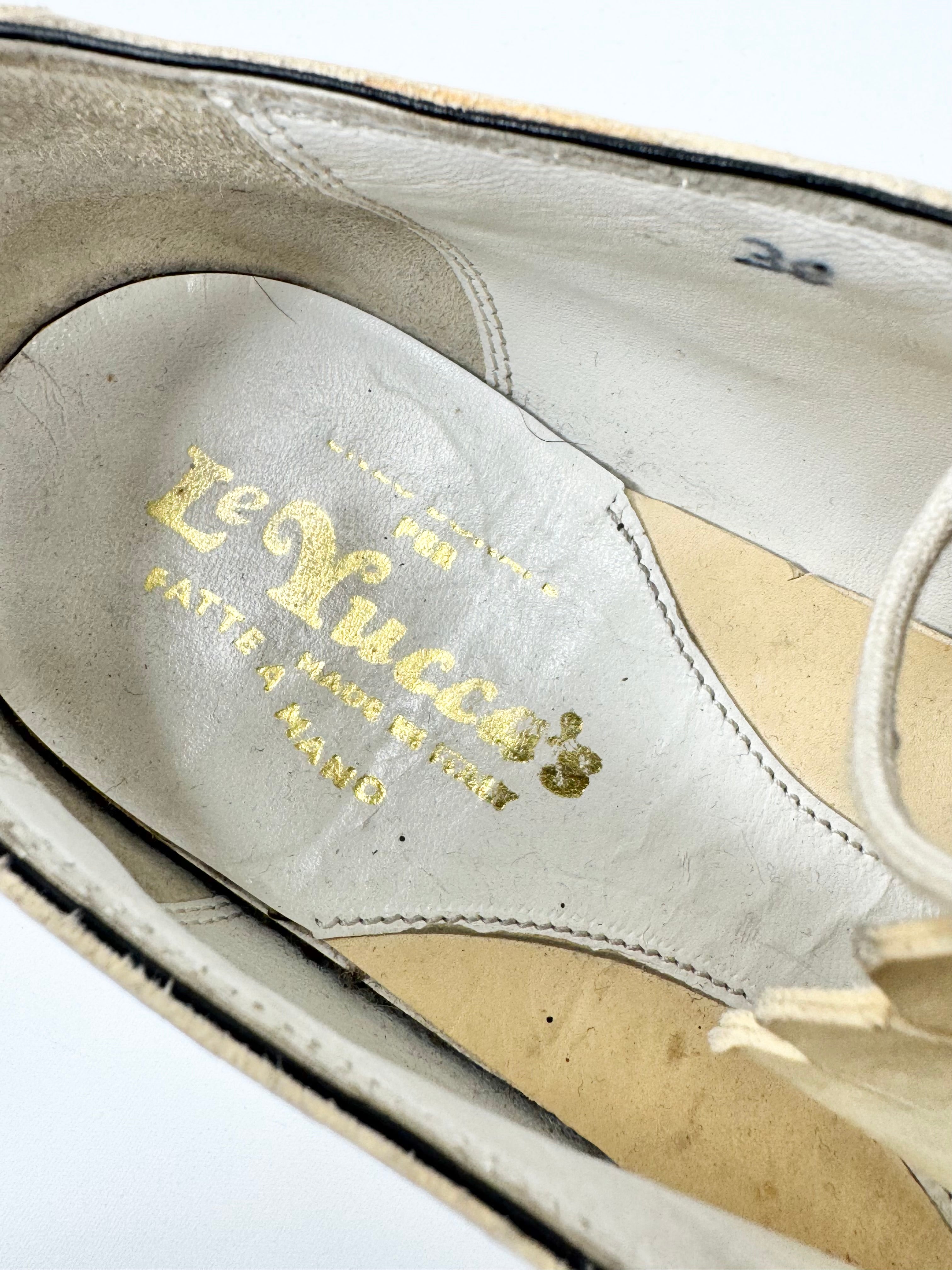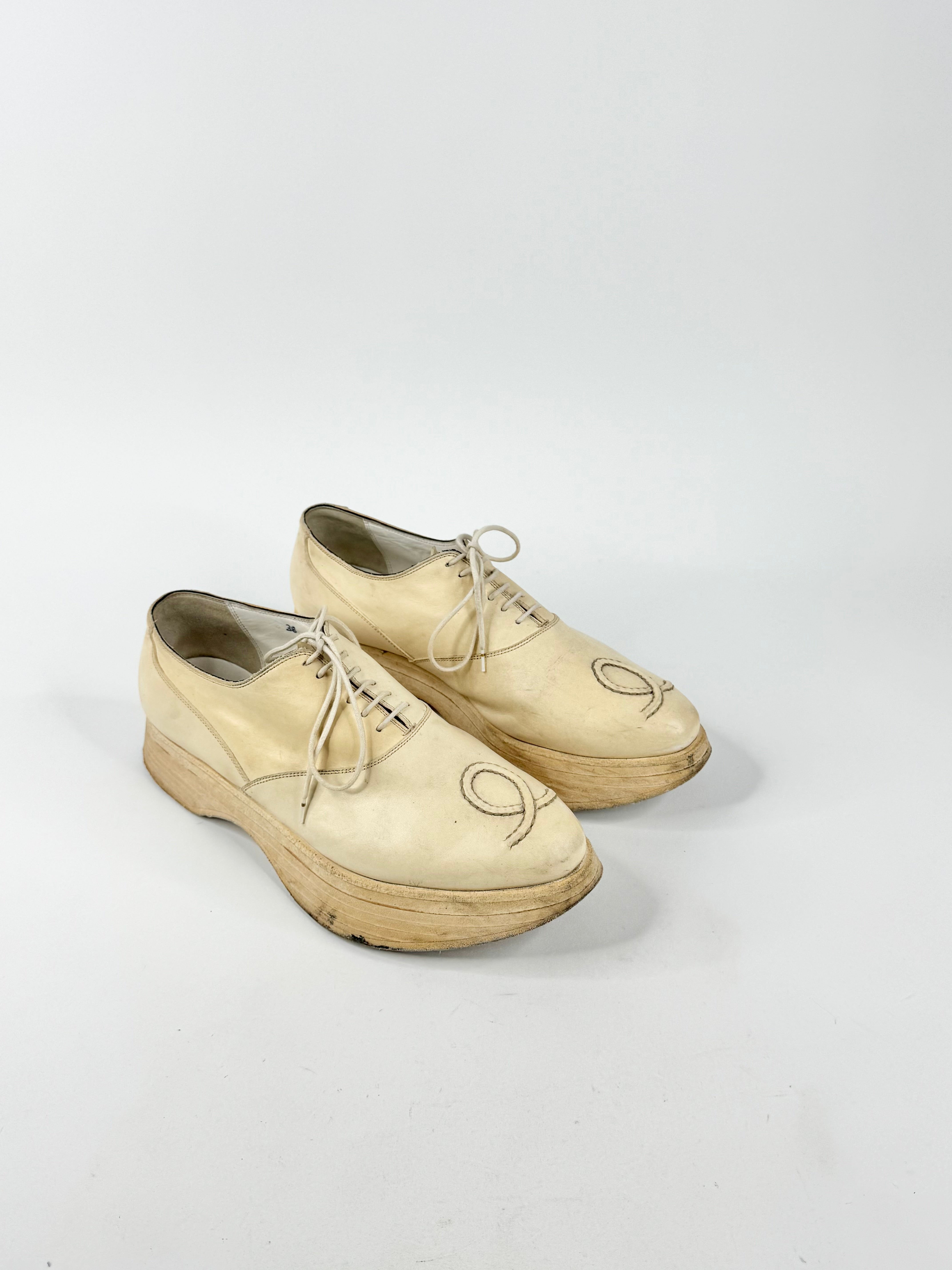 A pair of vanilla shaded pair of leather shoes with delicate laces, a stitched motif on the front and a slight platform. These shoes do need to have a good clean and there is some overall wear especially to the sole.