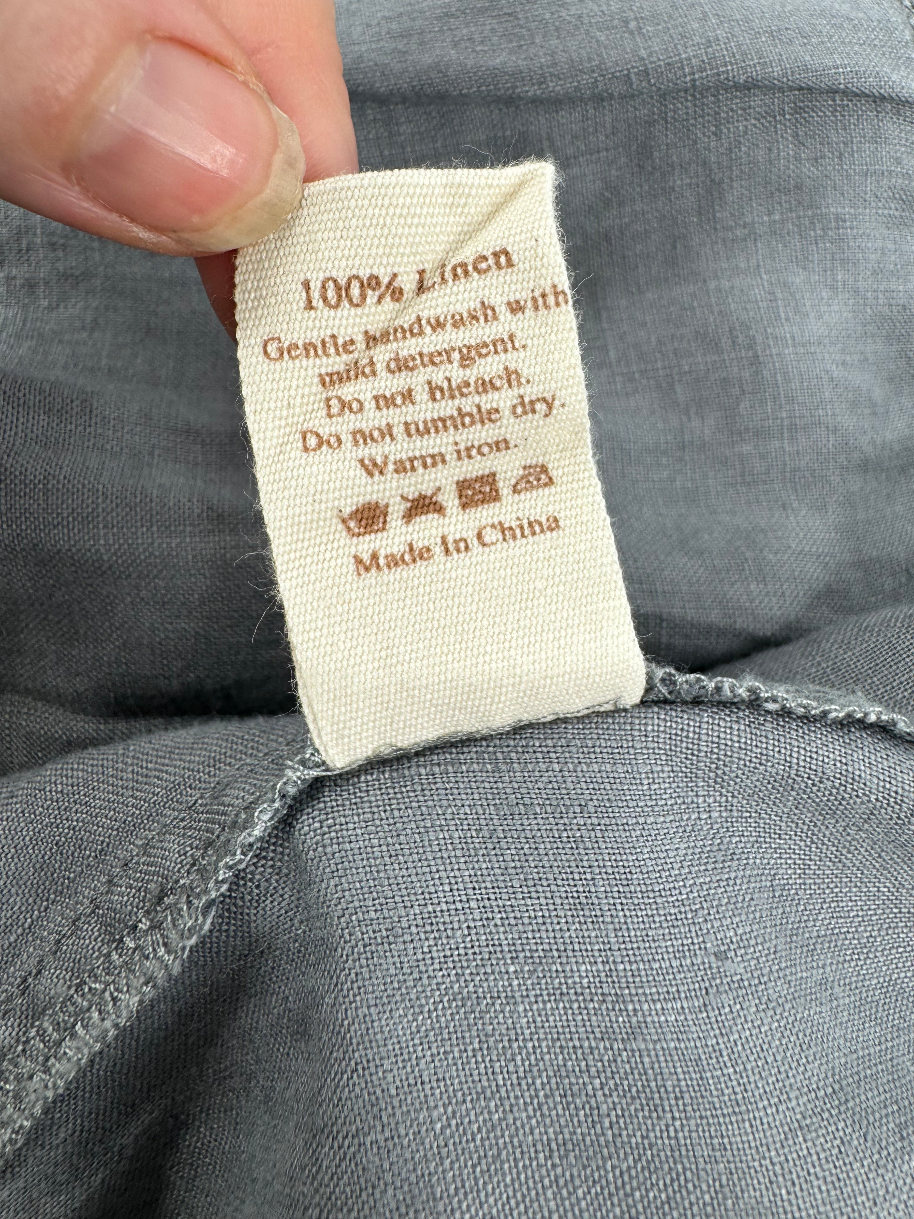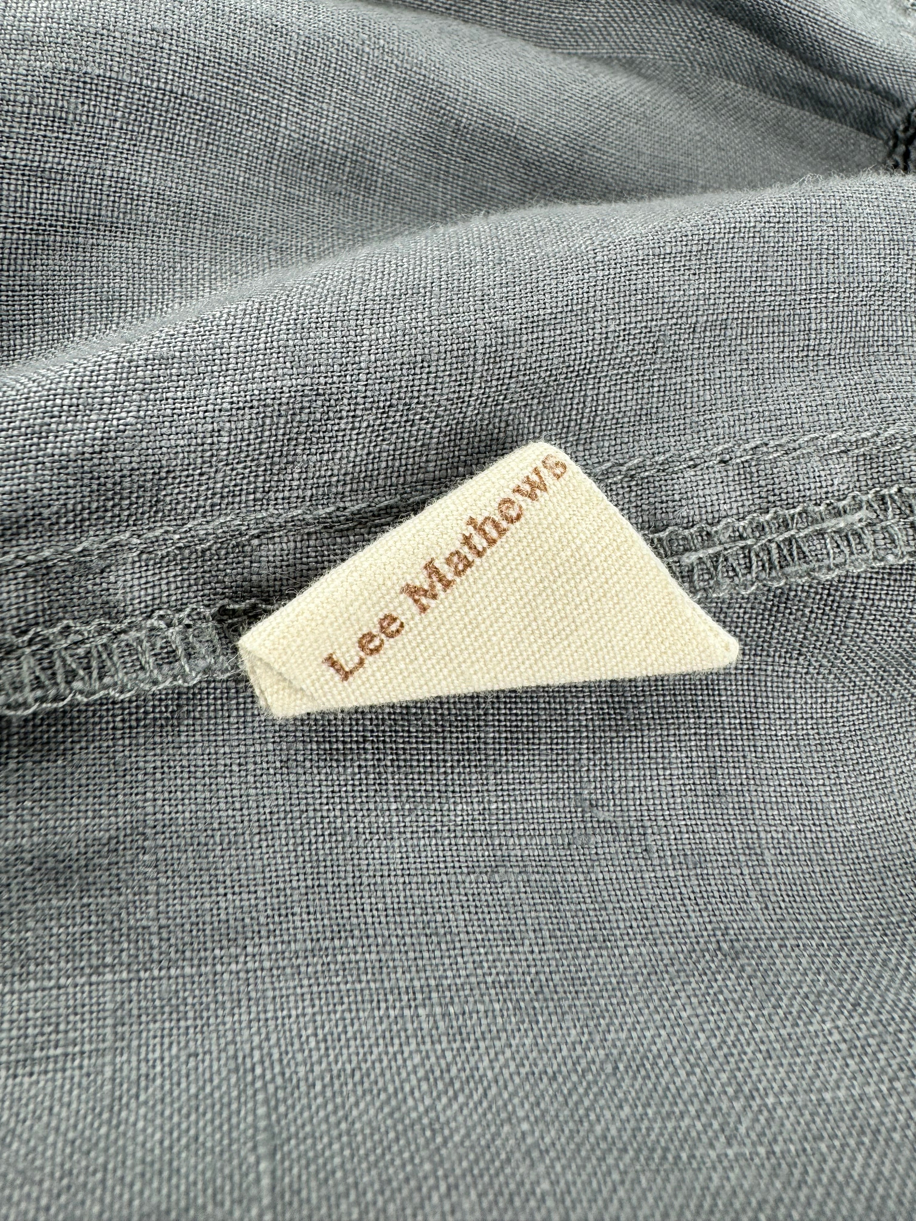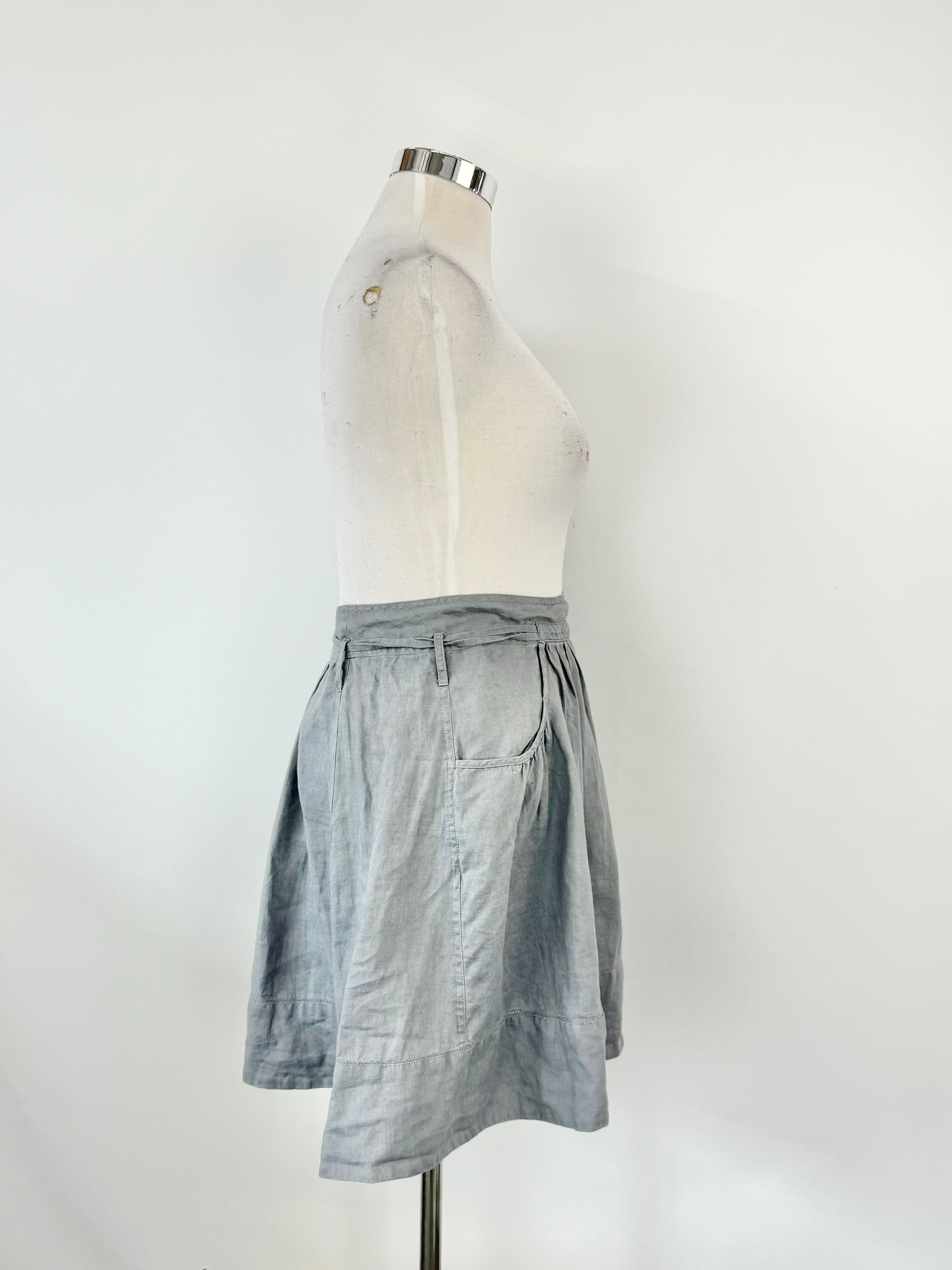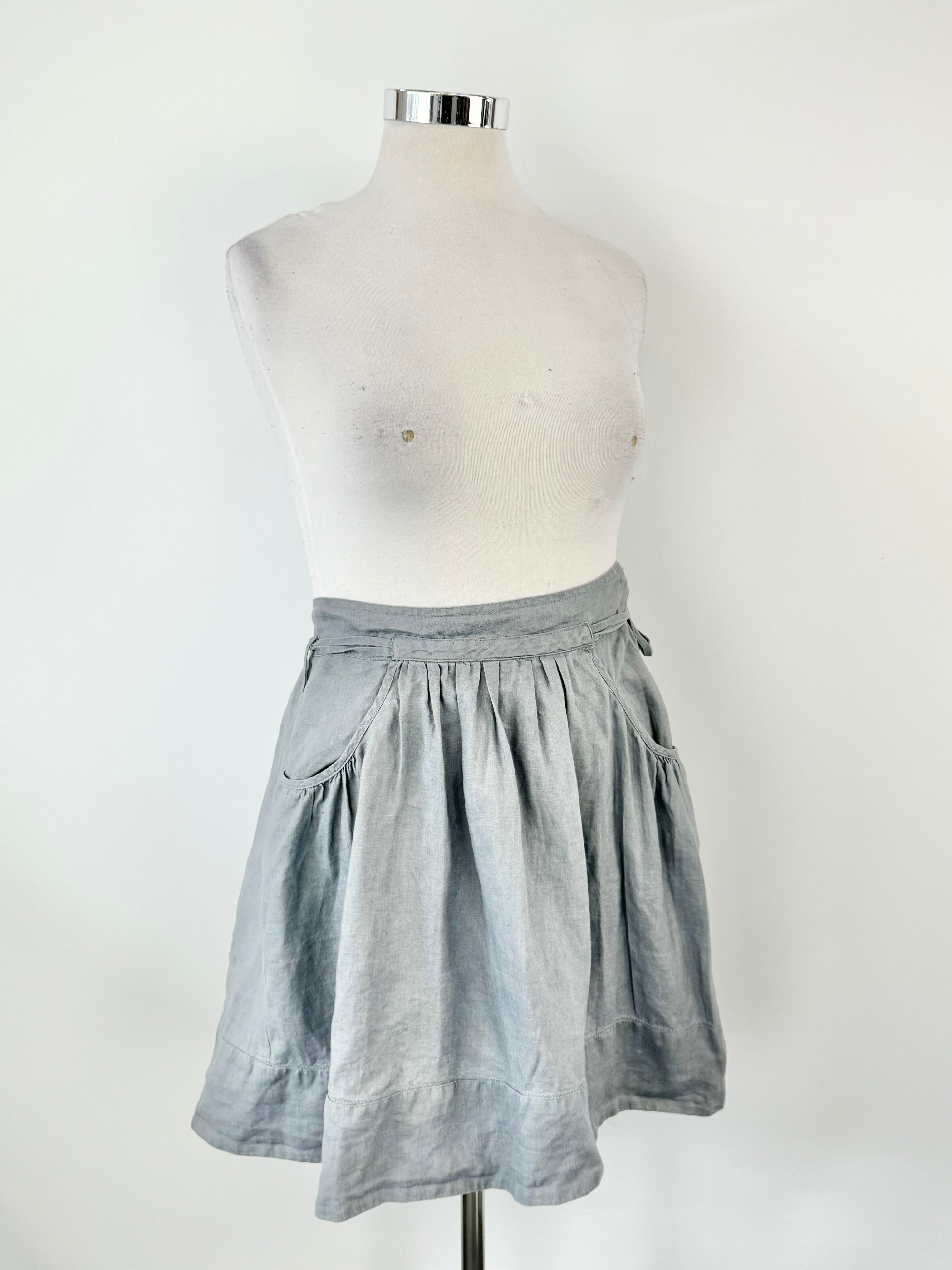 A beautiful soft grey linen skirt from Australian label Lee Mathews. It encloses at the side with the zipper at the side along with two small ties at the waist with little pockets on either side.