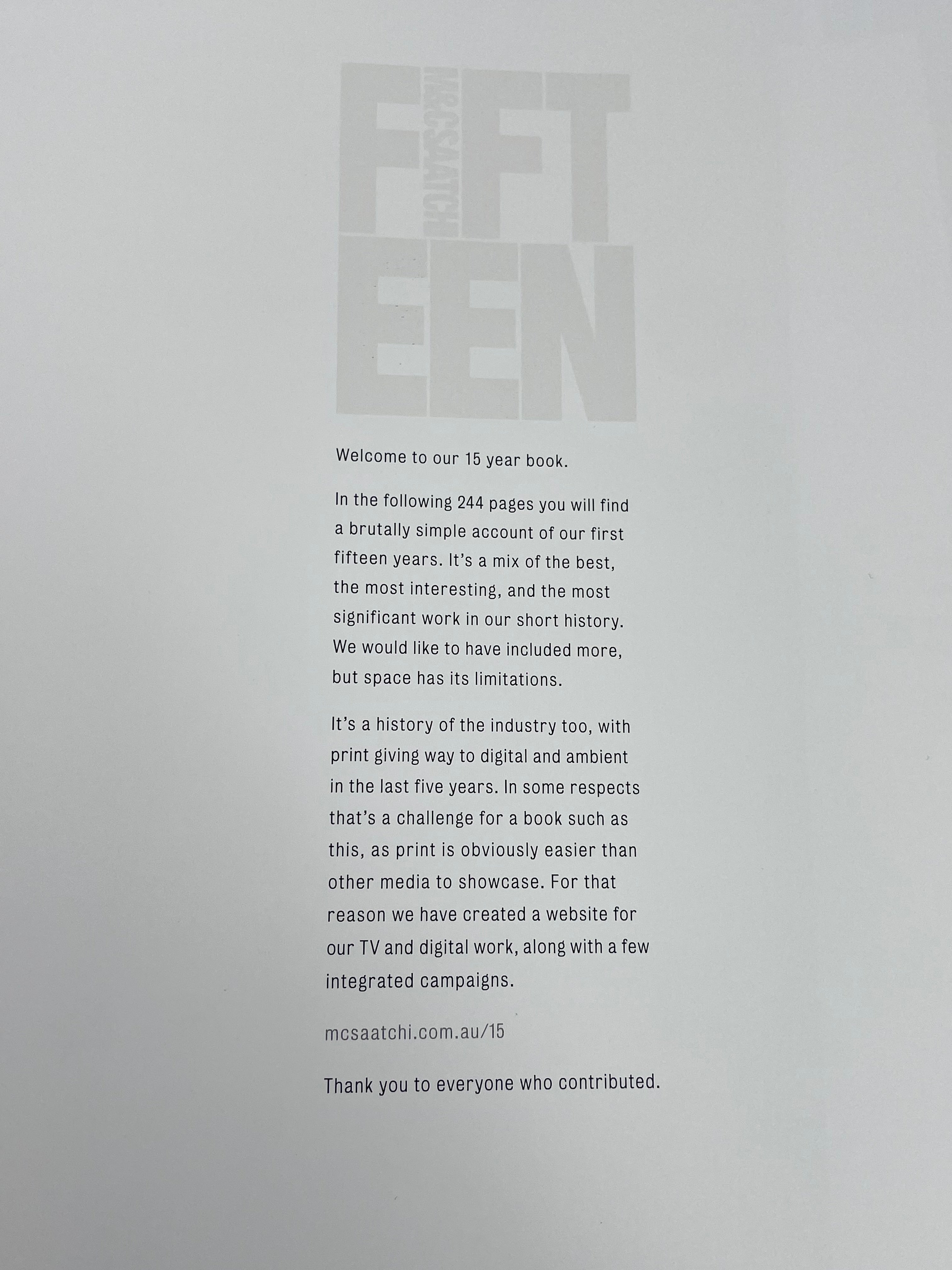 A 15-year anniversary retrospective for Australian ad agency M&C Saatchi, with this beautifully presented hardcover book looking back on some of their renowned work across the time period. There is wear and marks as pictured to the hardcover, but overall the book is in very good-to-excellent condition.