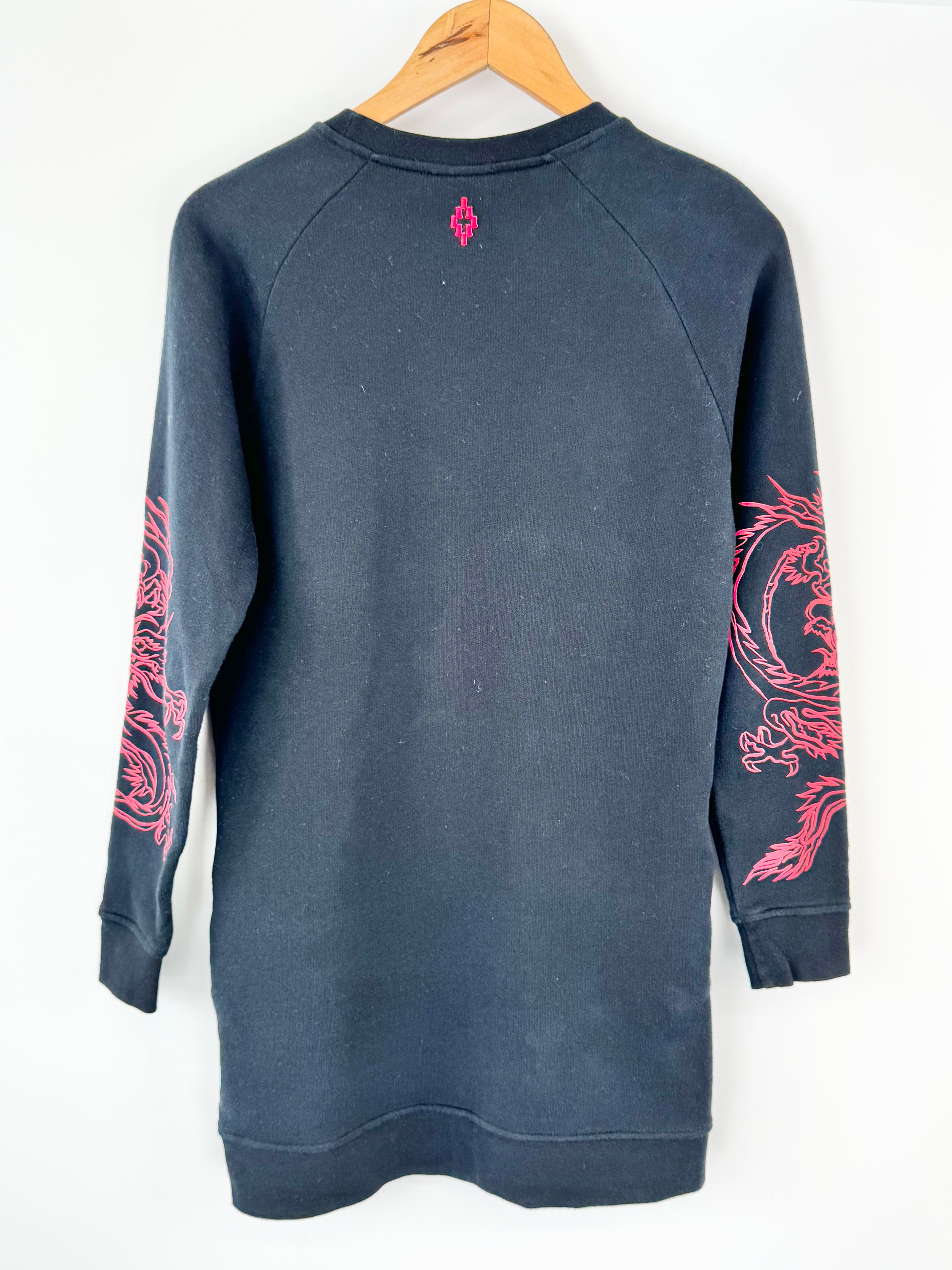 A small to extra small size long sleeve cotton top with zippered pockets at the waist, raglan style sleeves and a longer fit. It features a fearsome tiger embroidered on the front in red with dragons embellishing the sleeves. In overall good condition, it does have some slight wear such as cracking to the embellishments along the sleeves.