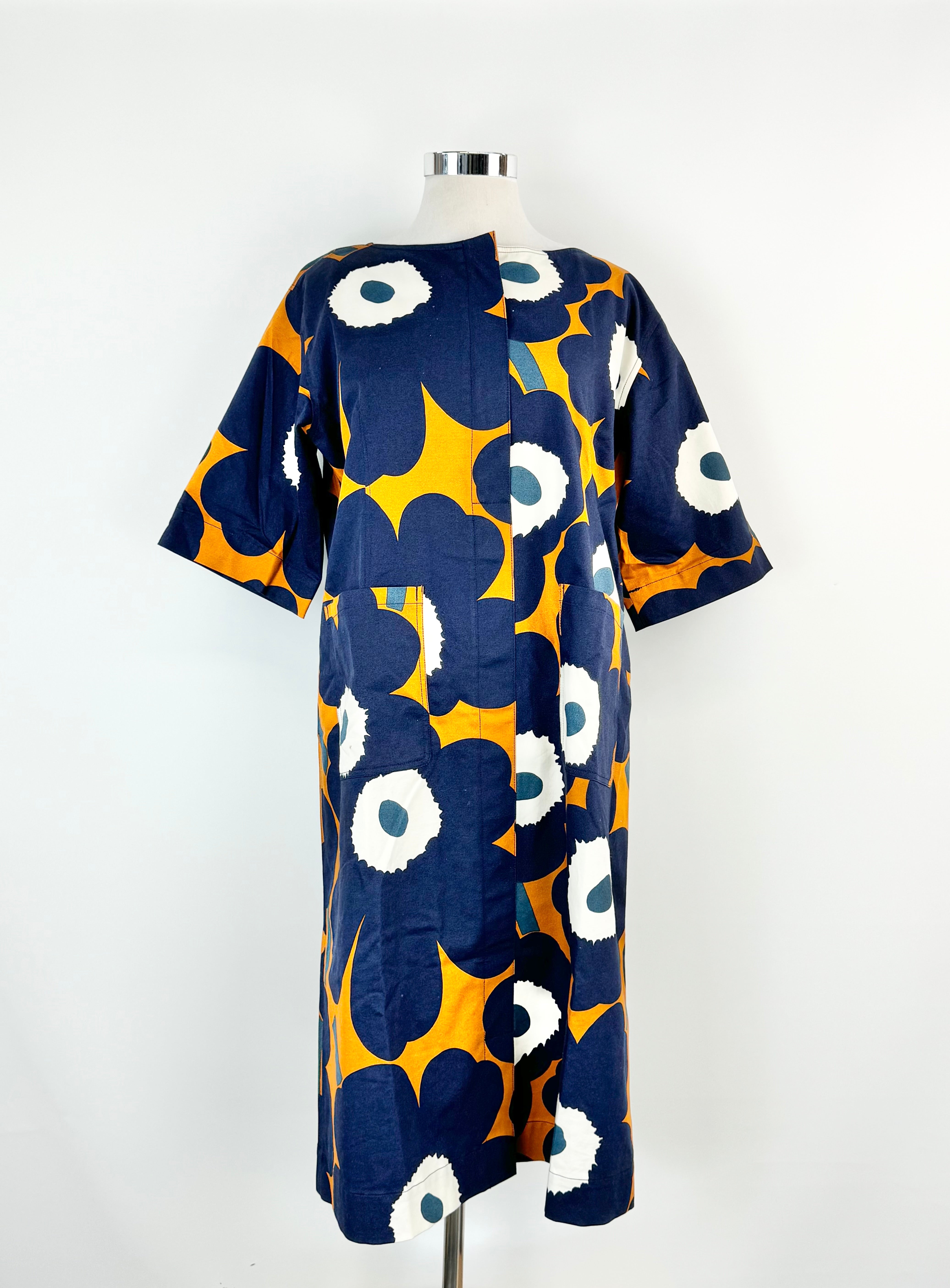 A boldly patterned dress - the classic Marimekko Unikko Poppy print in a shades of a midnight blue with a rusted autumnal orange and white. This garment is in excellent condition! The cotton as a crisp feel - almost like its straight from the rack. There is some slight marks but overall this feels near new.