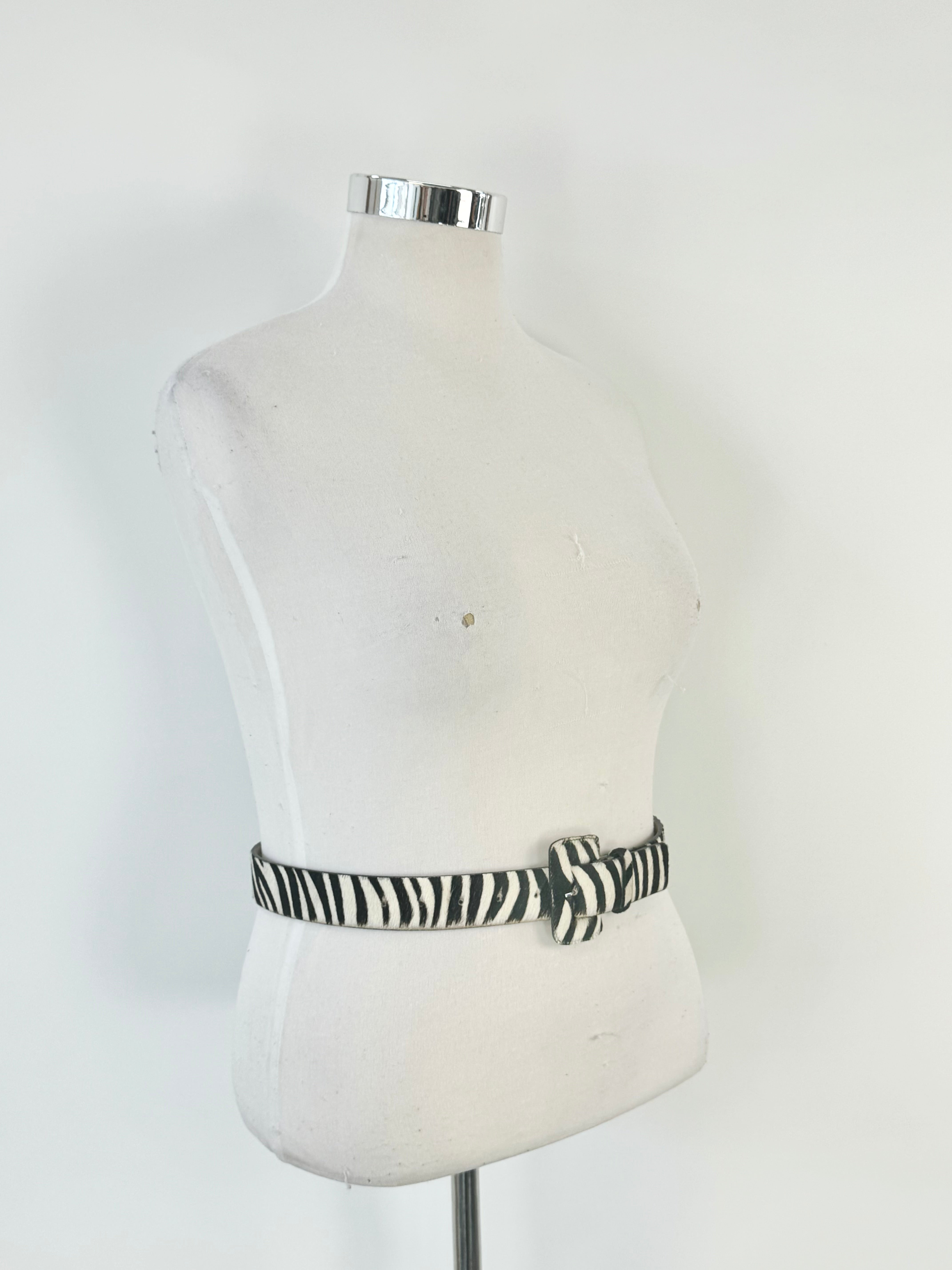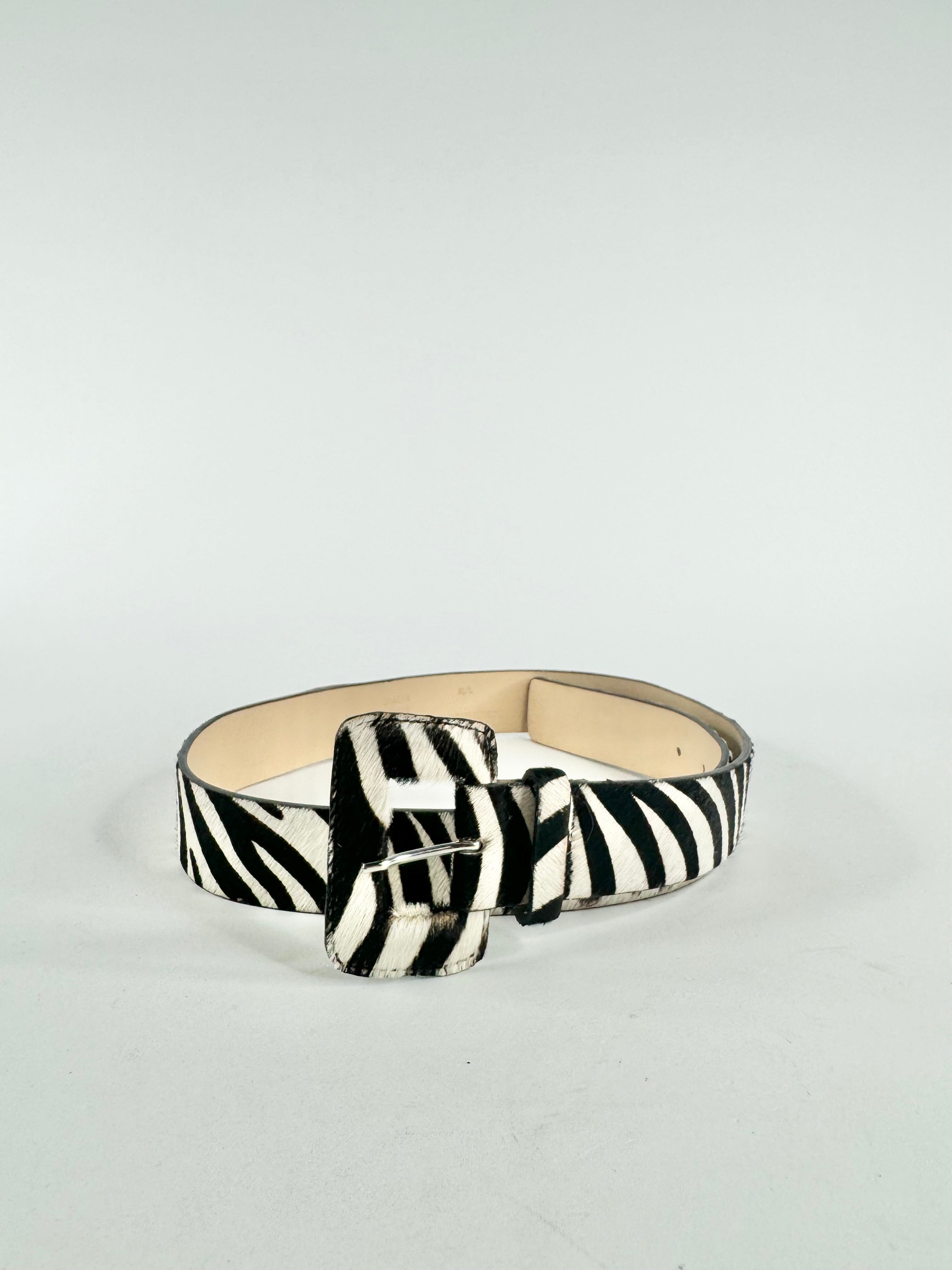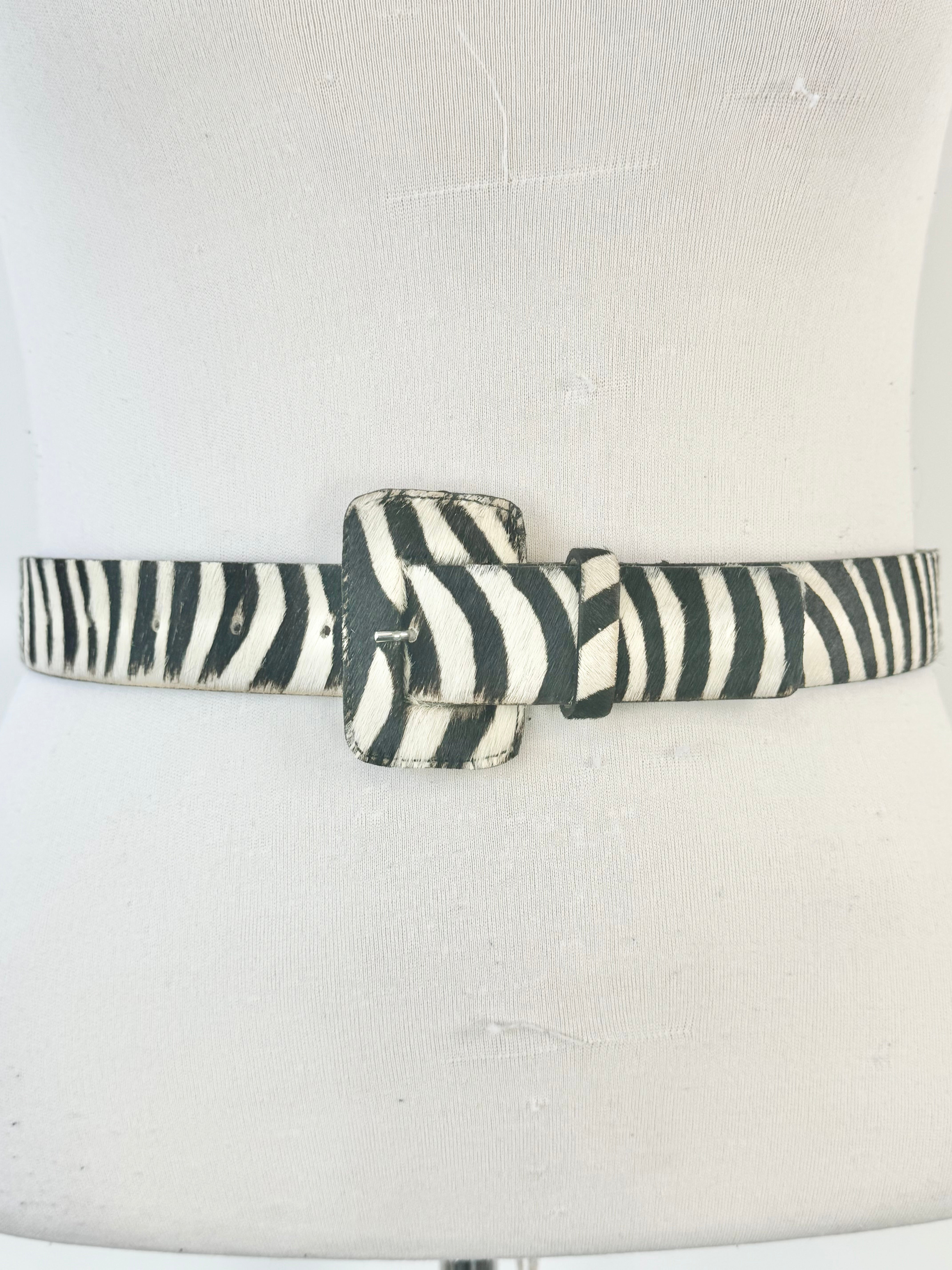 A handsome, black and white fur belt made in Italy from a soft, furred leather fabric. This does have some slight wear with some of the belt coming away - see photos, but this is an easy fix with some good quality leather glue.