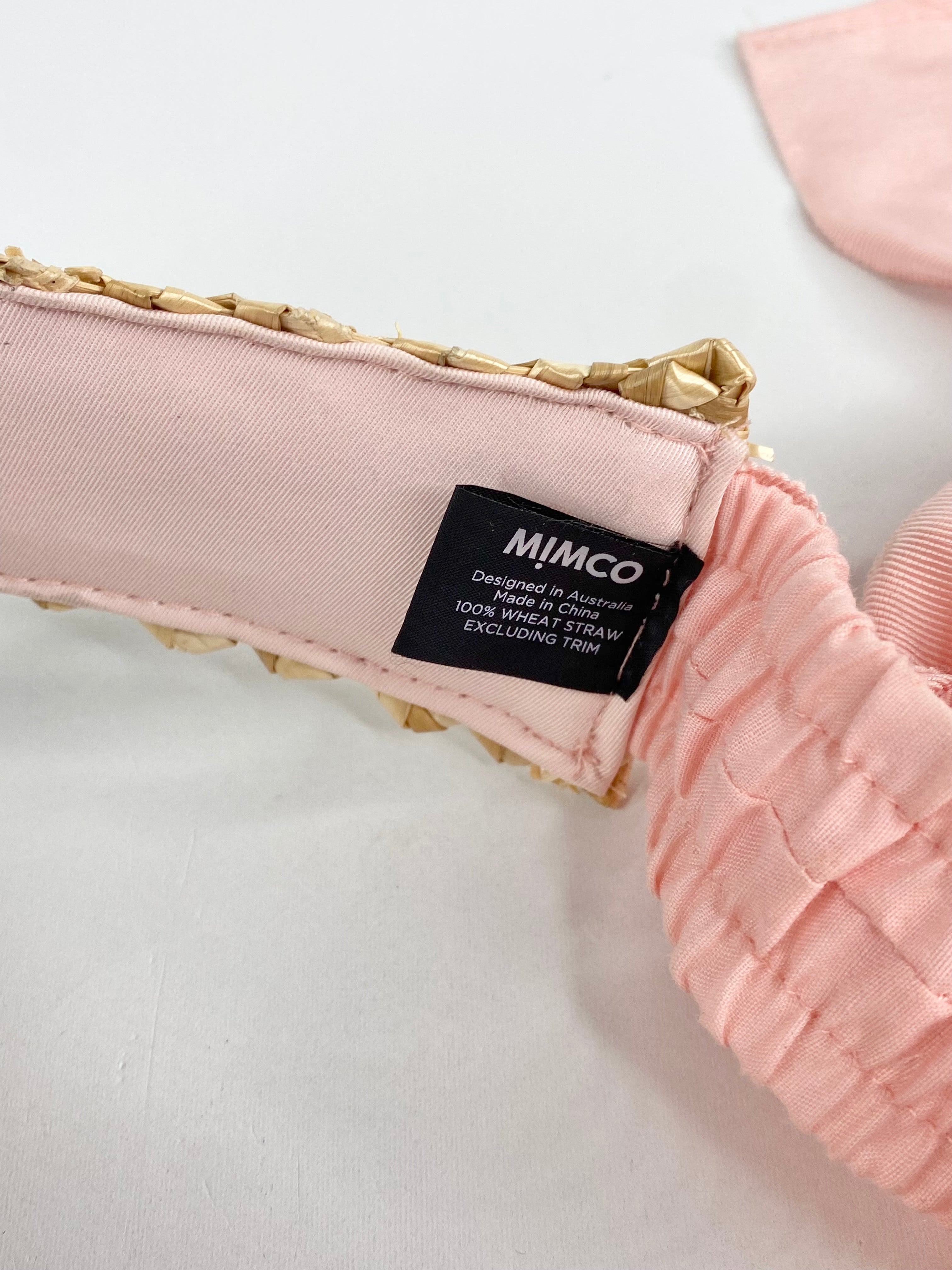 A sweet visor cap from Mimco composed of straw with a pink peach adjustable tie at the back - slight wear on the headband - see pictures.