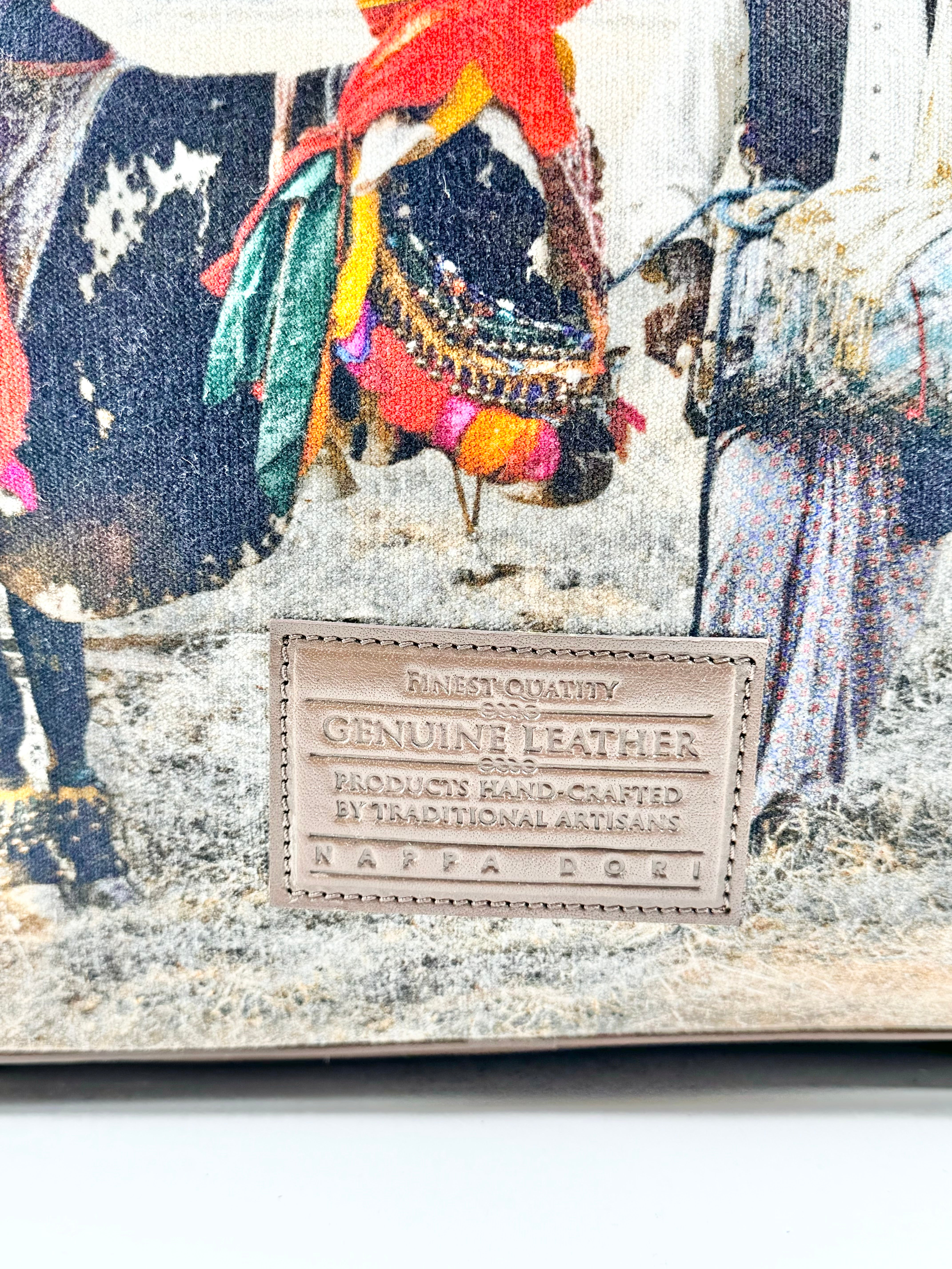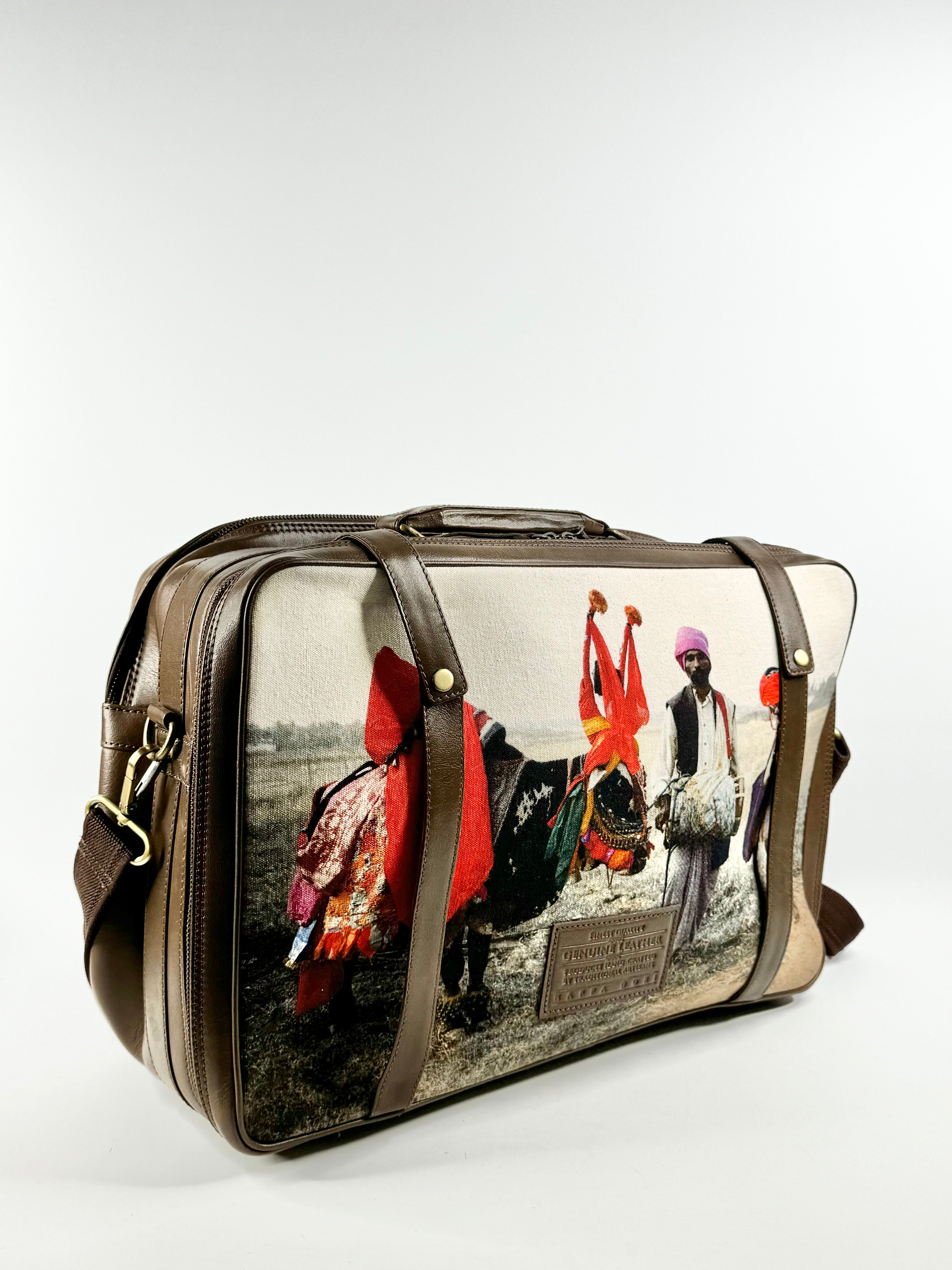 Either a very large briefcase or a small suitcase, this beautiful bag from Indian luxury leather goods label, Nappa Dori, is beautifully made and hard to miss. Coffee shaded leather trim borders this bag which is features a stunning photograph of two figures and a cow embellished with rich, fabrics. In excellent condition.