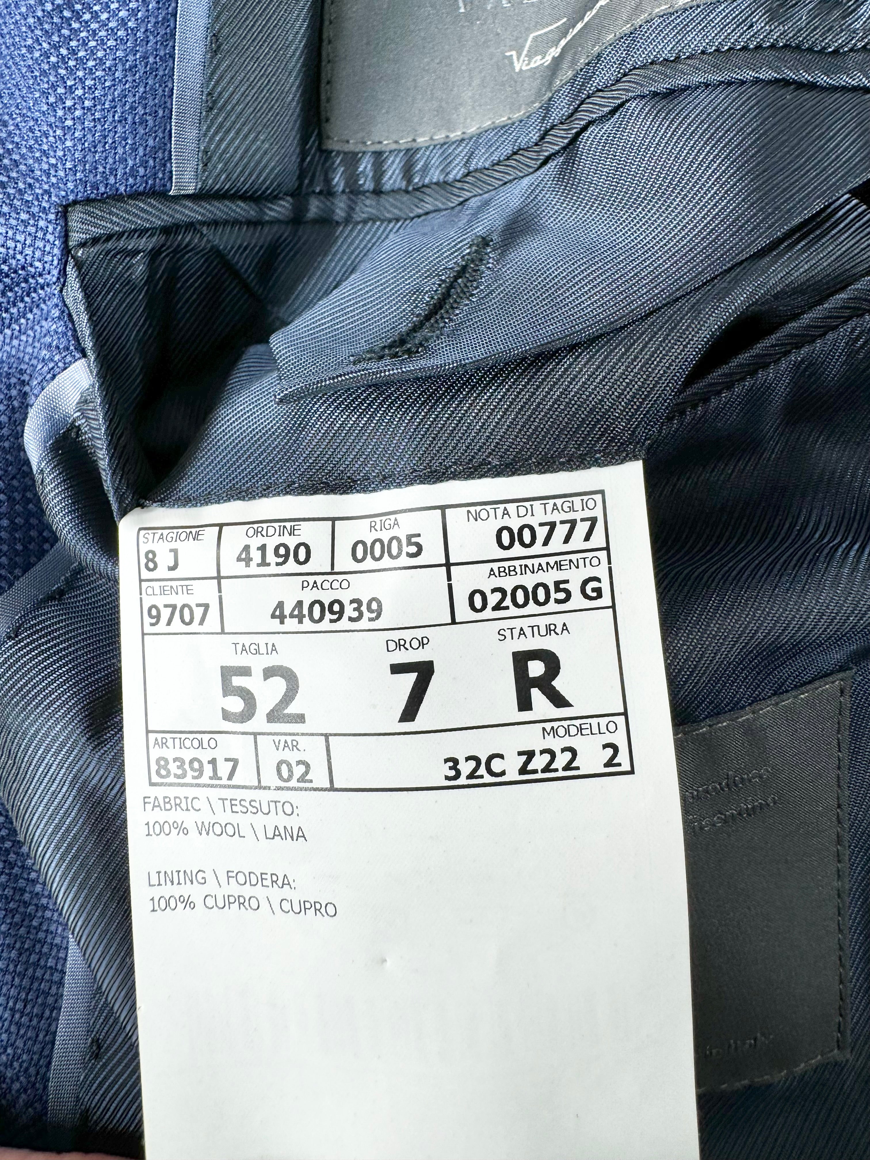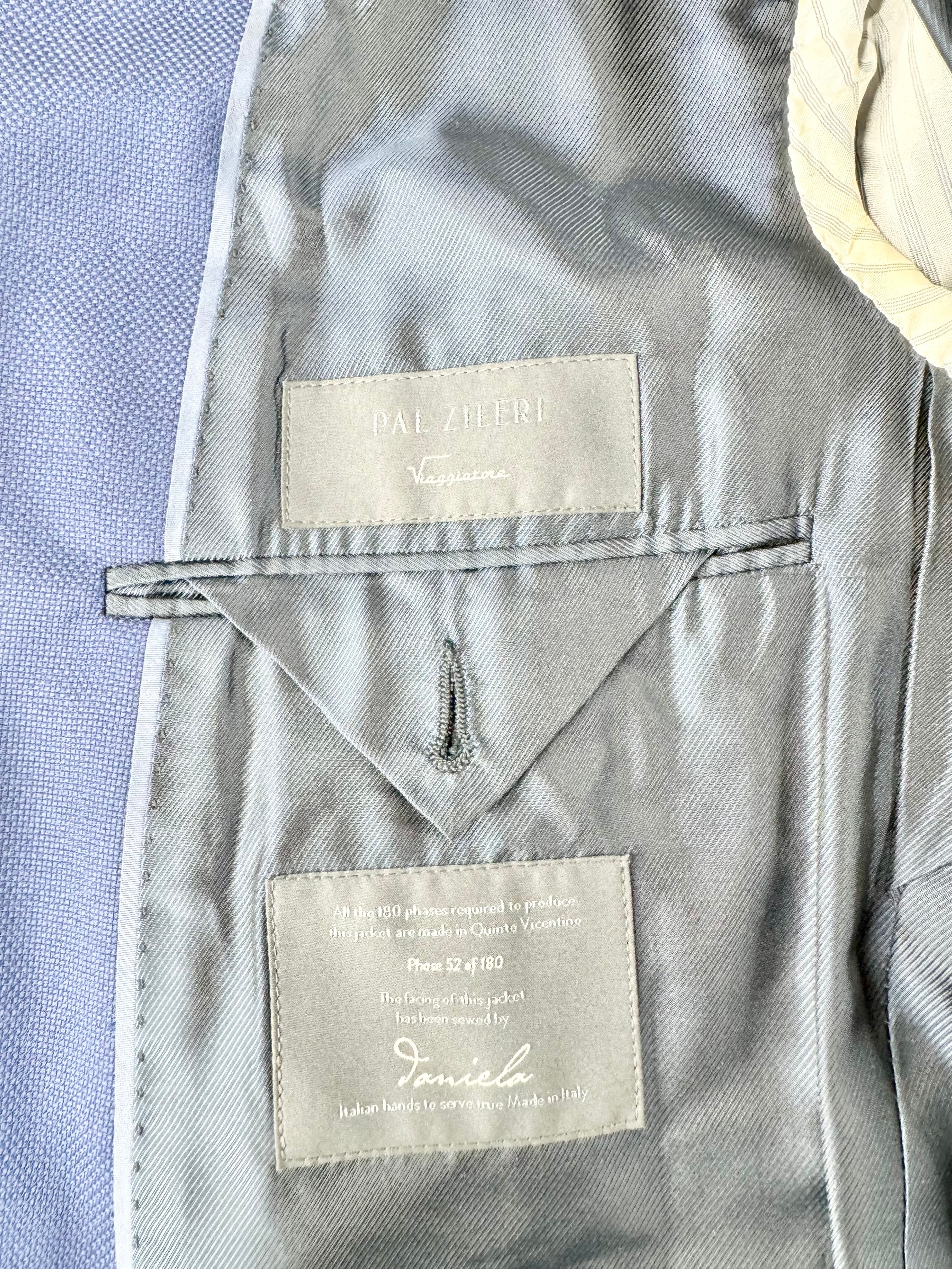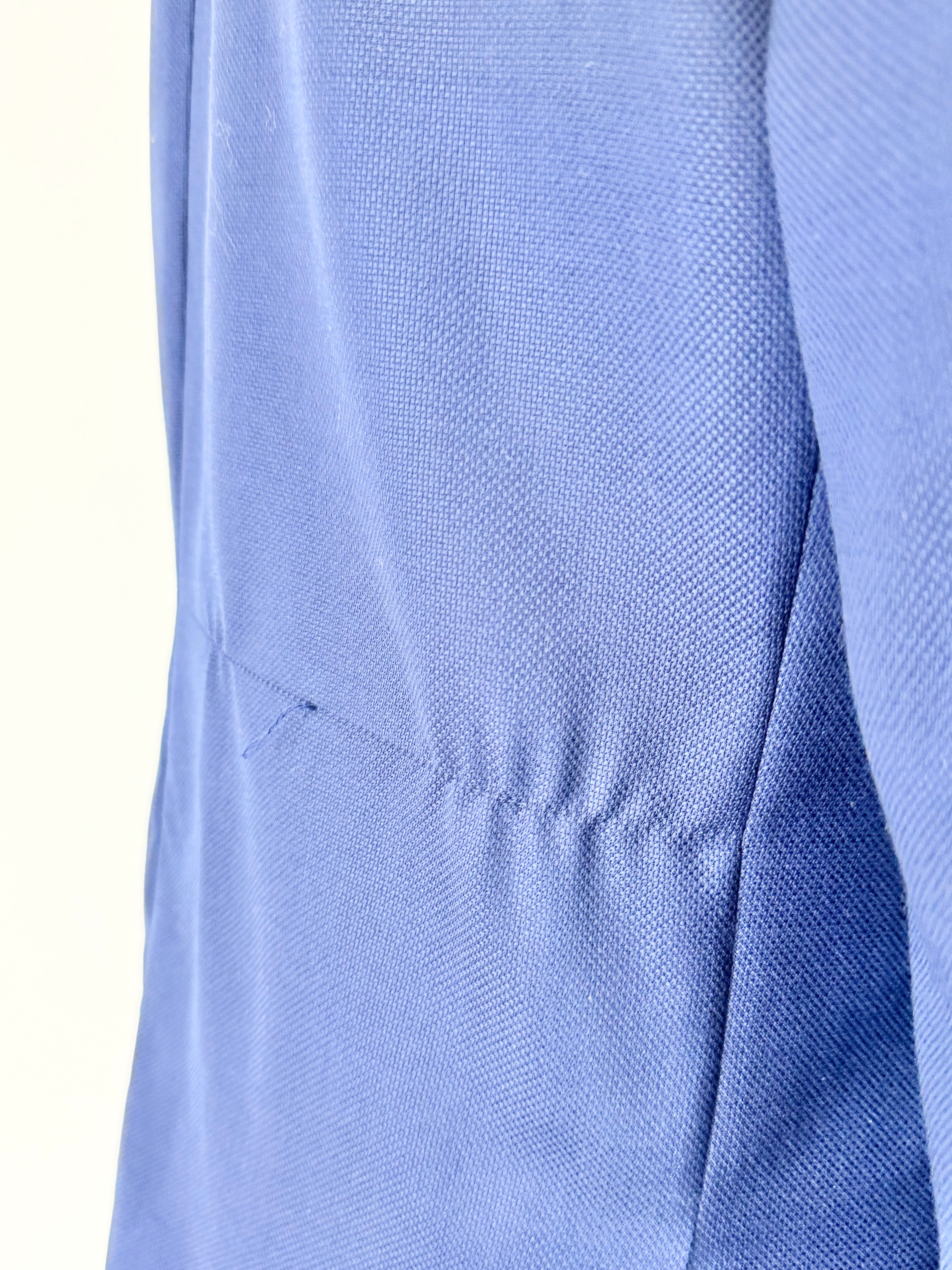 A deep, very dark cobalt blue blazer from Pal Zilner. A luxurious item, this features gold toned buttons at both the cuff and front. Each button has a regal looking coat of arms depicted on the surface. The lining is silky in nature and matching in colour, with a navy shot through the fabric. In overall good condition, there are some minor marks on this item, which would benefit from a visit to the dry cleaner.
