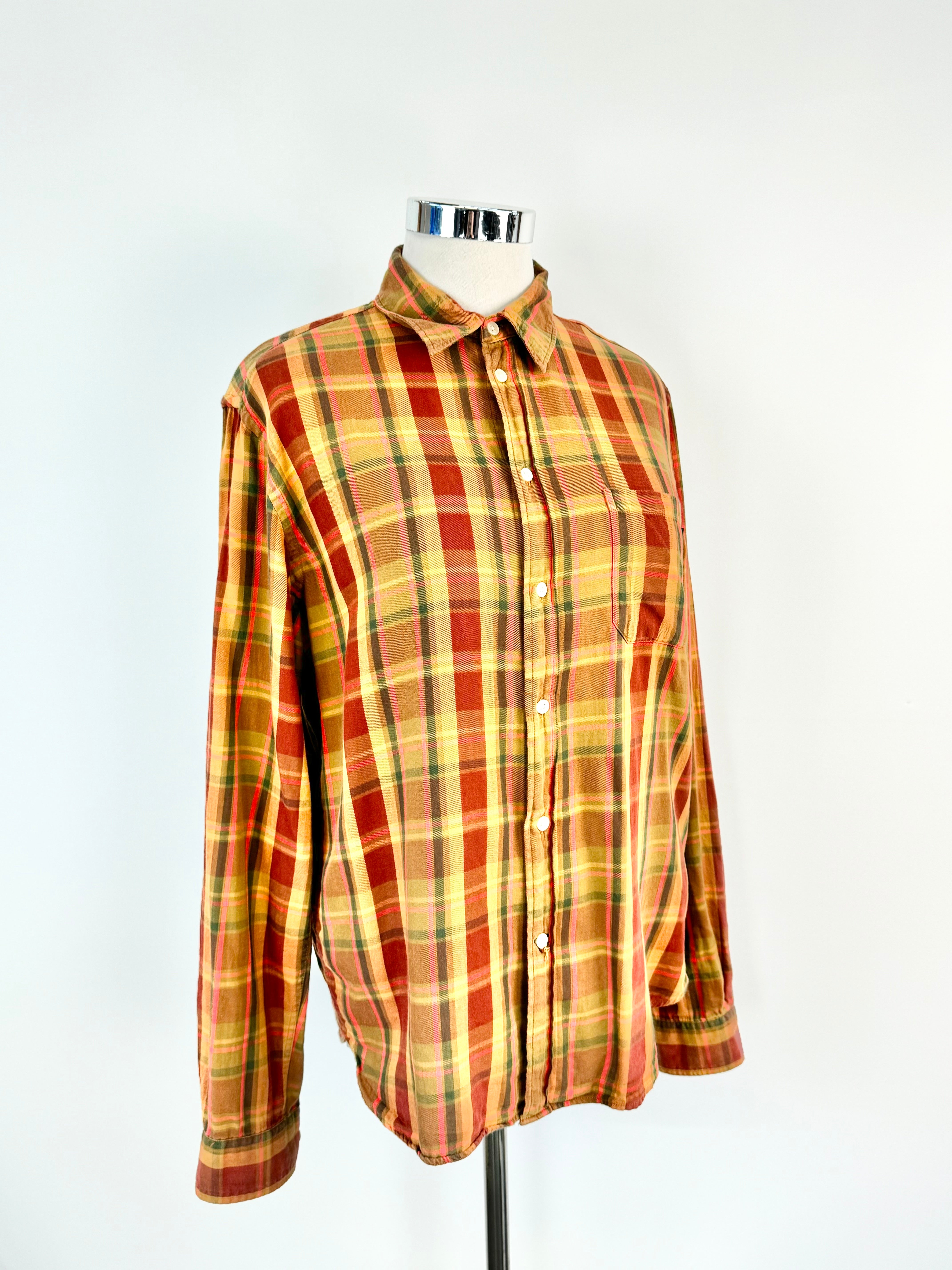 Autumnal, rusty, oranges and reds make up the plaid pattern on this handsome shirt from Paul Smith. Composed of cotton it is very soft and in good condition but there is some damage to the final button hole - see photos.