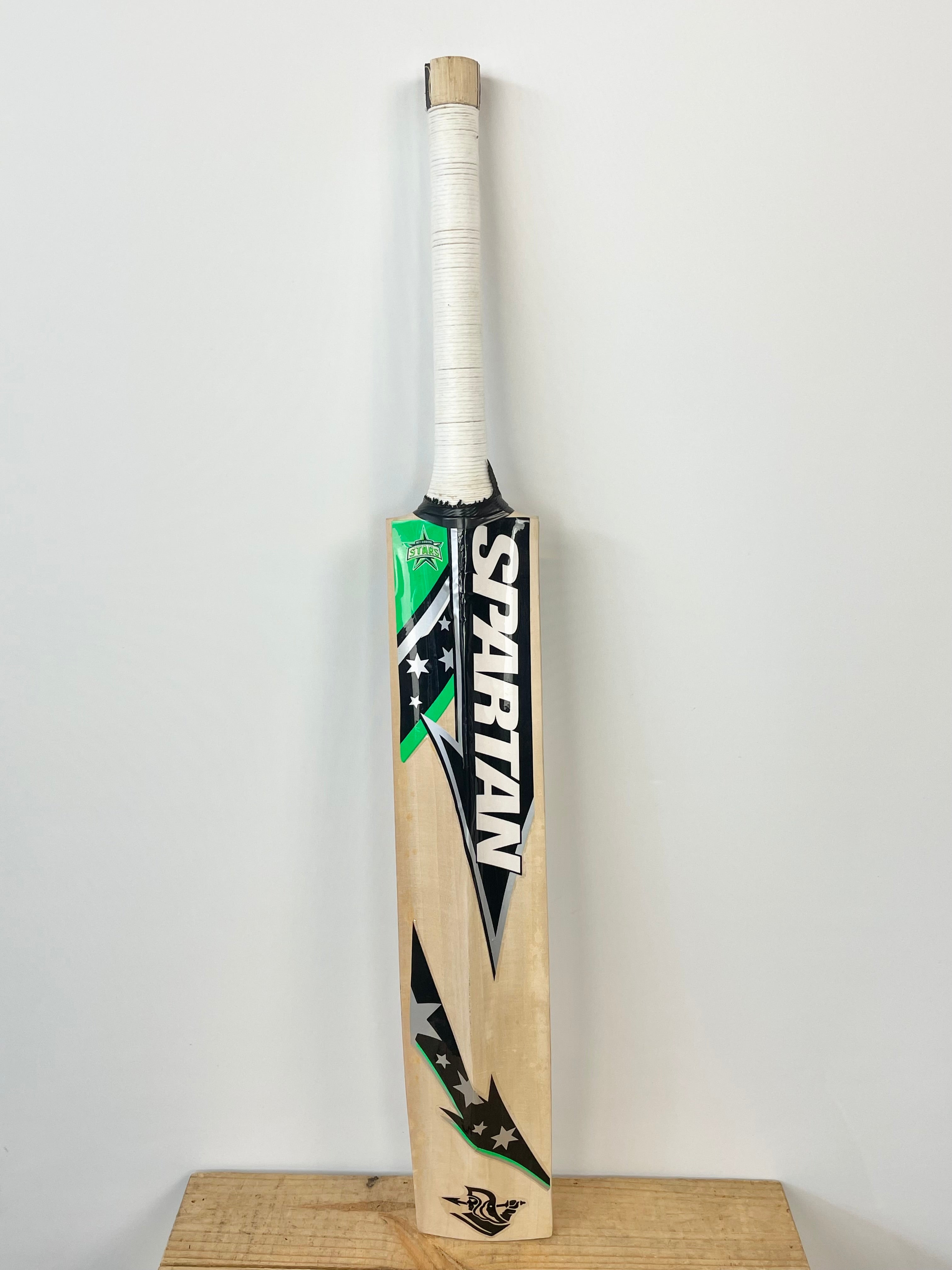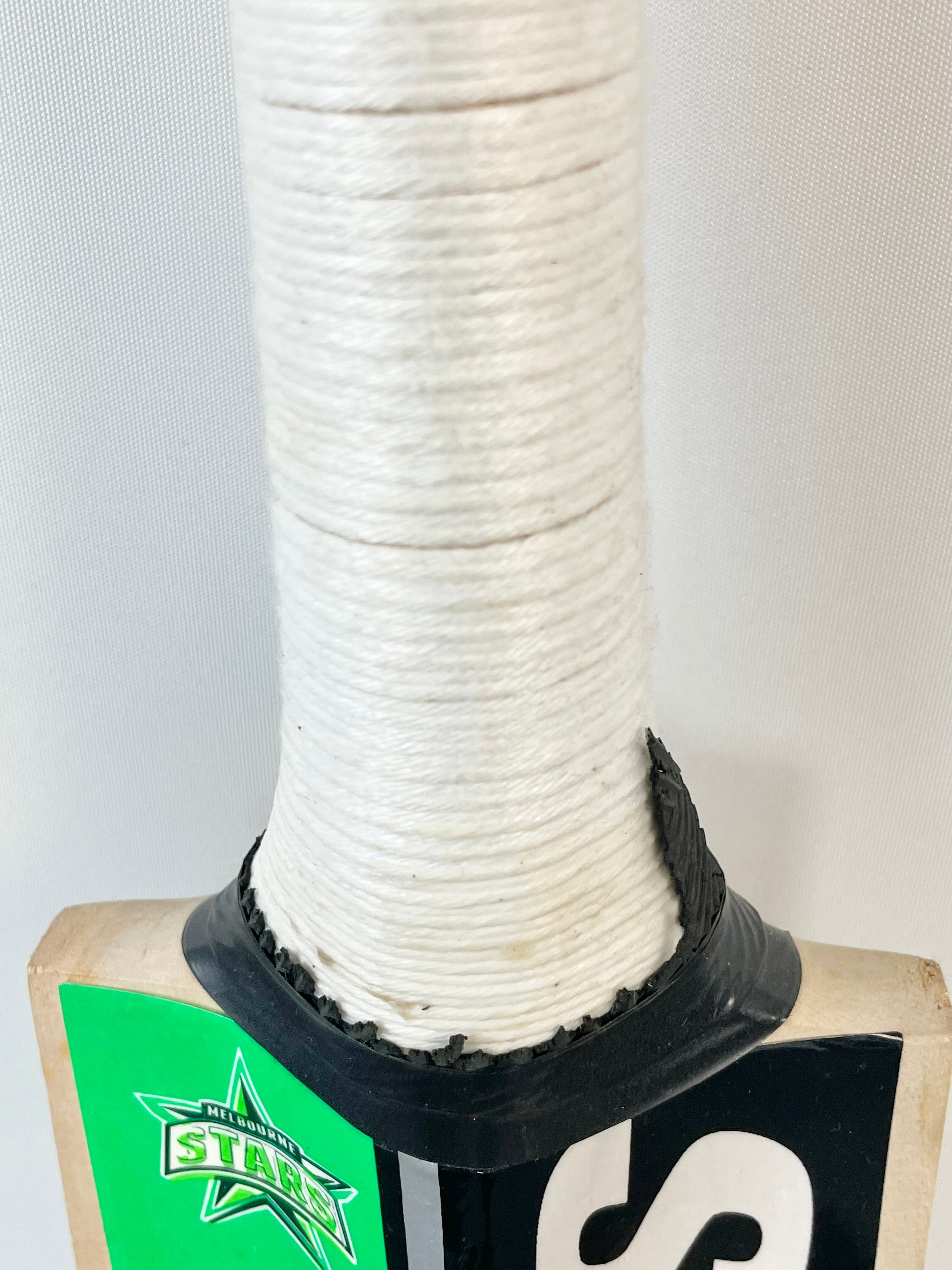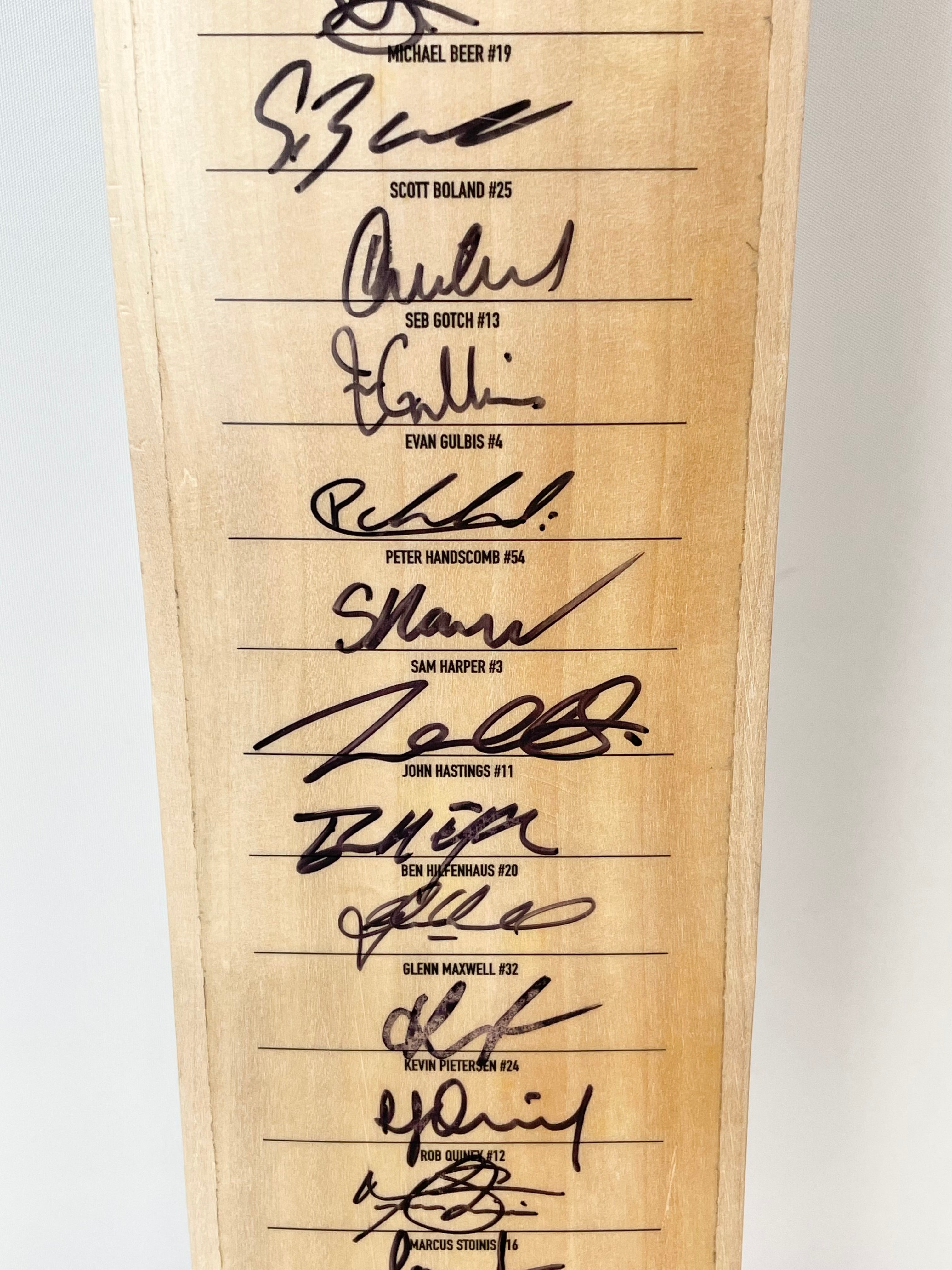 Celebrating the semi-finalist Melbourne Stars squad of the 2016-17 season in this piece of autographed memorabilia. Featuring the signatures of star players such as Glenn Maxwell, Scott Boland and Kevin Pietersen. The bat itself presents in excellent condition overall, with some wear to the handle as pictured. The grip has peeled off and there is a chip at the top of the handle.