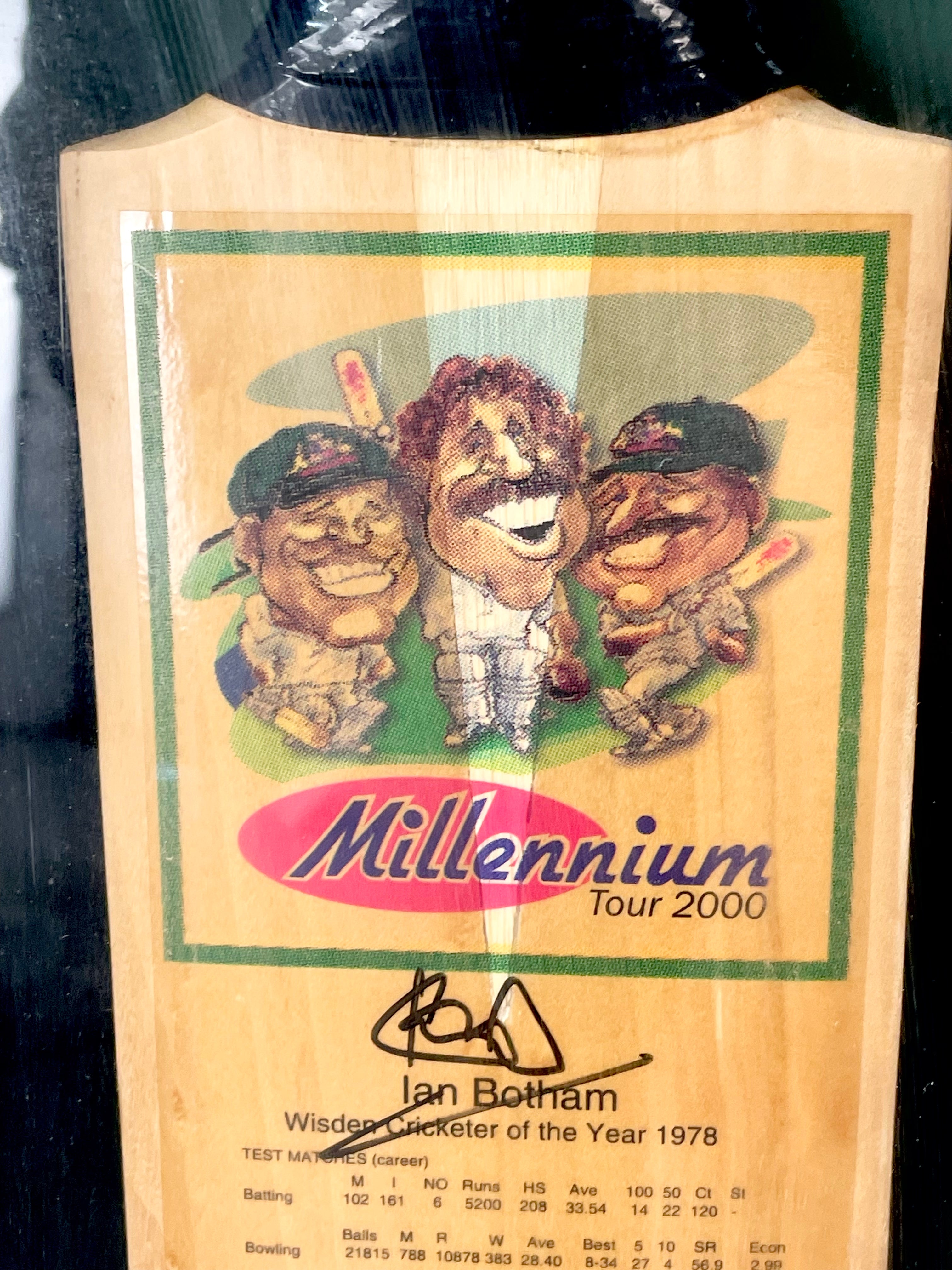 Not to be confused with the Backstreet Boys 'Into the Millennium' tour from 1999, this piece of cricket memorabilia celebrates three of the sport's most famed players of the last century. Featuring signatures and statistics of Sir Ian Botham, Allan Border and the late Dean Jones on this beautifully presented bat. Originally the bat came on its own, though has been professionally framed with an added plaque towards to toe end. The bat is numbered out of 1500 pieces, but doesn't come with its COA. The frame as well does feature some wear, with scratches and dents to the mahogany coloured outer.