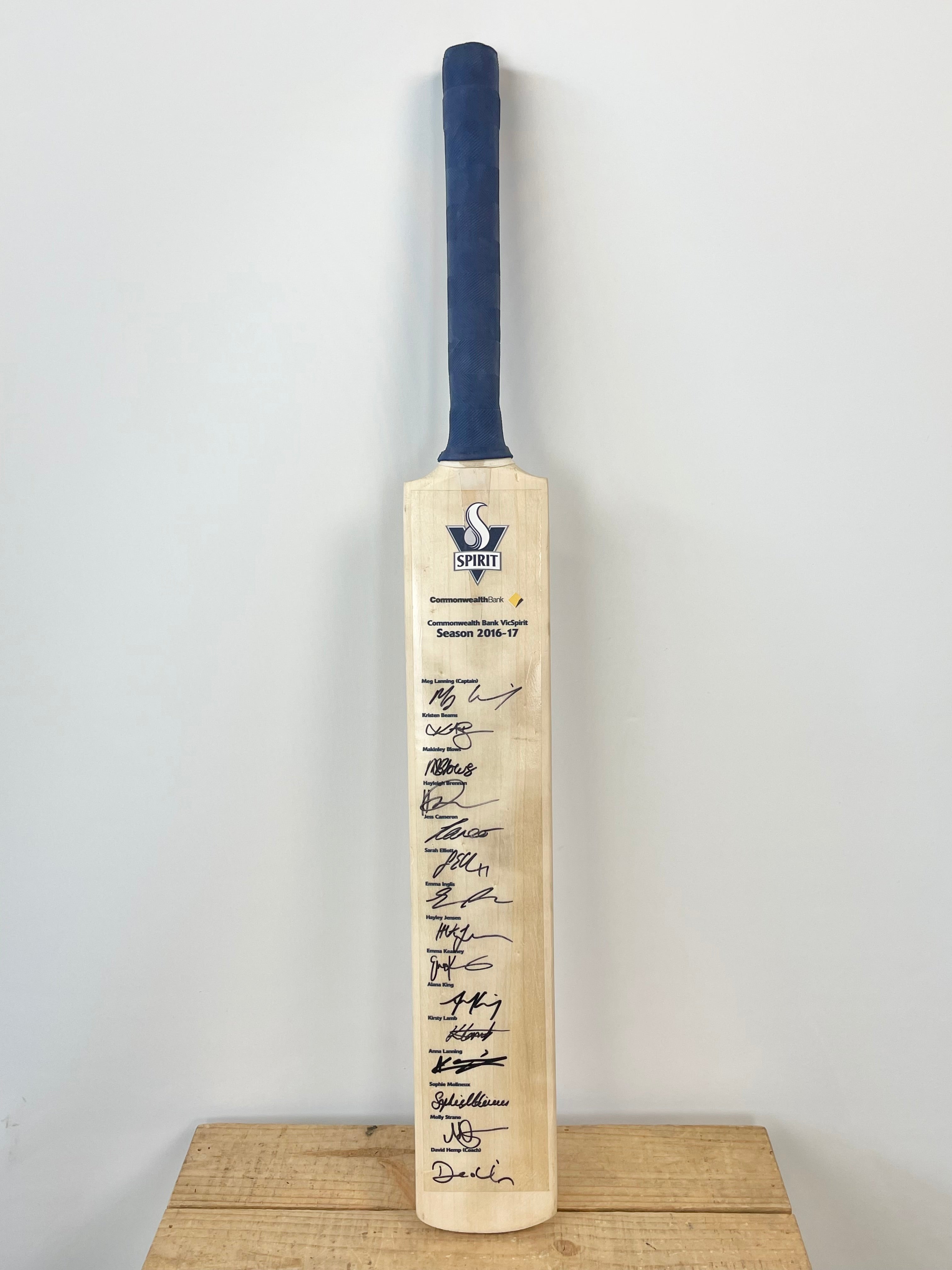 An amazing piece of cricketing memorabilia, featuring the 14 player squad of the 2016-17 season. Star players such as the decorated Meg Lanning and Sophie Molineux are included, on what is overall an excellent condition bat. There is minor wear as pictured to the exposed parts of the willow.