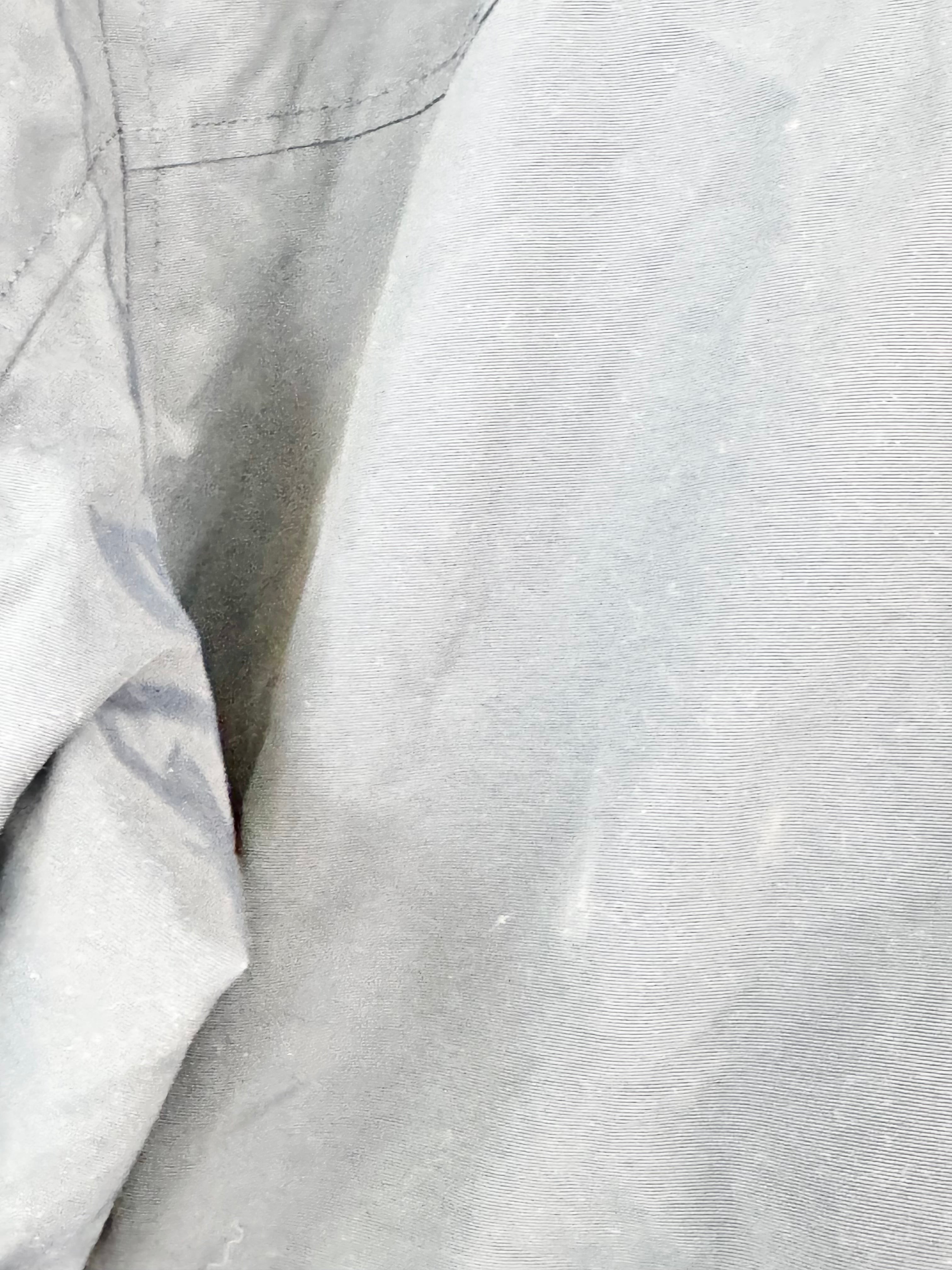 A navy blue jacket with a zipper too enclose, mesh lining and pockets at the waist. There is some slight pre-loved wear.