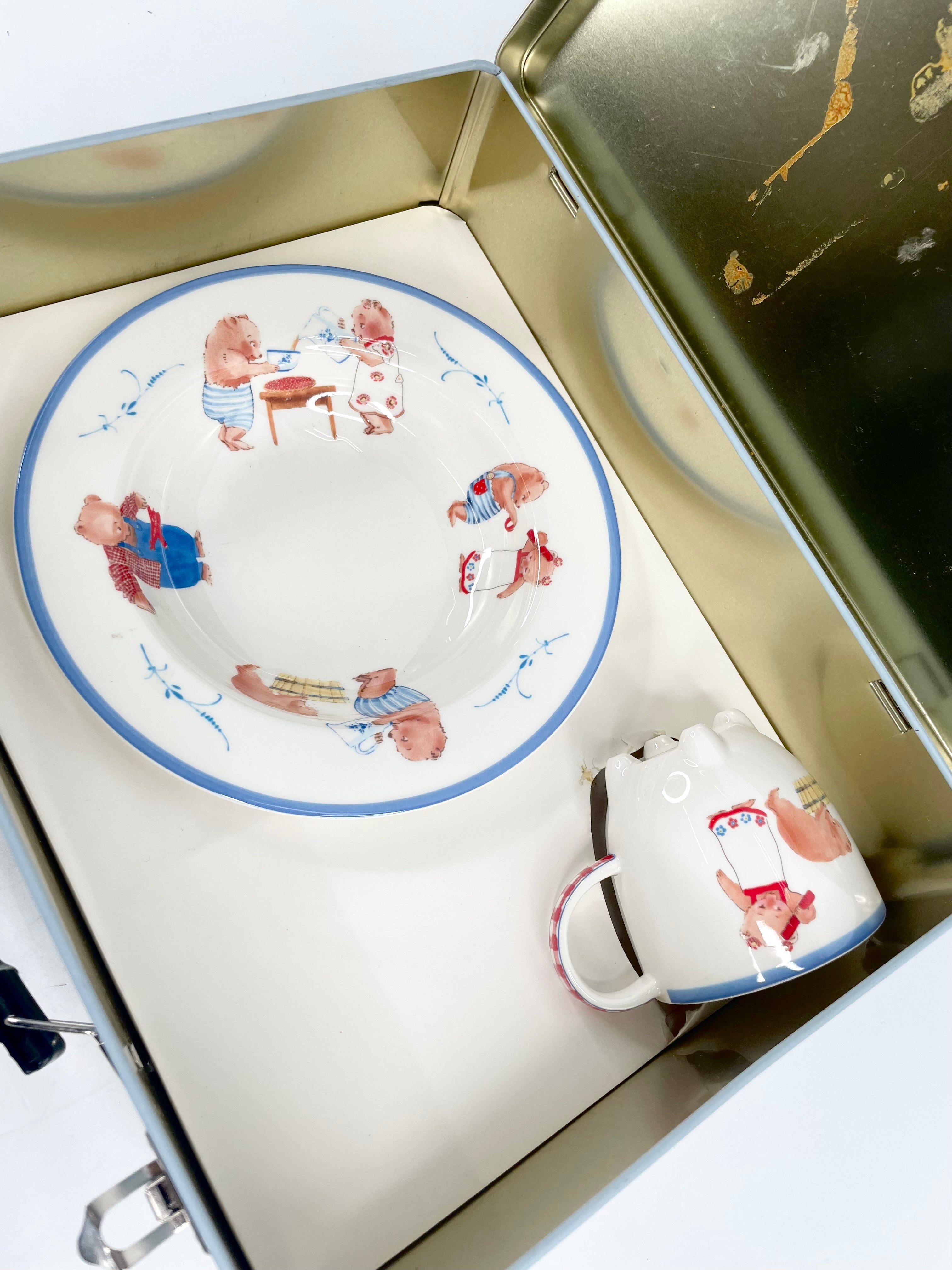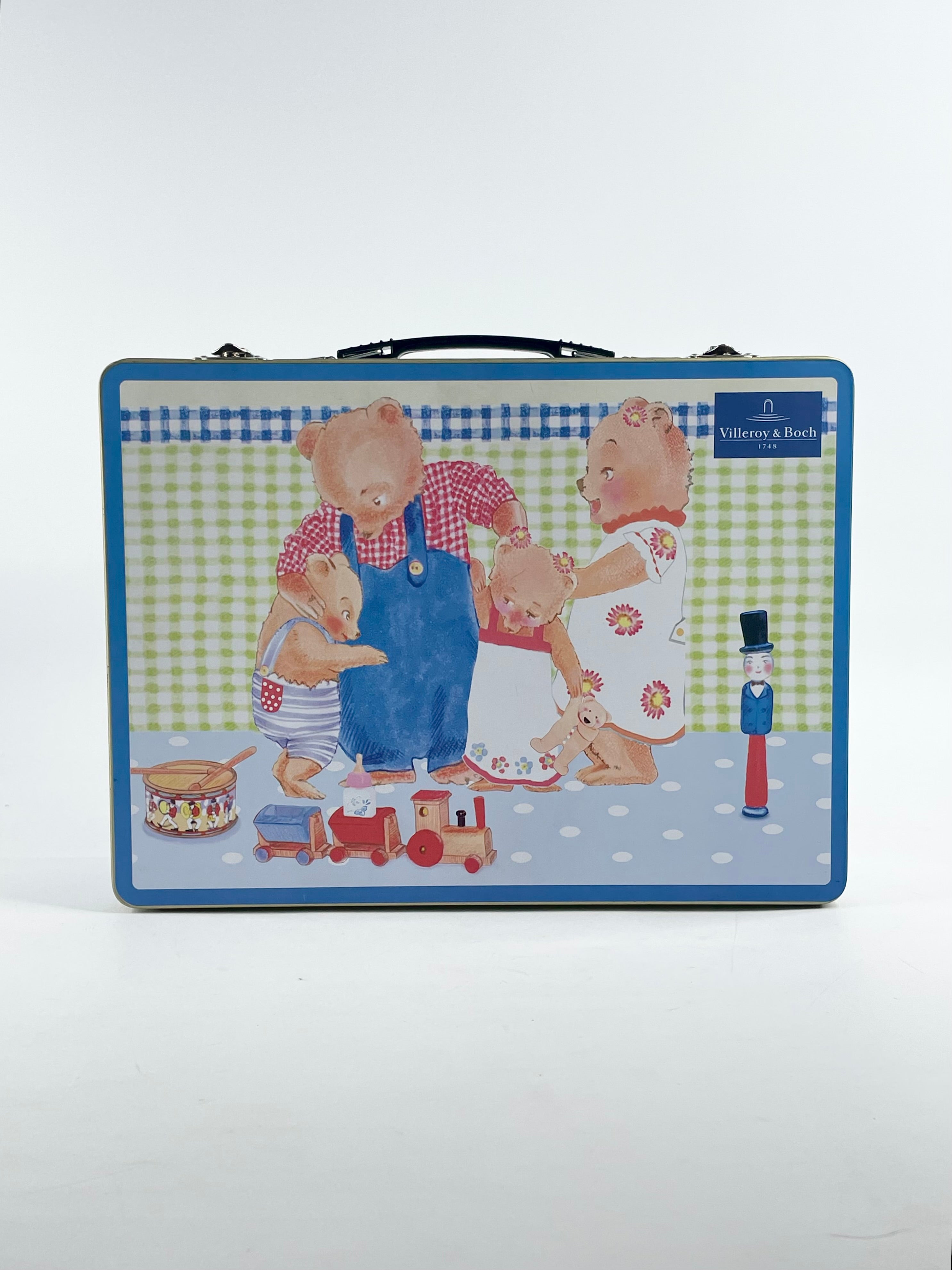 A cute little dinner set by Villeroy & Boch, depicting a family of fears and presented beautifully in a mini metal suitcase. The set is included here in its original box and packaging, while there is wear inside as pictured.
