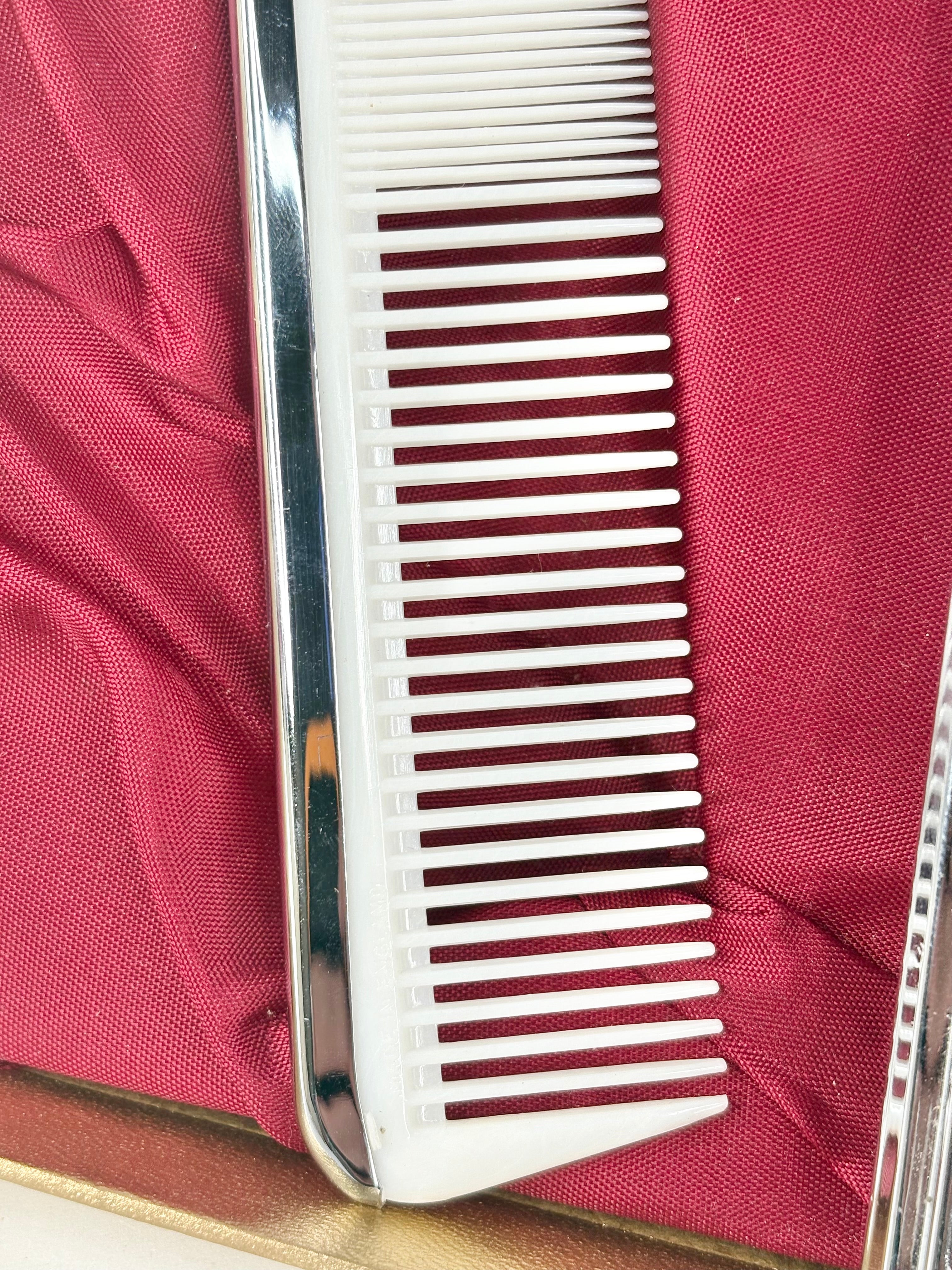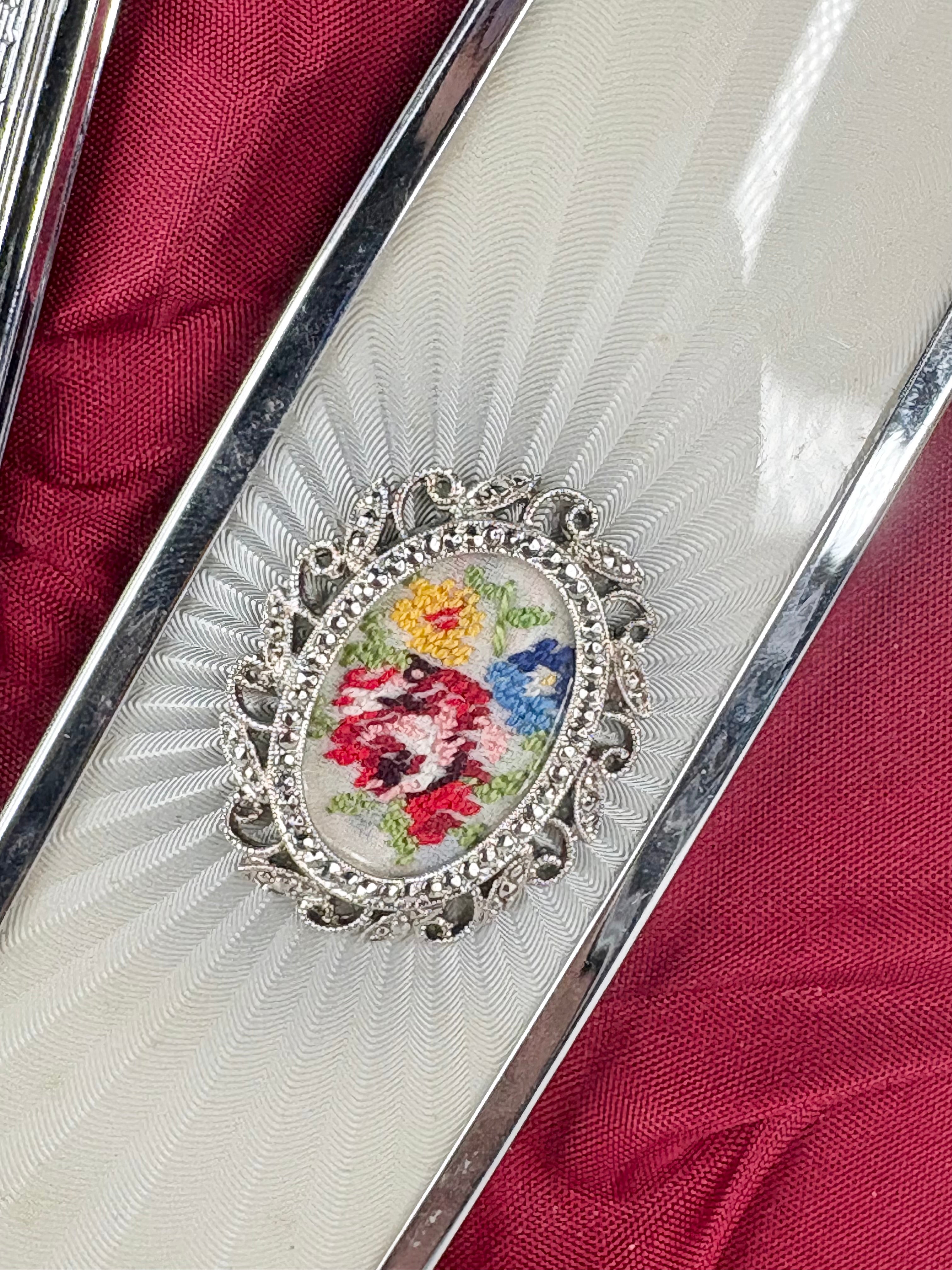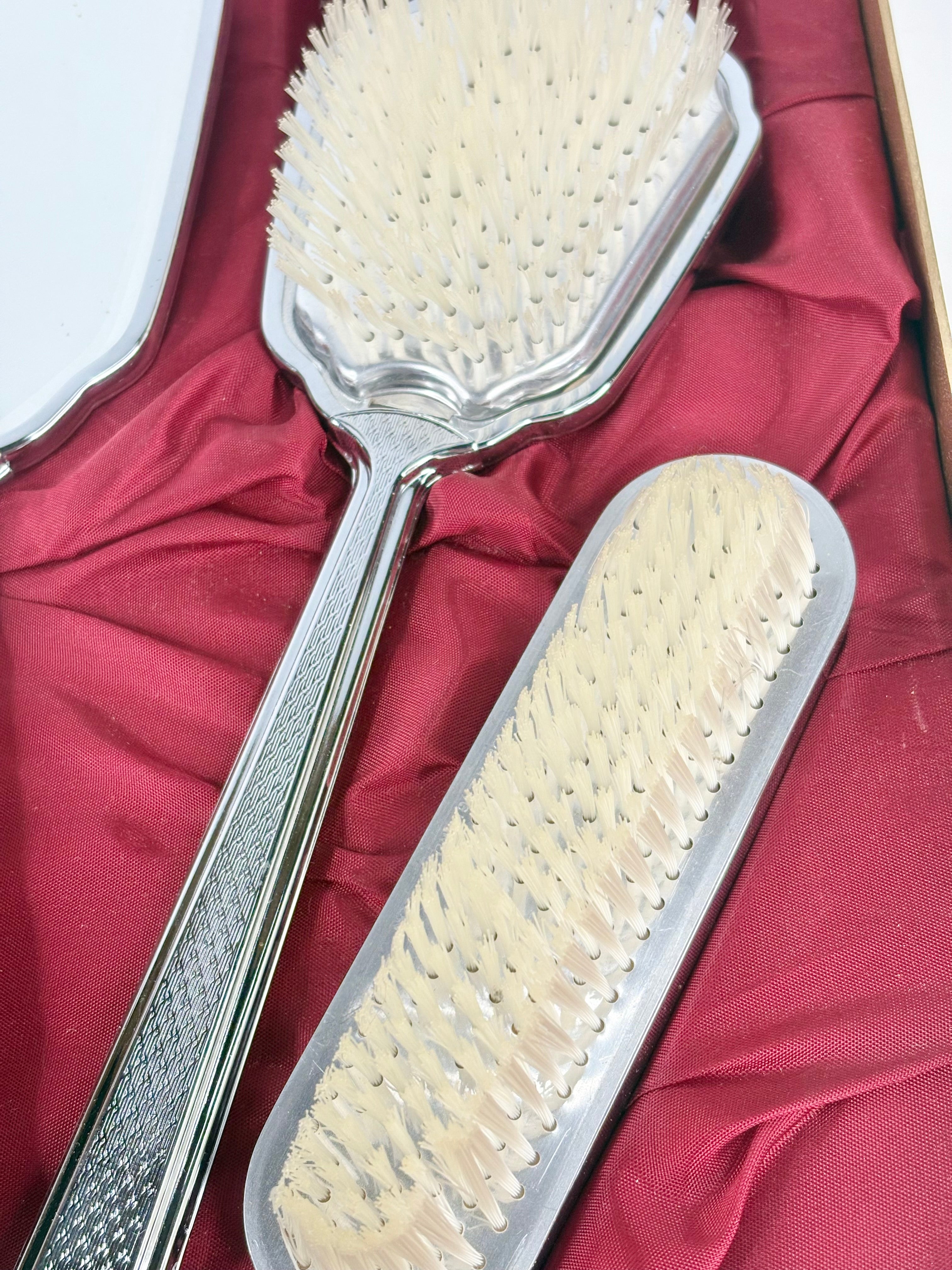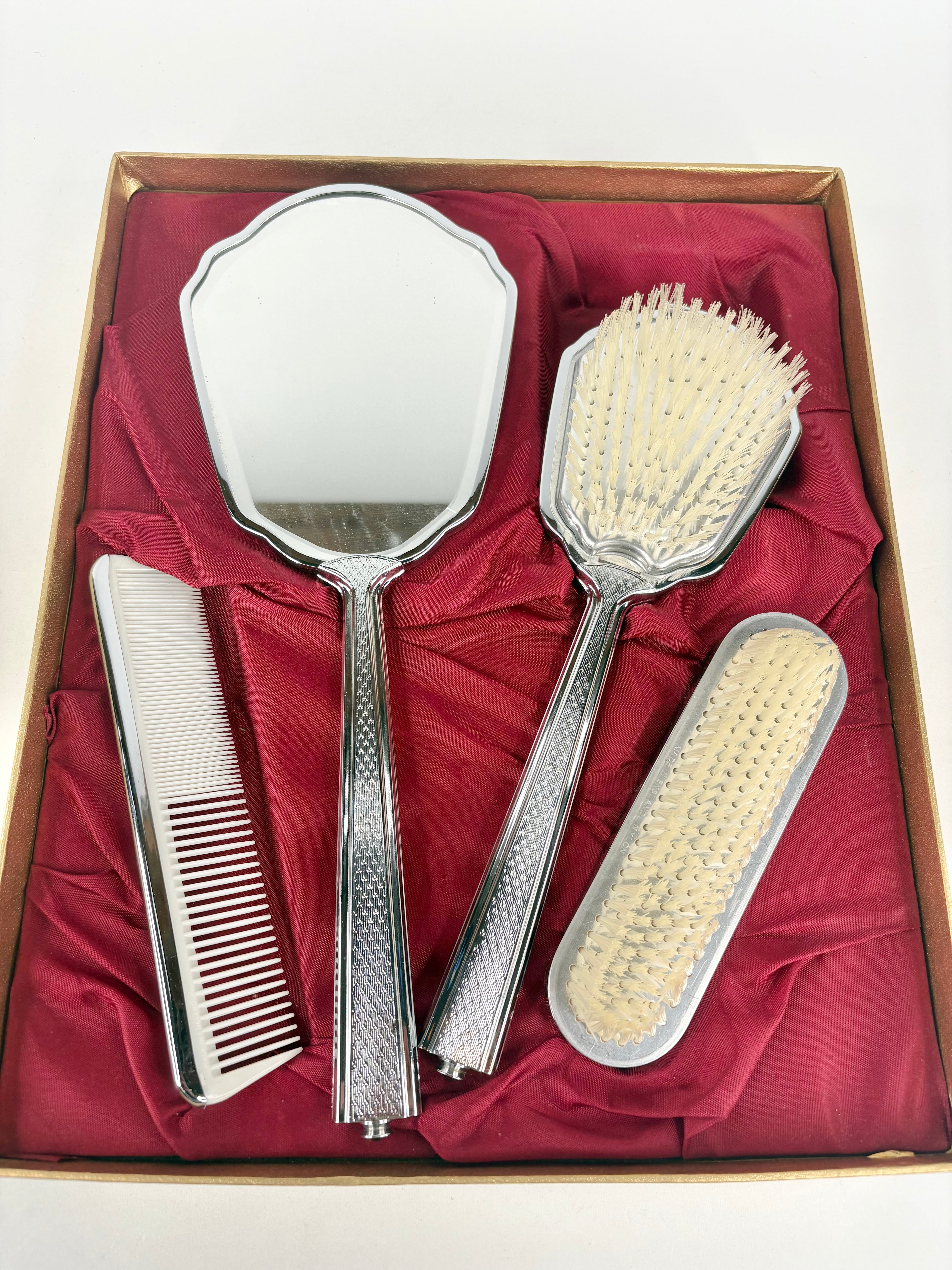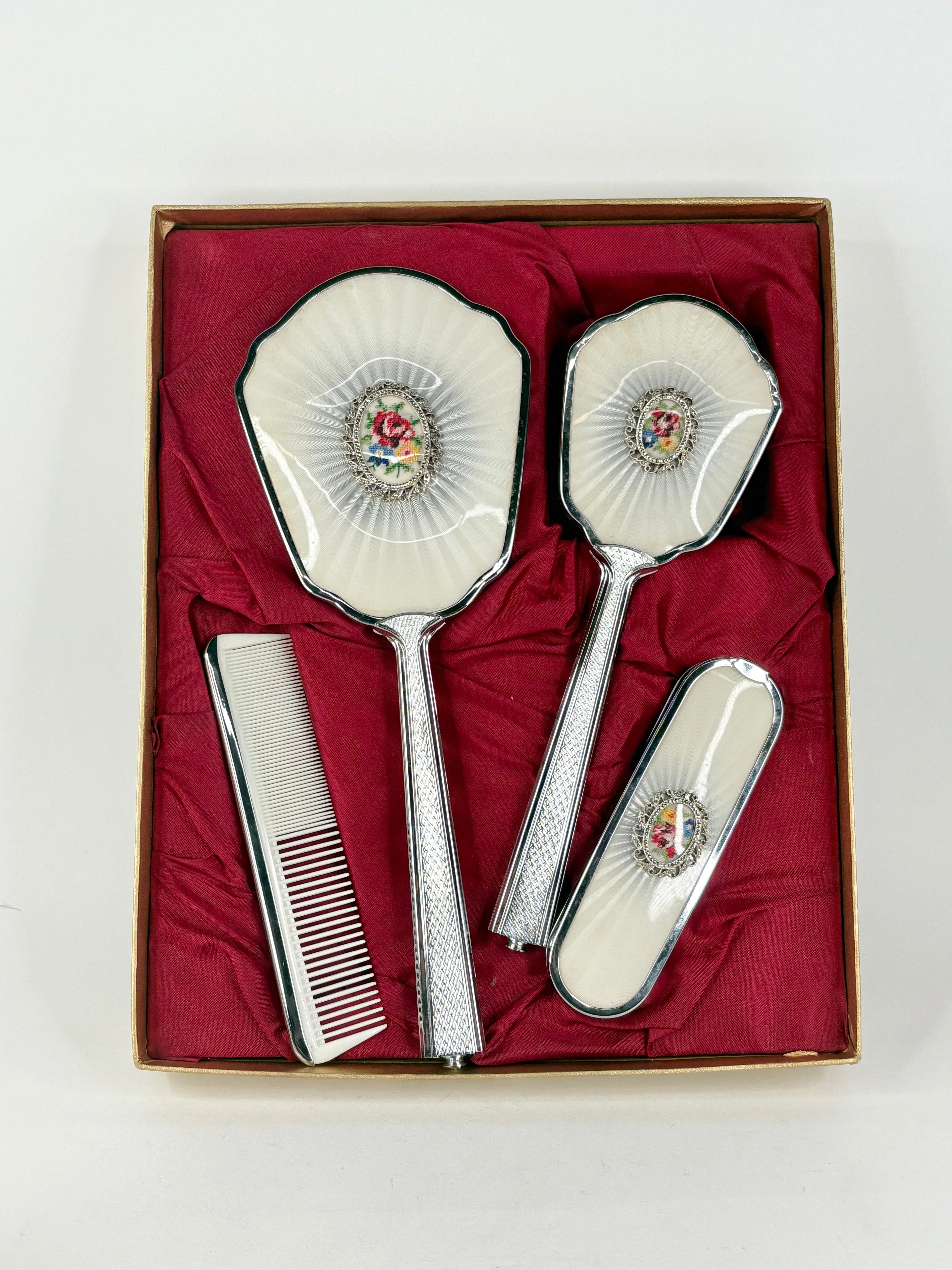 A dainty and lovely vintage vanity kit, featuring four unique pieces and all well made. There are no makers marks or hallmarks present, however the set is neatly presented in its original box and is in excellent condition overall.
