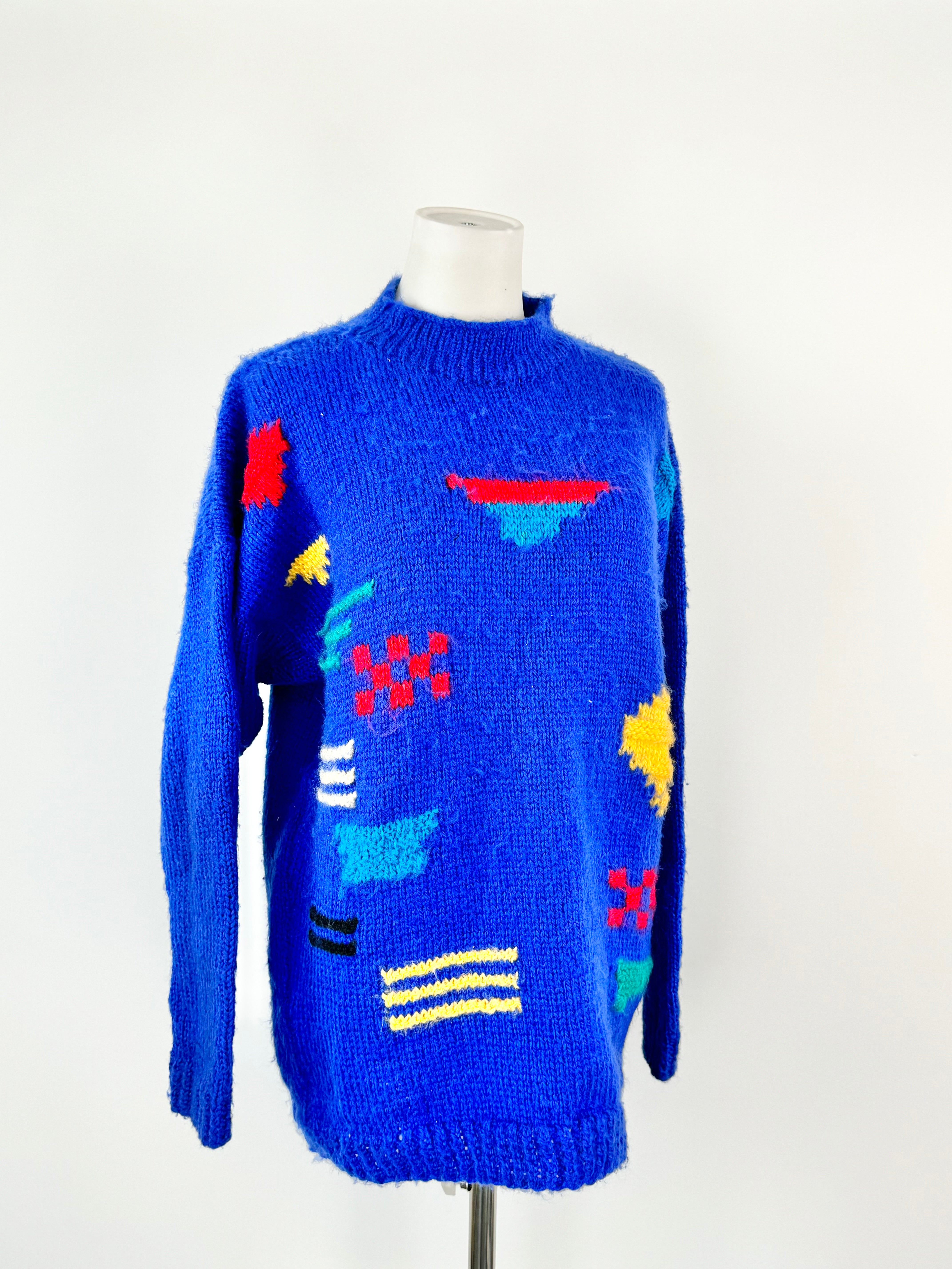 There is something that is so, so special about anything hand knitted, but perhaps something even more special about a handknitted item. The care and time that it takes to make something so amazing never fails to move us. This is a bright, electric blue item composed largely of a fluffy, warm feeling yarn with a number of brightly shaded shapes on the front. It is overall in good vintage condition.
