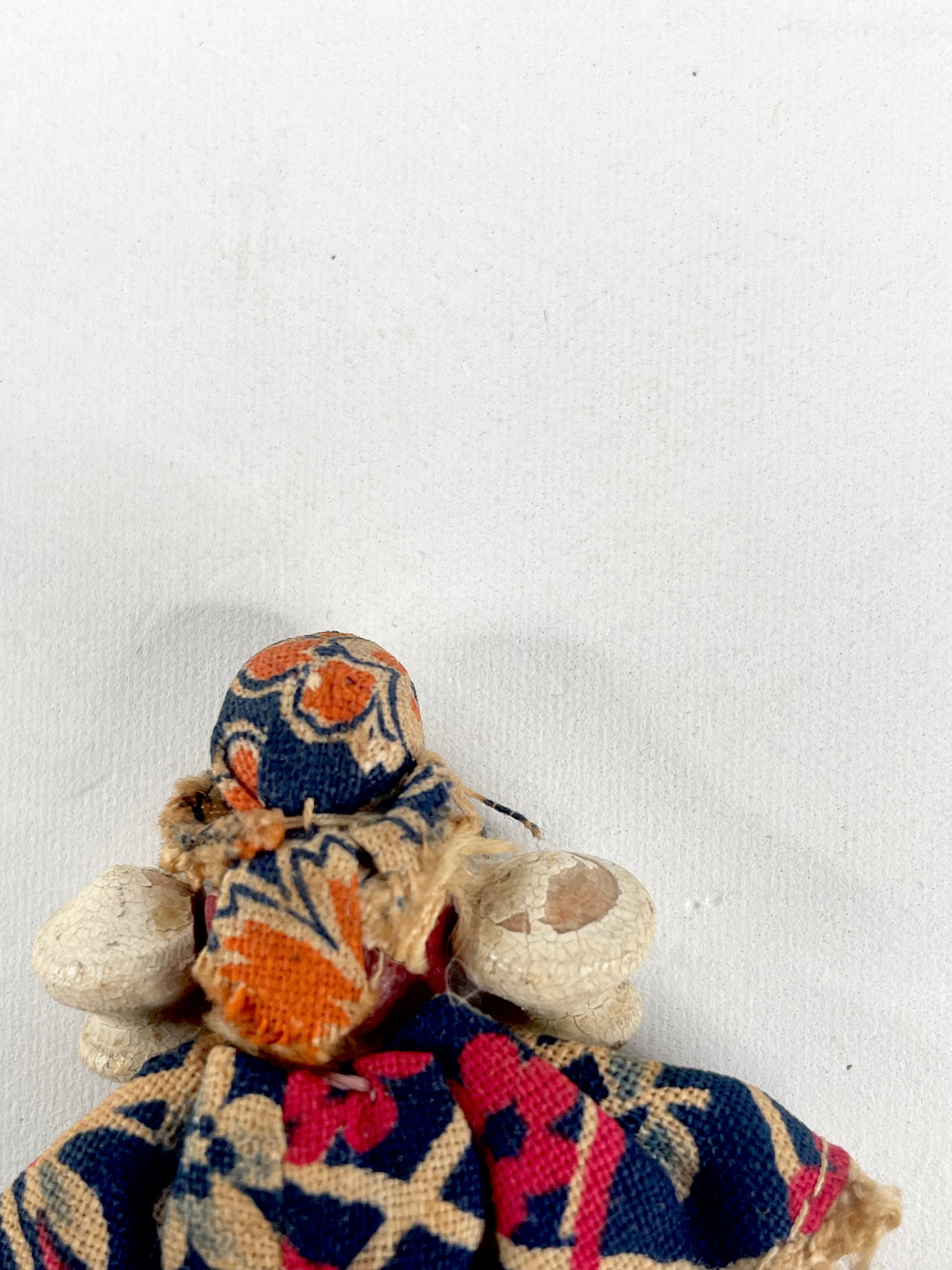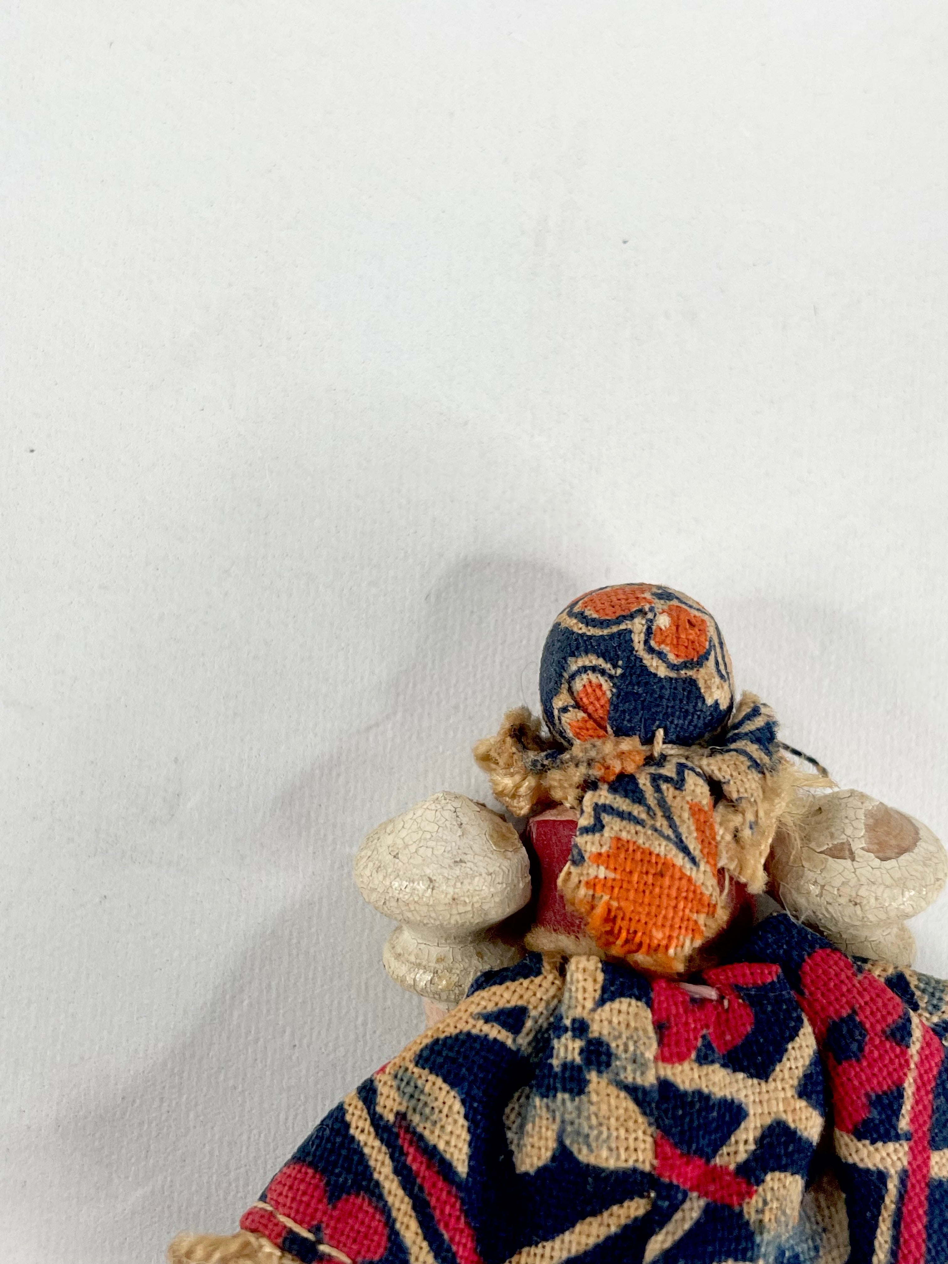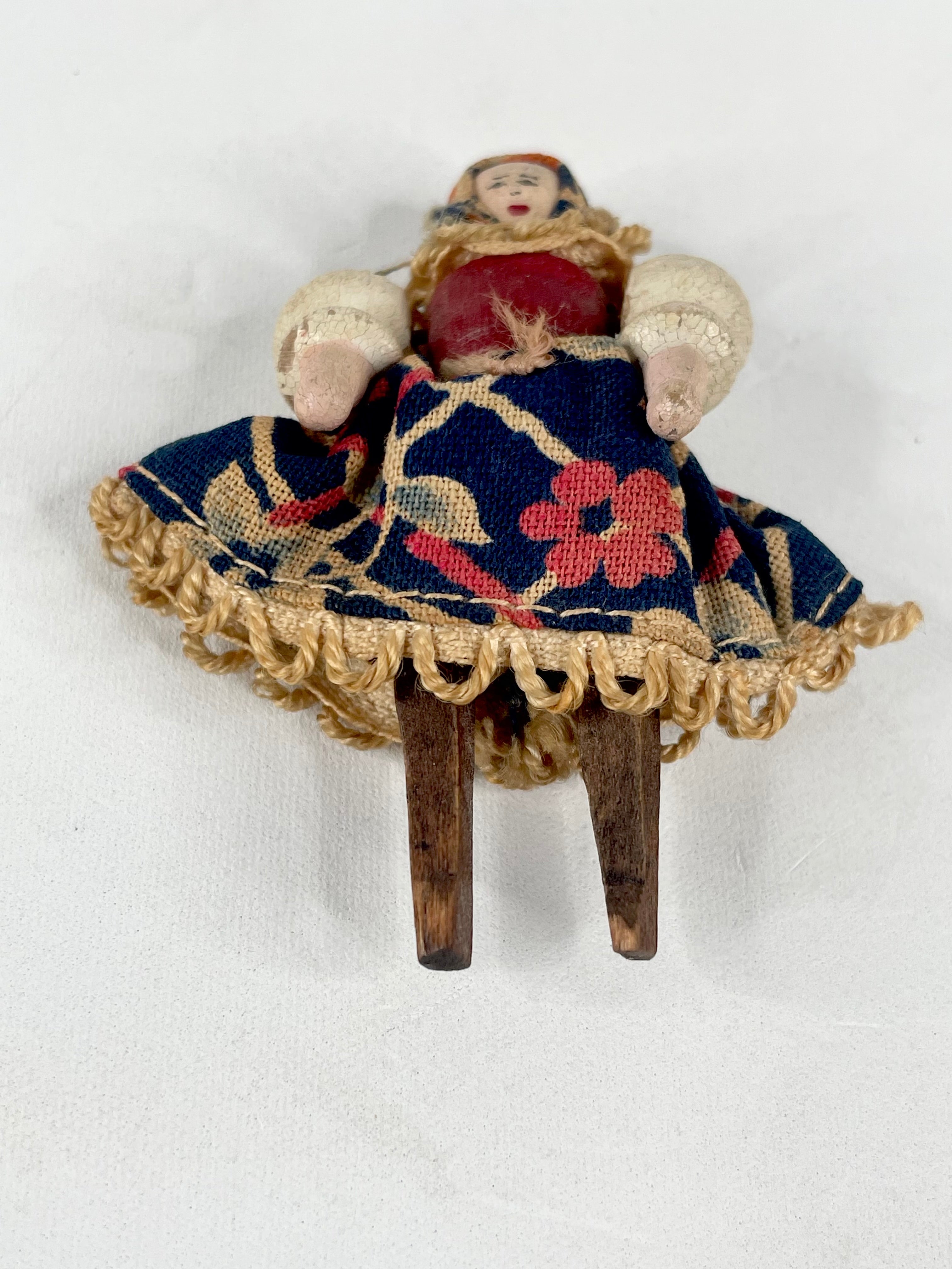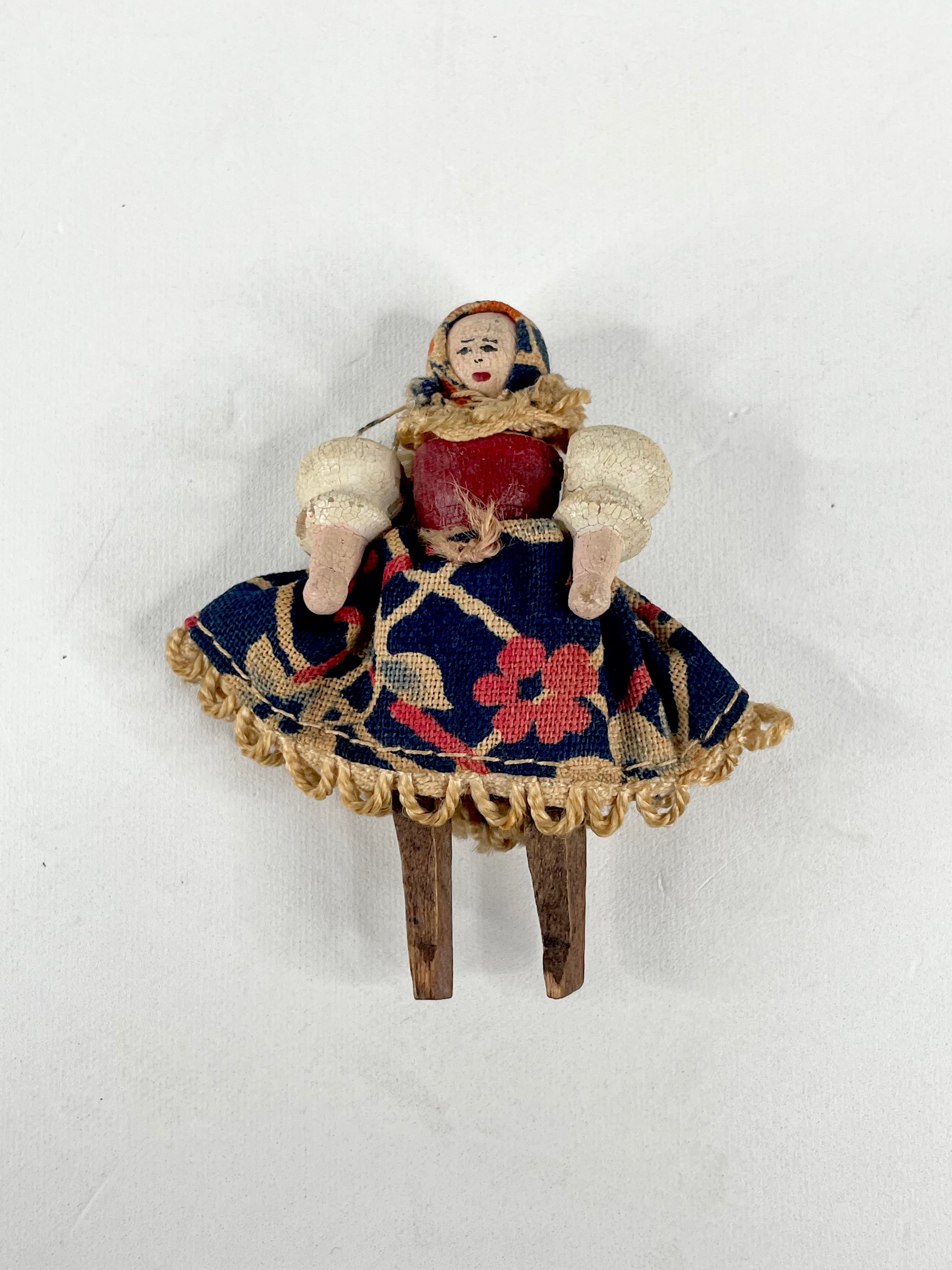 Dainty is the best term to describe this lovely piece of art, capturing that vintage style of creating with wooden pegs. This Grodnertal doll is of German origins, pictured with some minor paint chips and wear. Though in overall excellent condition. No other hallmarks or stamps are present.